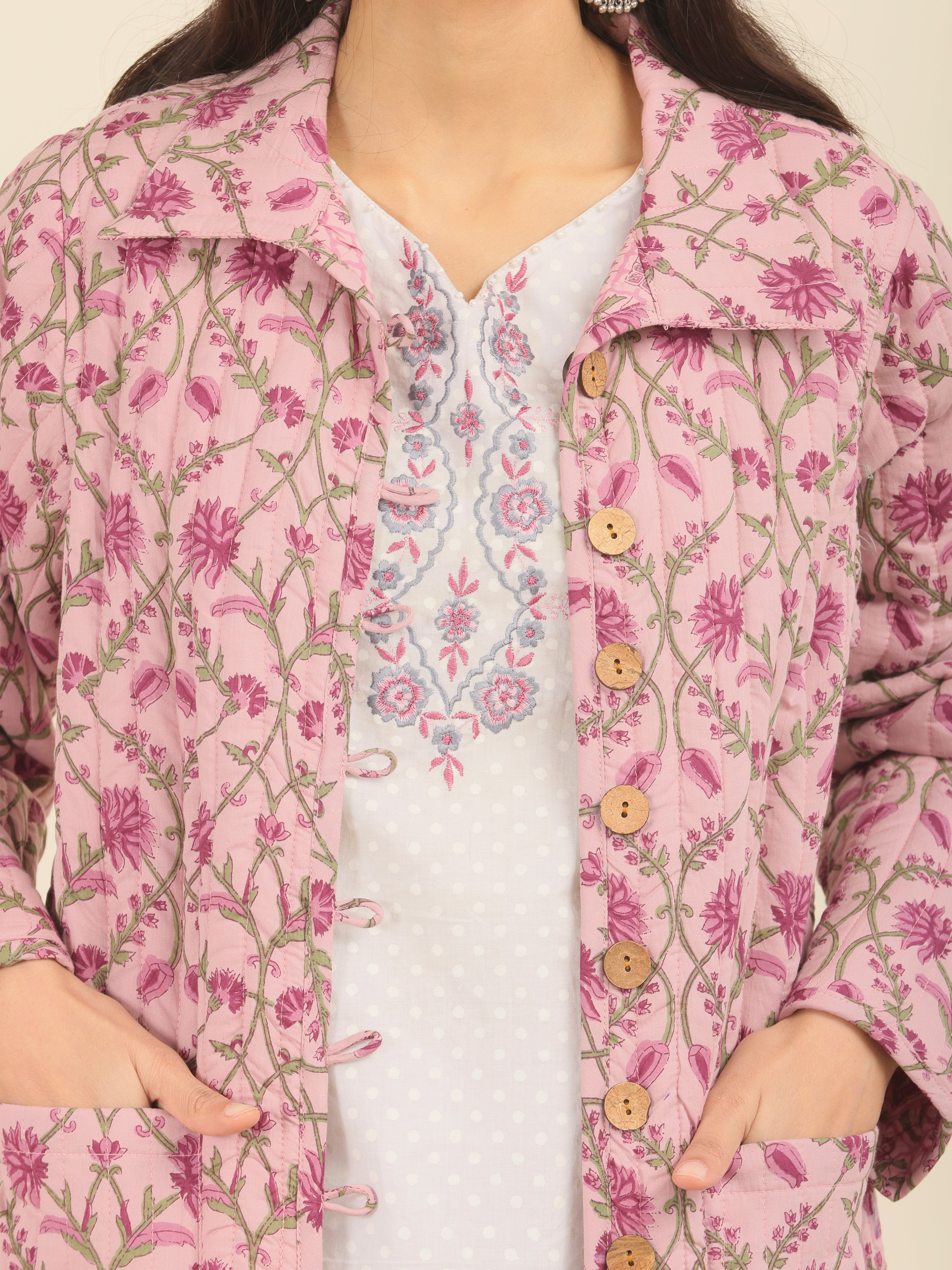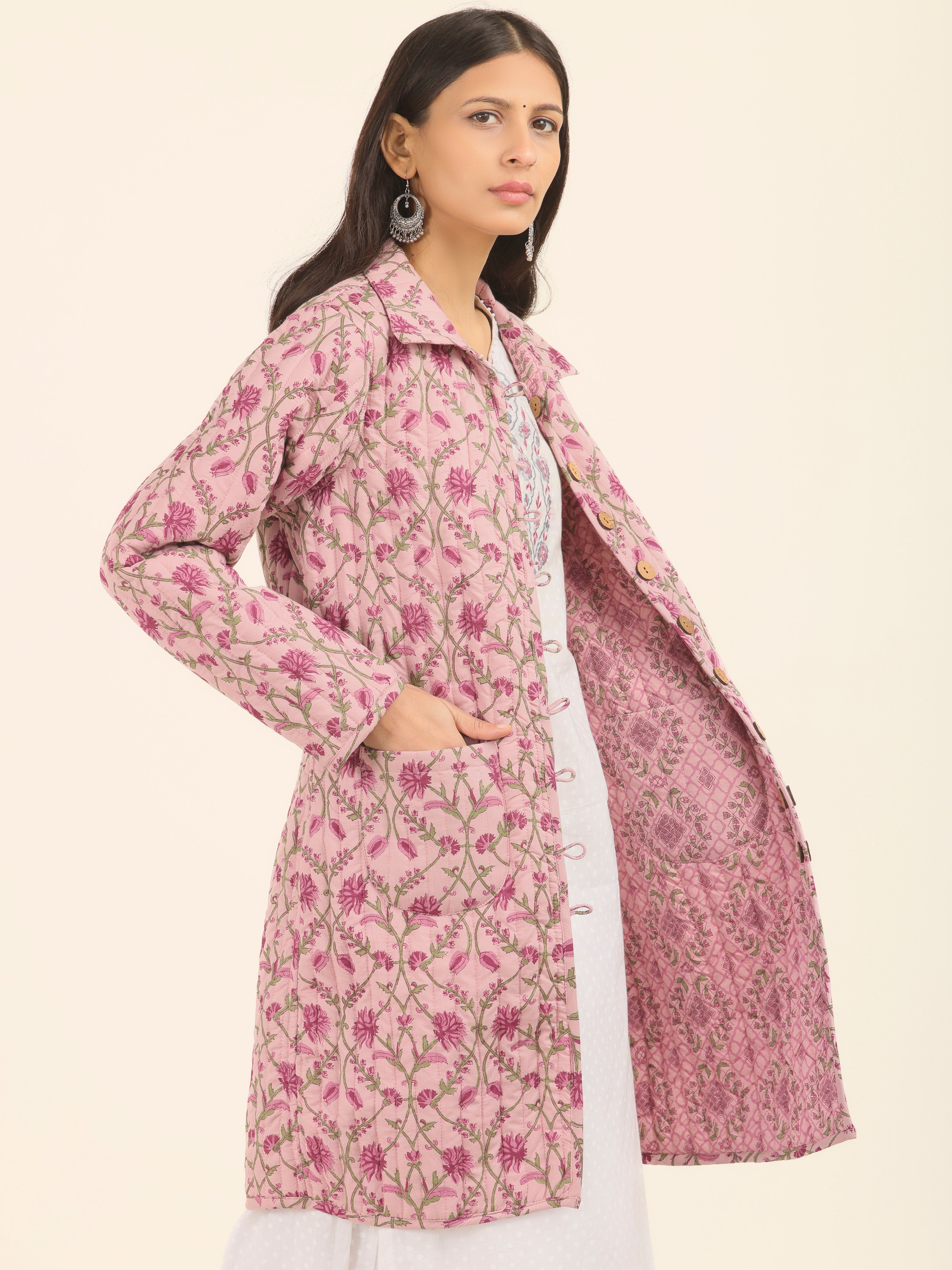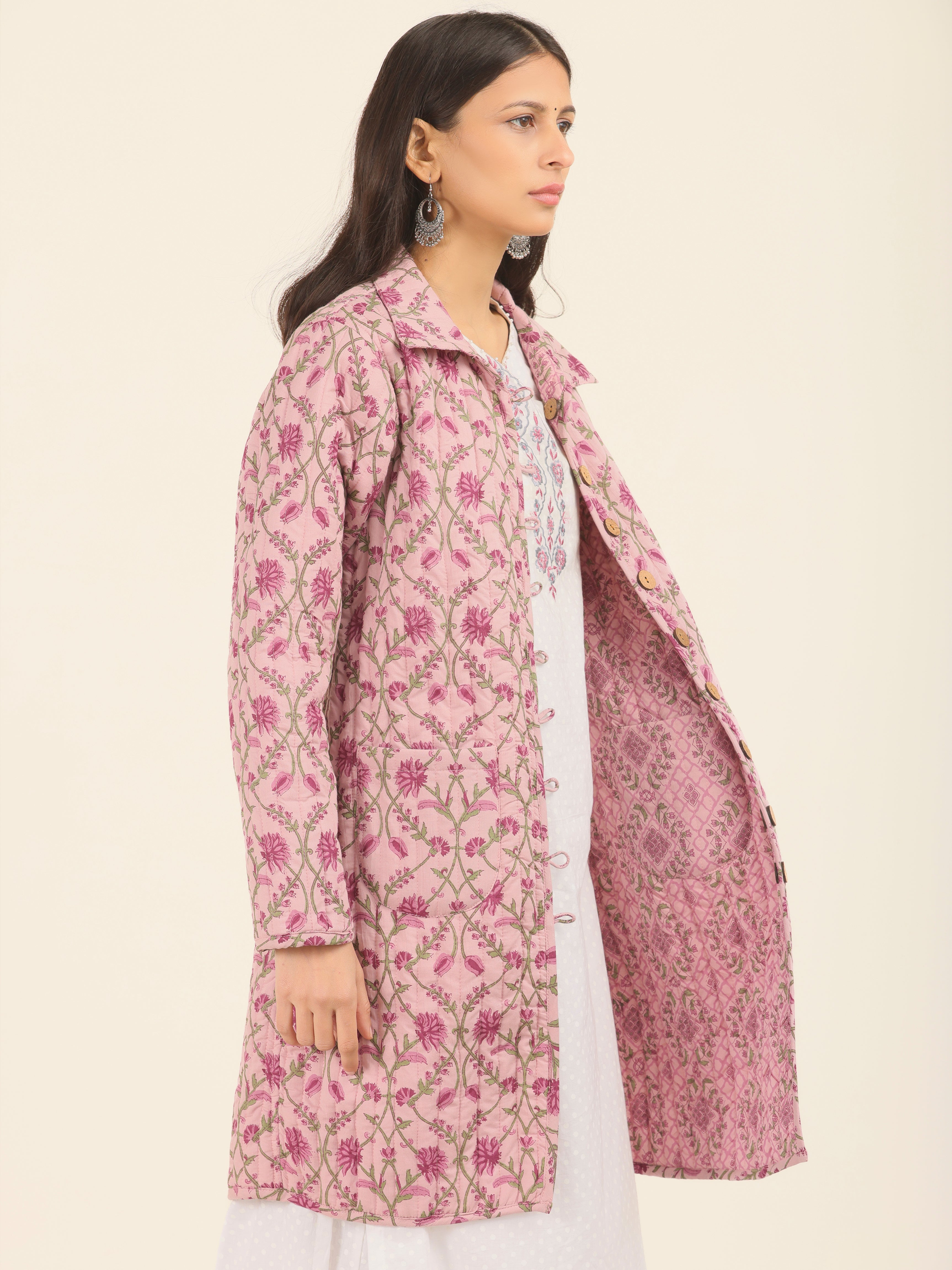 PRODUCT: Handcrafted Reversible Quilted Jacket with intrinsic and alluring work of block print on both the sides.