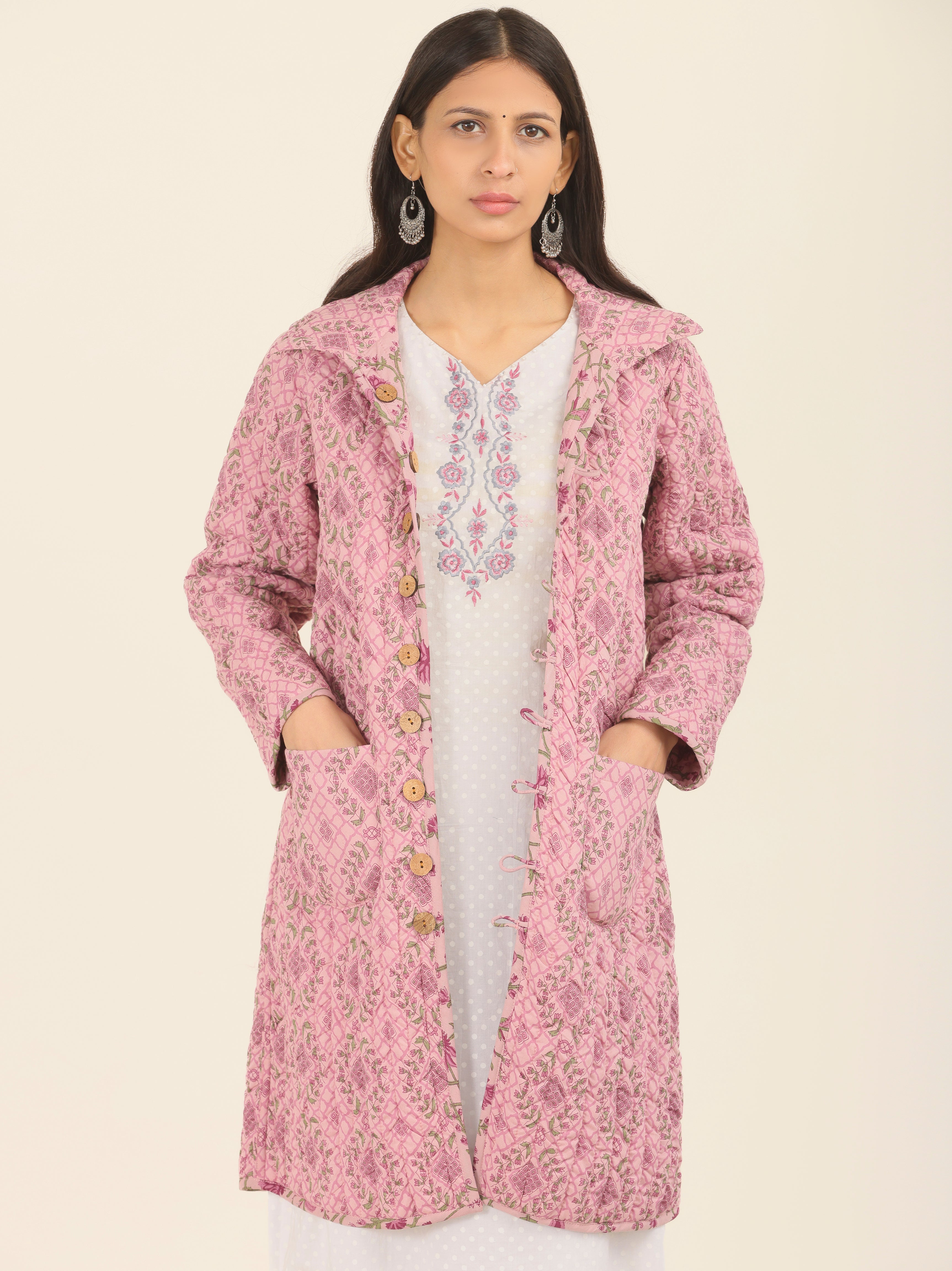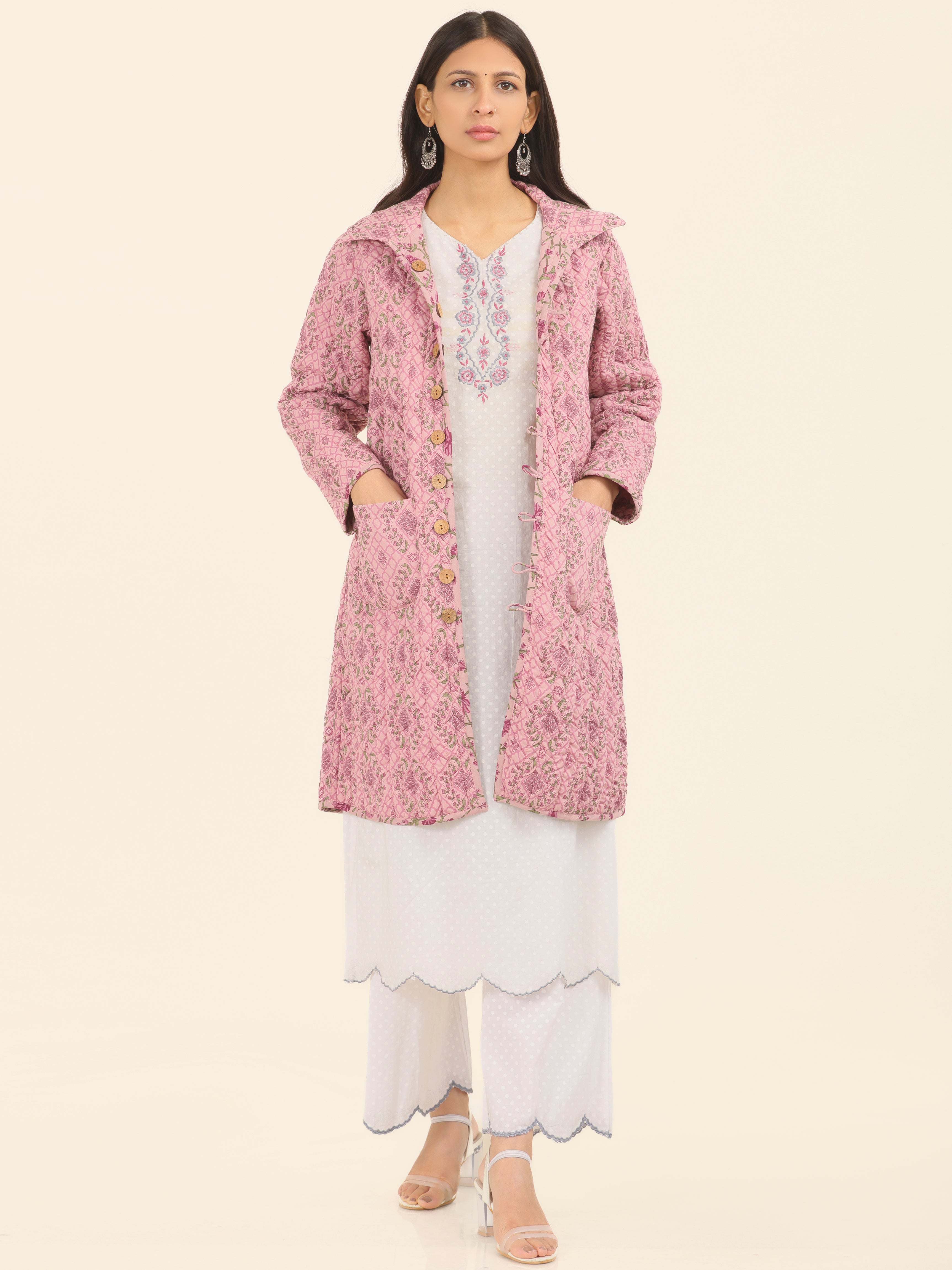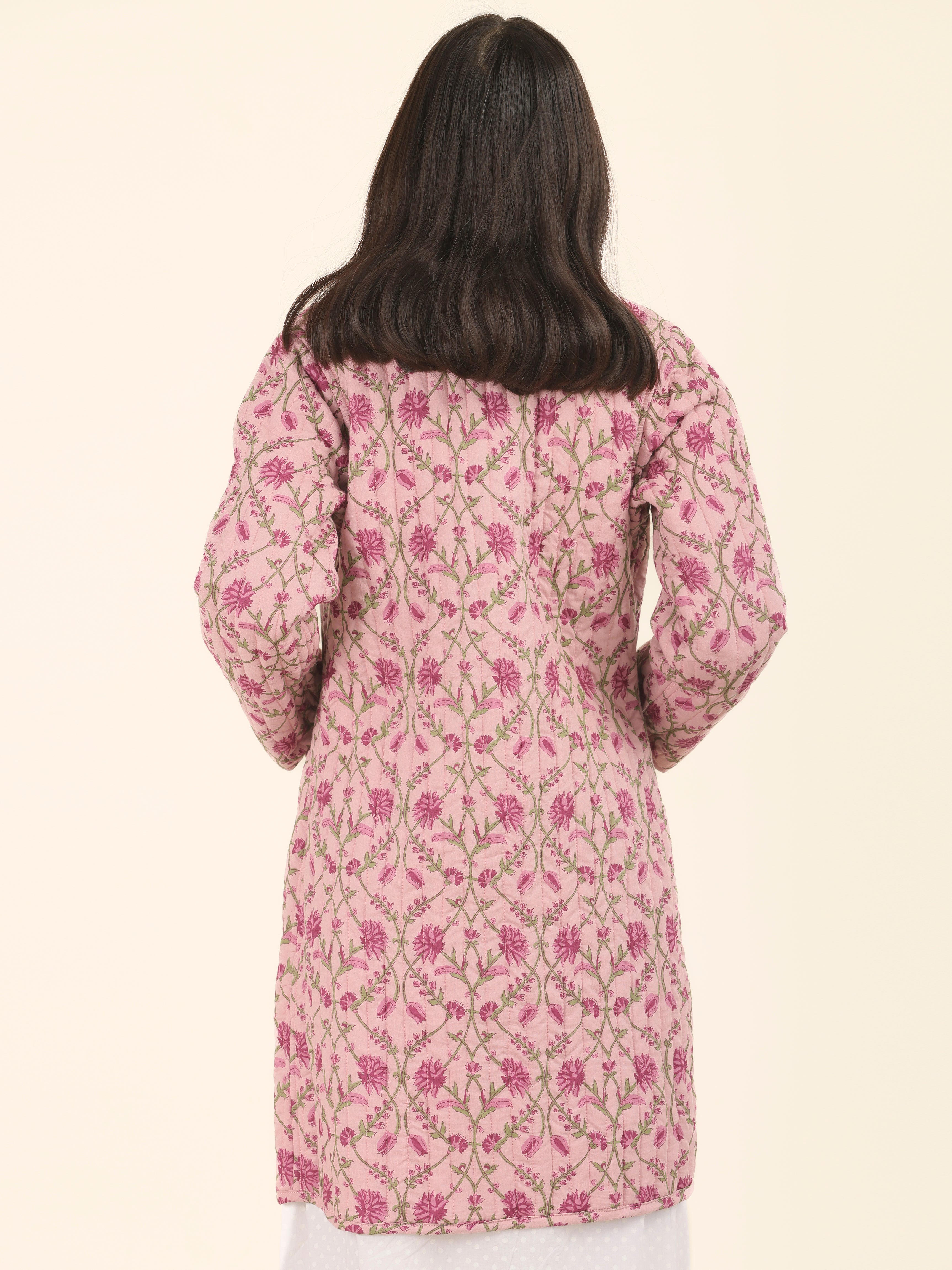PRODUCT: Handcrafted Reversible Quilted Jacket with intrinsic and alluring work of block print on both the sides.