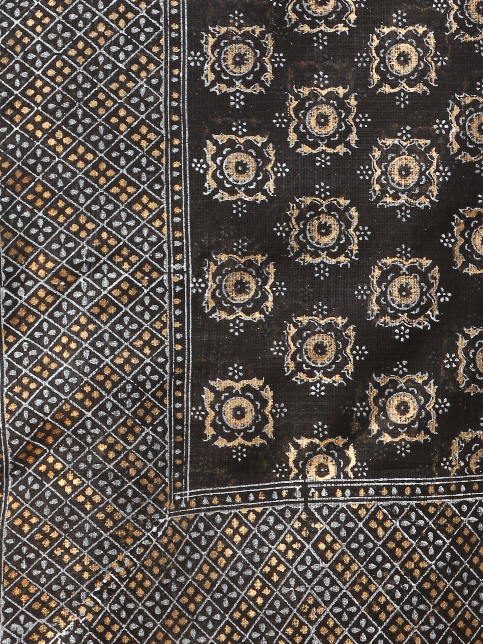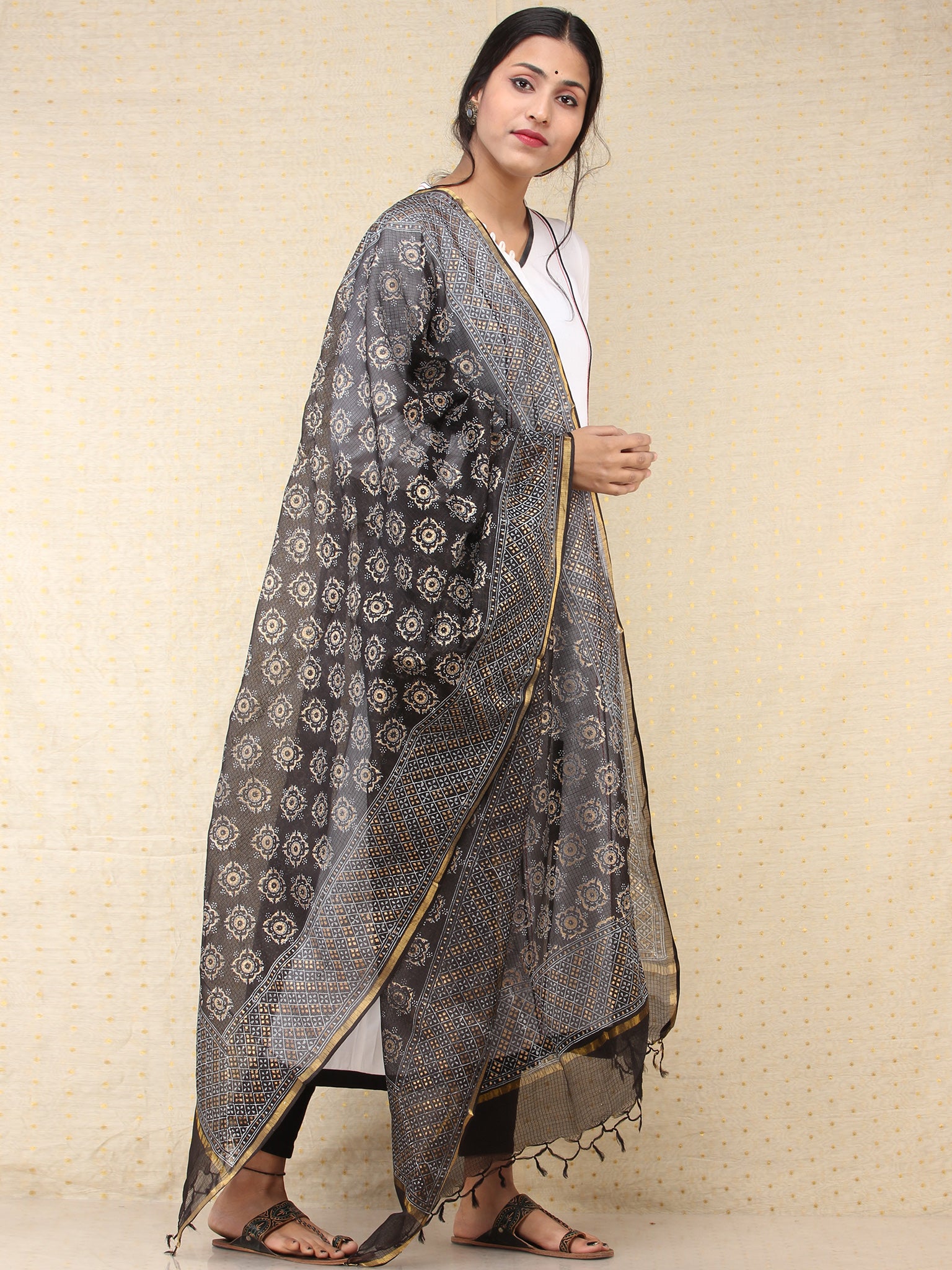 Black Indigo Kota Silk Hand Block Printed Dupatta - D04170774