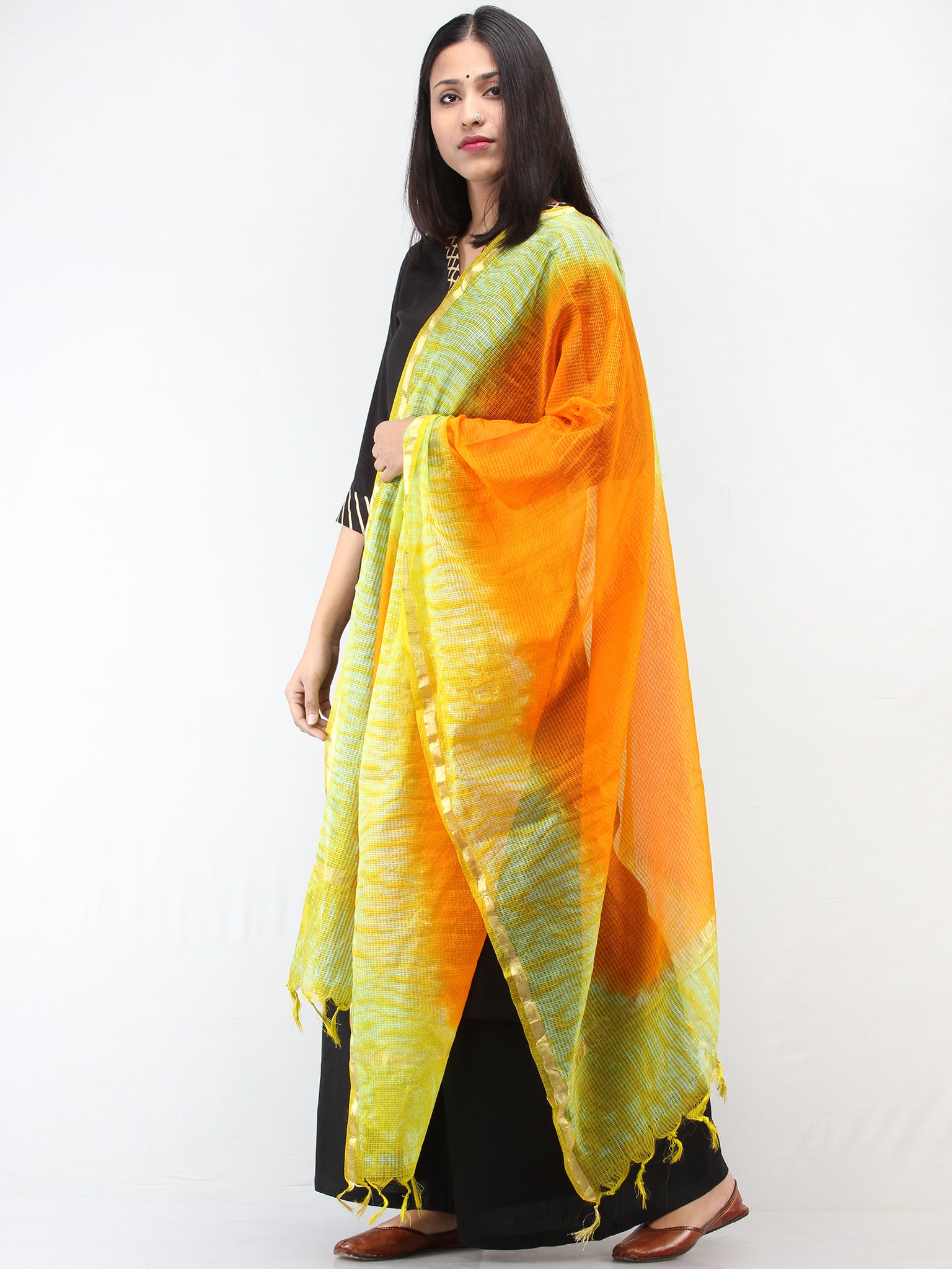 Kota Doria Tie & Die Dupatta With Zari Border - Parrot Green & Orange - D04170895