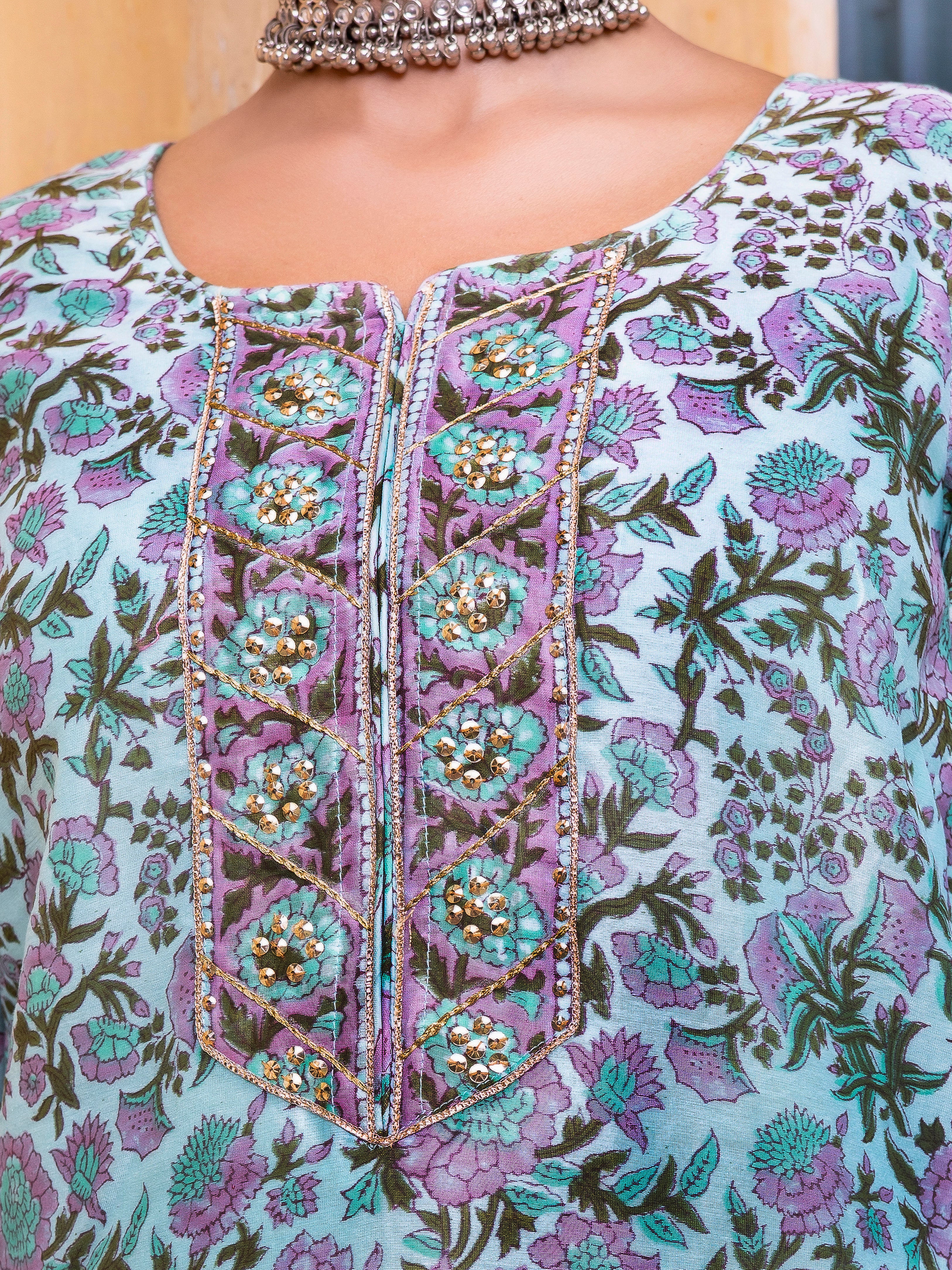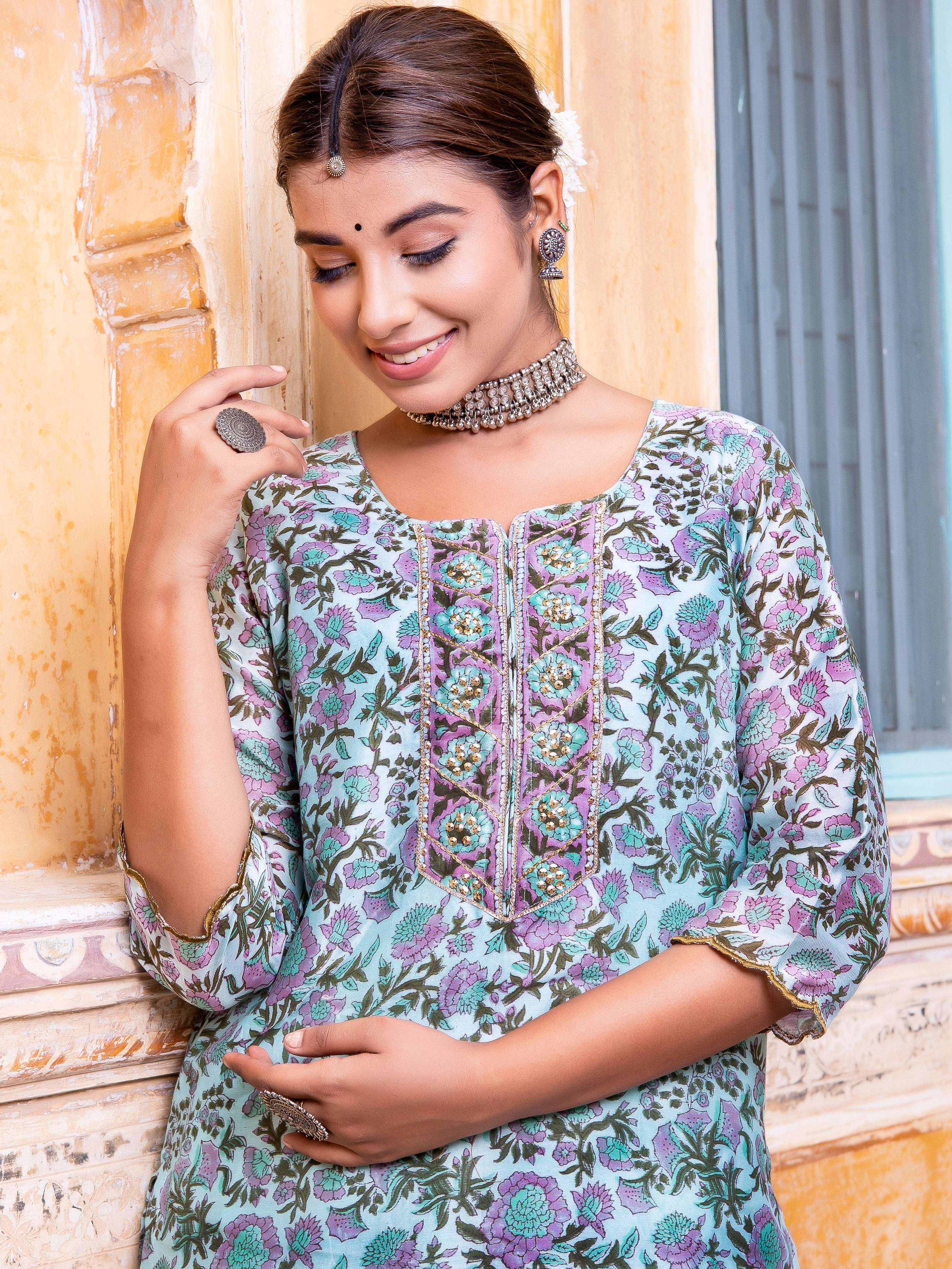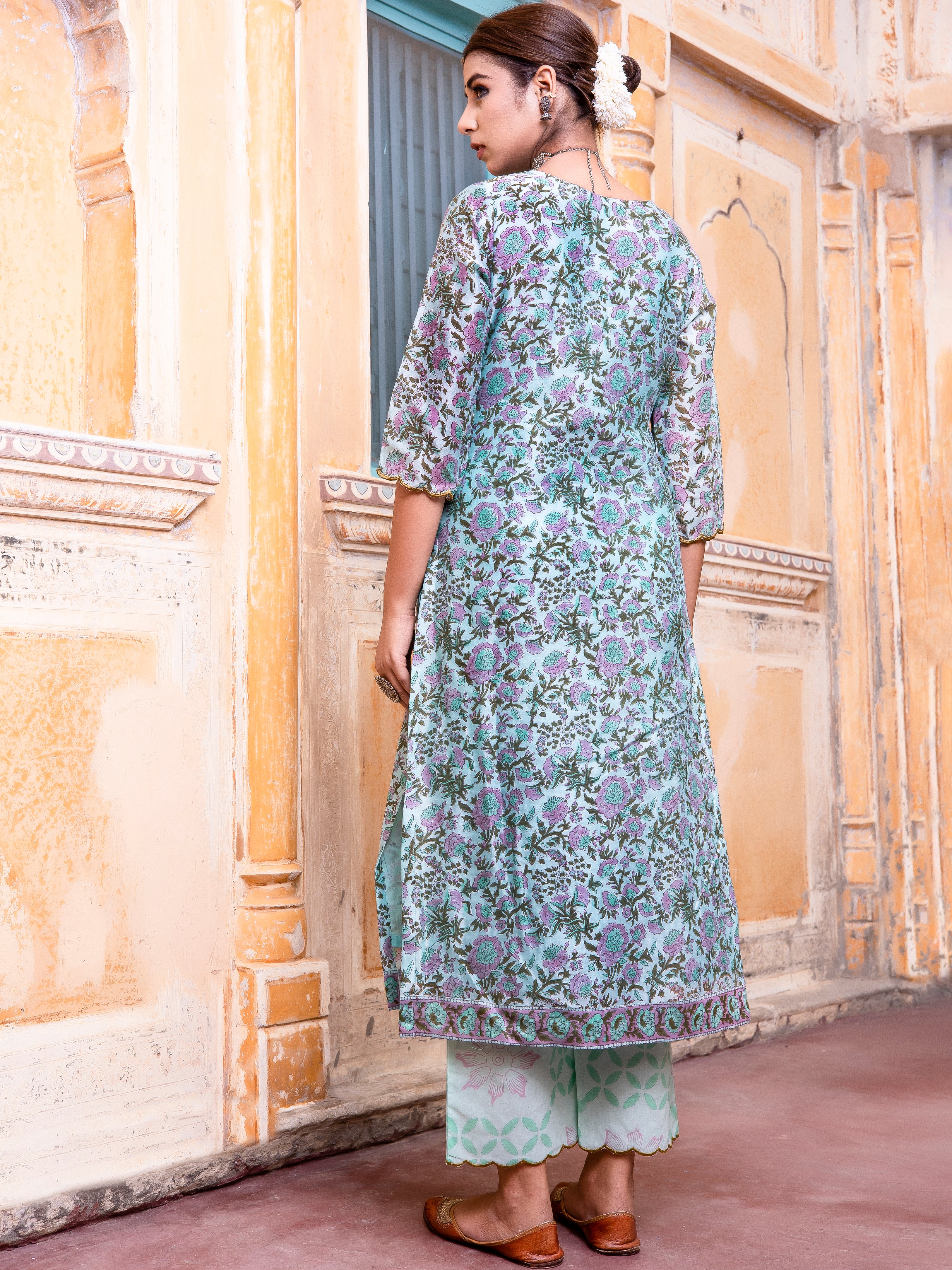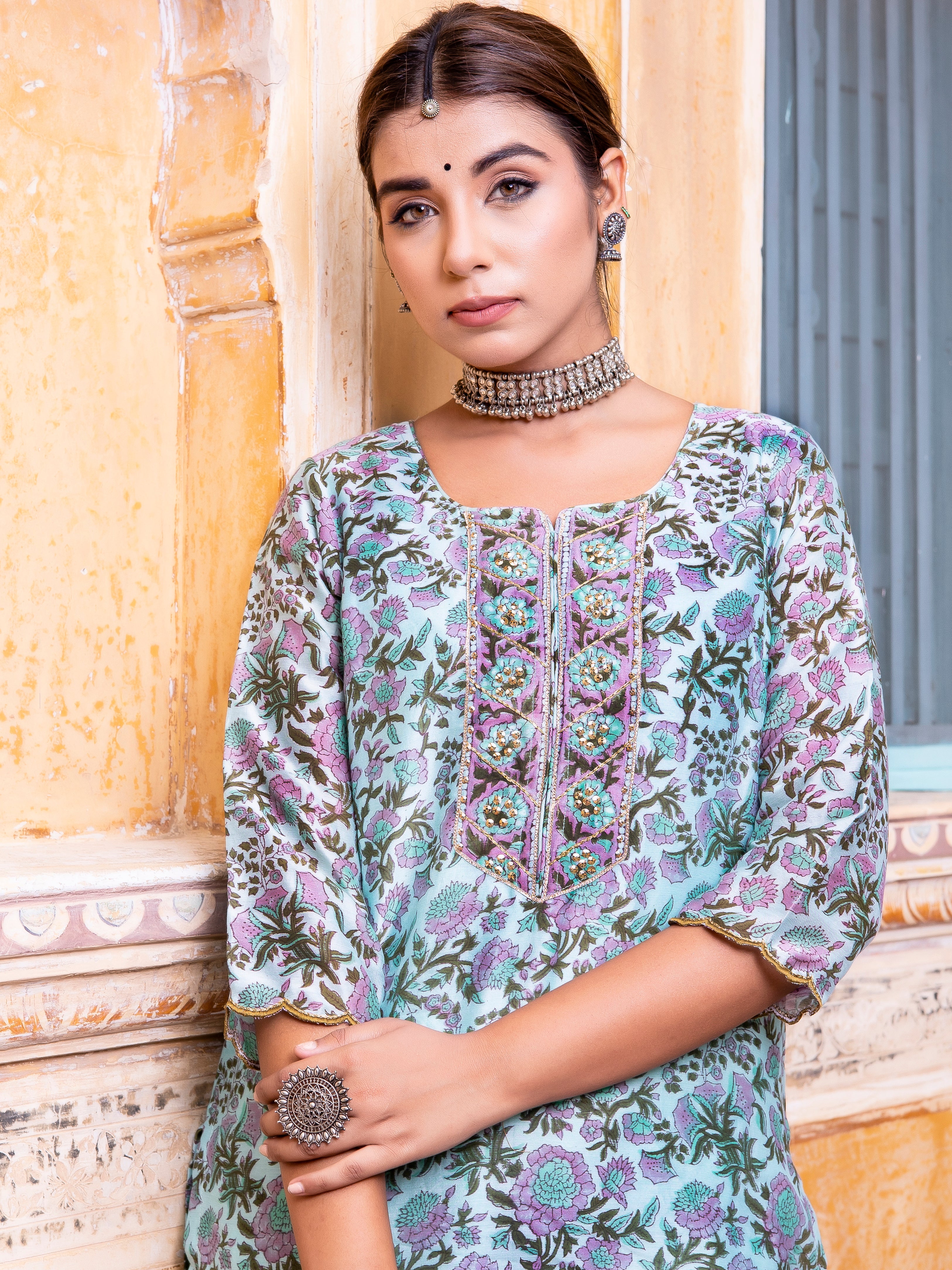 Product: This set contains Handcrafted Sanganeri Premium Chanderi Kurta With Mul lining, 100% Cotton Pants and Kota Doria Dupatta.