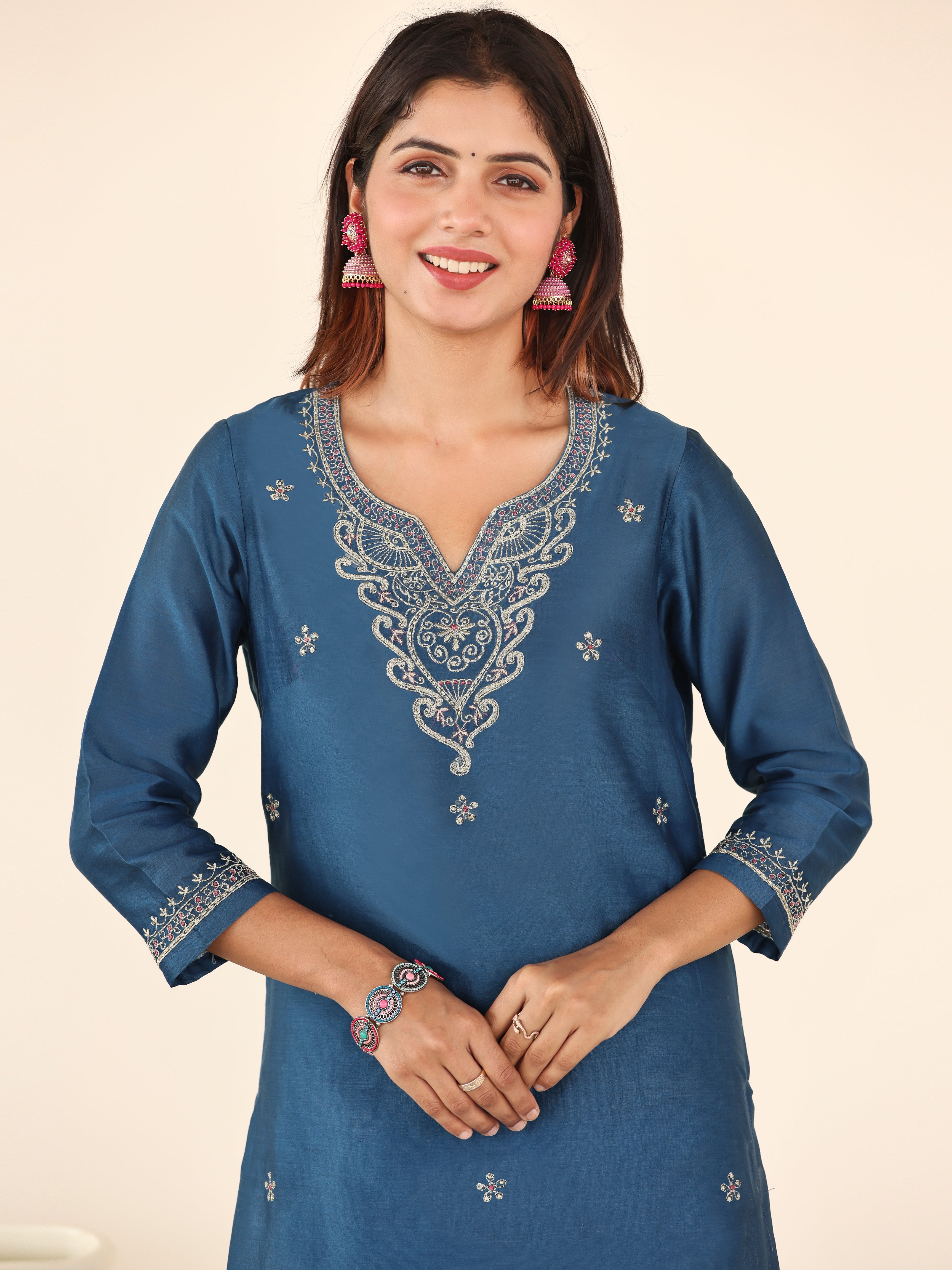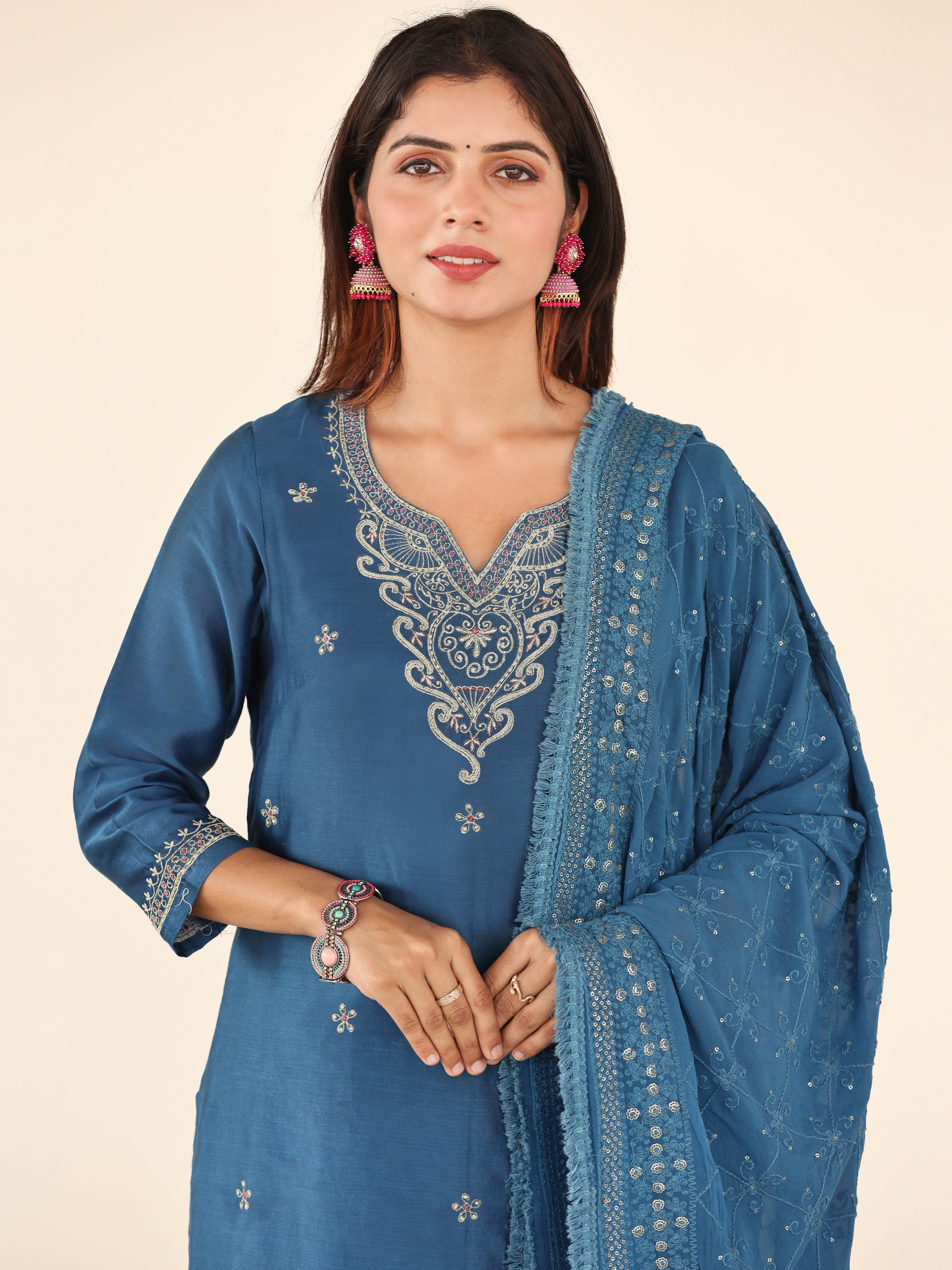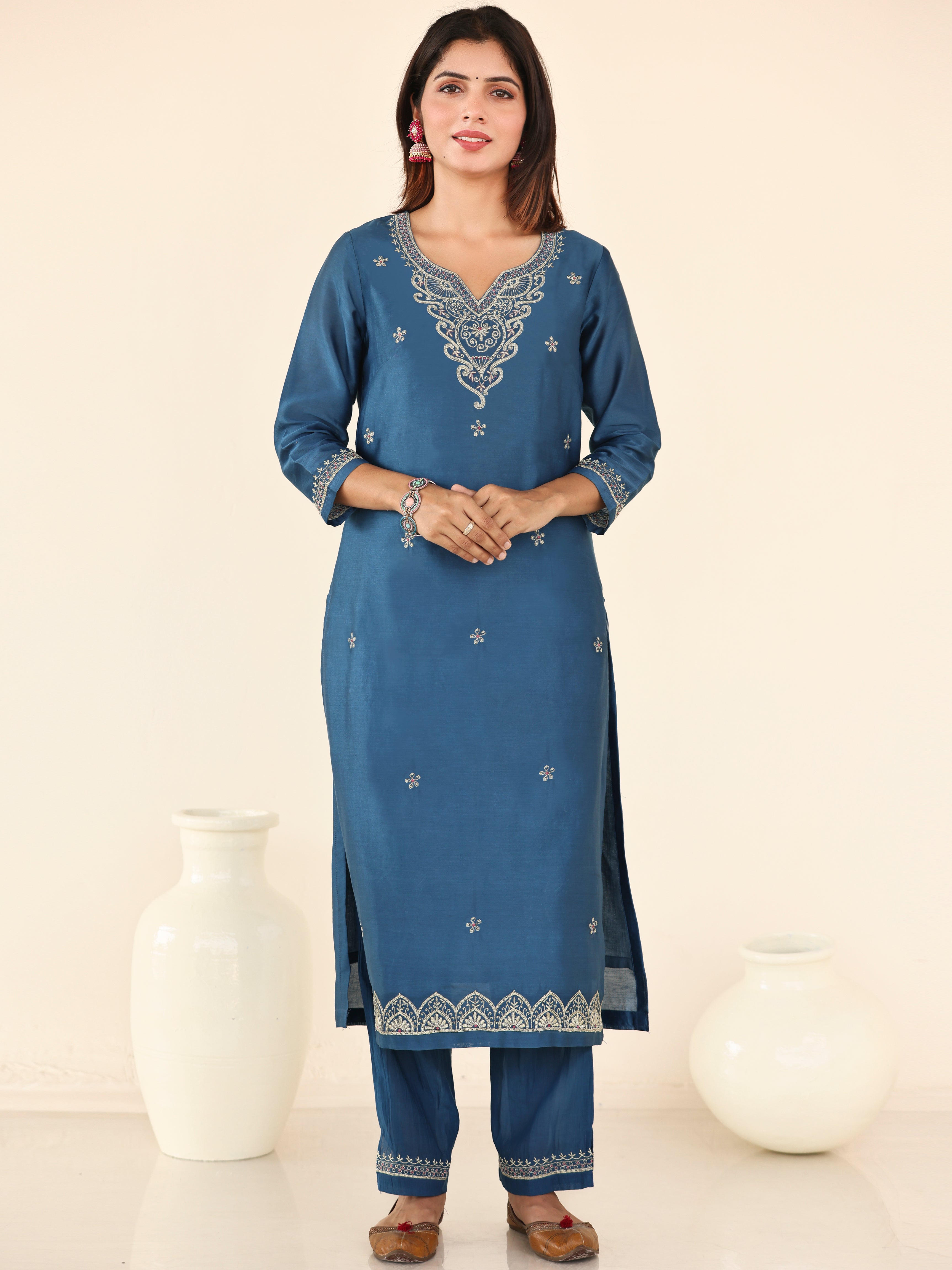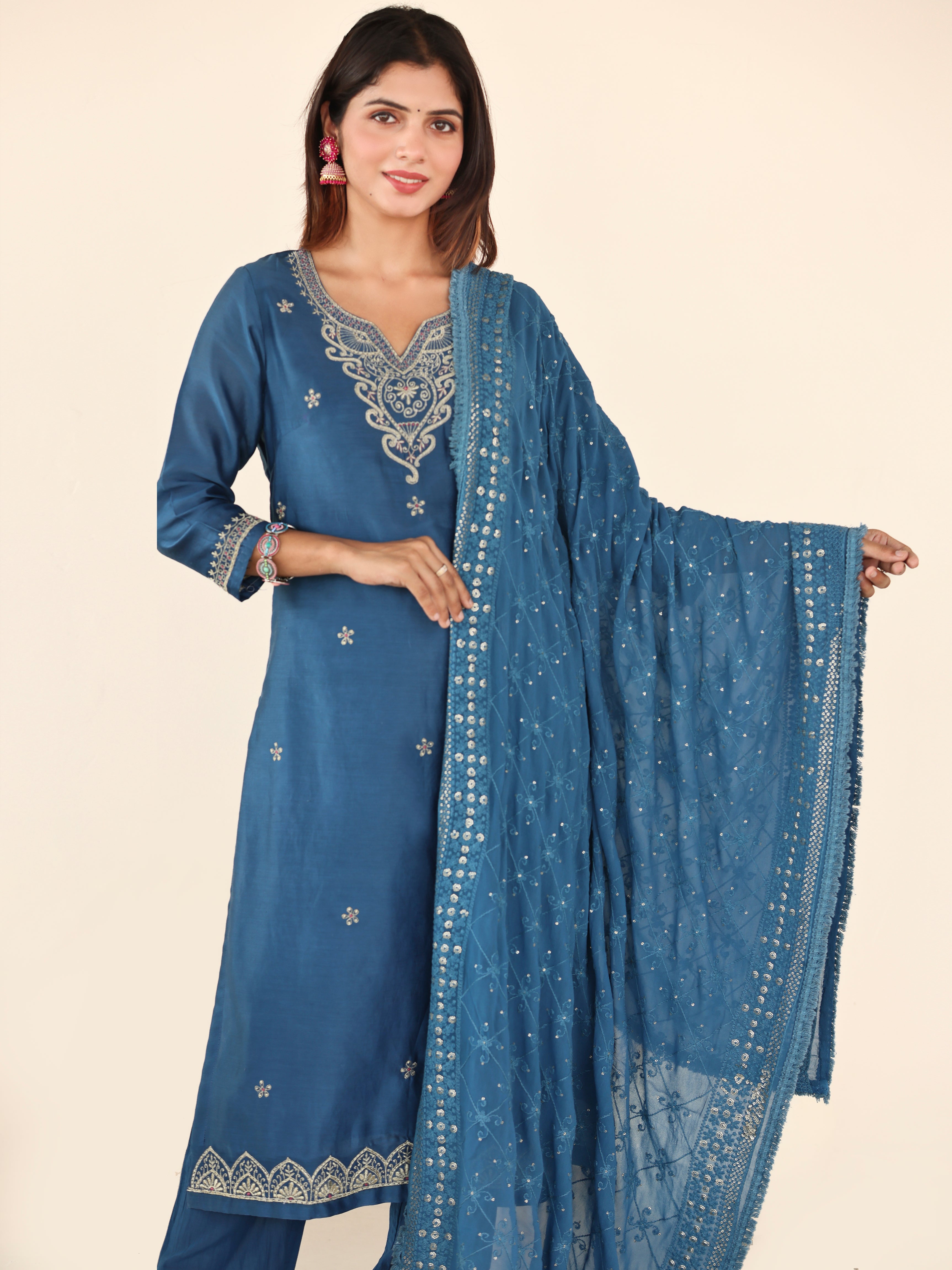 Product: This set contains Handcrafted Premium Chanderi Kurta With Mul lining, Modal Silk Pants and Georgette Dupatta with Embroidery.