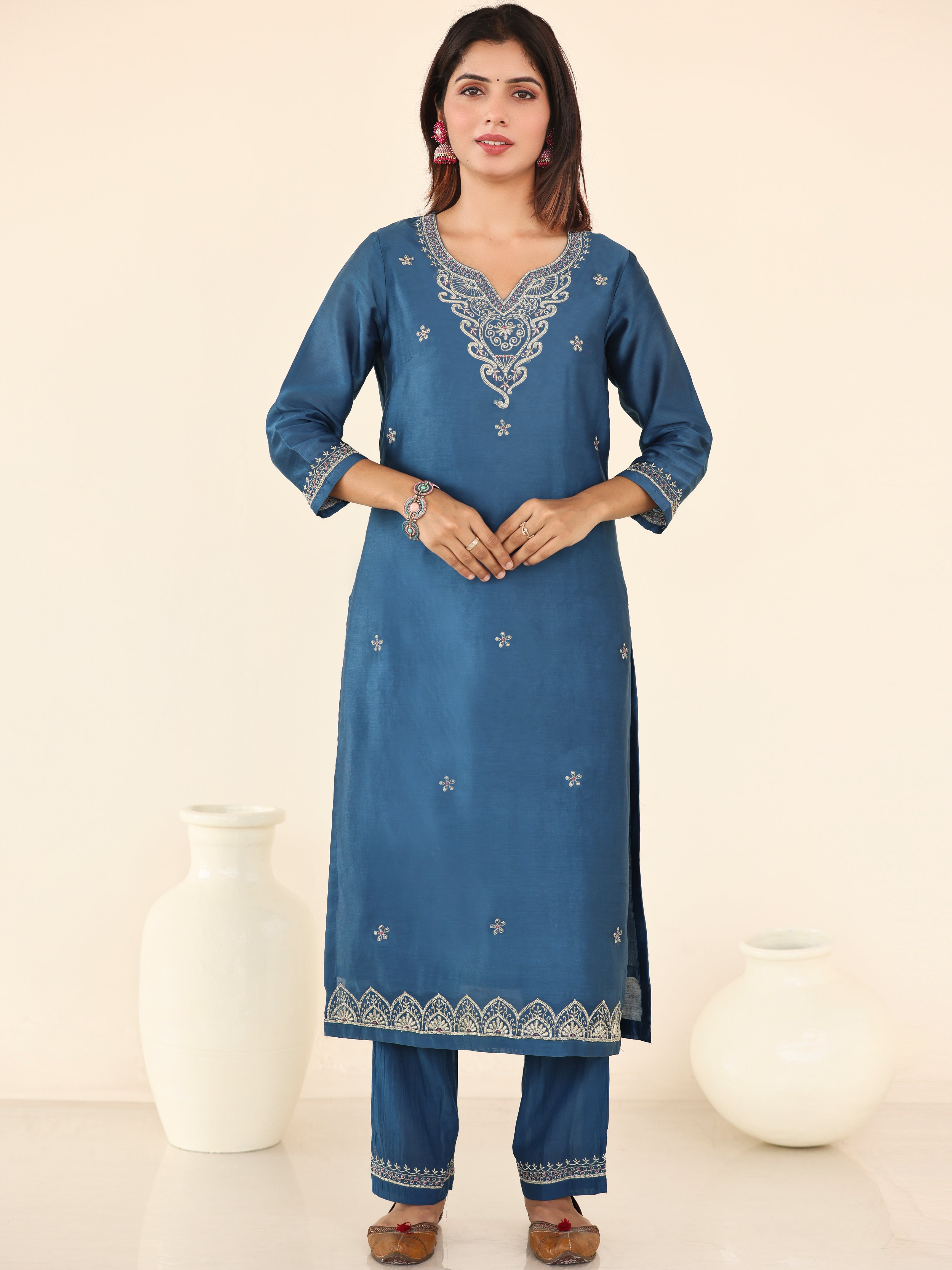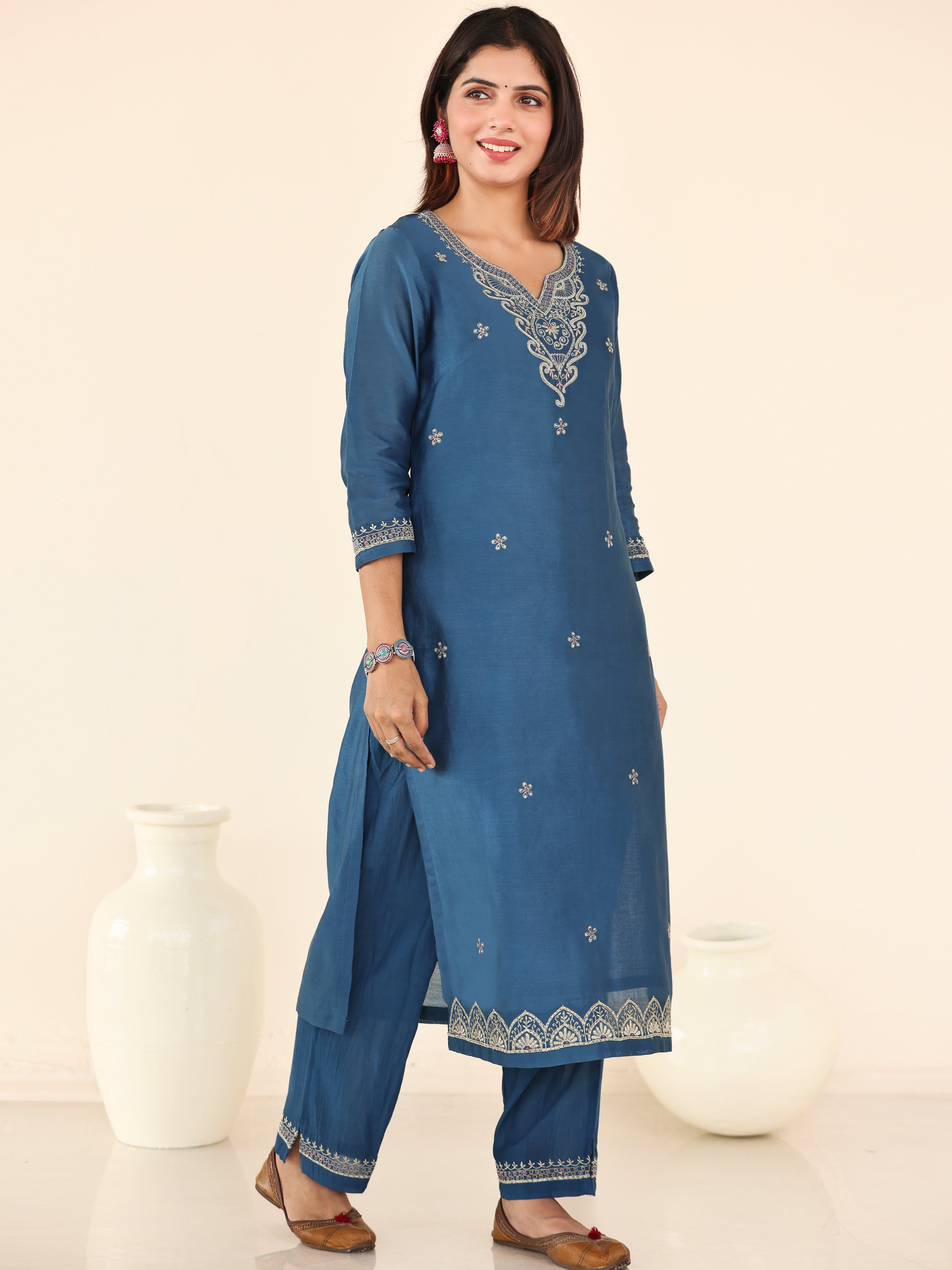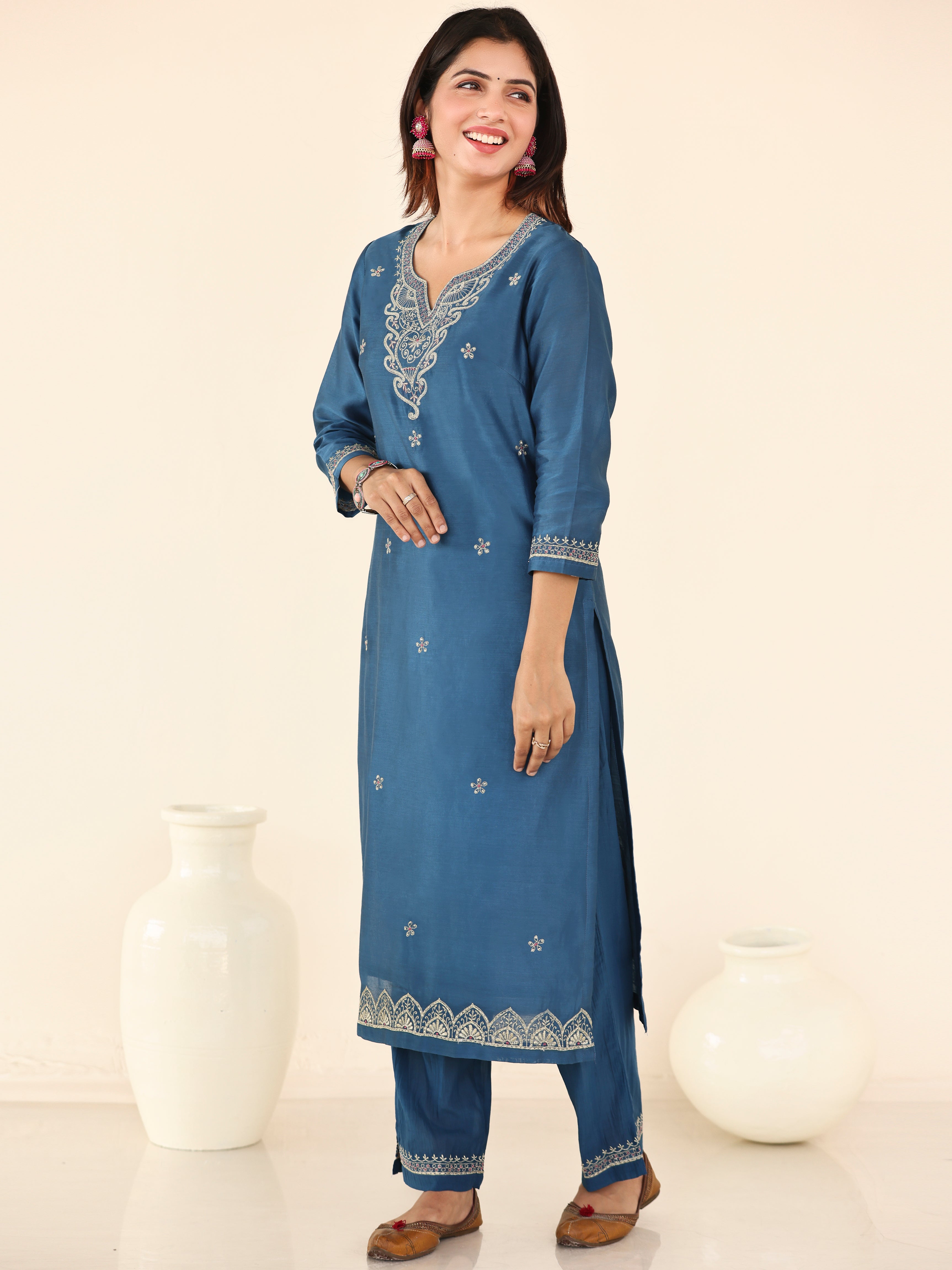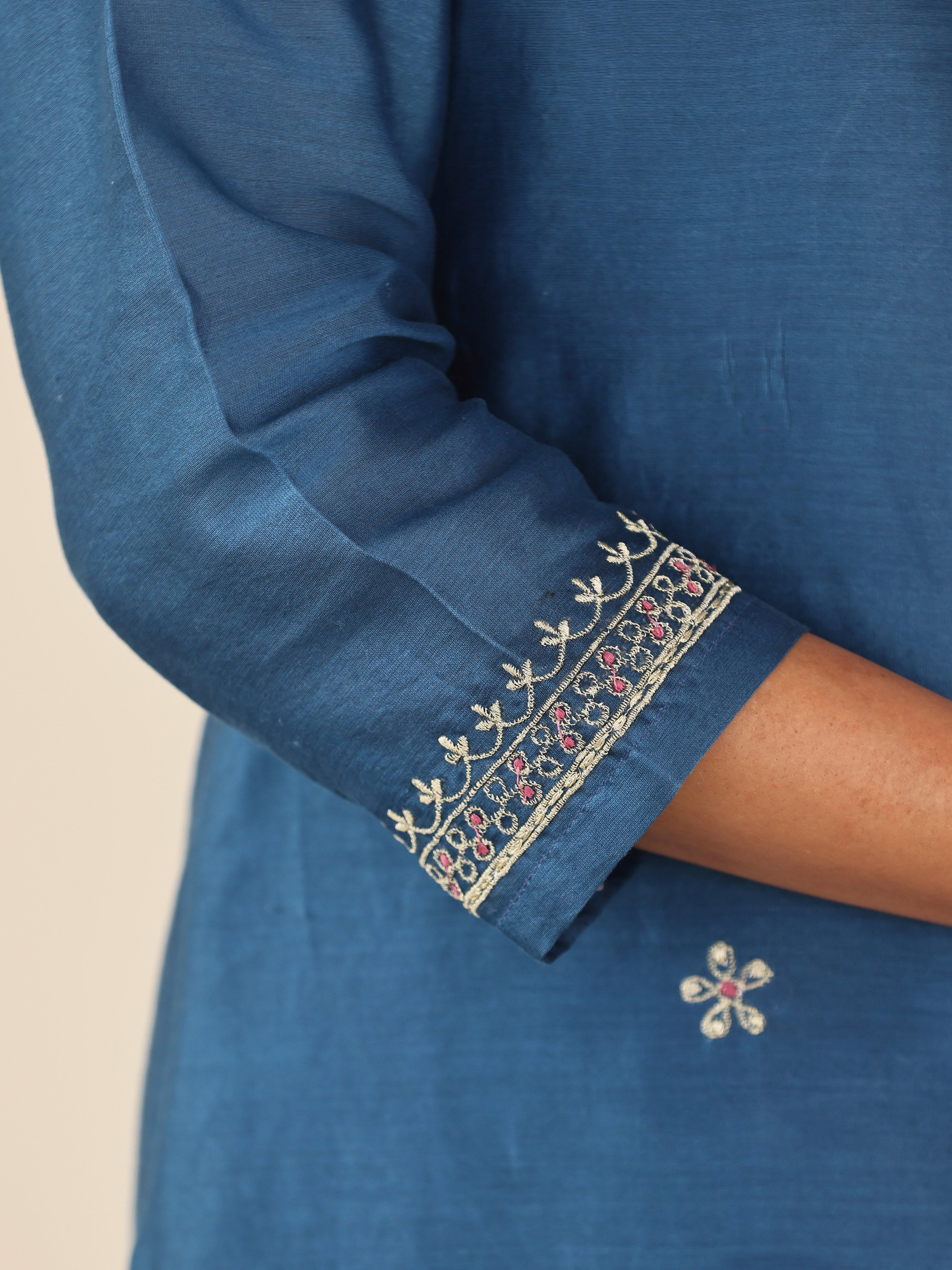 Product: This set contains Handcrafted Premium Chanderi Kurta With Mul lining, Modal Silk Pants and Georgette Dupatta with Embroidery.