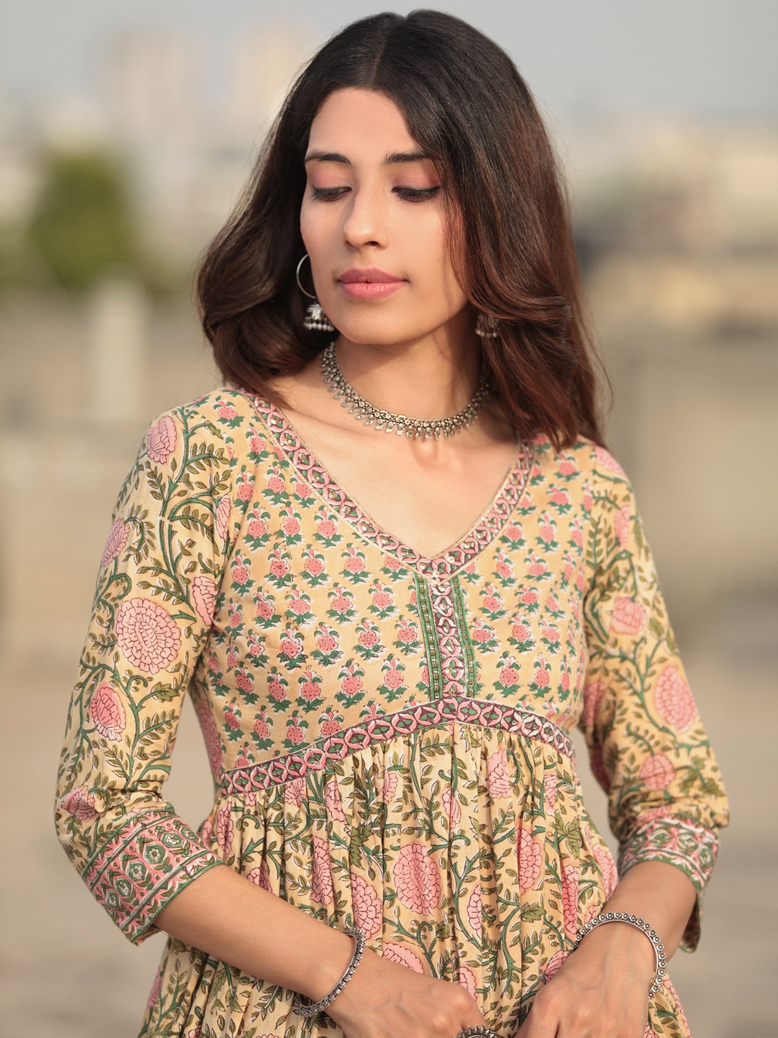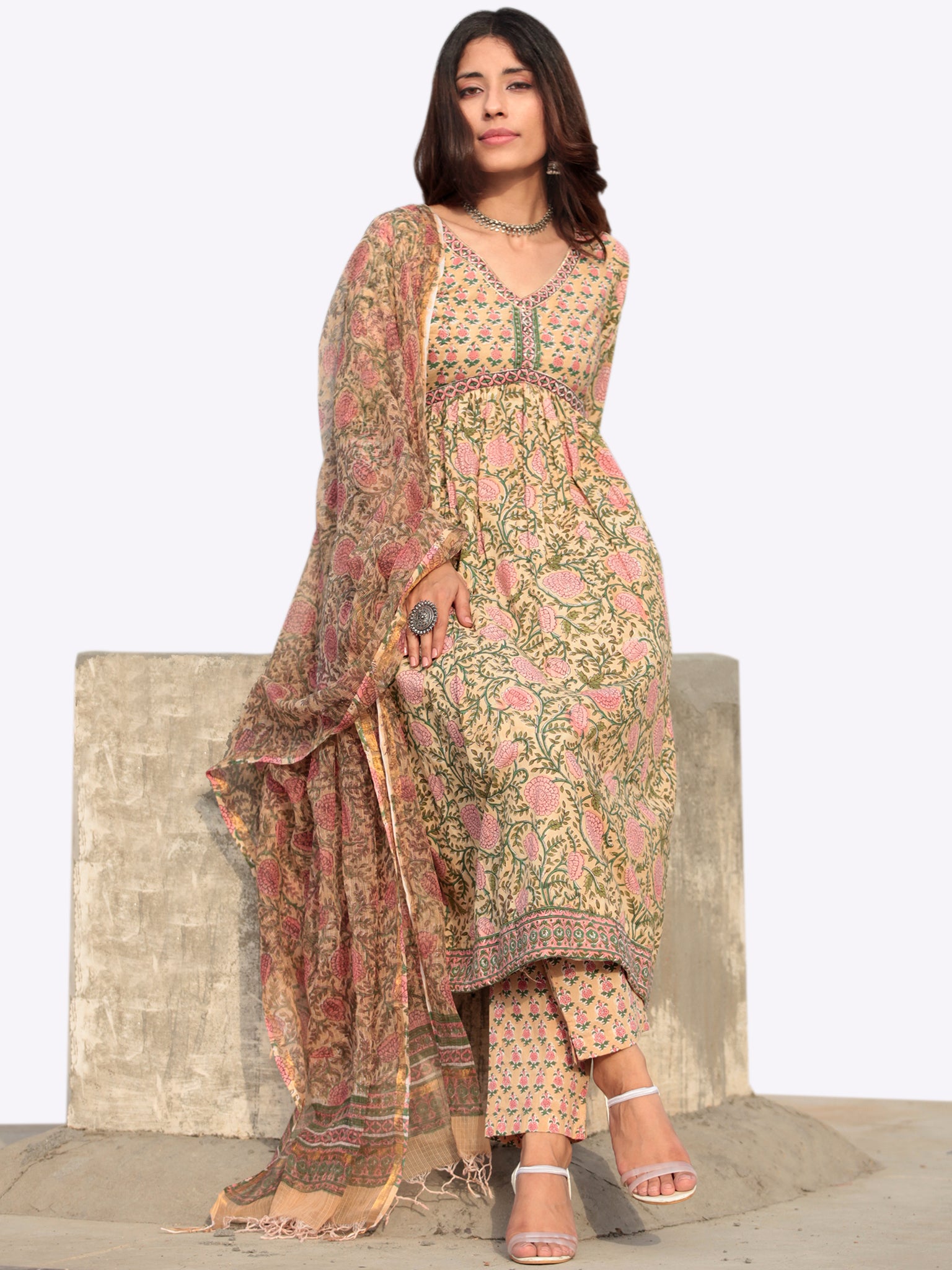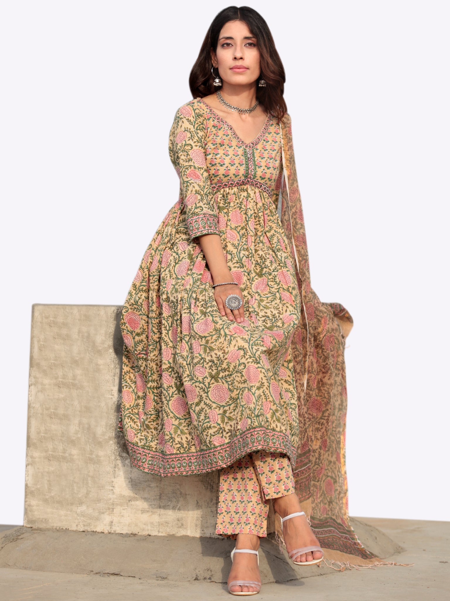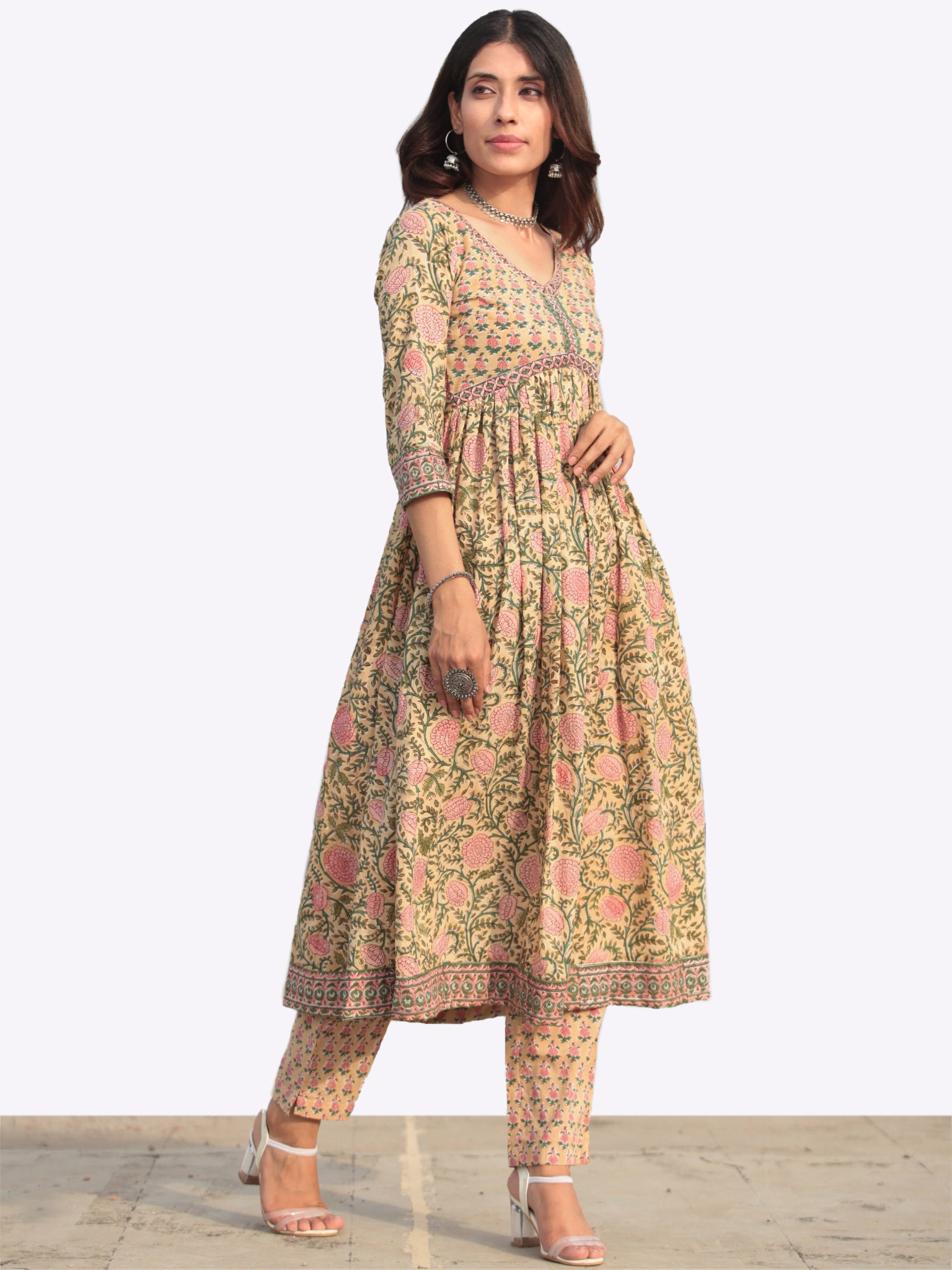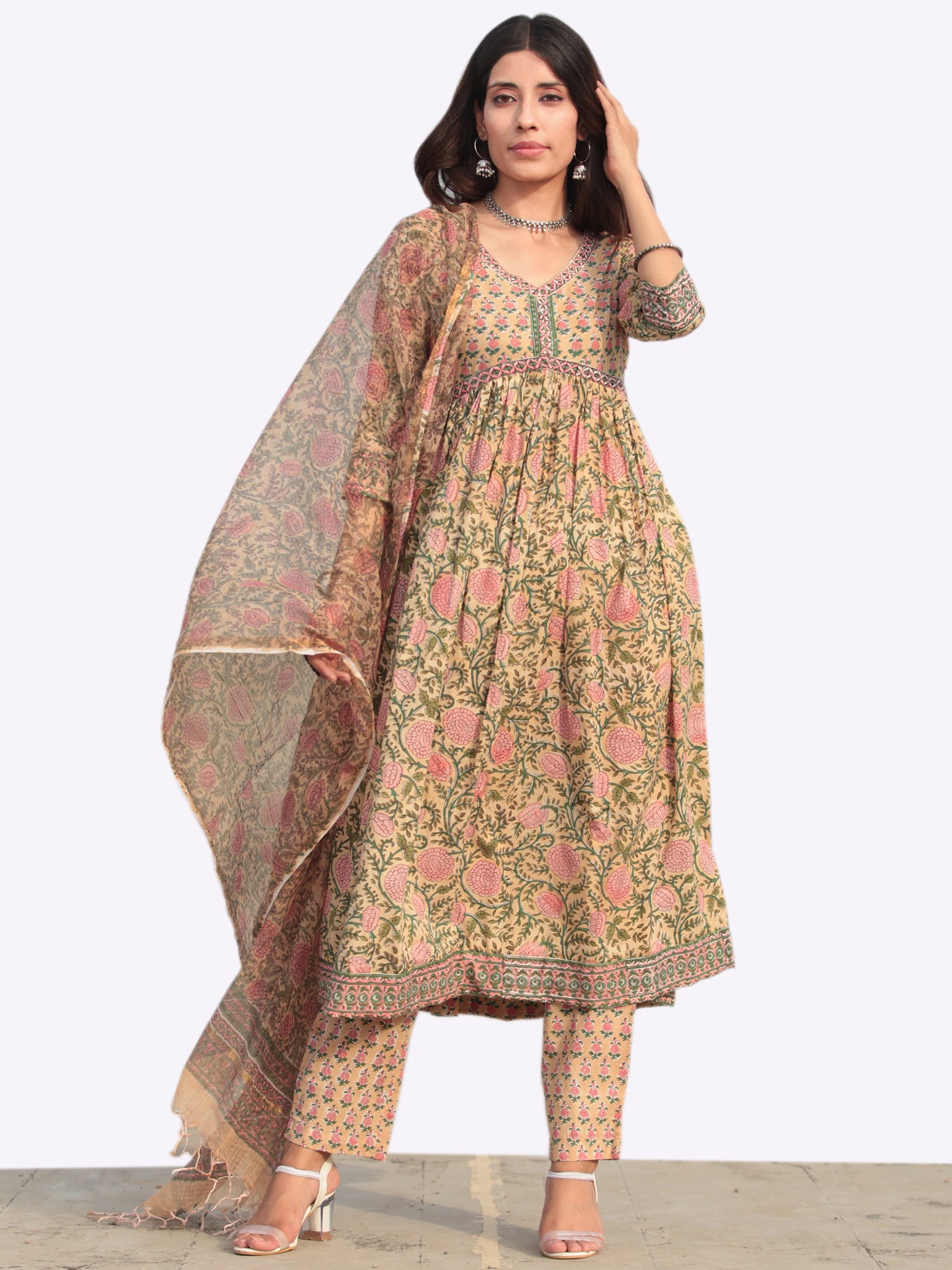 Product: This set contains Handcrafted Sanganeri Premium Cotton Kurta, 100% Cotton Pants and Kota Doria Dupatta.