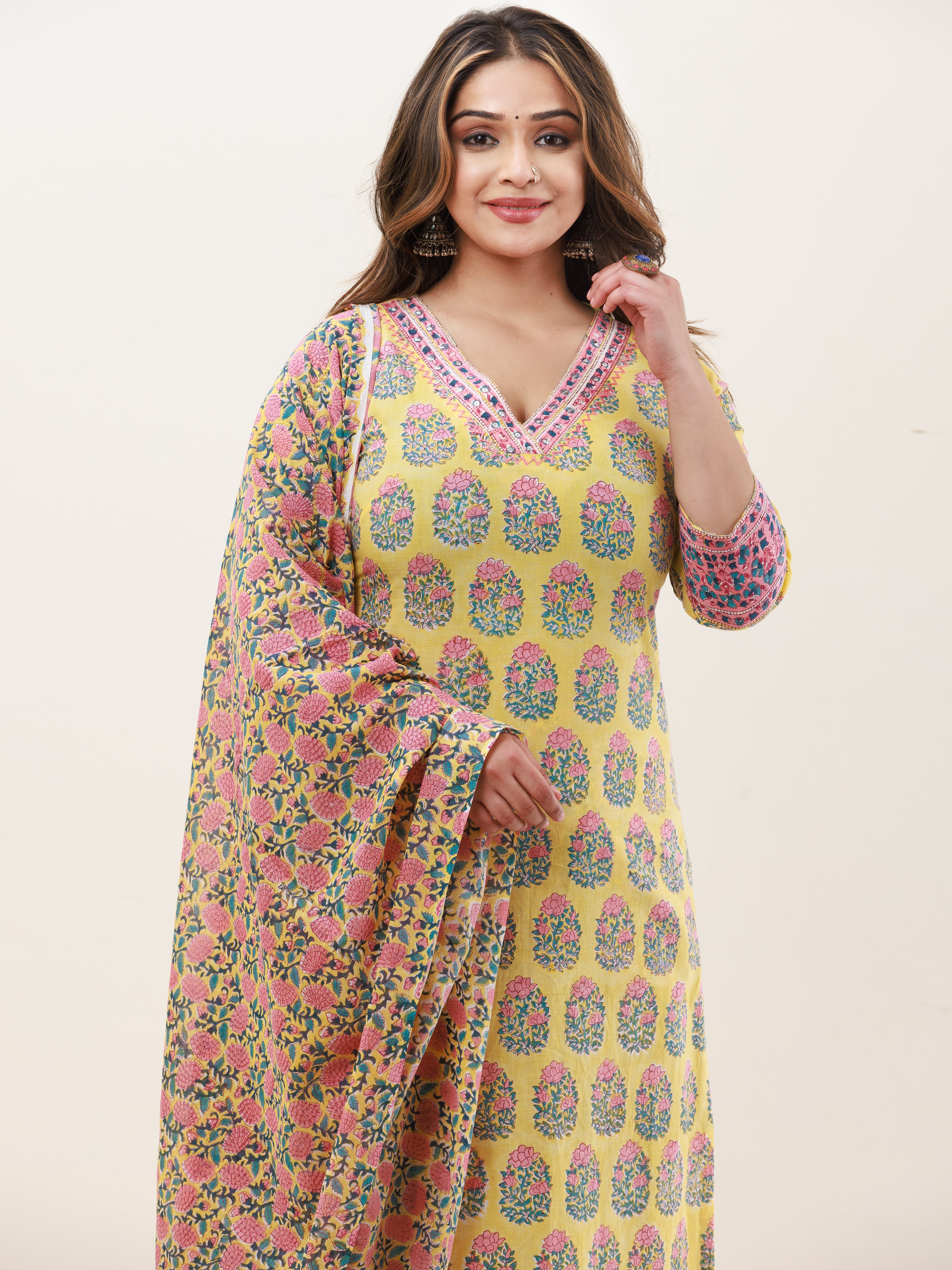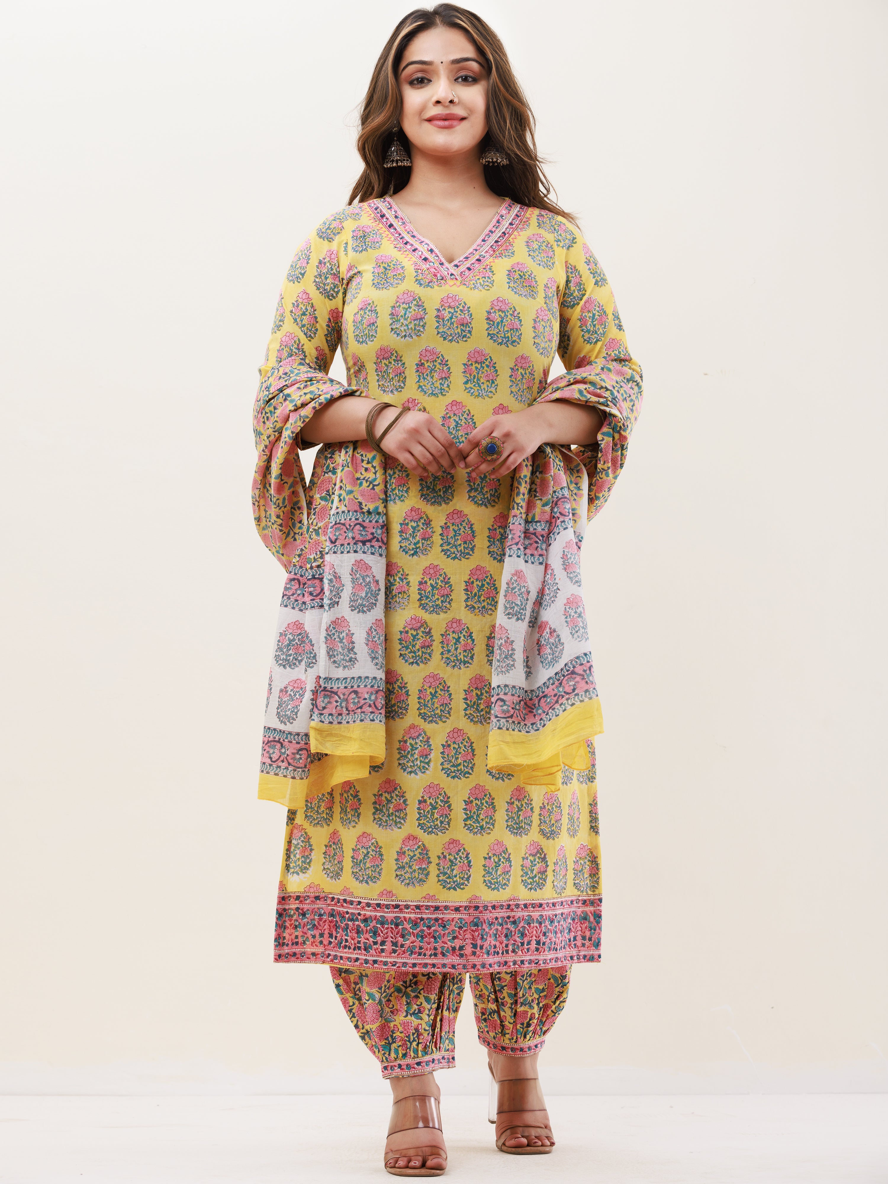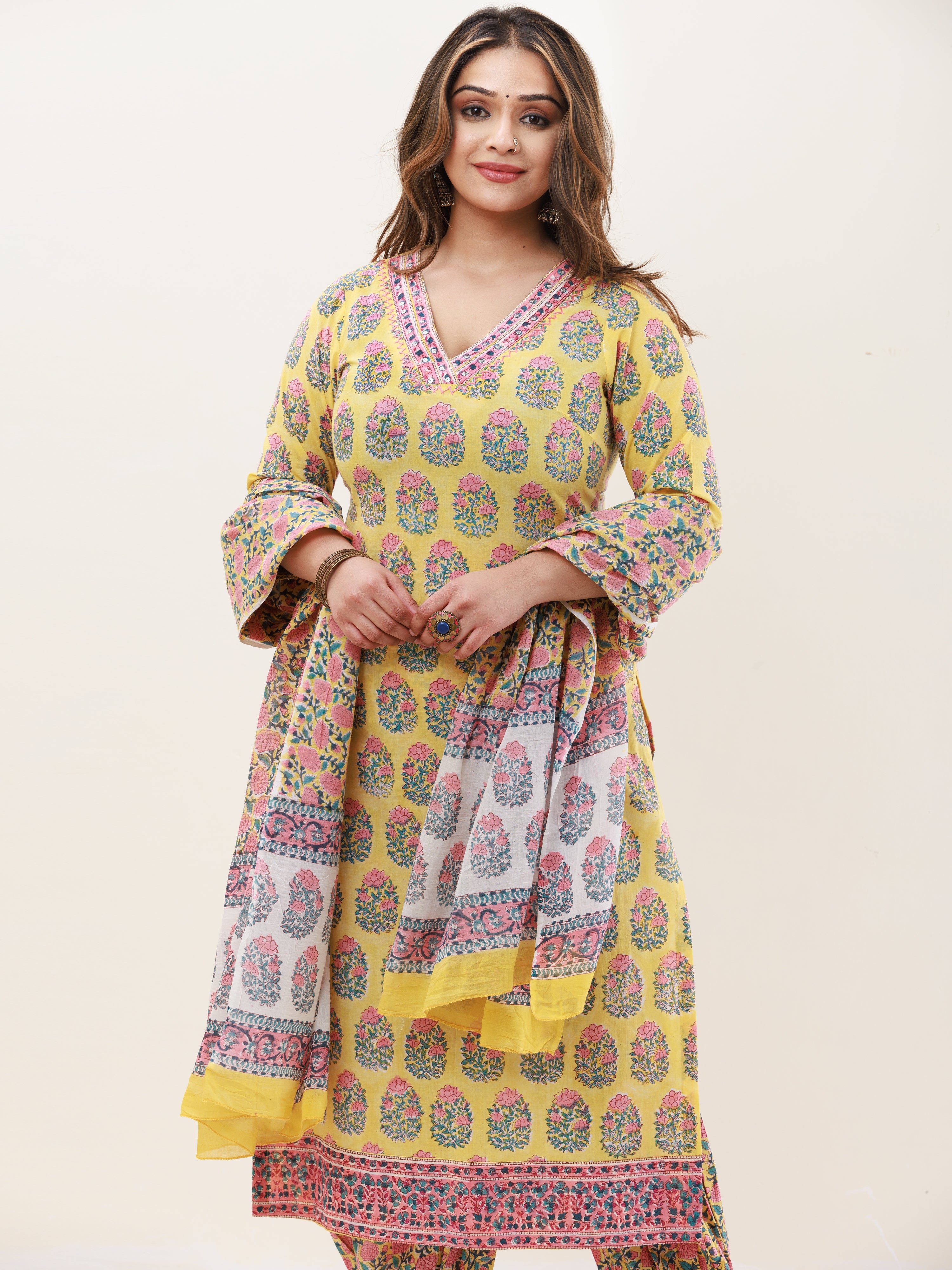 Product: This set contains Handcrafted Sanganeri Premium Cotton Kurta, 100% Cotton Pants and Cotton Mul Mul Dupatta.