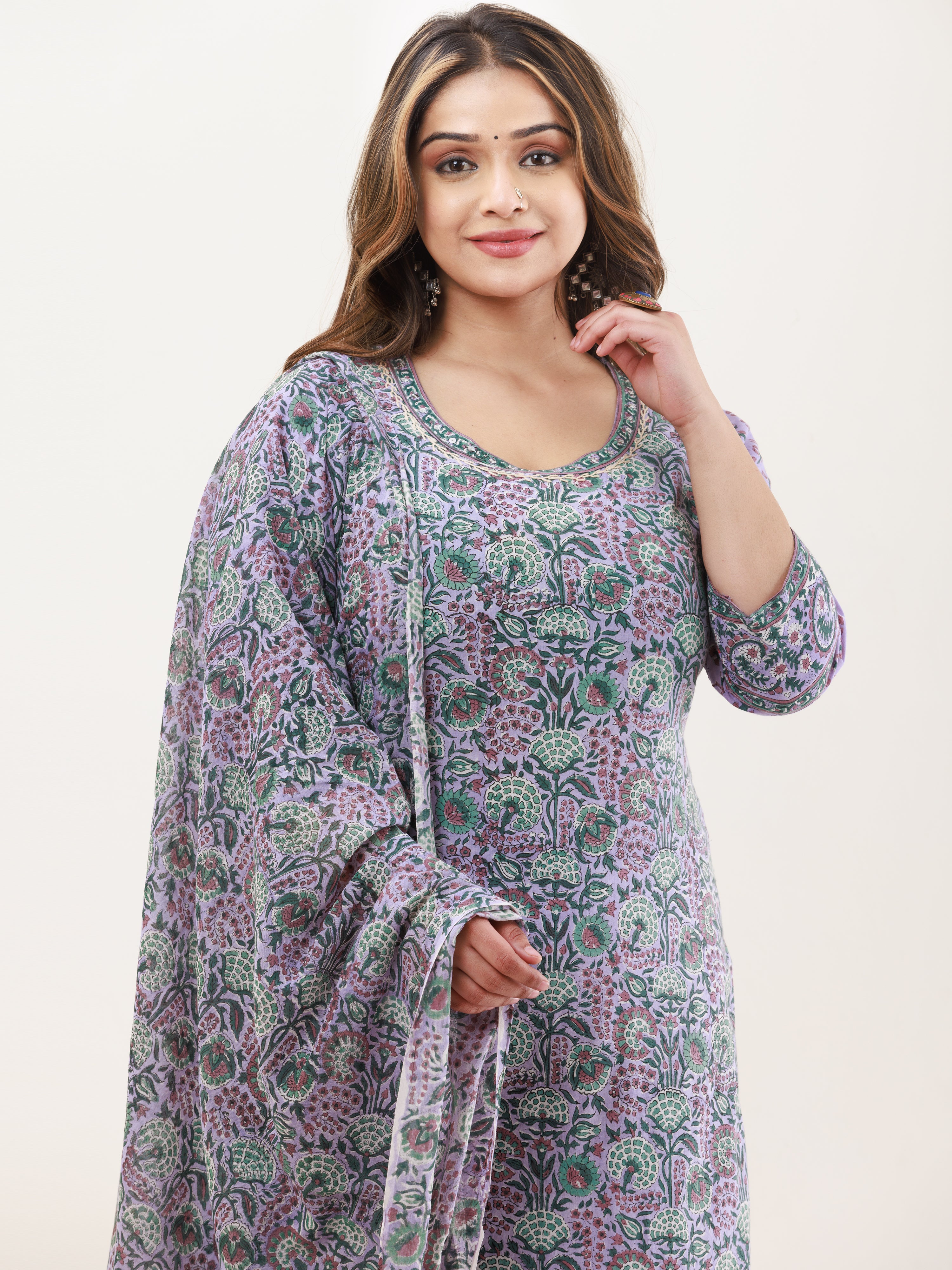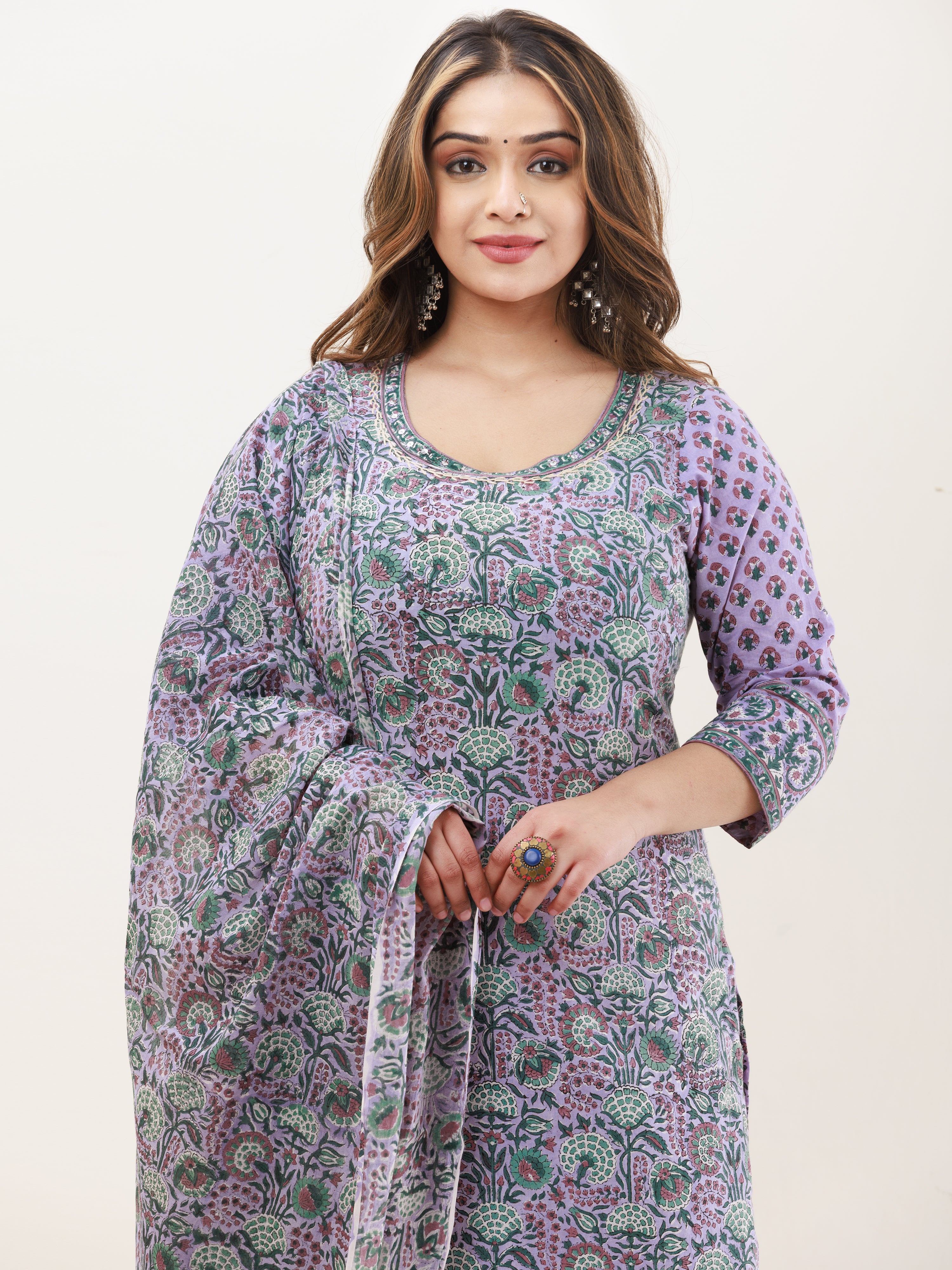 Product: This set contains Handcrafted Sanganeri Premium Cotton Kurta, 100% Cotton Pants and Cotton Mul Mul Dupatta.