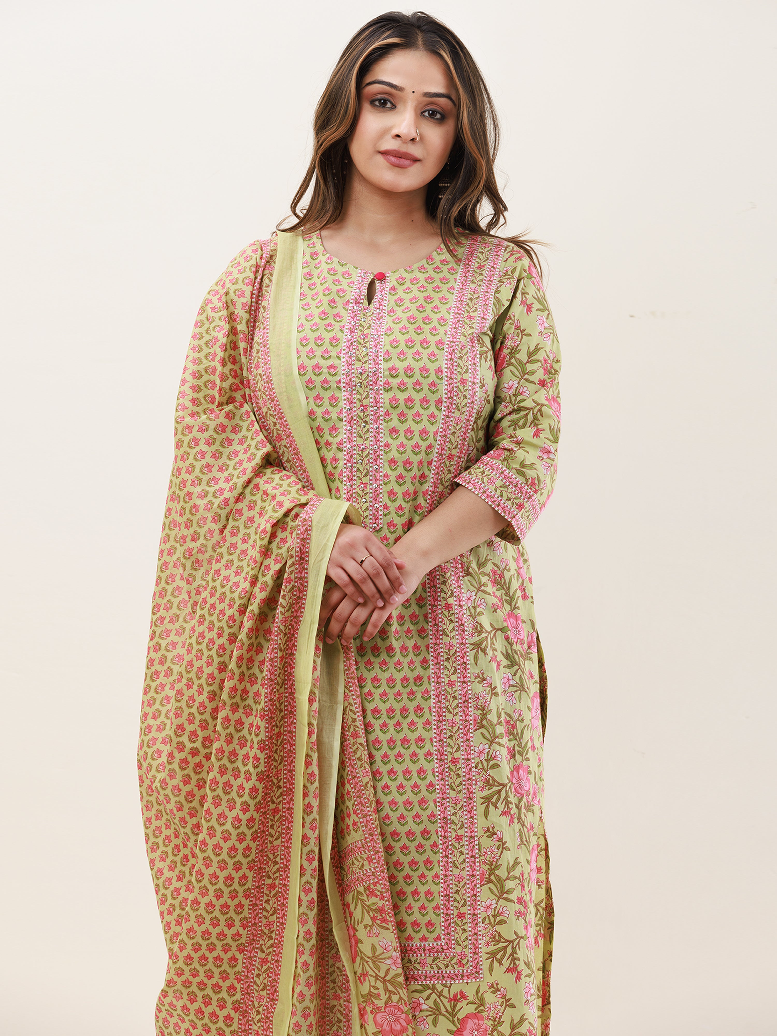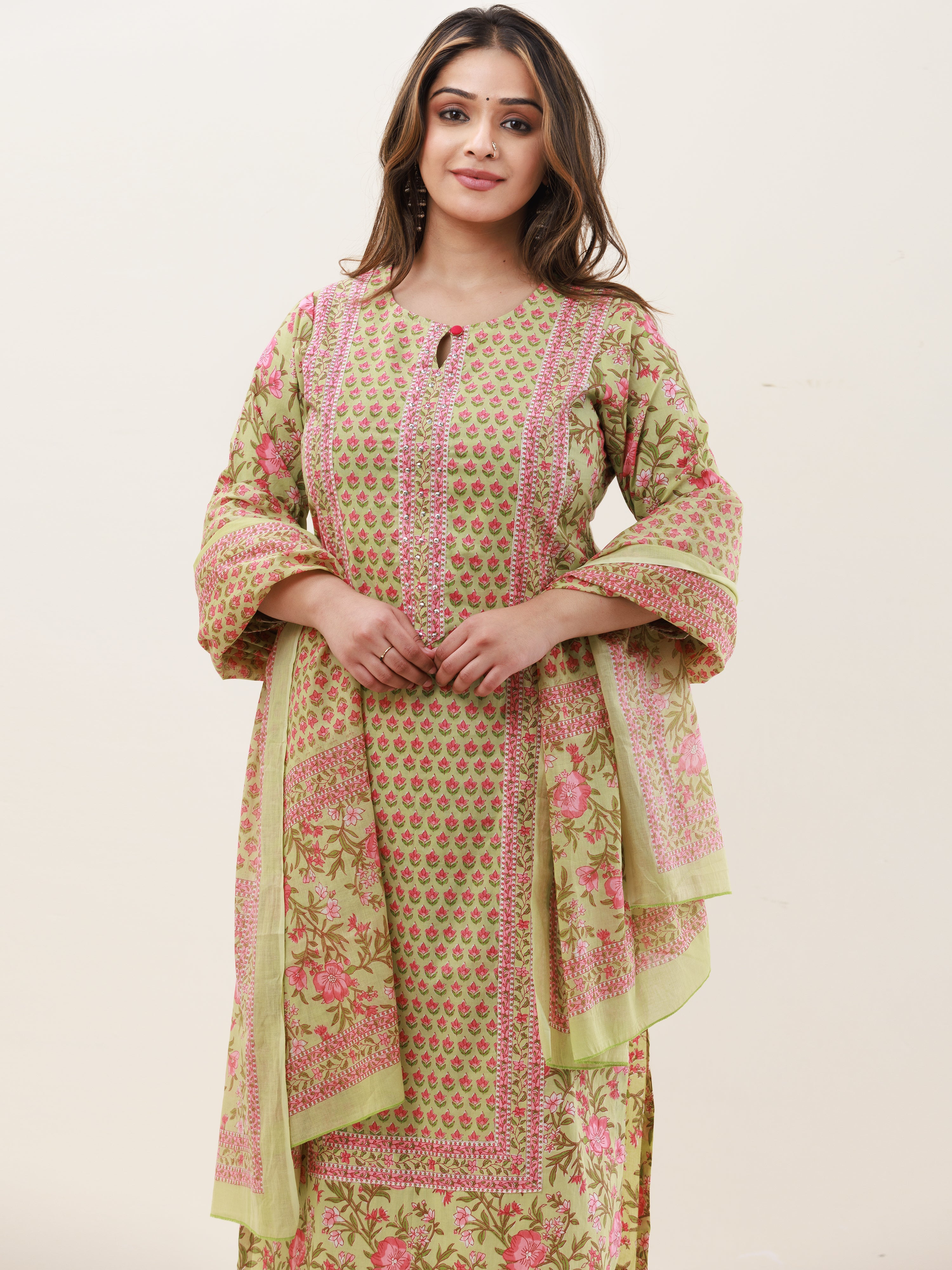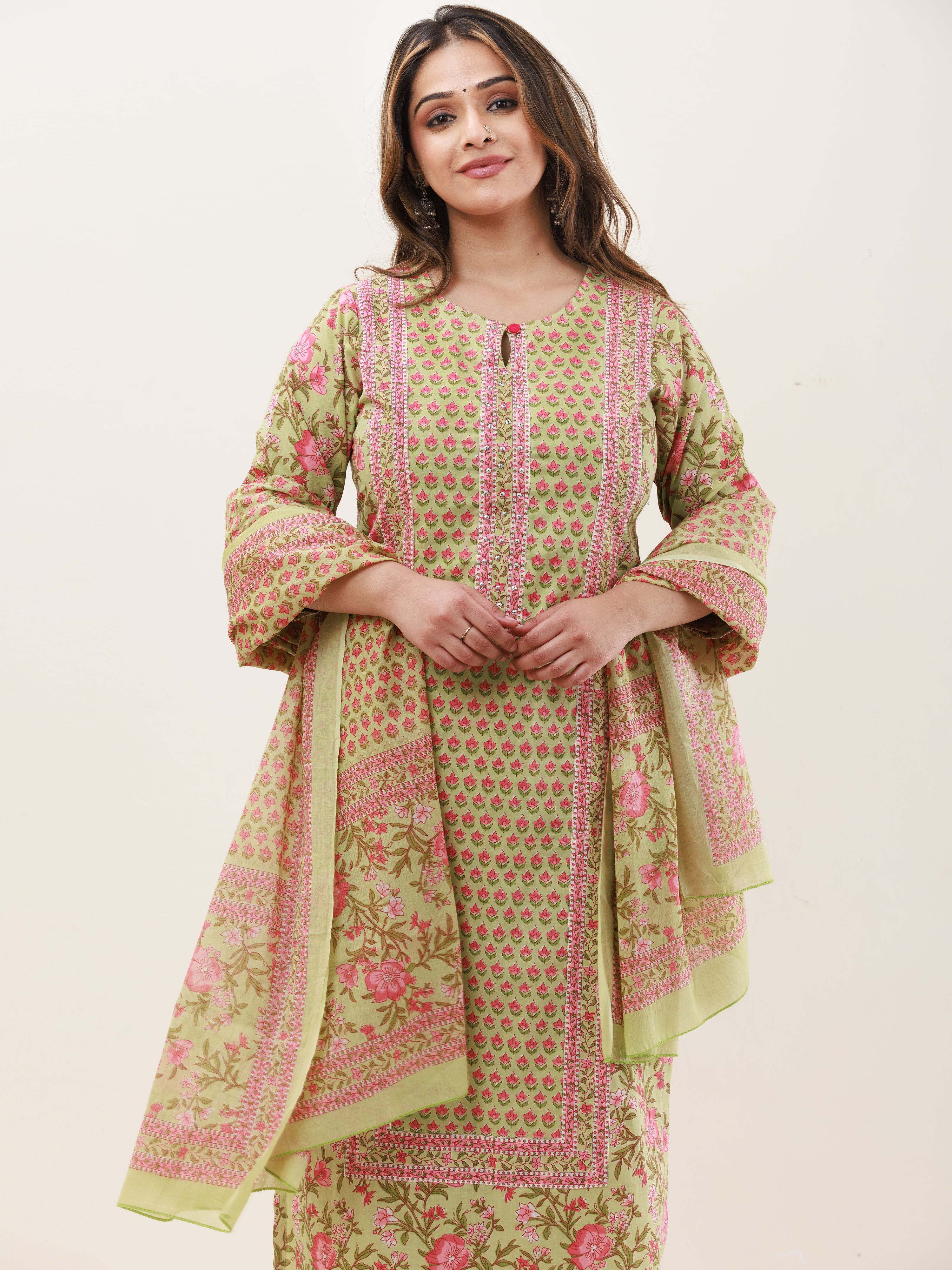 Product: This set contains Handcrafted Sanganeri Premium Cotton Kurta, 100% Cotton Pants and Cotton Mul Mul Dupatta.