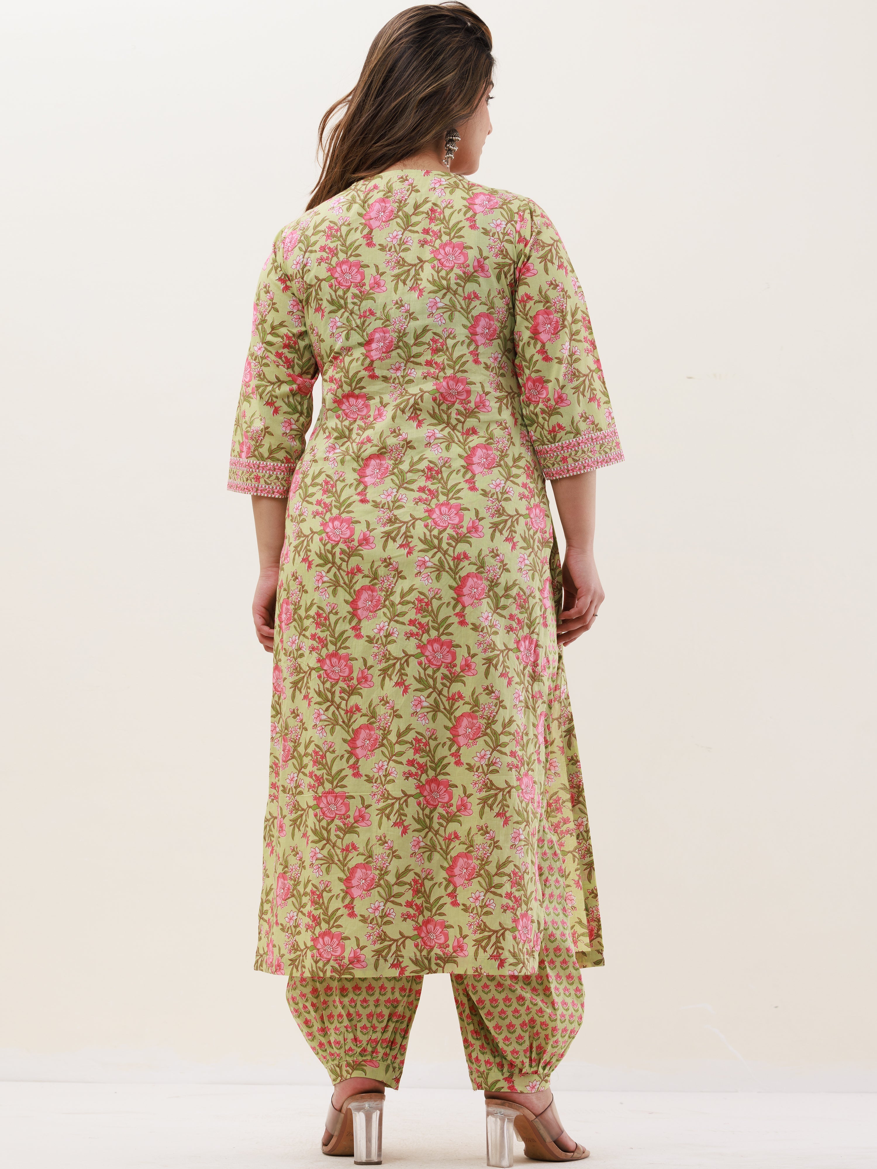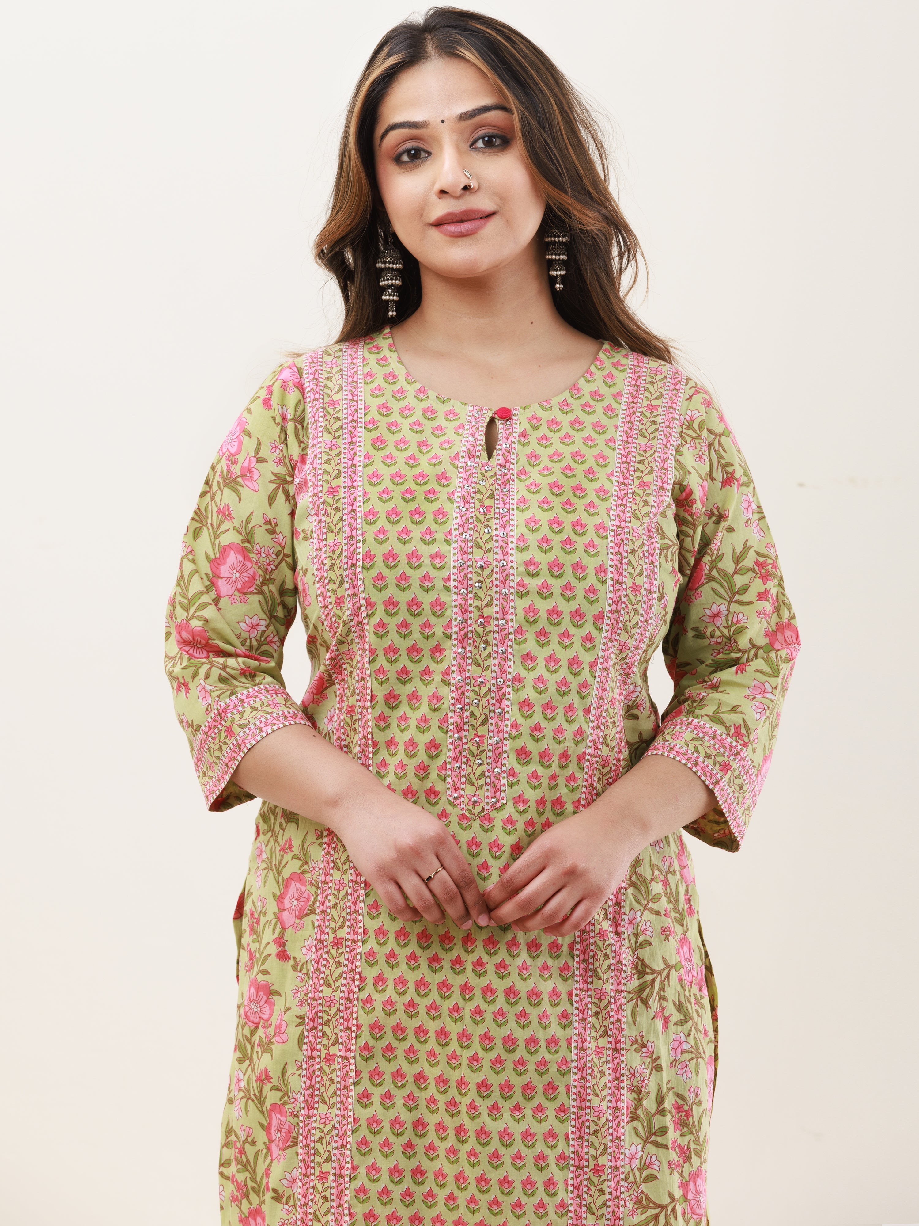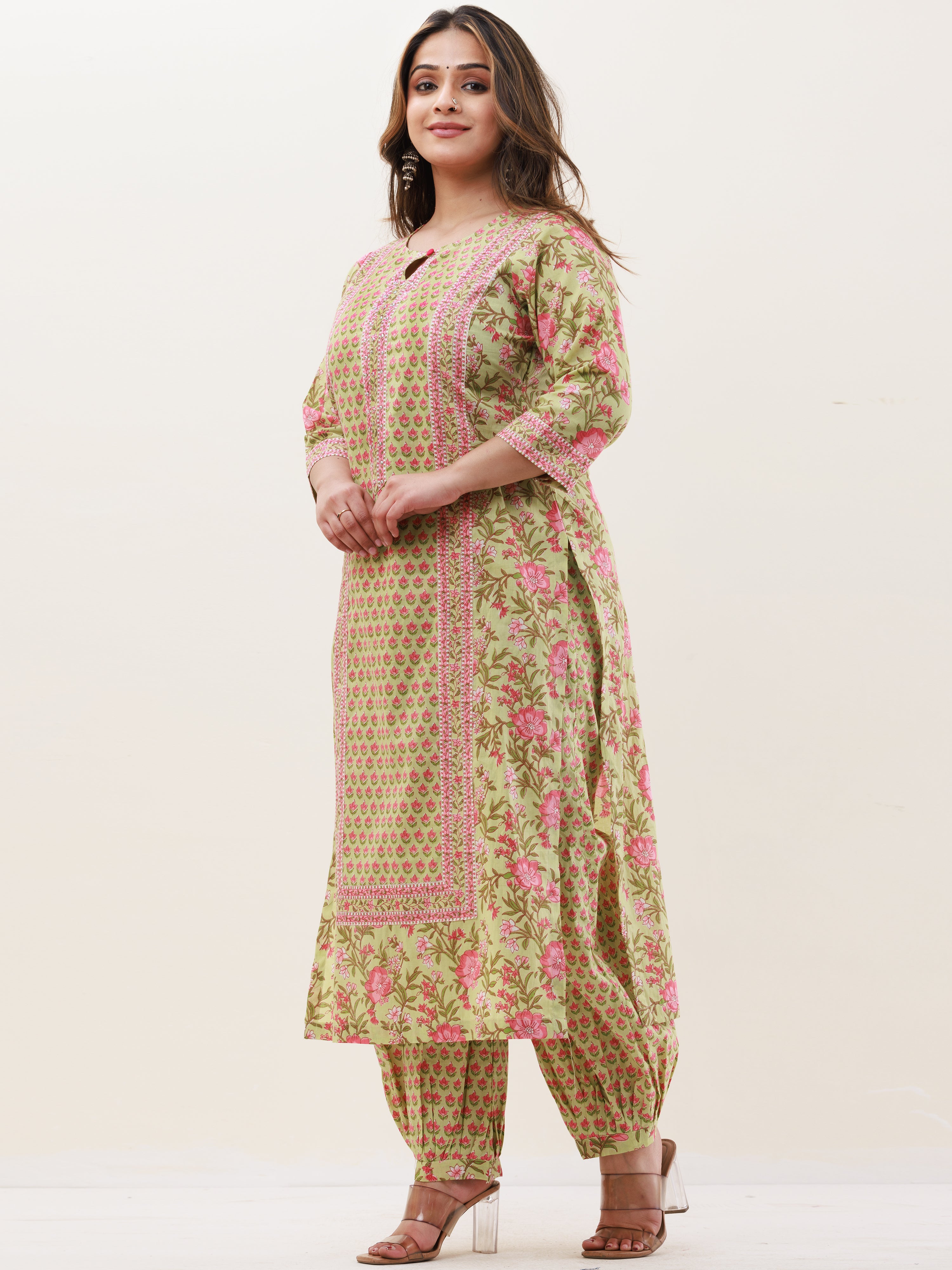 Product: This set contains Handcrafted Sanganeri Premium Cotton Kurta, 100% Cotton Pants and Cotton Mul Mul Dupatta.
