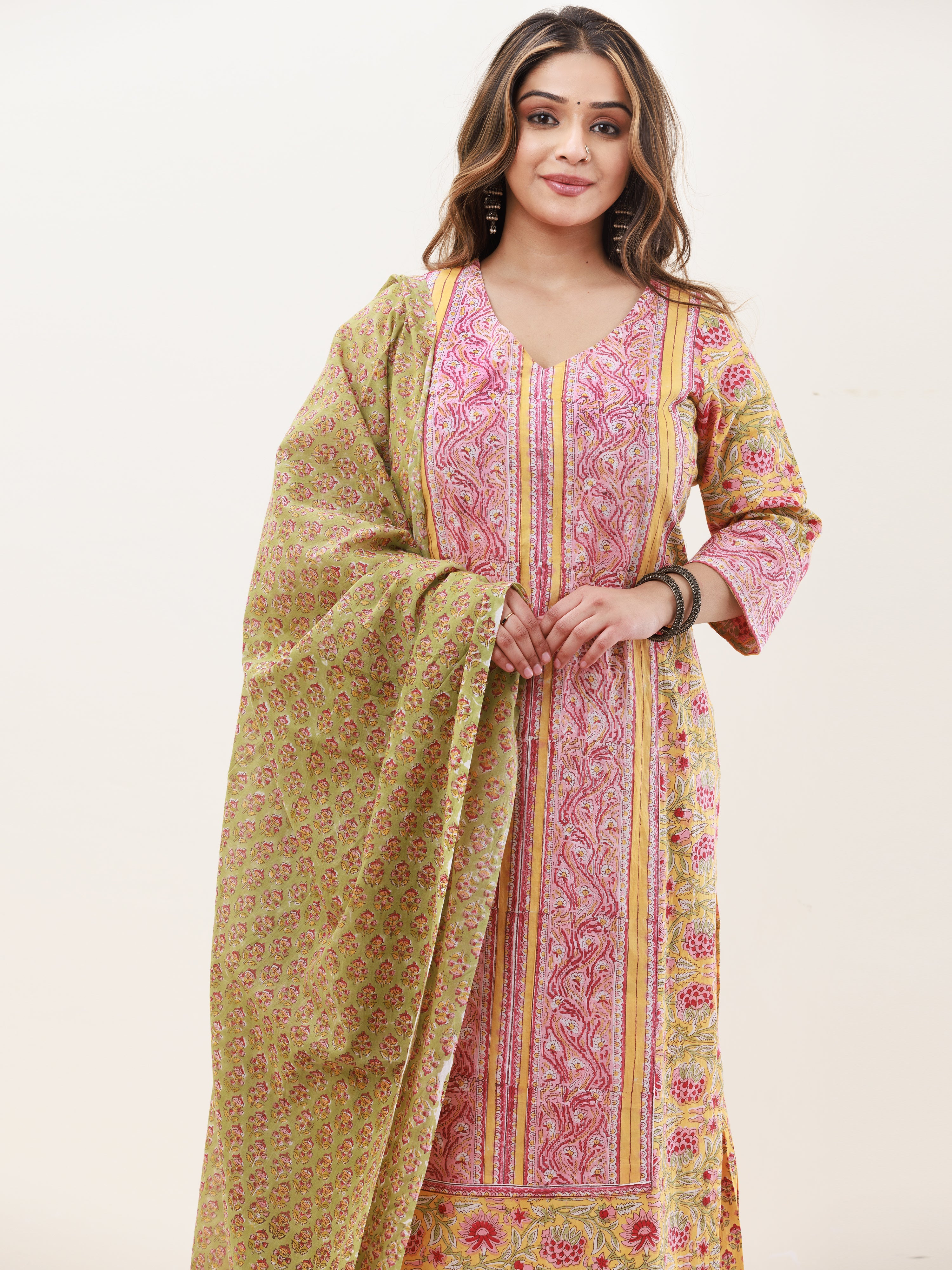 Product: This set contains Handcrafted Sanganeri Premium Cotton Kurta, 100% Cotton Pants and Cotton Mul Mul Dupatta.