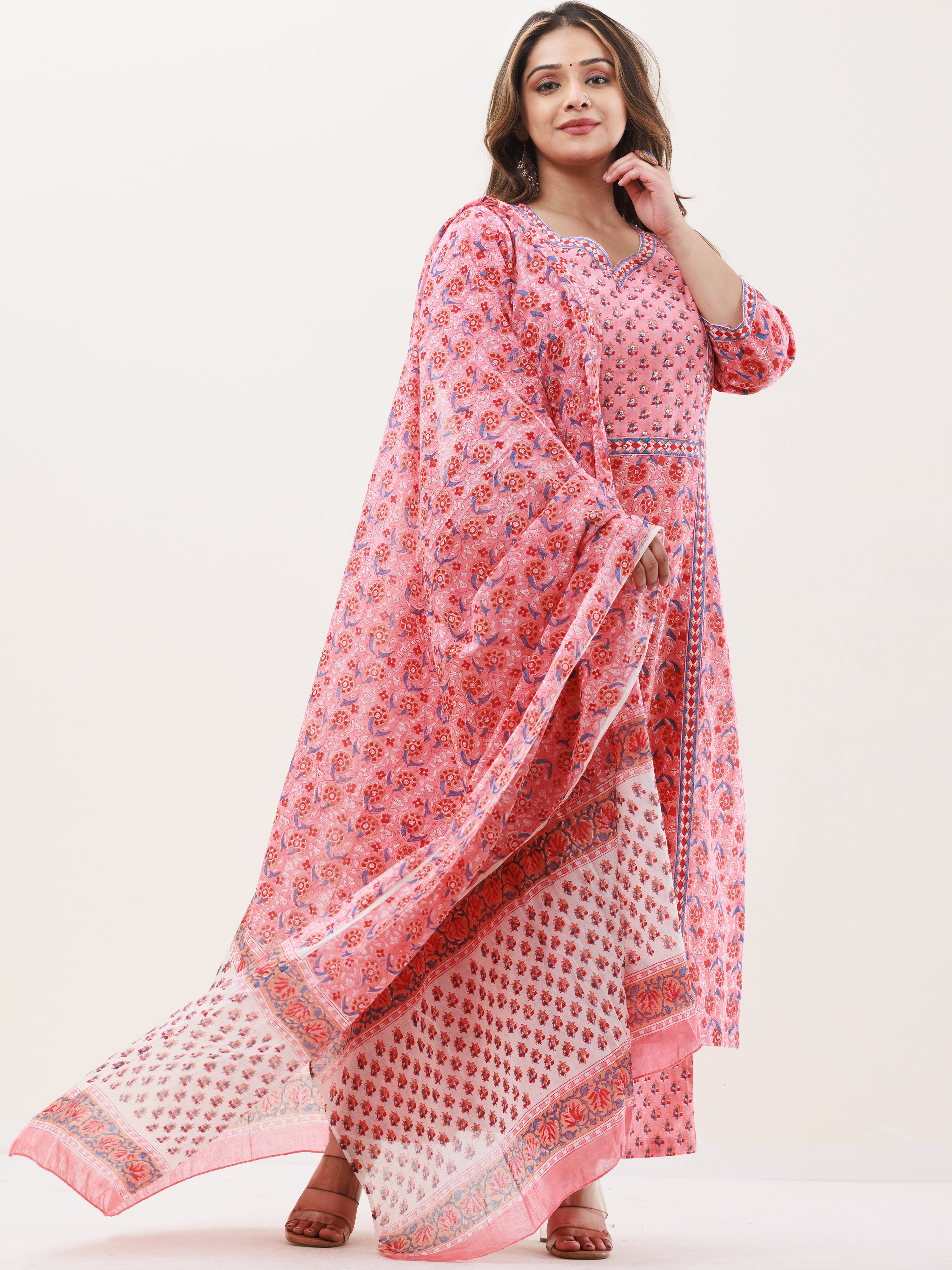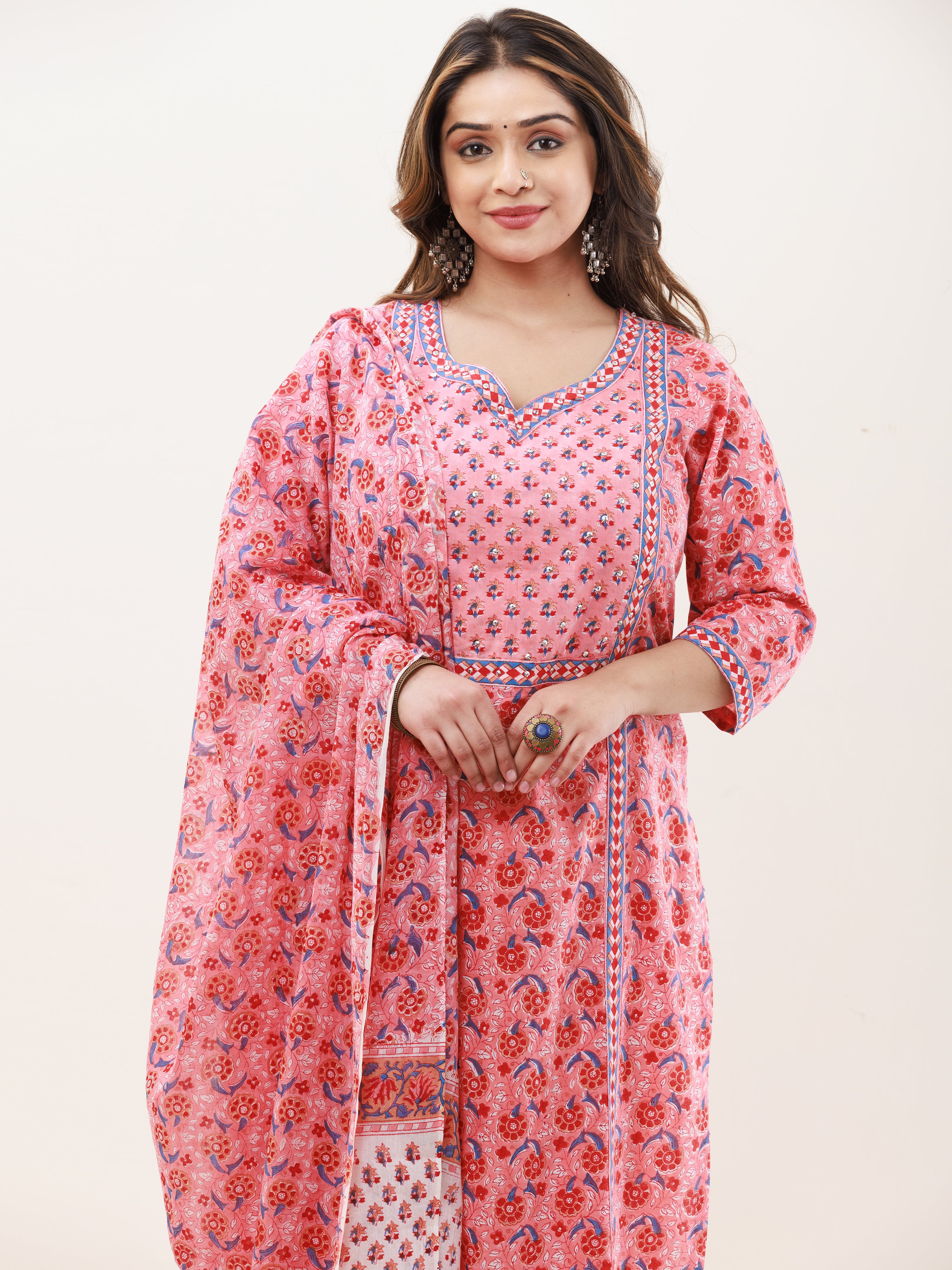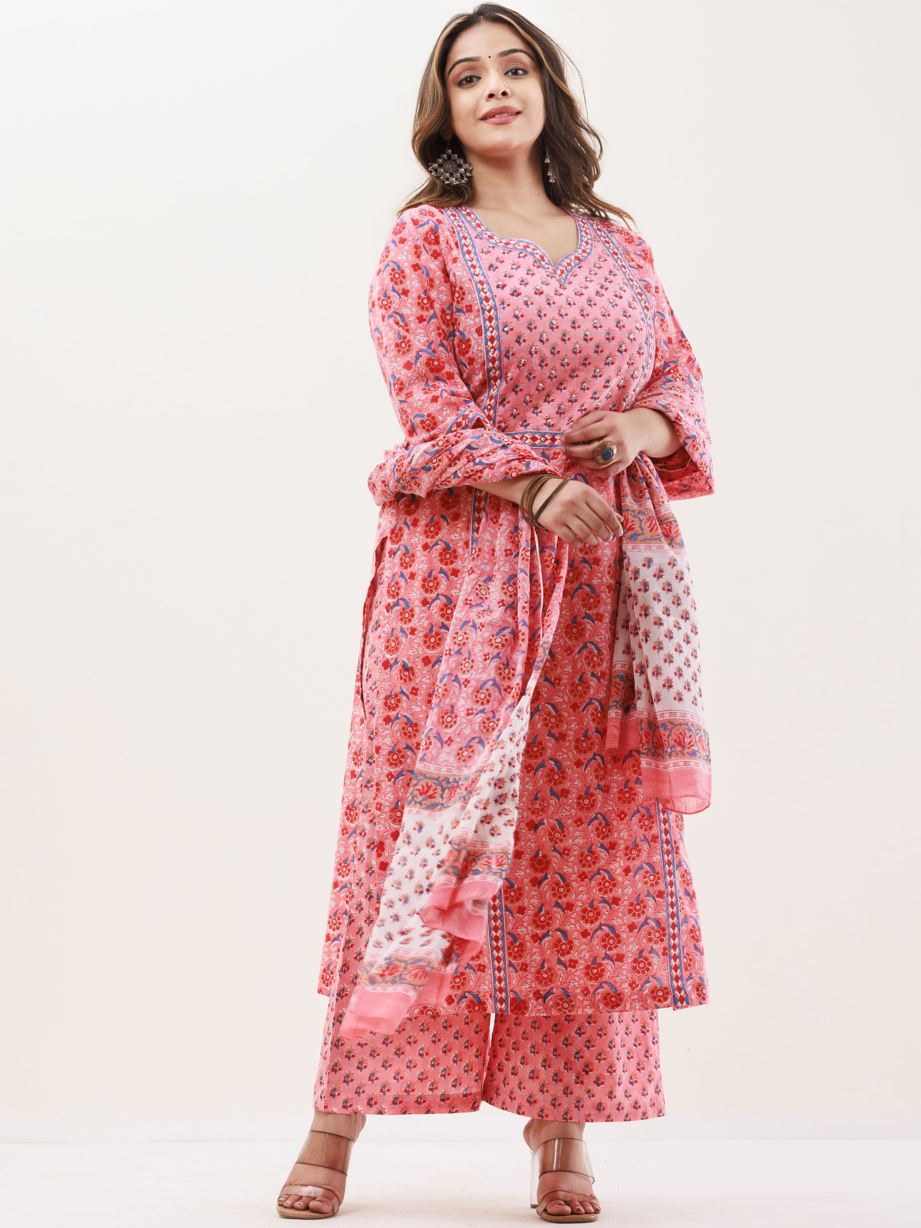 Product: This set contains Handcrafted Sanganeri Premium Cotton Kurta, 100% Cotton Pants and Cotton Mul Mul Dupatta.