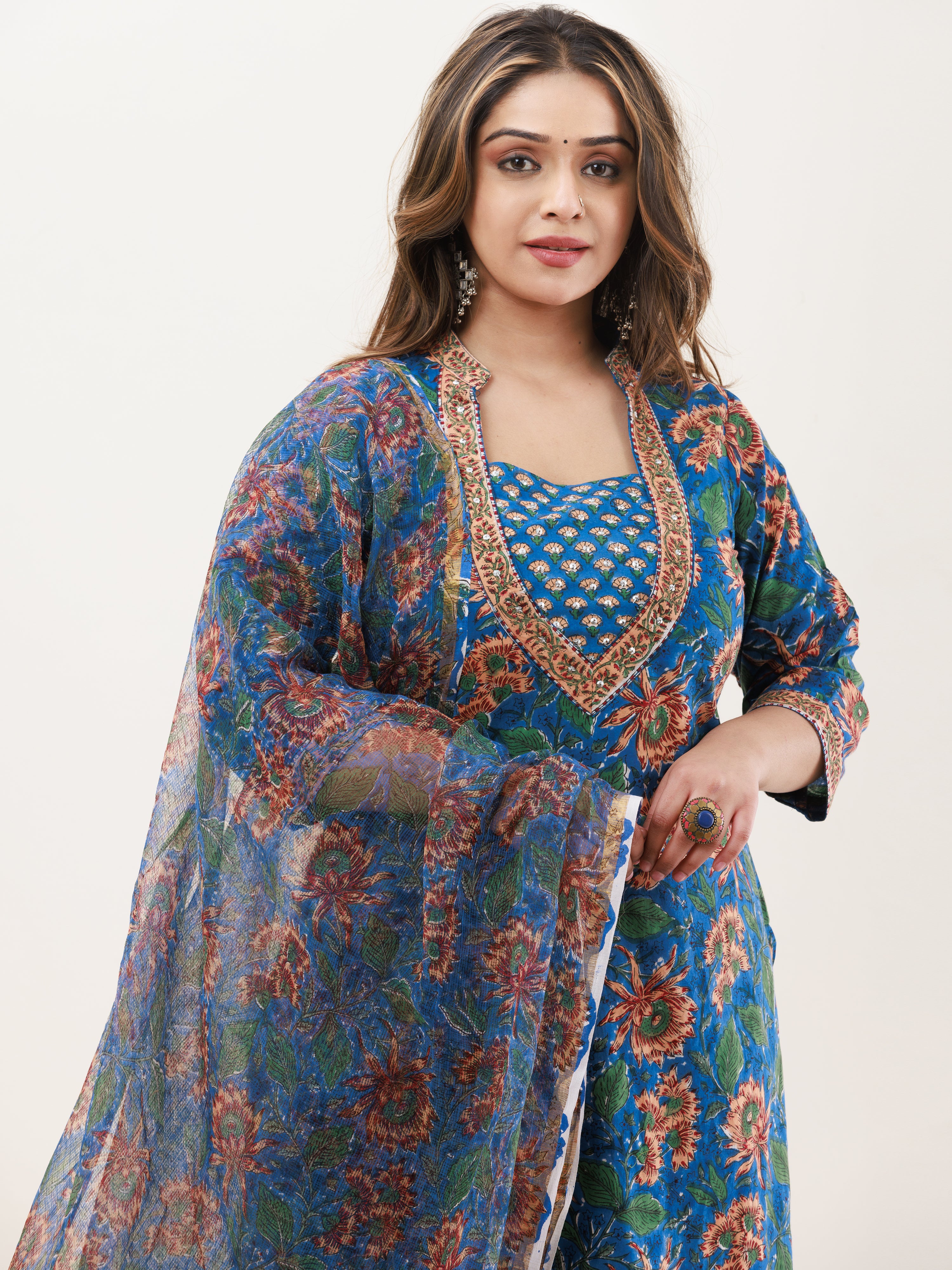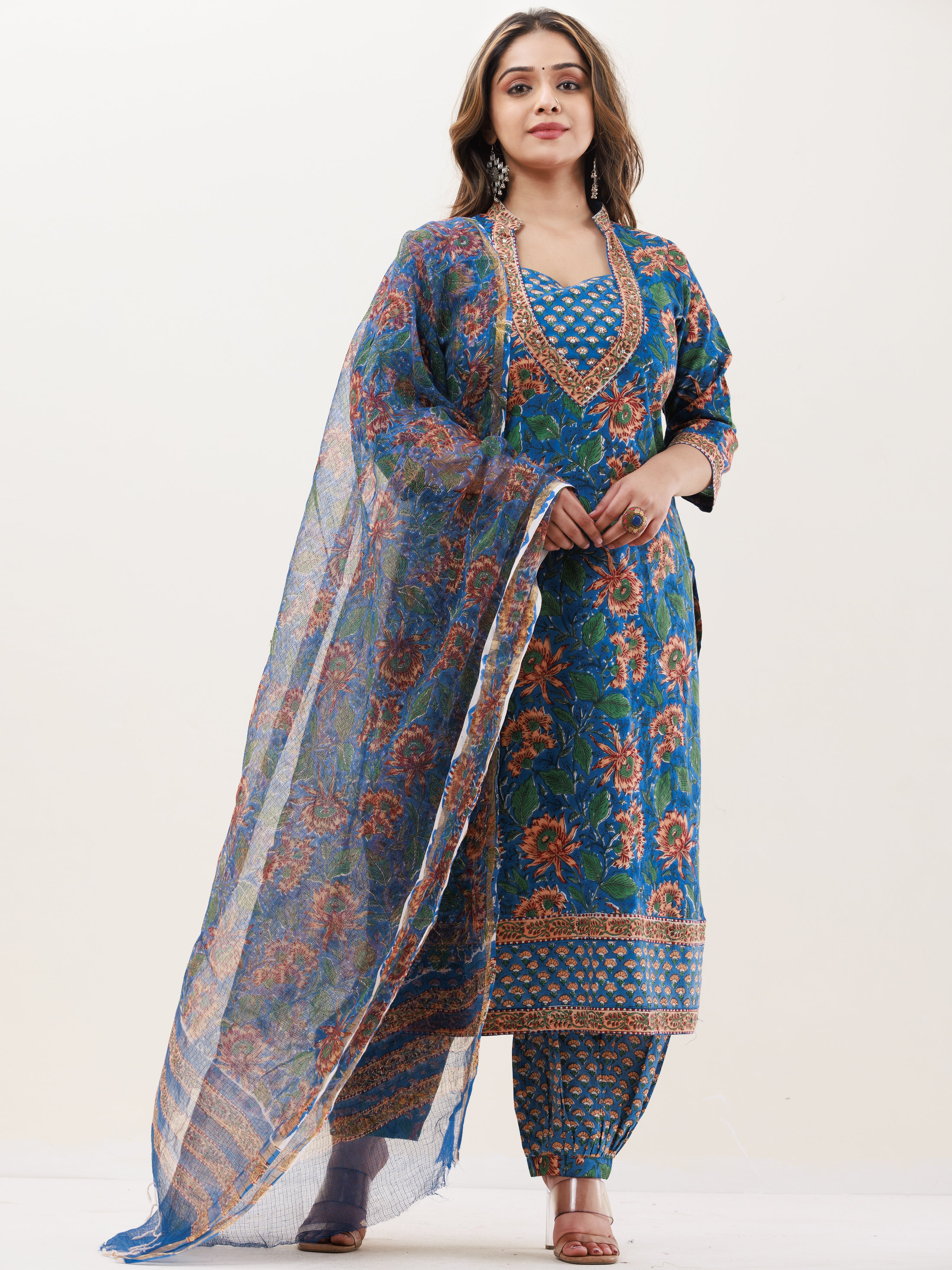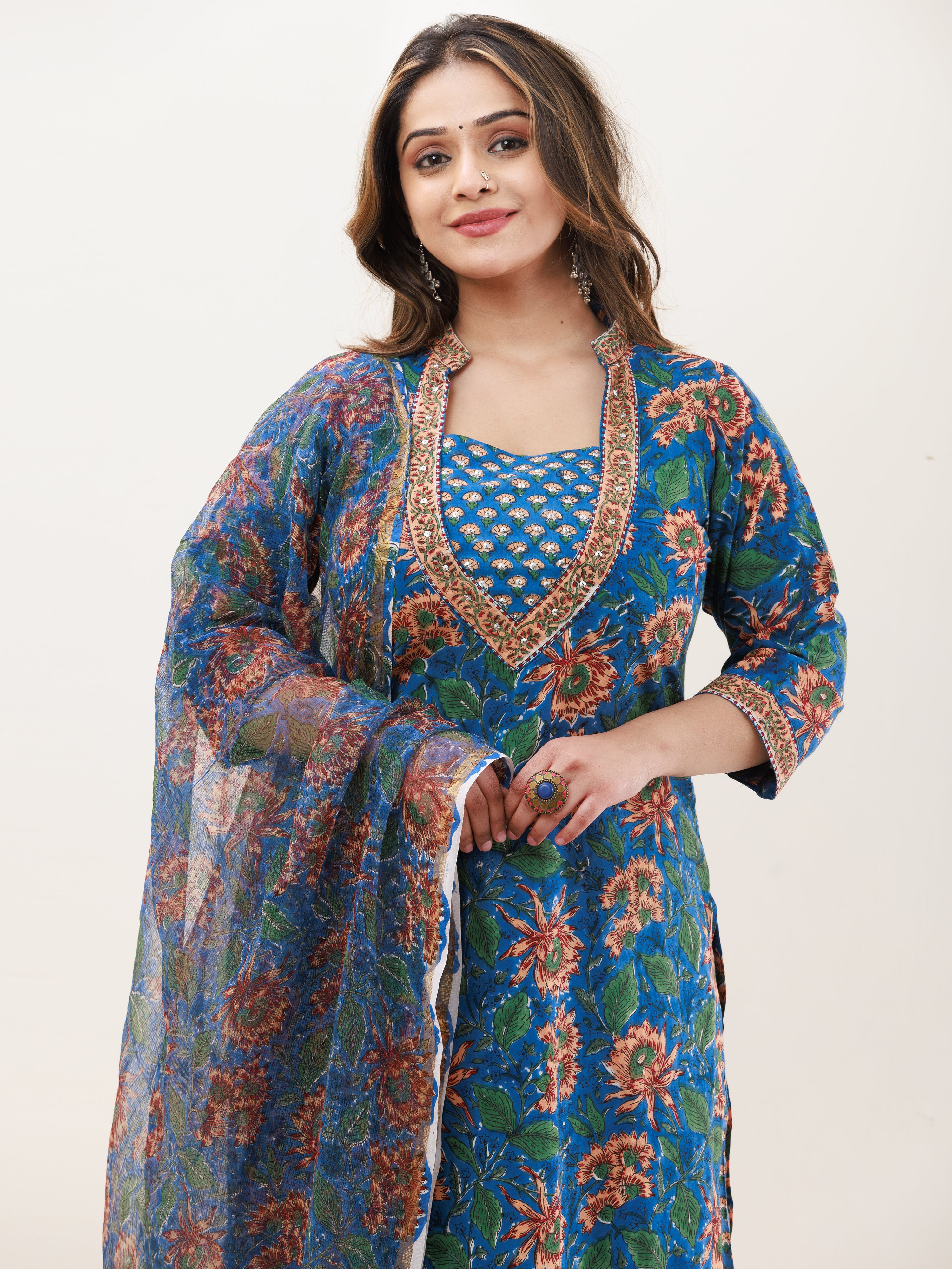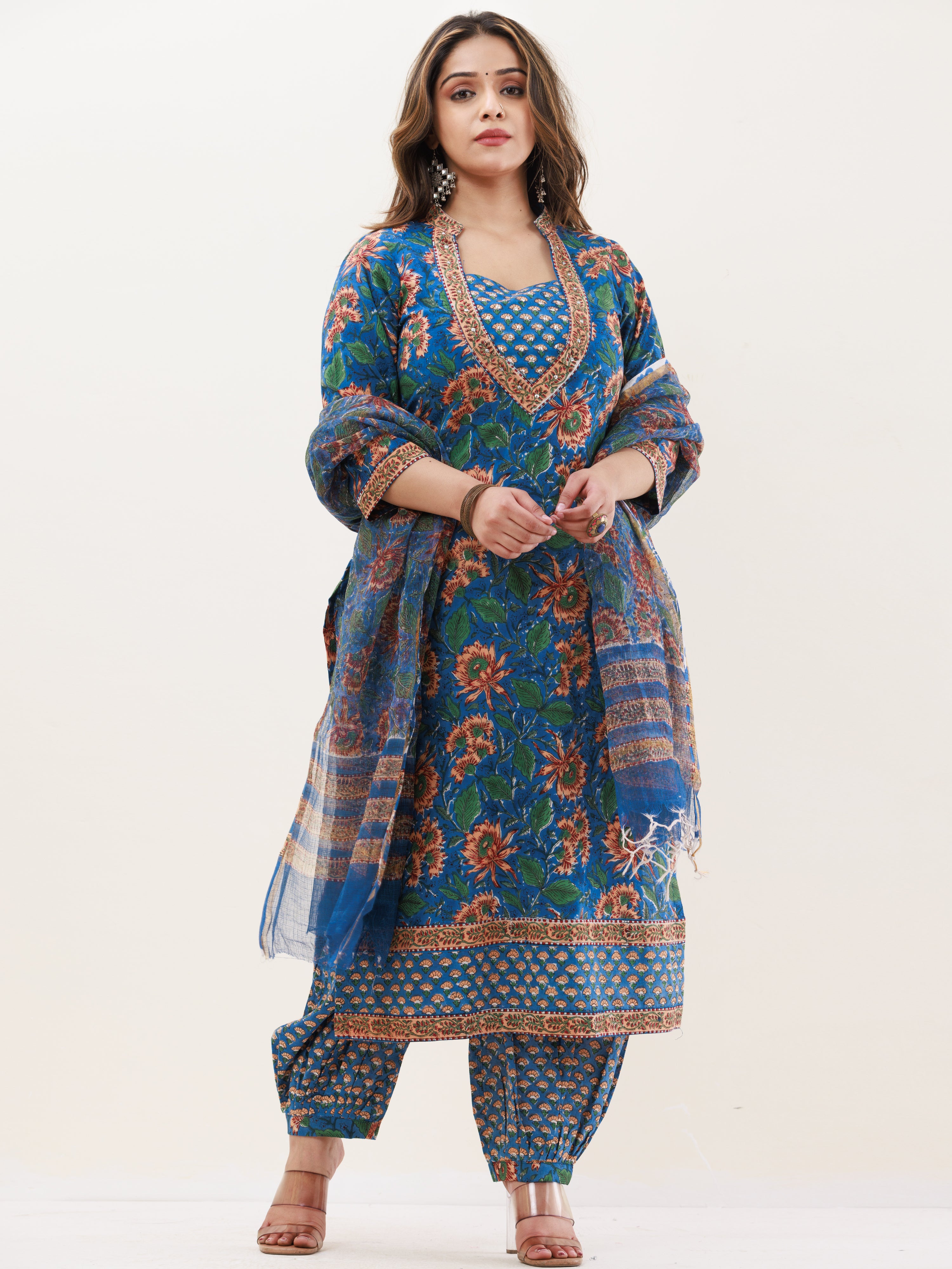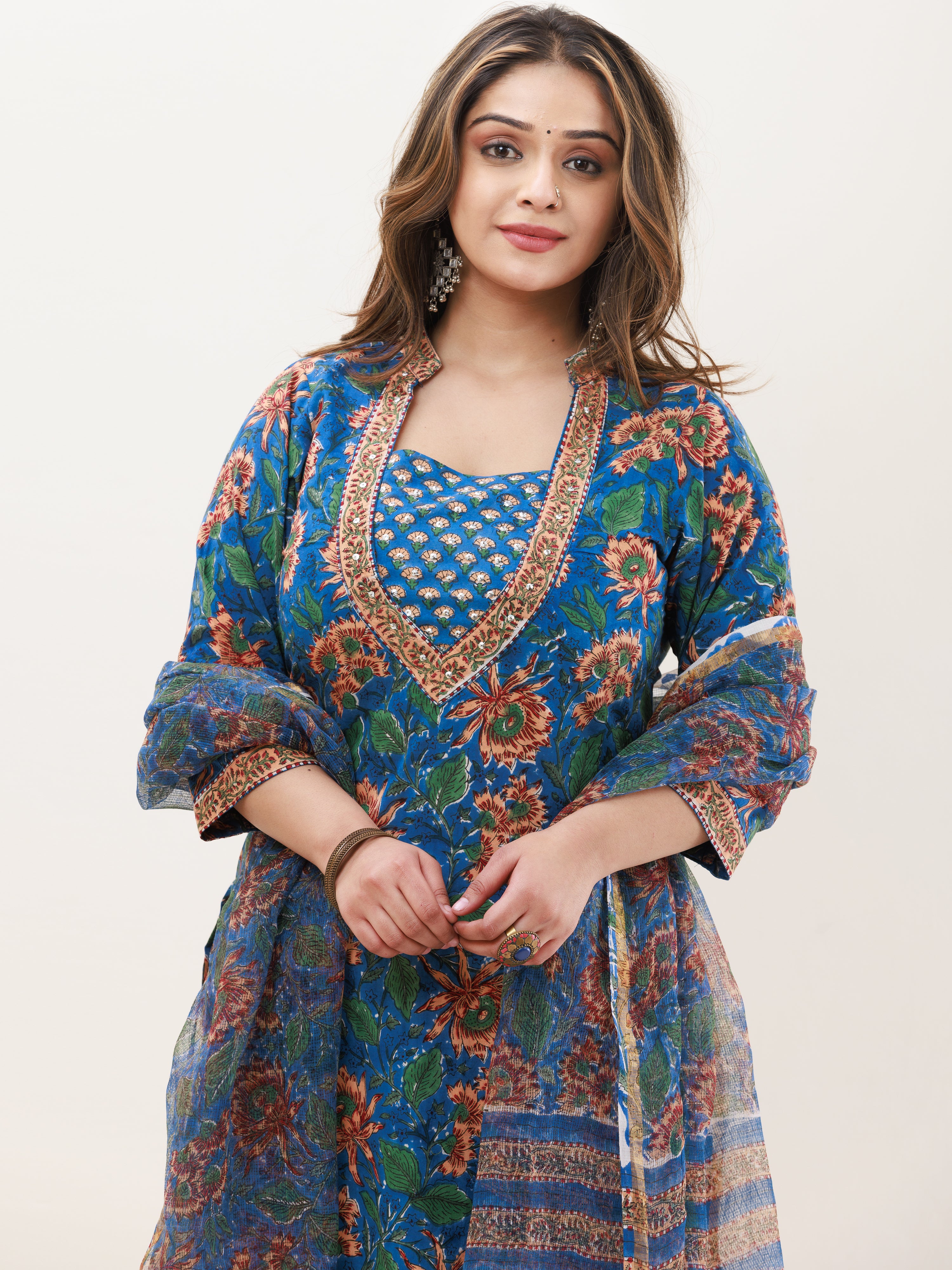 Product: This set contains Handcrafted Sanganeri Premium Cotton Kurta, 100% Cotton Pants and Kota Doria Dupatta.