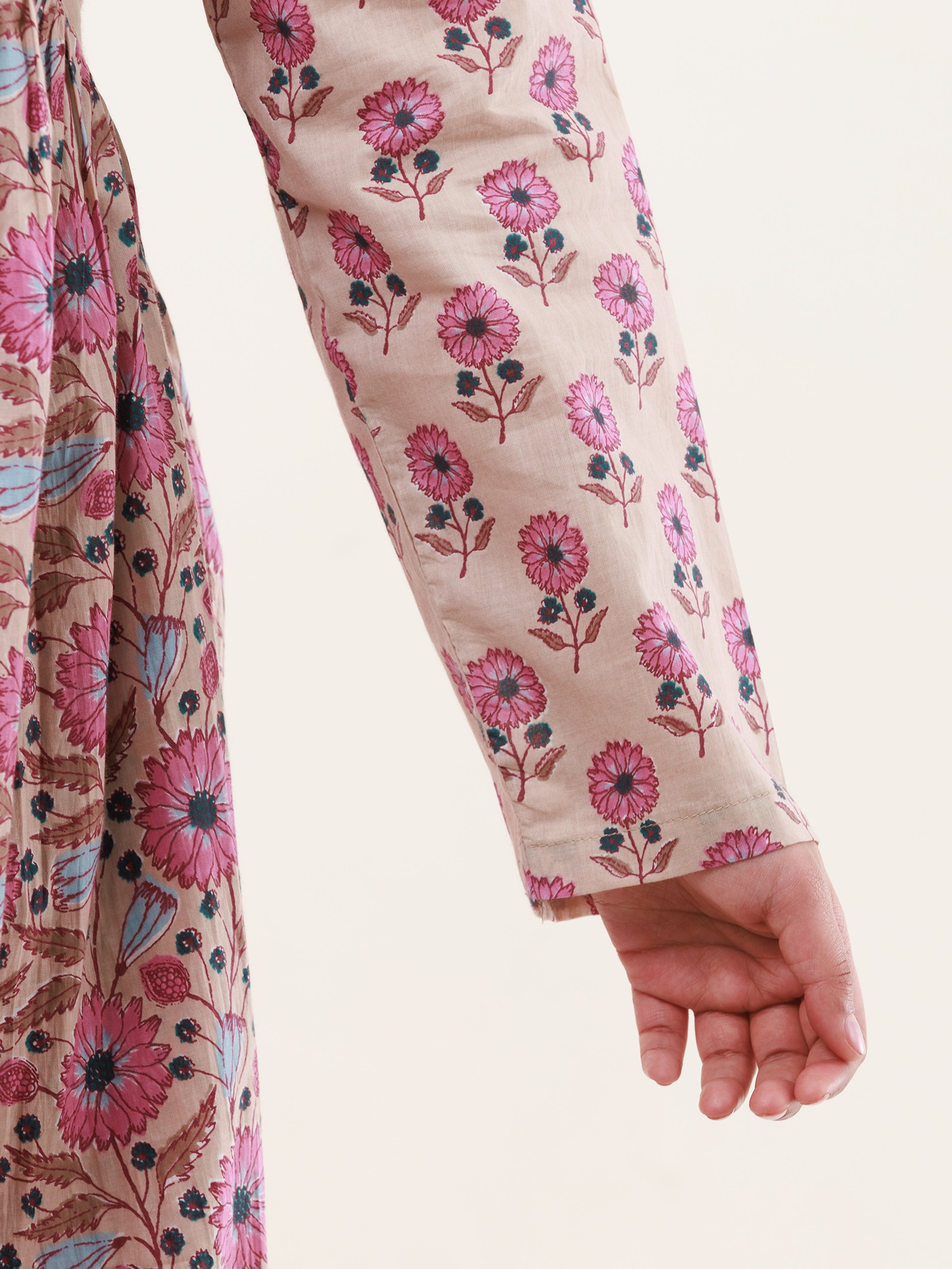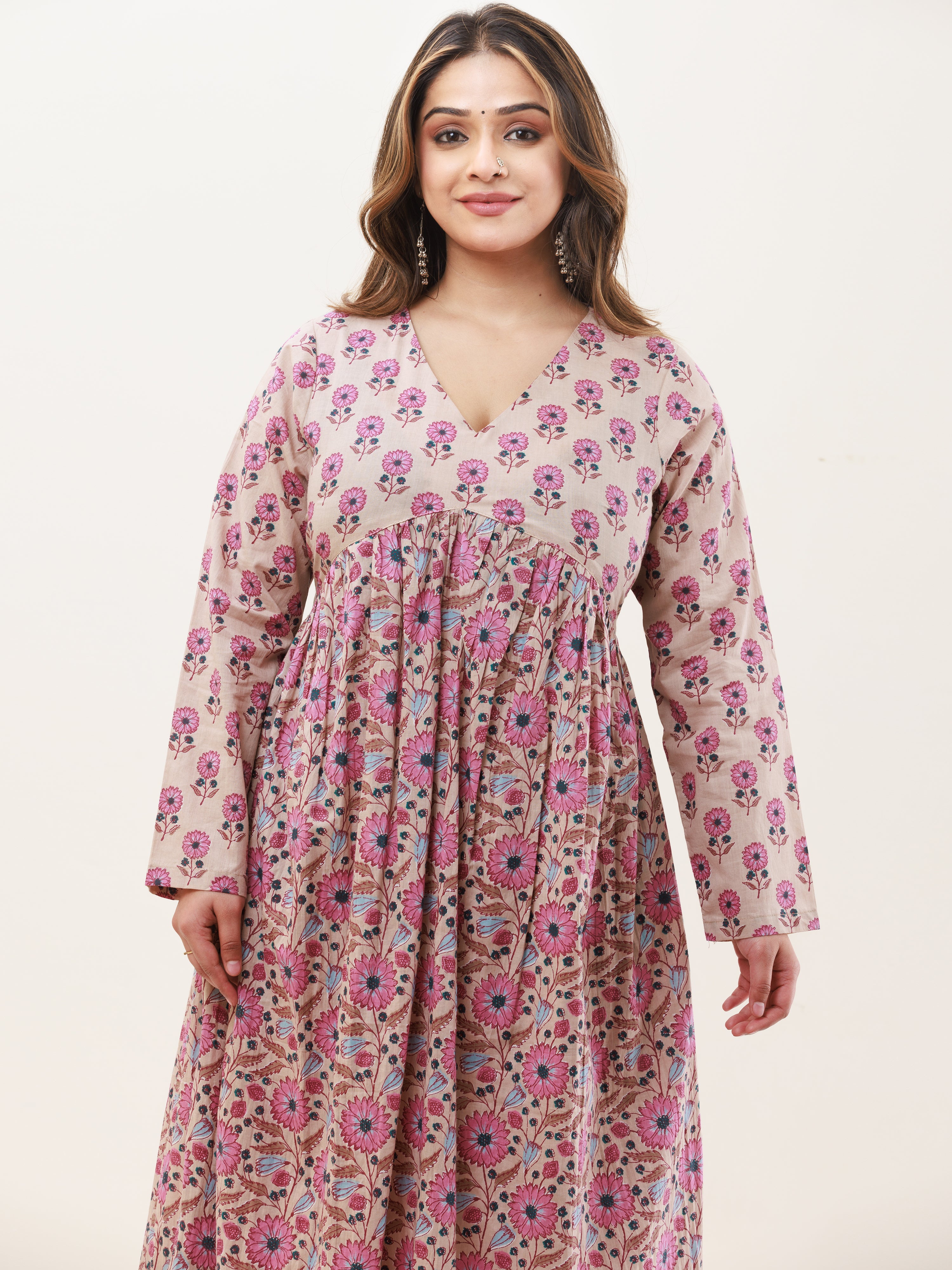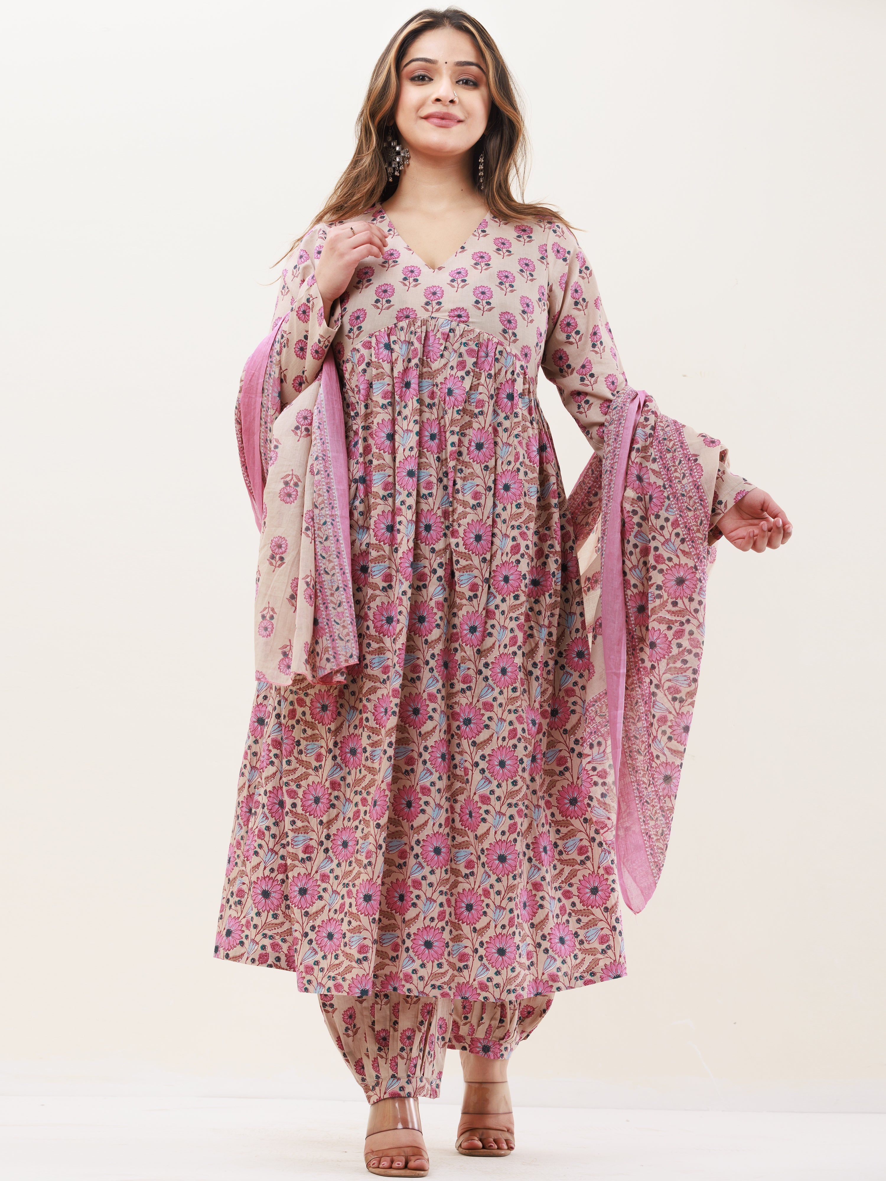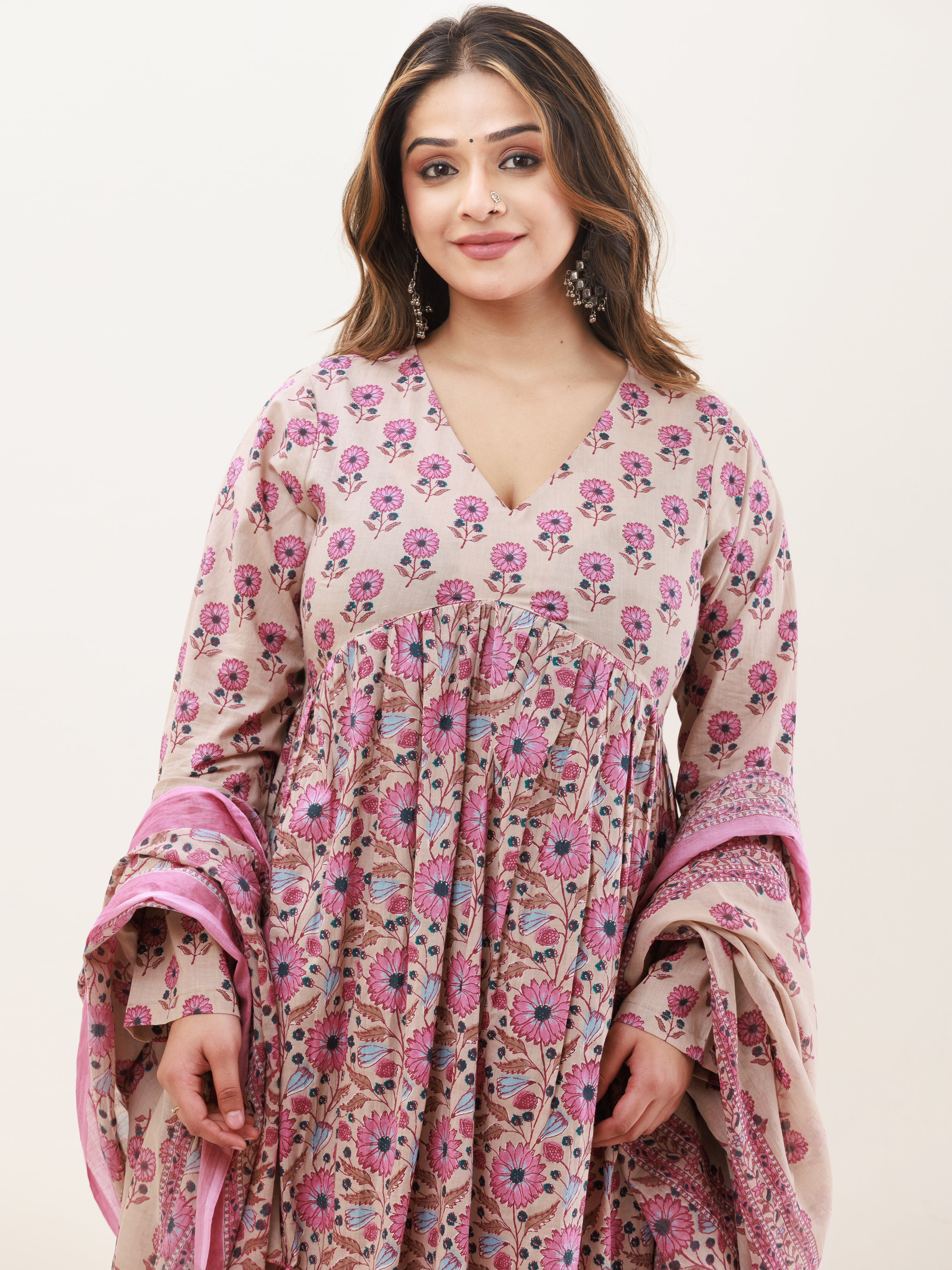 Product: This set contains Handcrafted Sanganeri Premium Cotton Anarkali Kurta, 100% Cotton Pants and Cotton Mul Mul Dupatta.