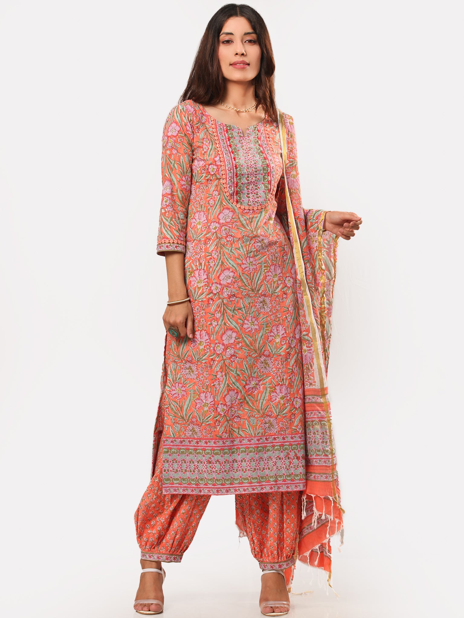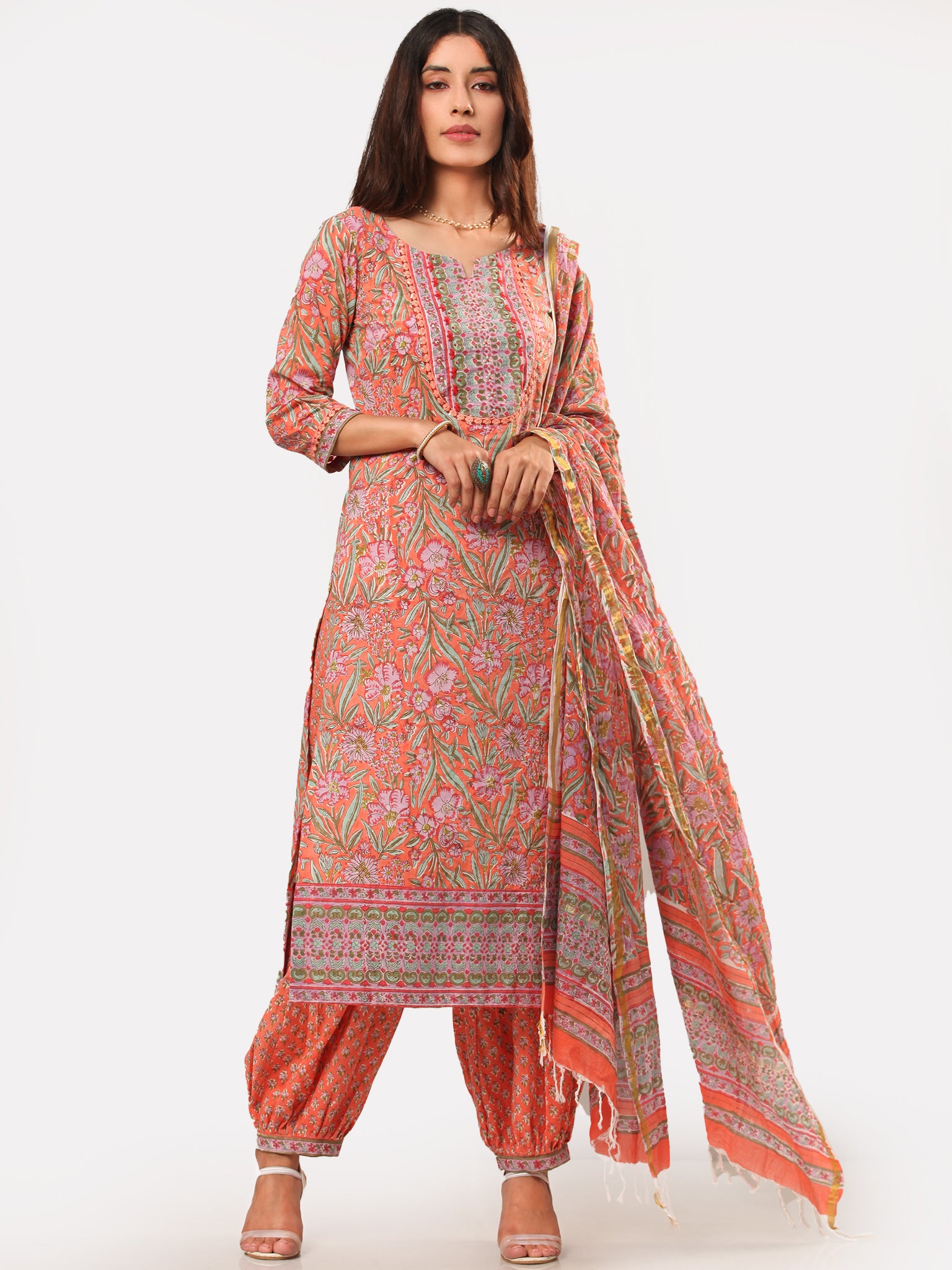 Product: This set contains Handcrafted Sanganeri Premium Cotton Kurta, 100% Cotton Salwar Pants and Cotton Dupatta.