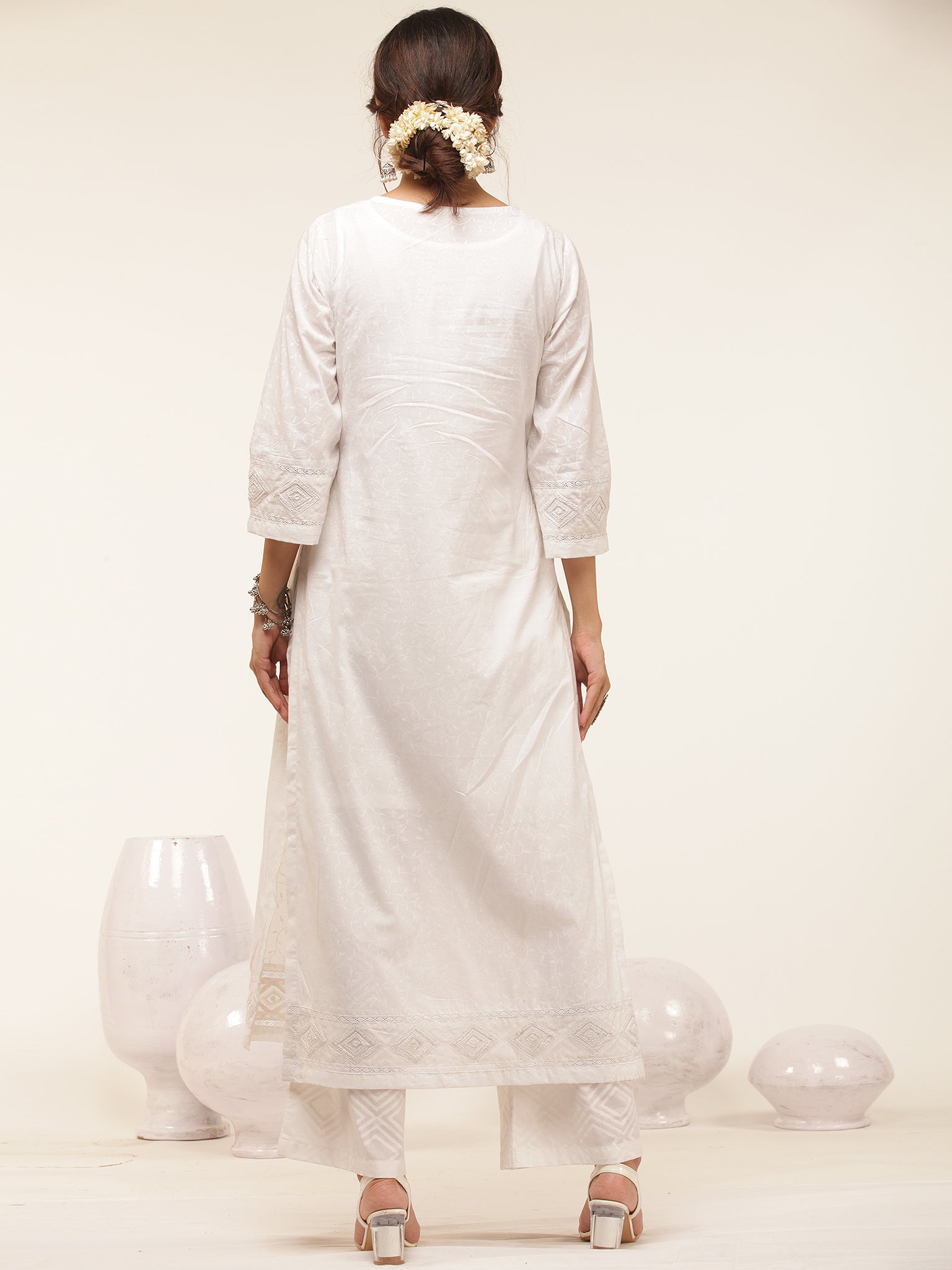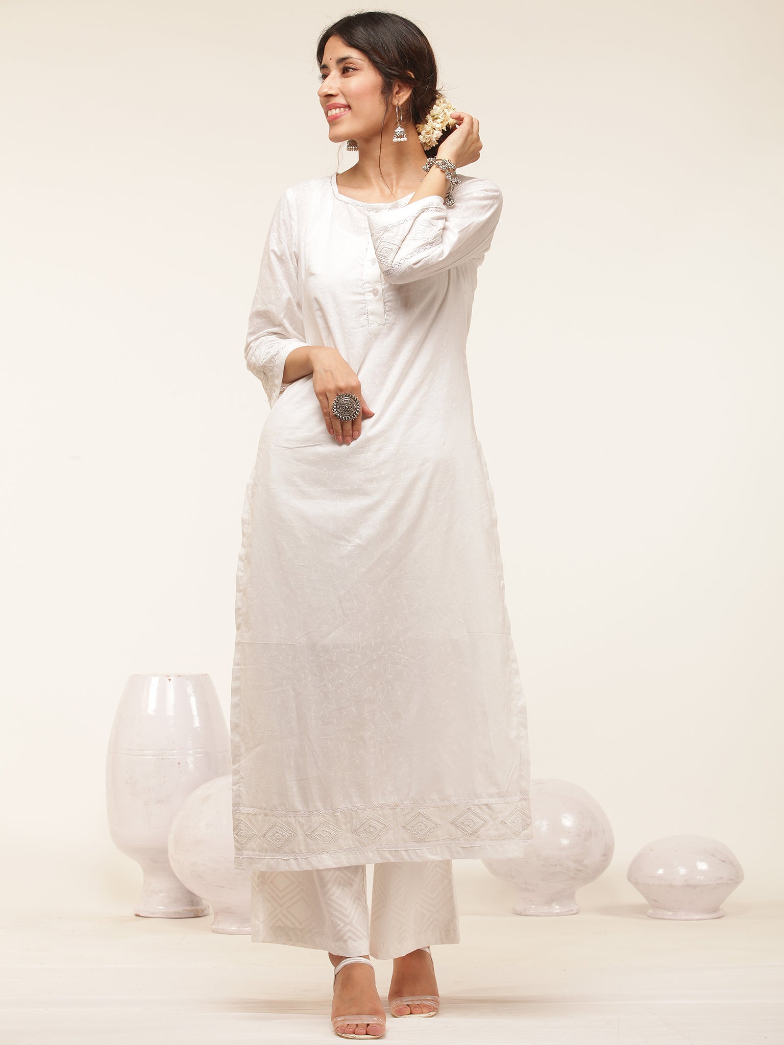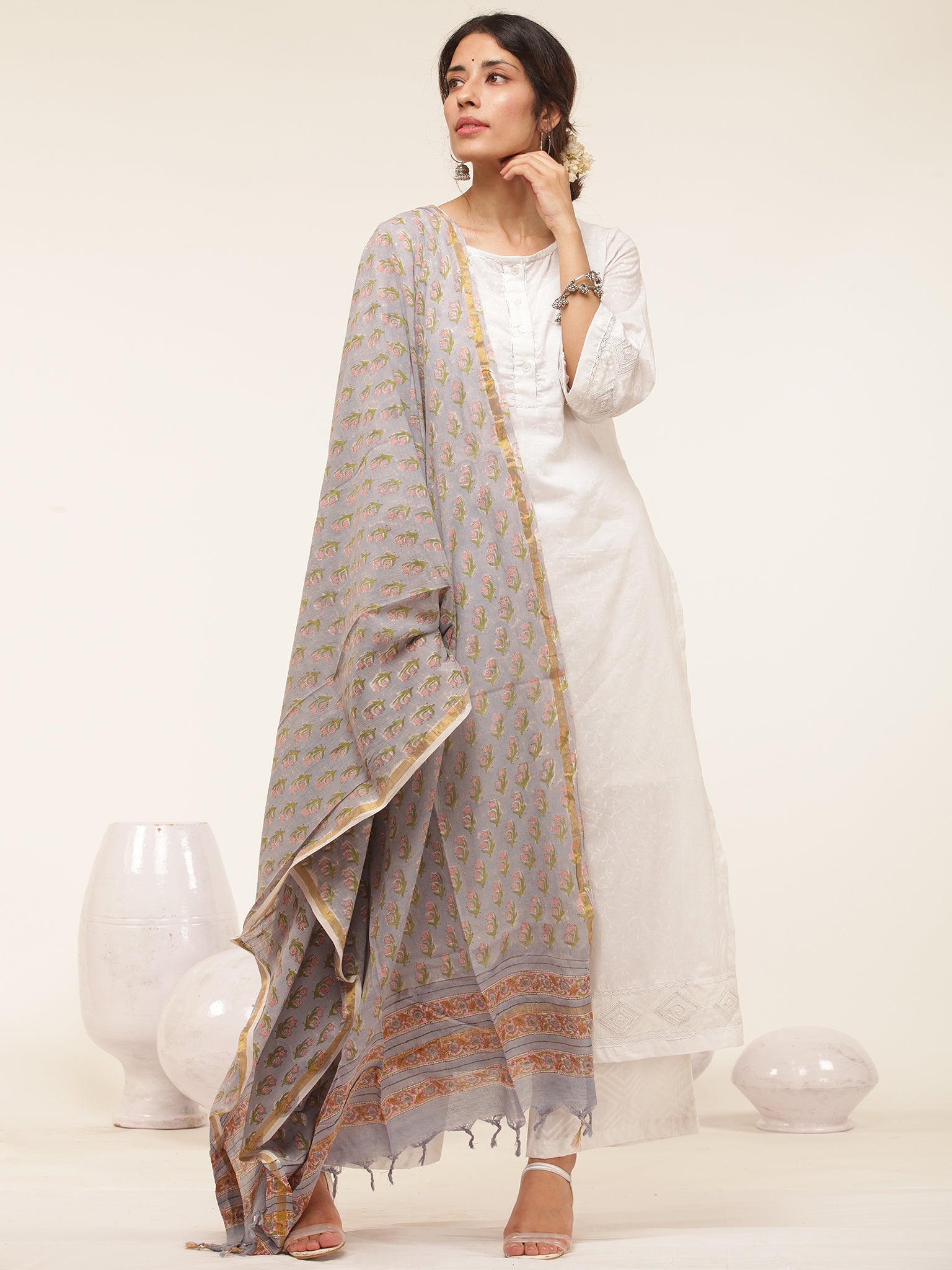 Product: This set contains Handcrafted Sanganeri Premium Cotton White Kurta, 100% Cotton Pants and Cotton Dupatta.