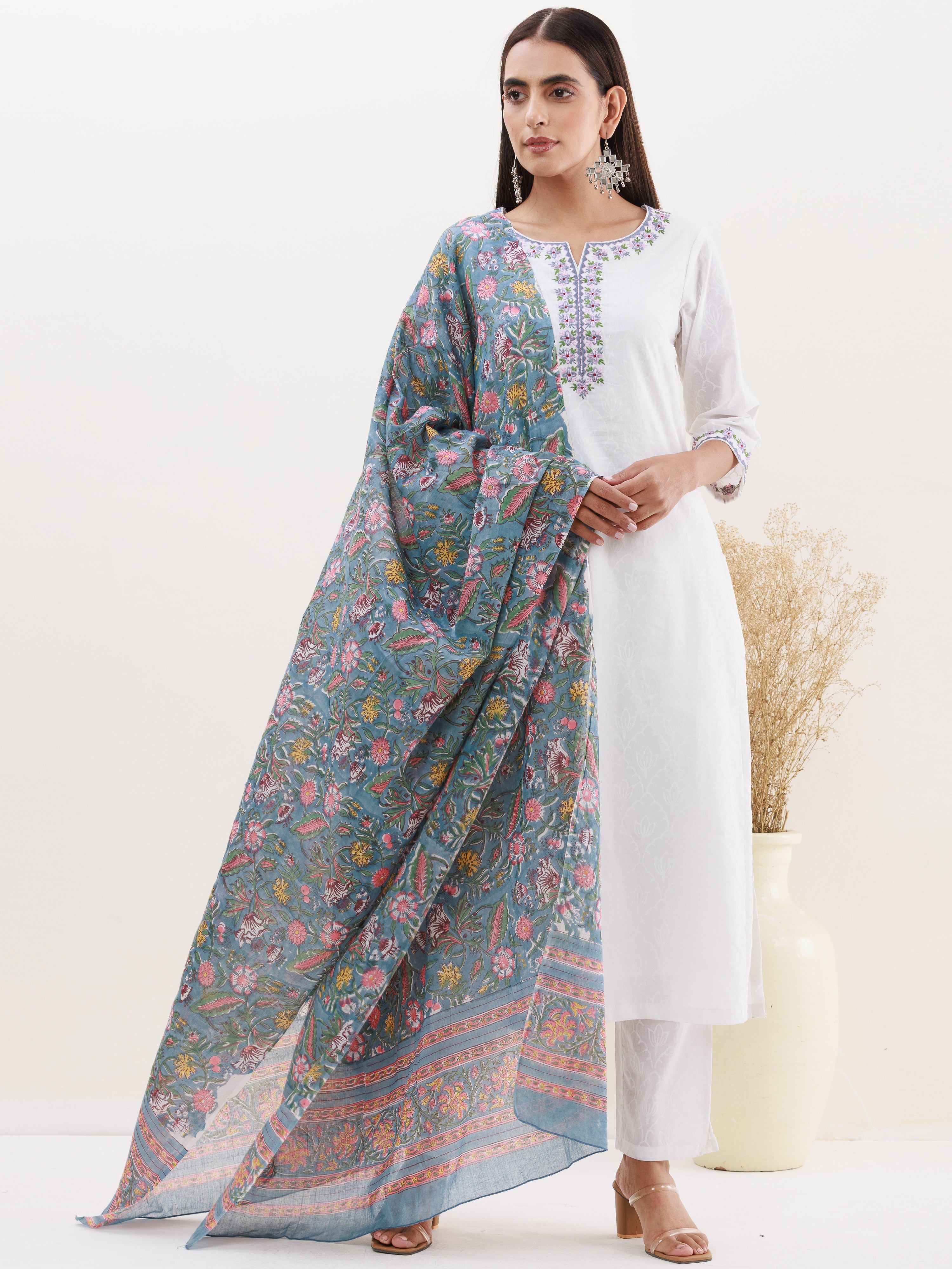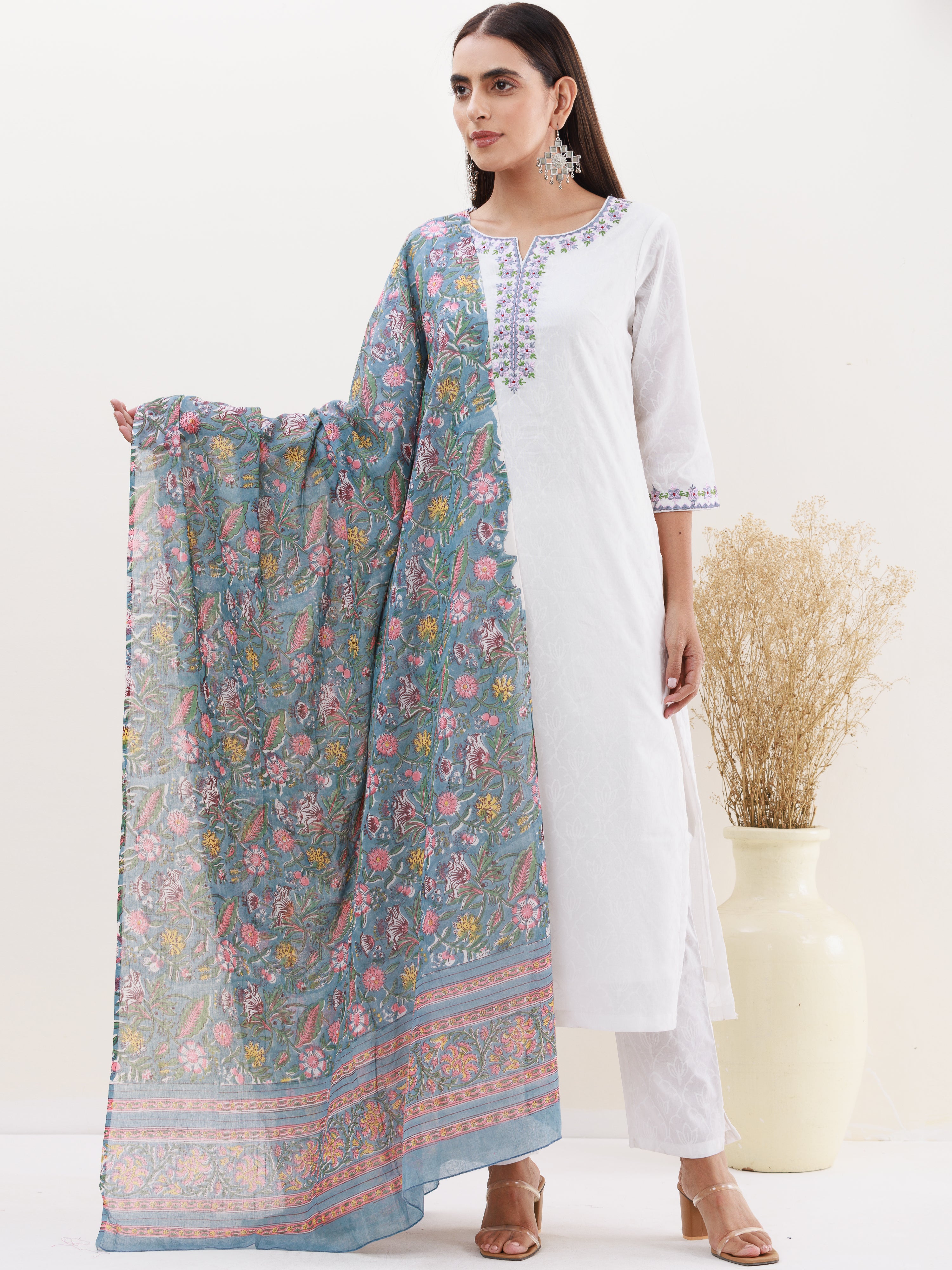 Product: This set contains Handcrafted Sanganeri Premium Cotton White Kurta, 100% Cotton Pants and Cotton Dupatta.