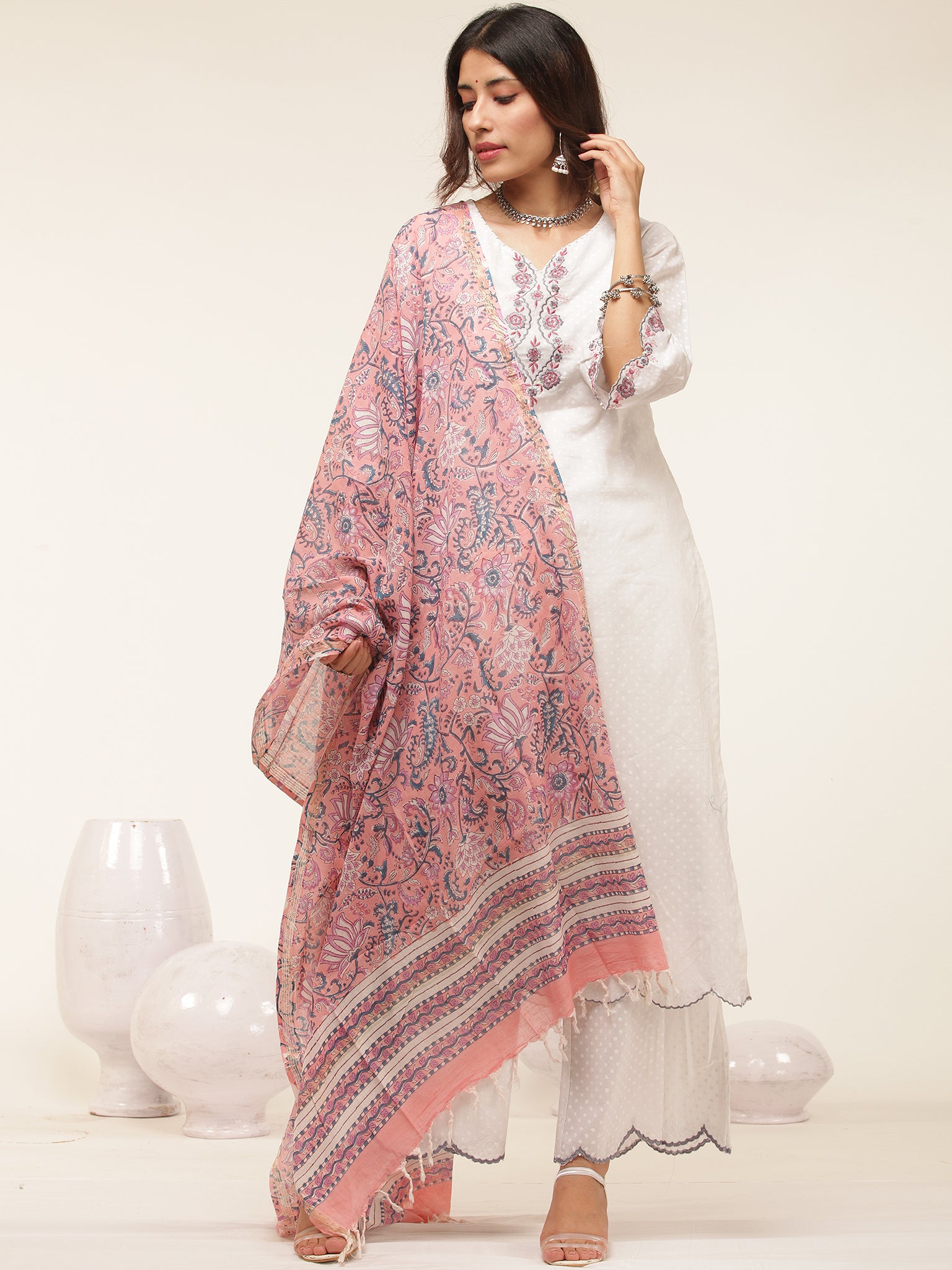Product: This set contains Handcrafted Sanganeri Premium Cotton White Kurta, 100% Cotton Palazzo and Cotton Dupatta.