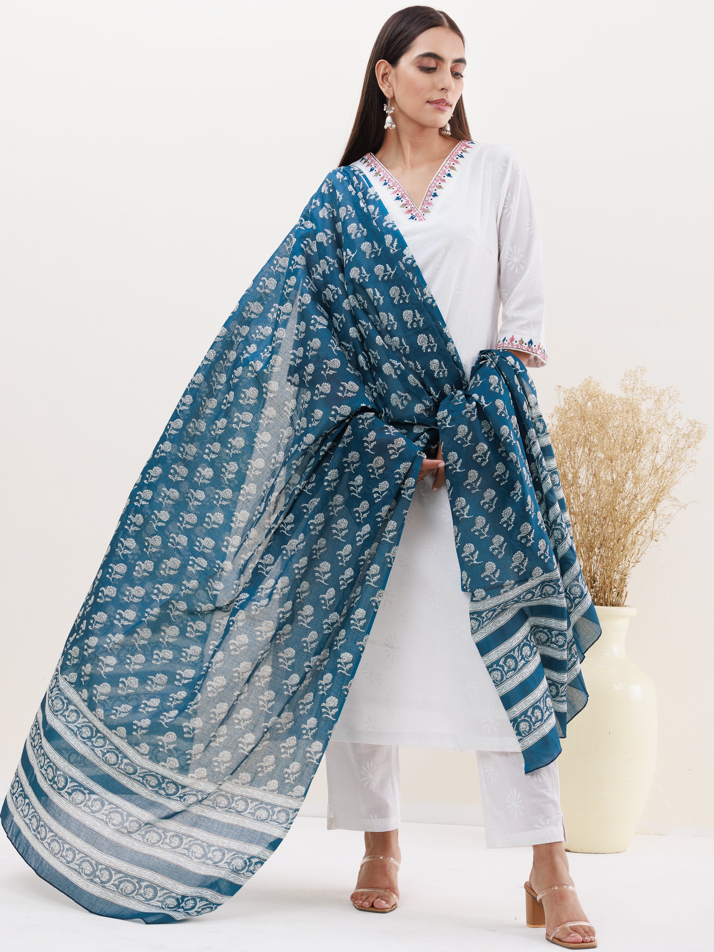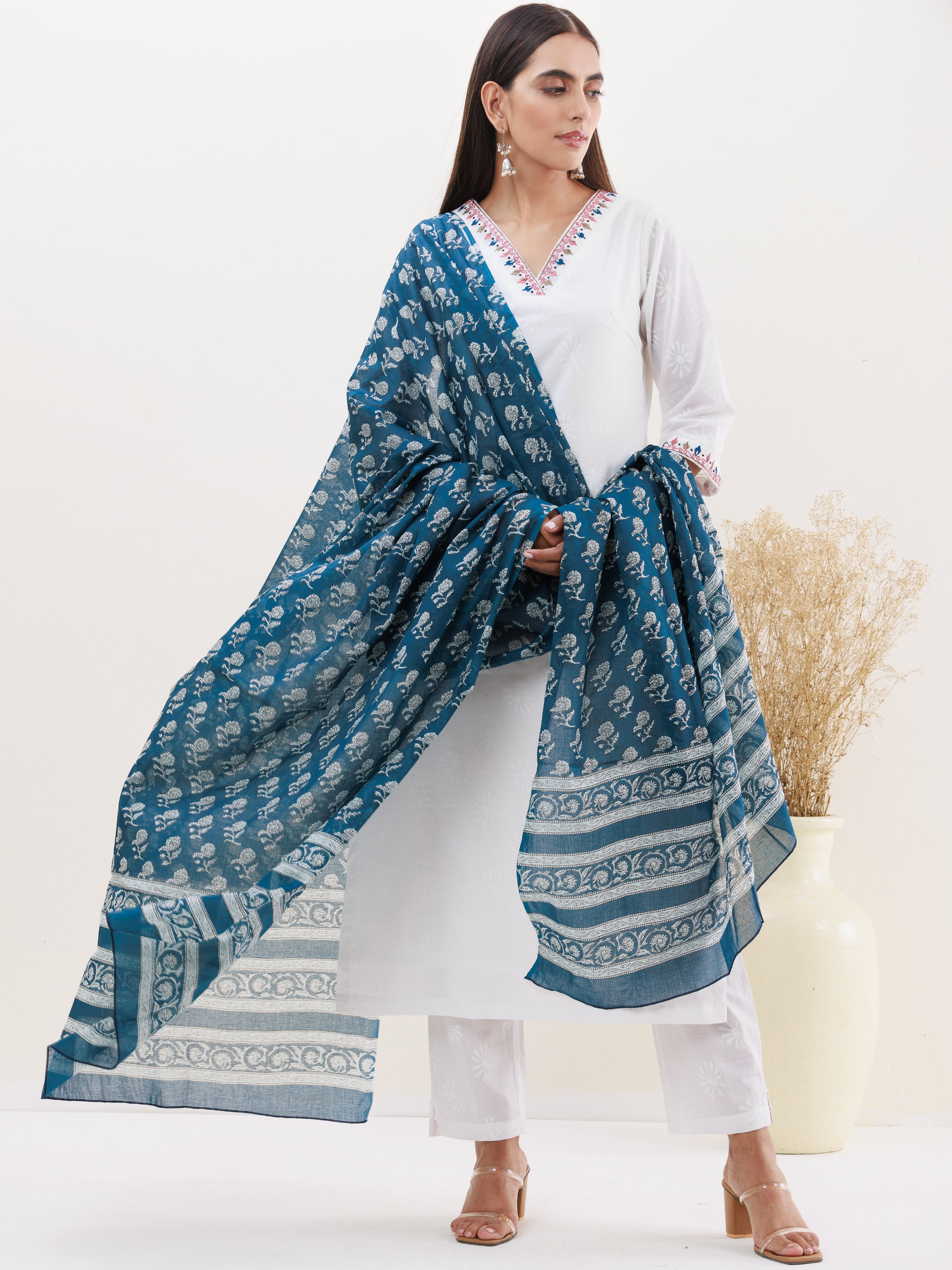 Product: This set contains Handcrafted Sanganeri Premium Cotton White Kurta, 100% Cotton Pants and Cotton Dupatta.