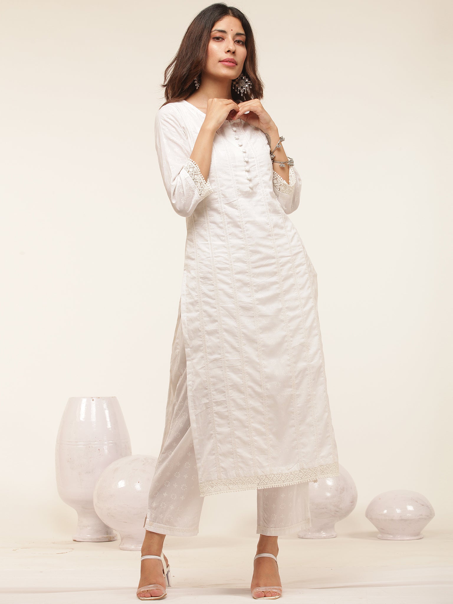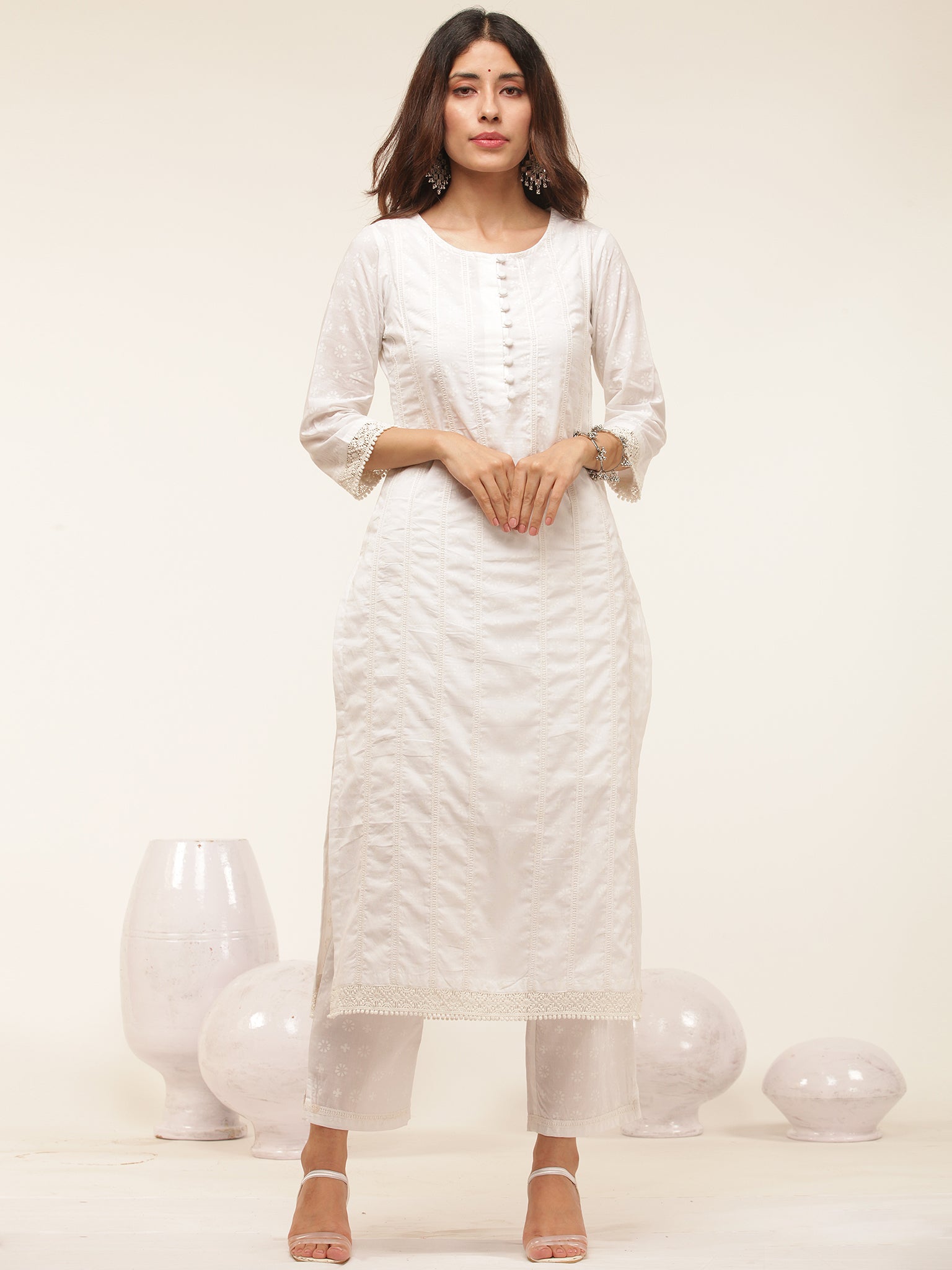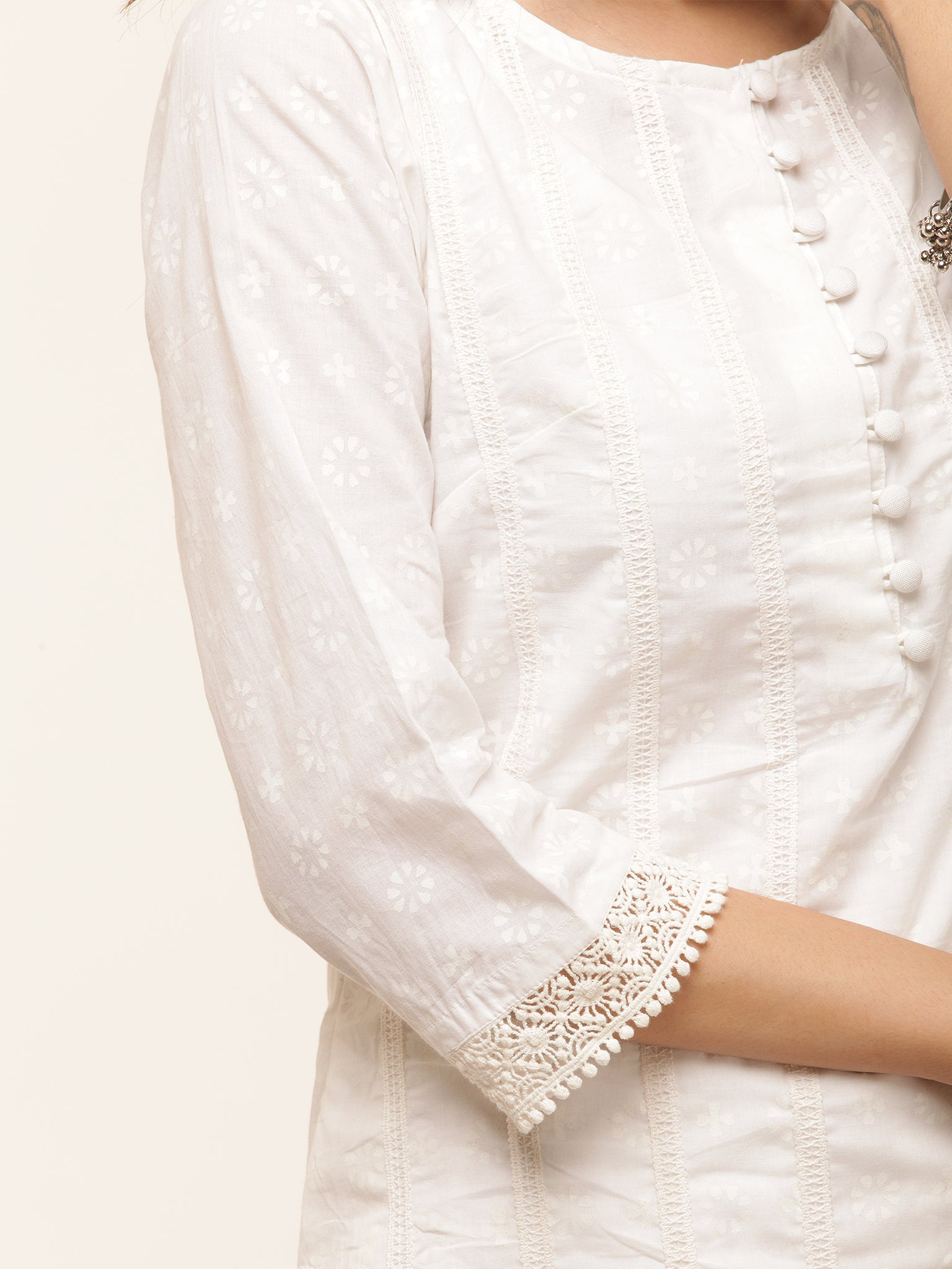 Product: This set contains Handcrafted Sanganeri Premium Cotton White Kurta, 100% Cotton Pants and Cotton Dupatta.