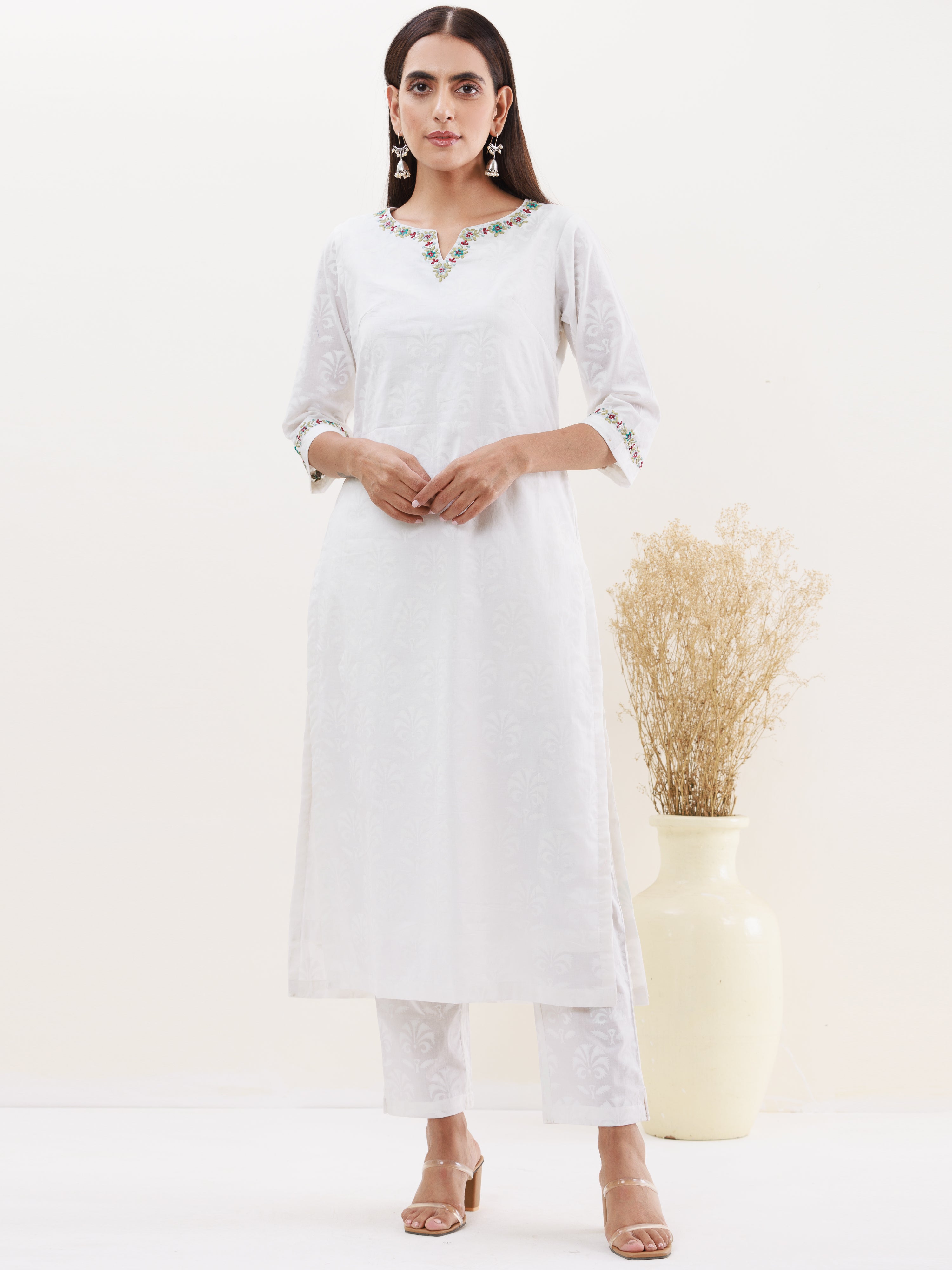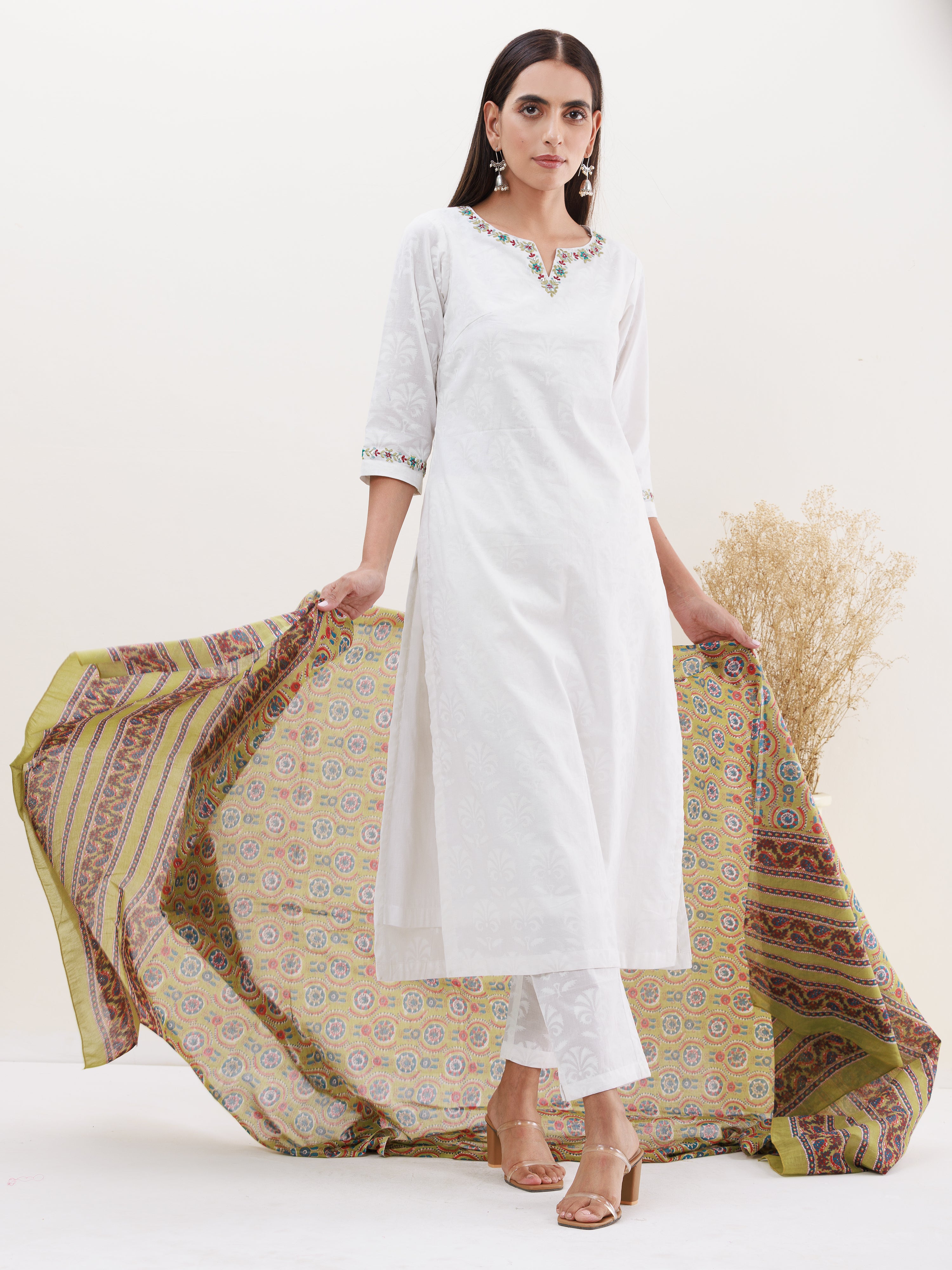 Product: This set contains Handcrafted Sanganeri Premium Cotton White Kurta, 100% Cotton Pants and Cotton Dupatta.