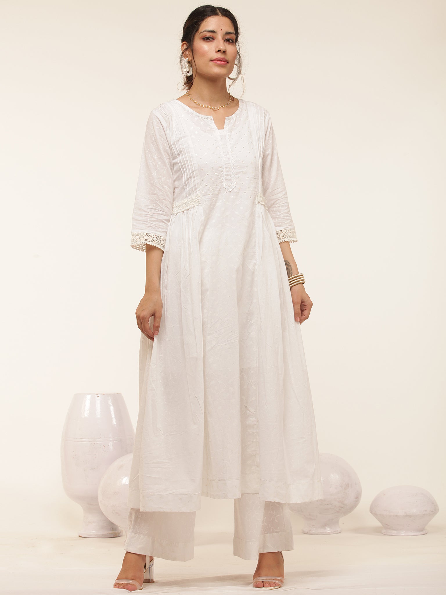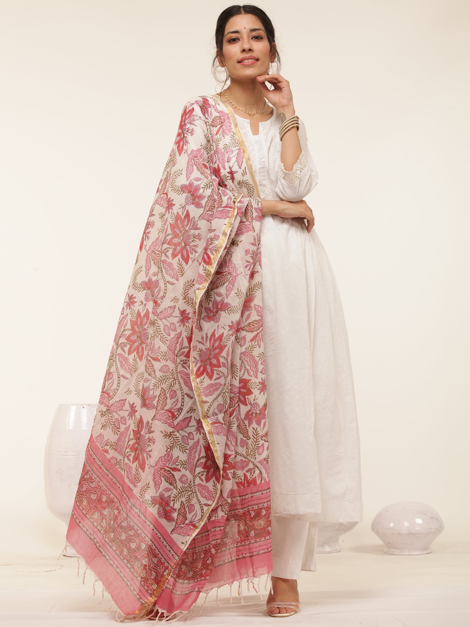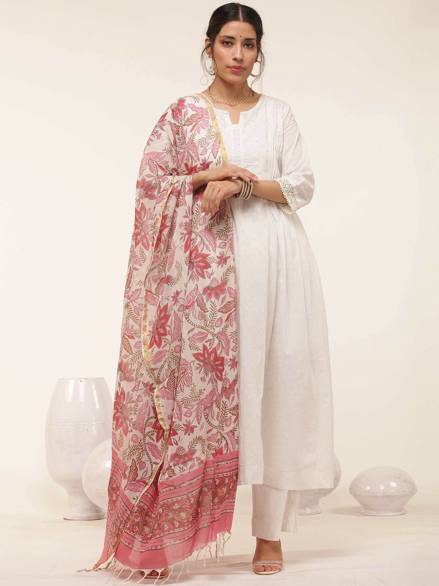 Product: This set contains Handcrafted Sanganeri Premium Cotton White Kurta, 100% Cotton Pants and Cotton Dupatta.