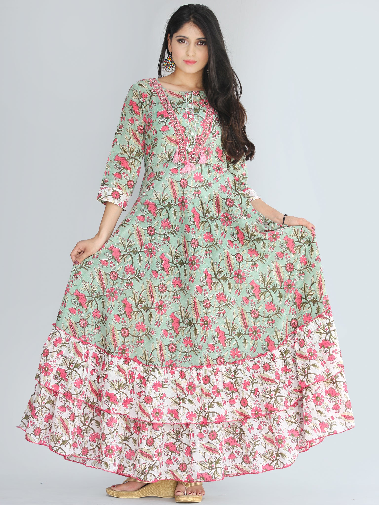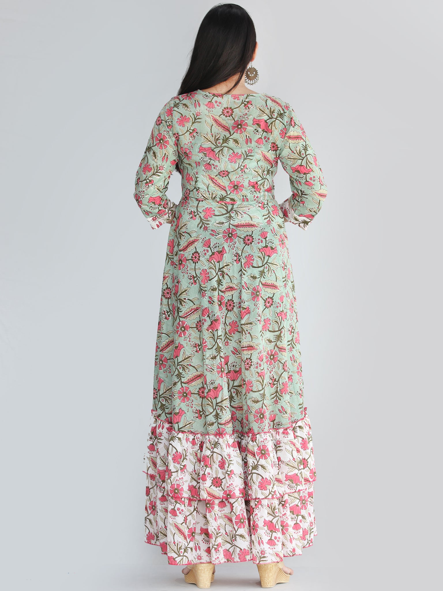 Gulzar Fariba - Hand Block Printed Long Cotton Dress With Ruffles - D412F2187