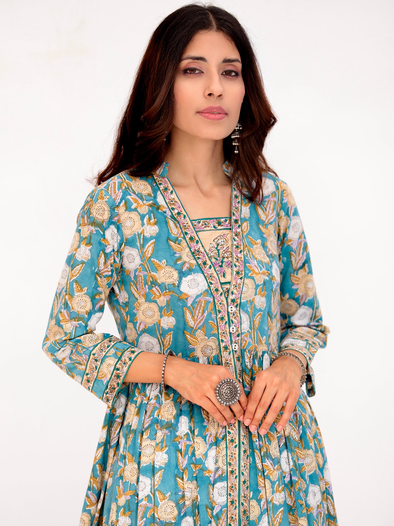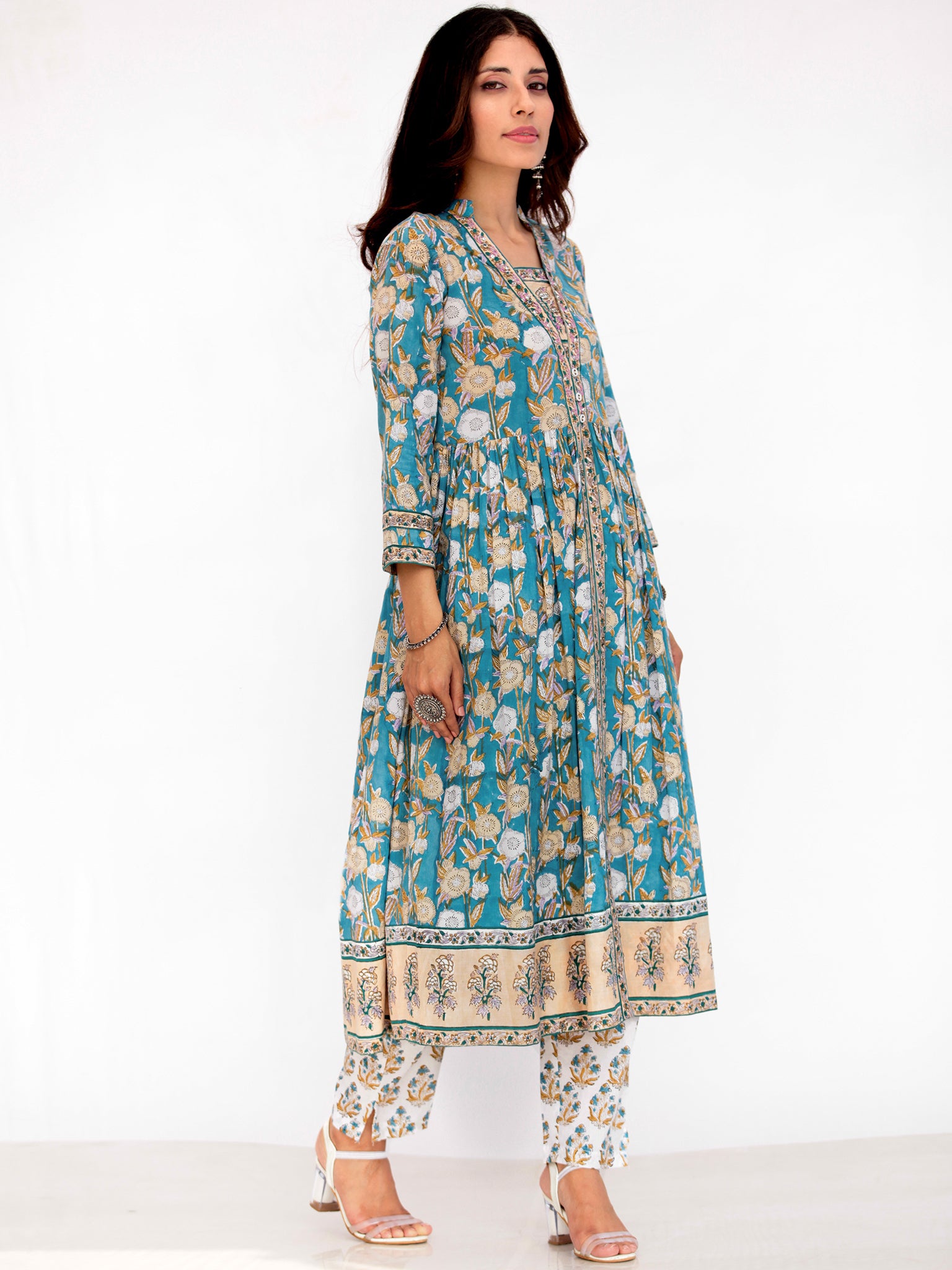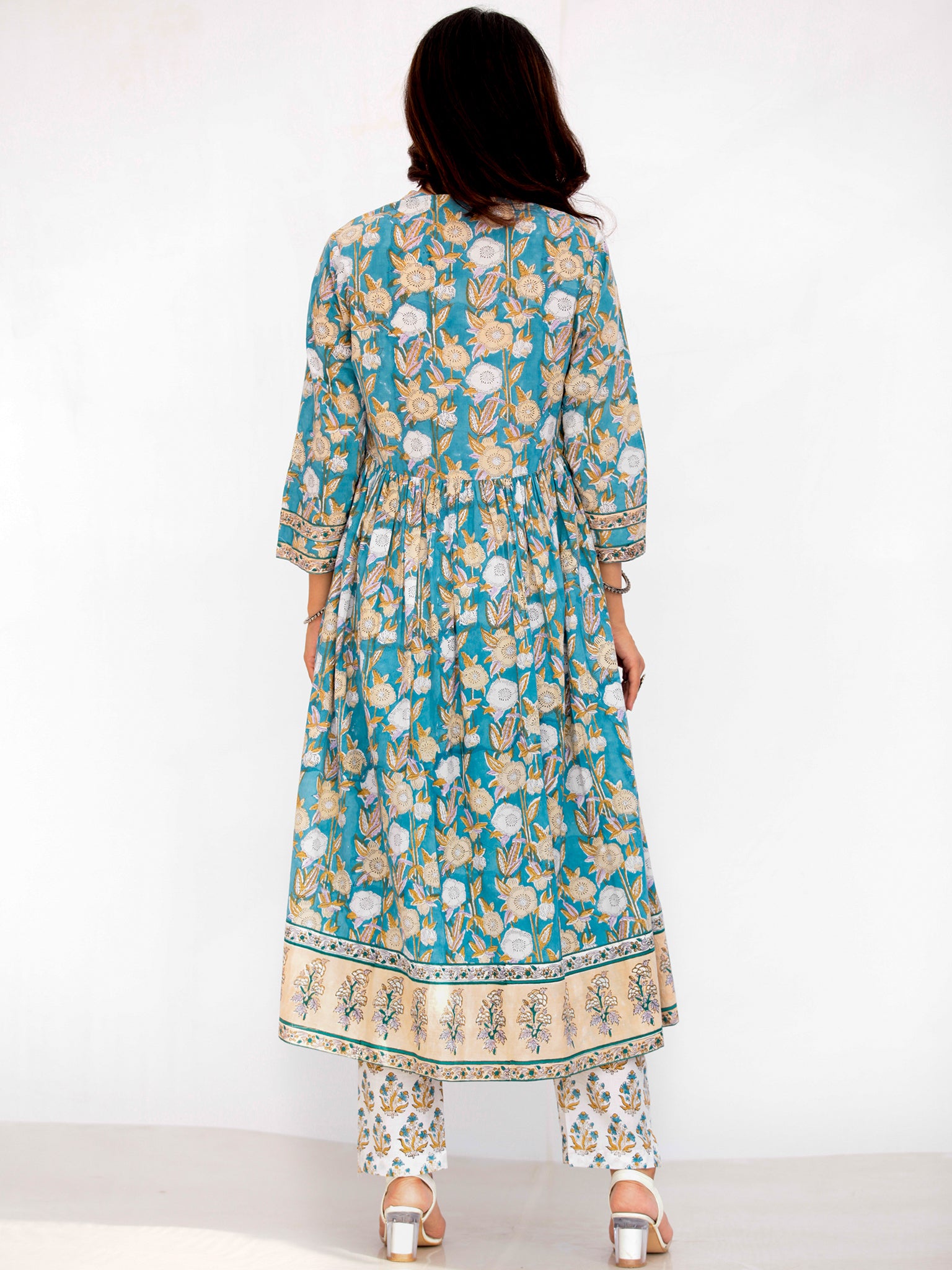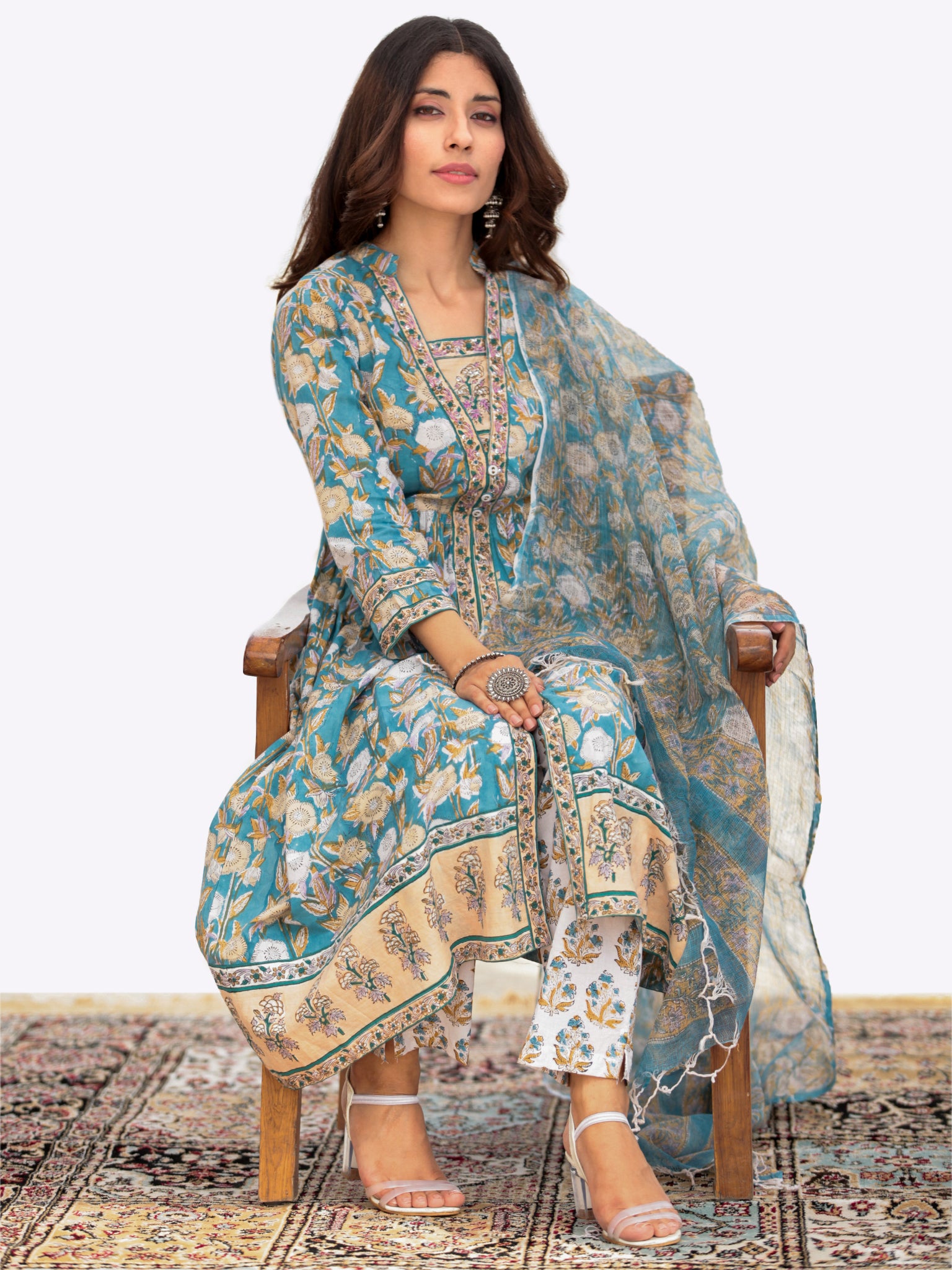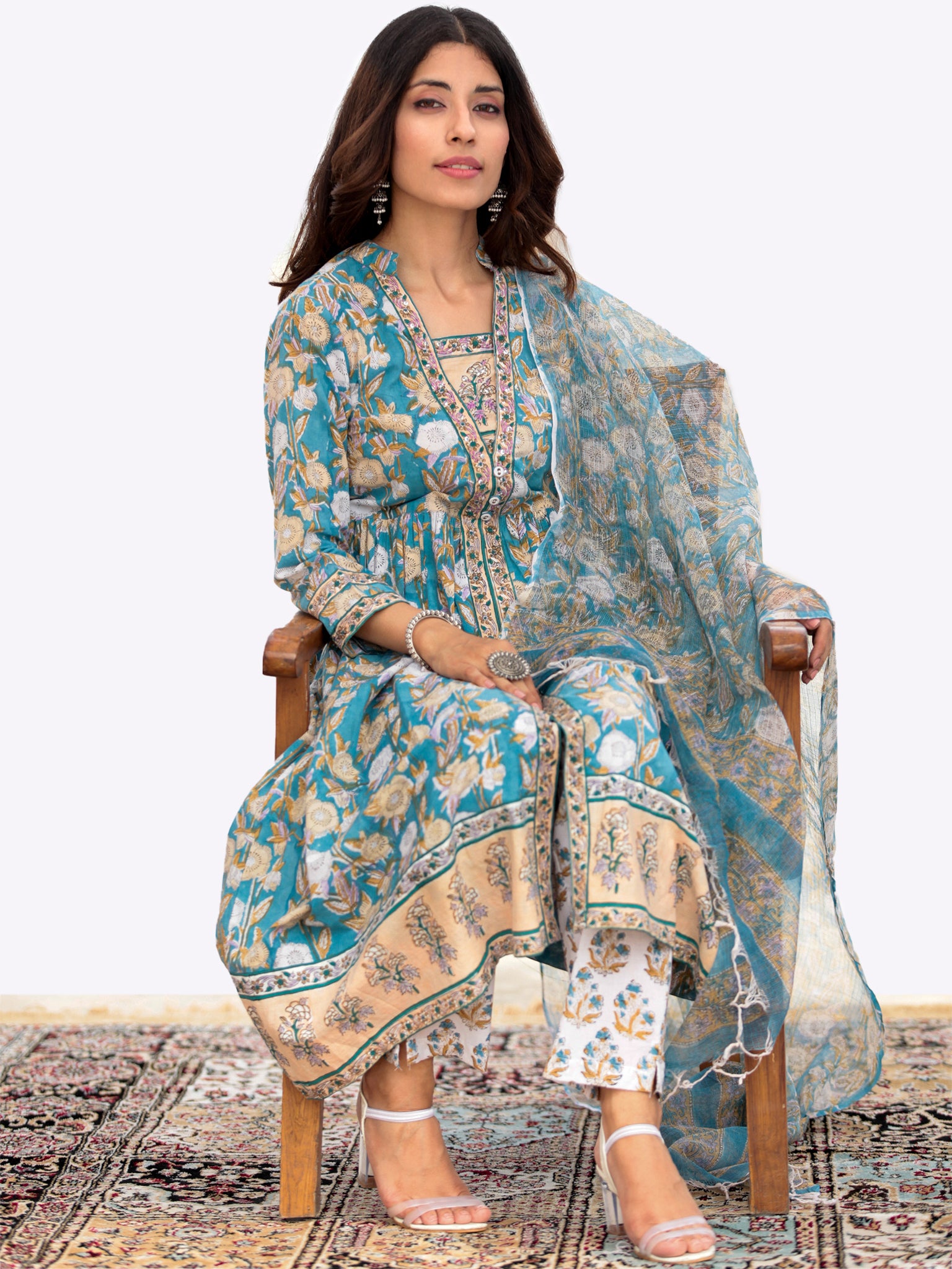 Product: This set contains Handcrafted Sanganeri Premium Cotton Kurta, 100% Cotton Palazzo Pants and Kota Doria Dupatta.