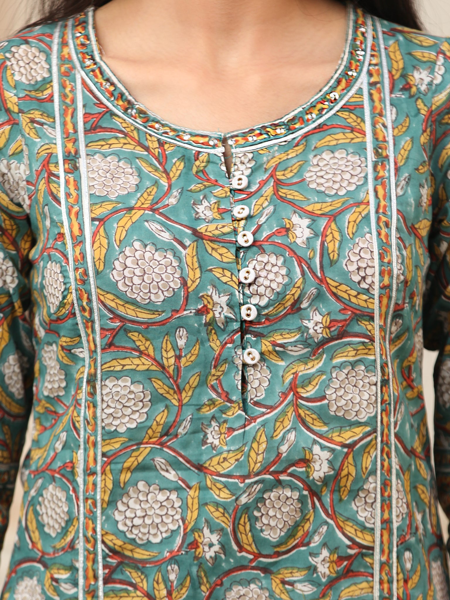 Product: Contains Hand Block Printed Cotton Kurta. Matching Pants/Bottoms and Dupatta are also available separately under BUY THE LOOK section.