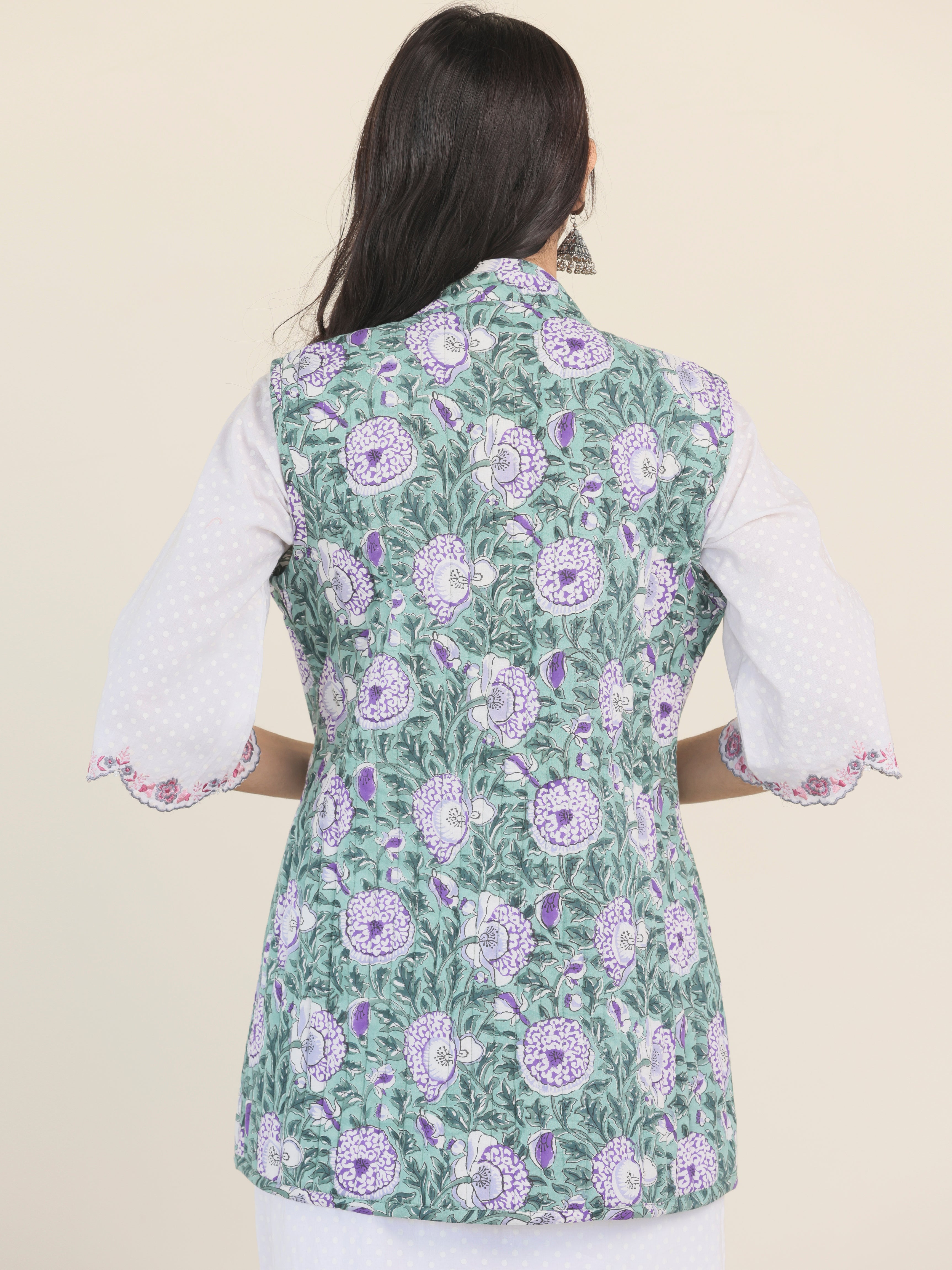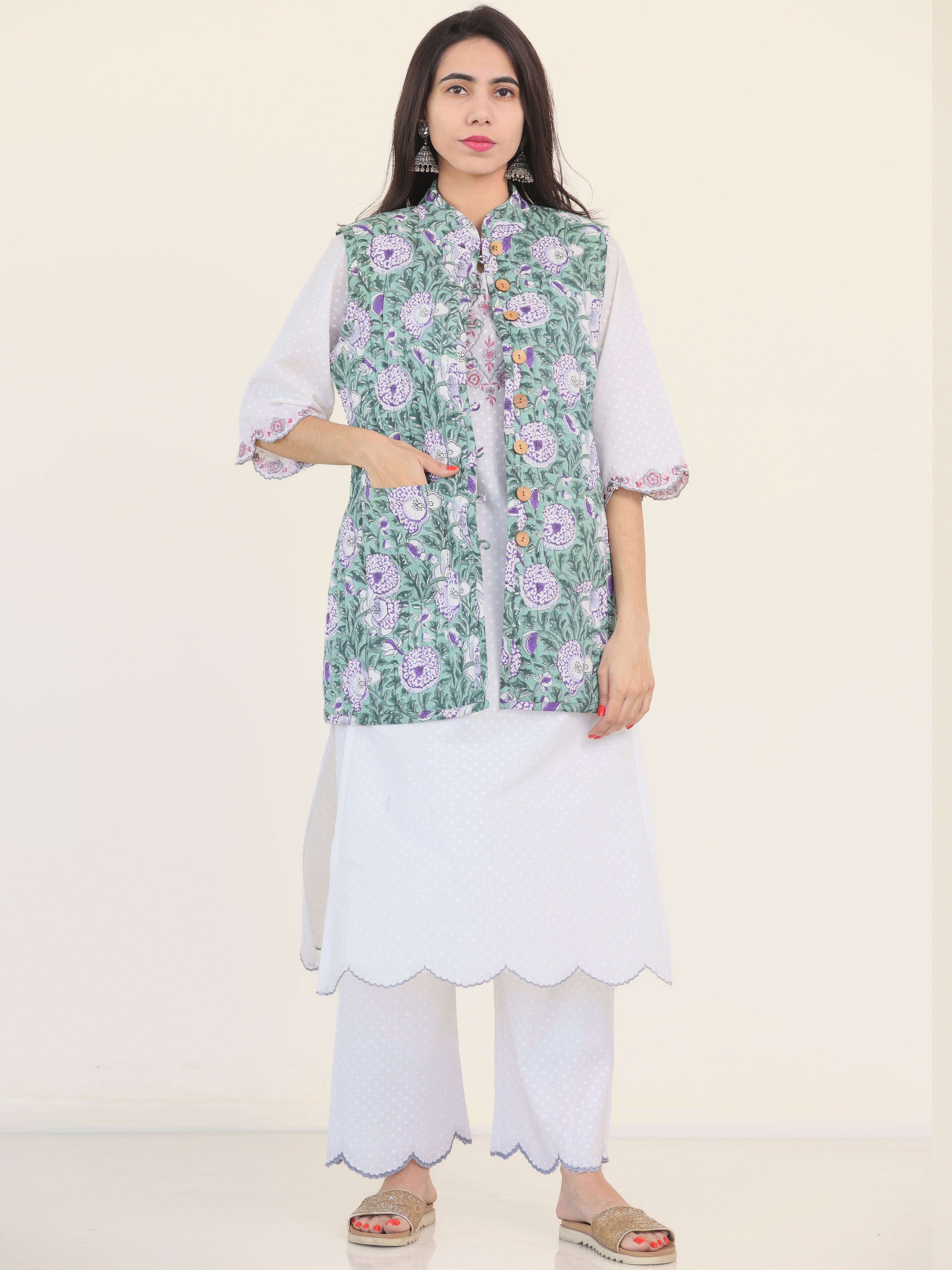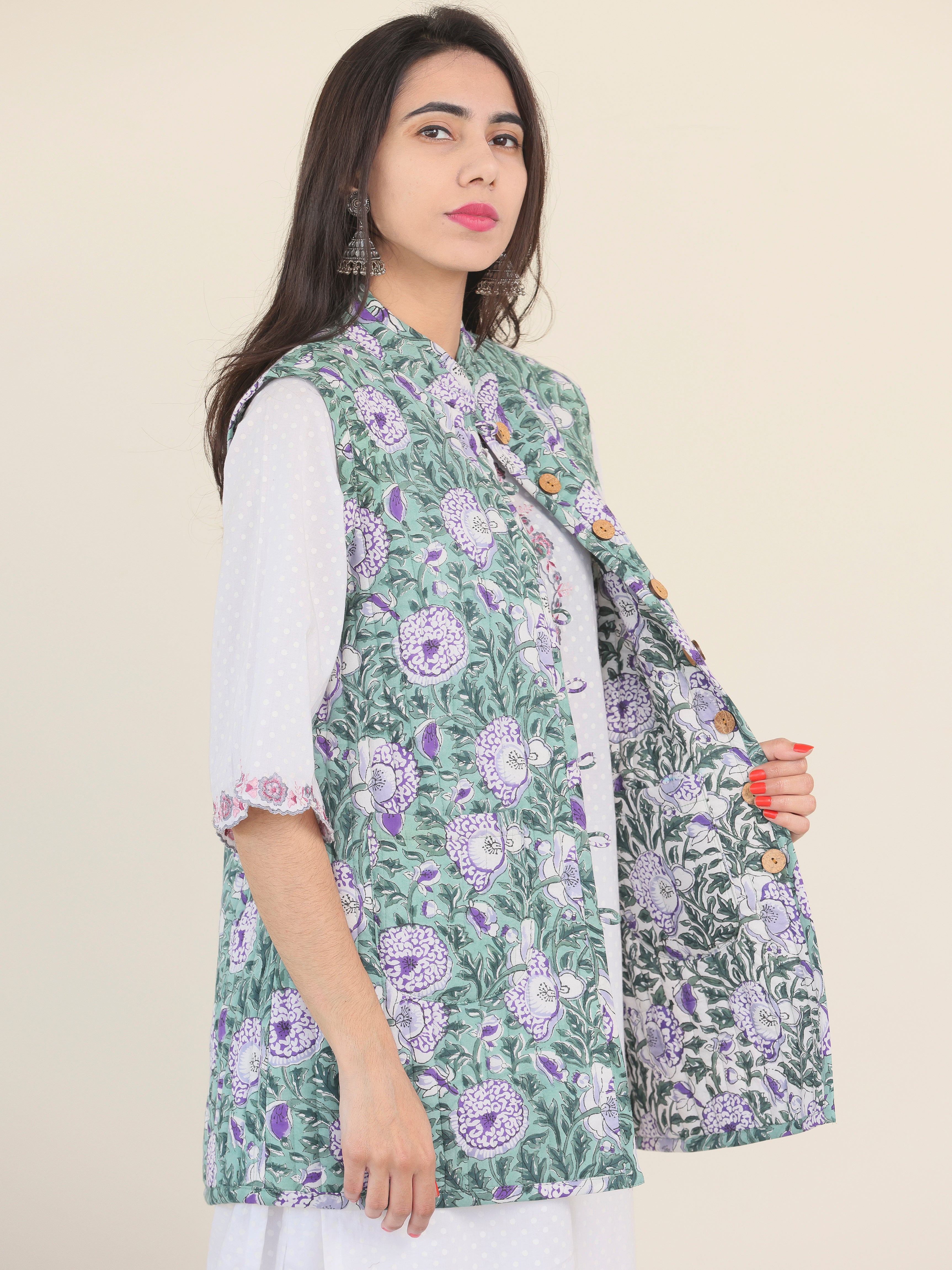 PRODUCT: Handcrafted Reversible Quilted Jacket with intrinsic and alluring work of block print on both the sides.