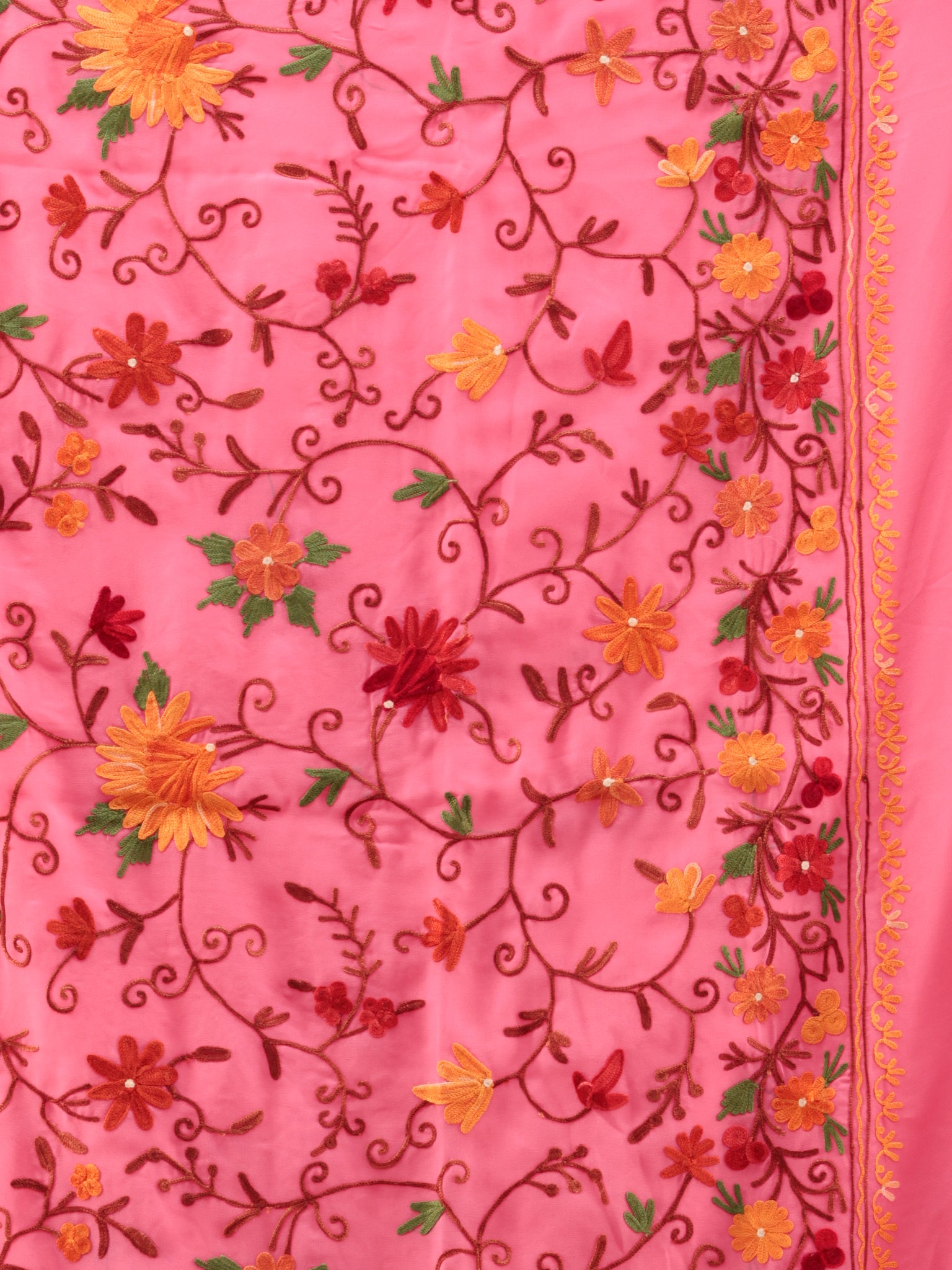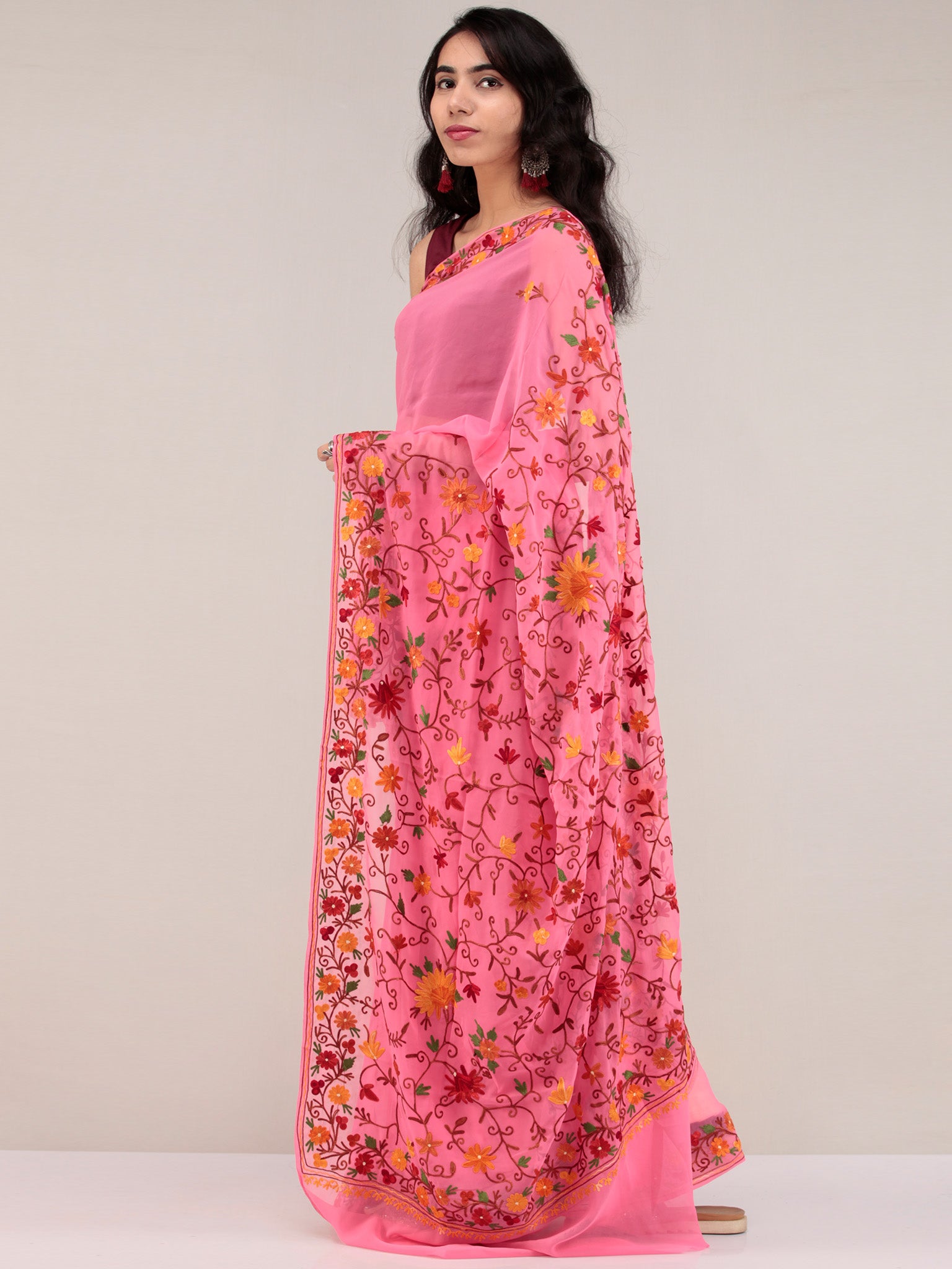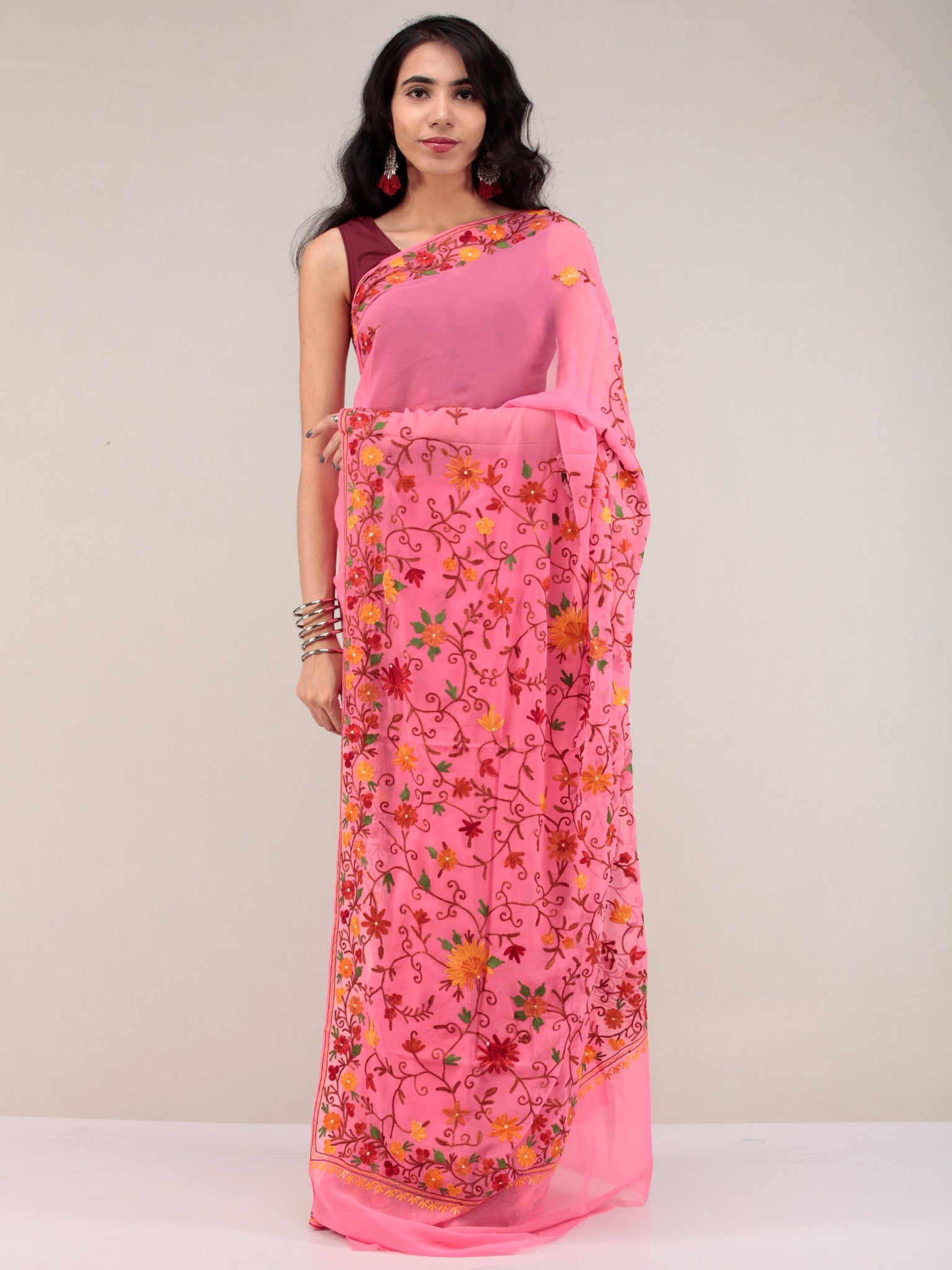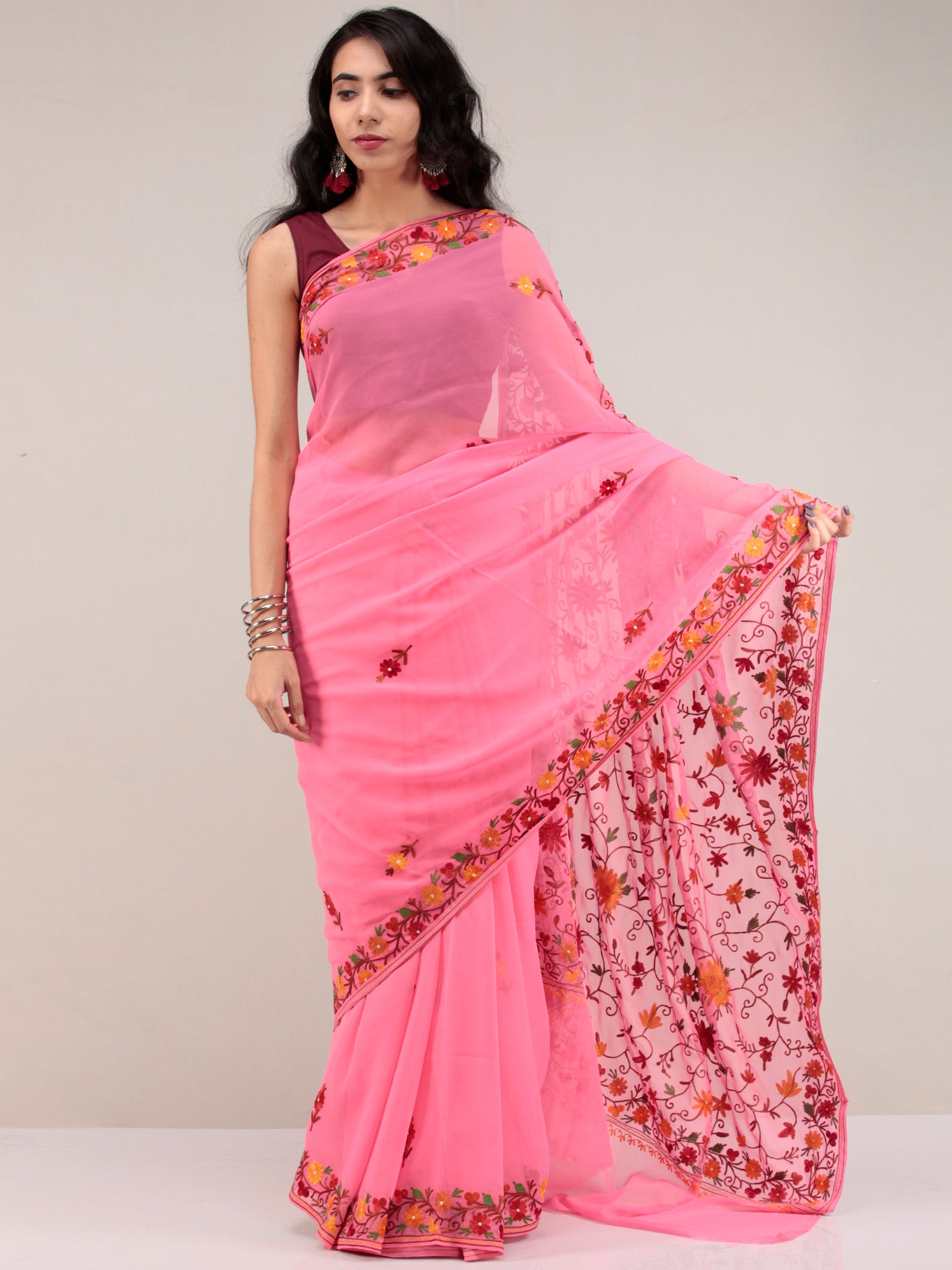 Pink Aari Embroidered Georgette Saree From Kashmir - S031704622
