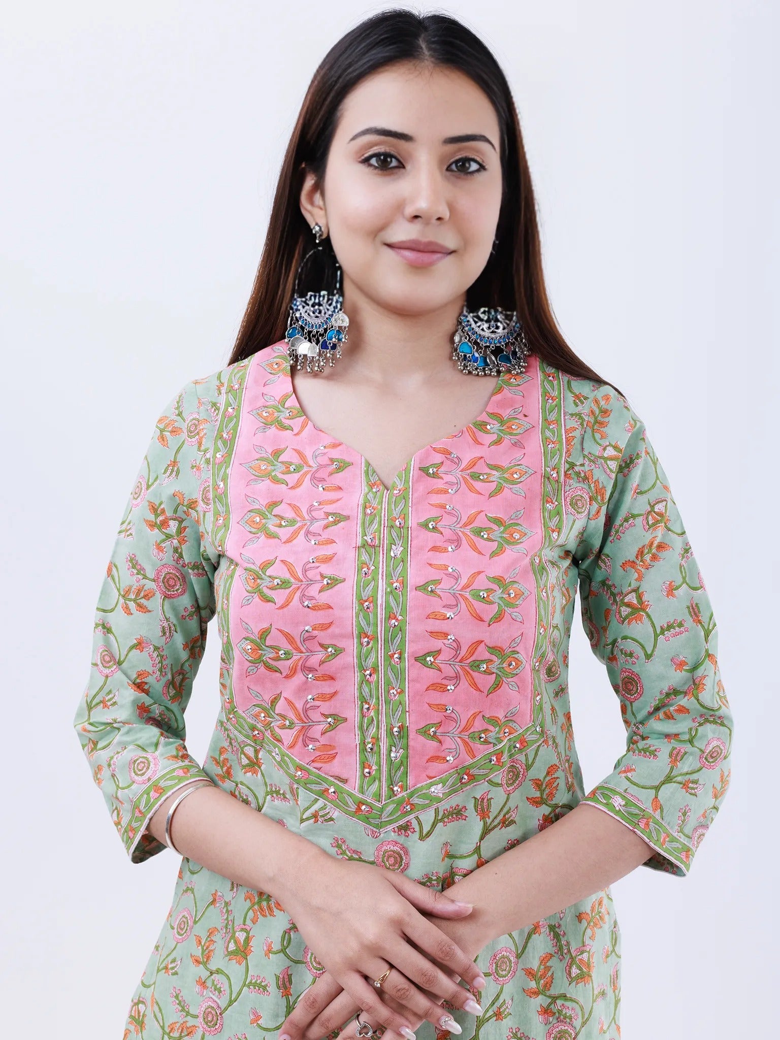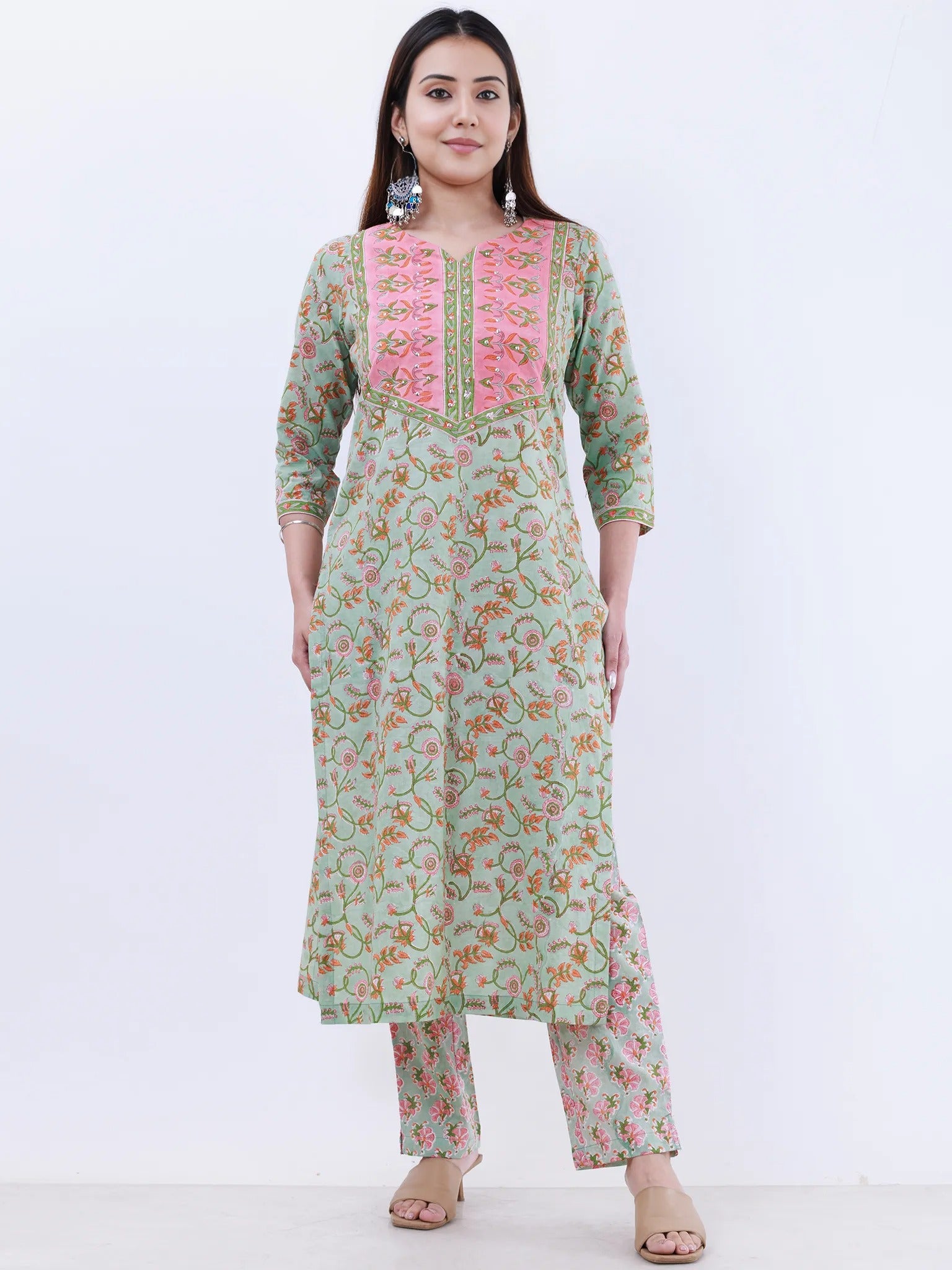 Product: Contains Hand Block Printed Cotton Kurta. Matching Pants/Bottoms and Dupatta are also available separately under BUY THE LOOK section.