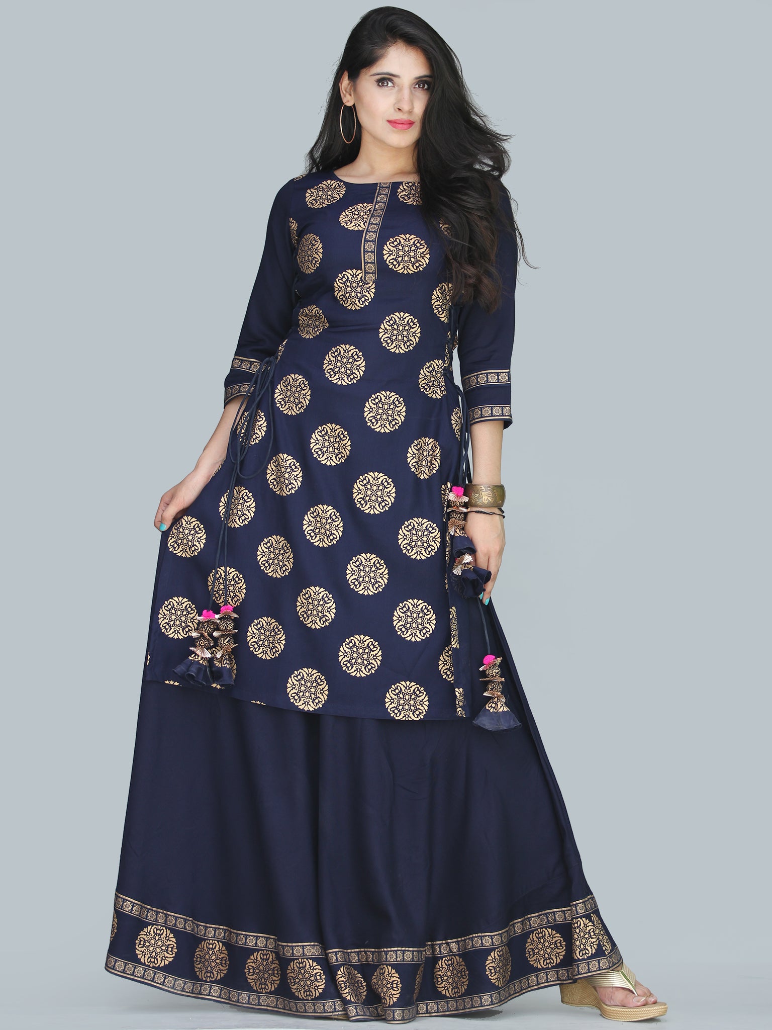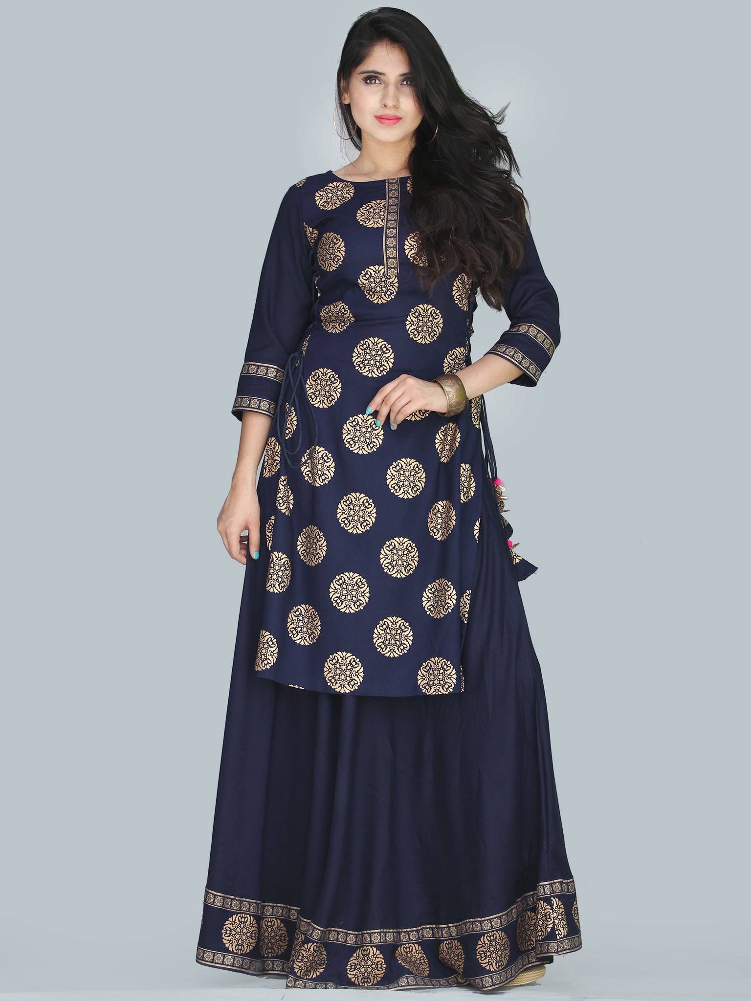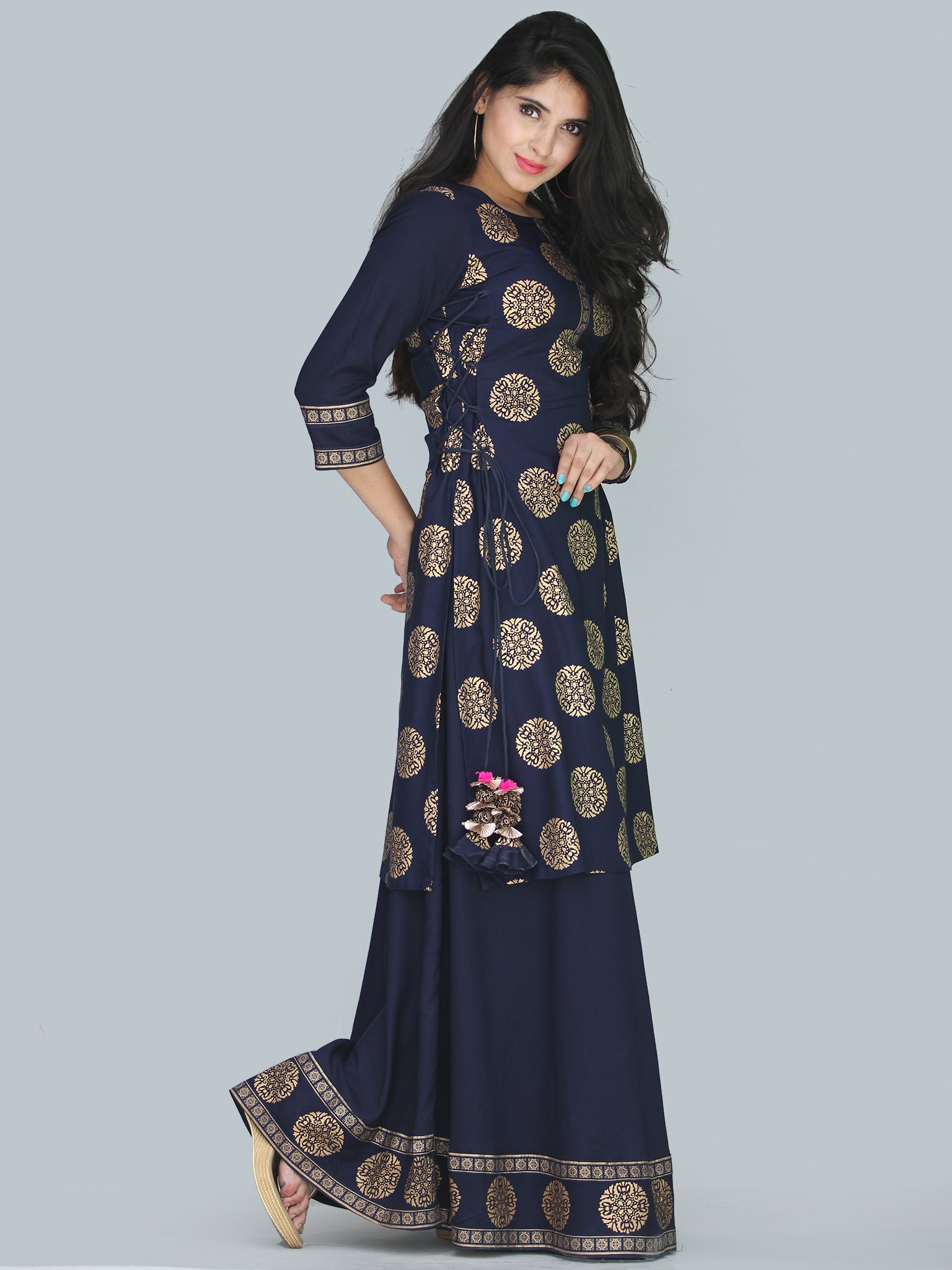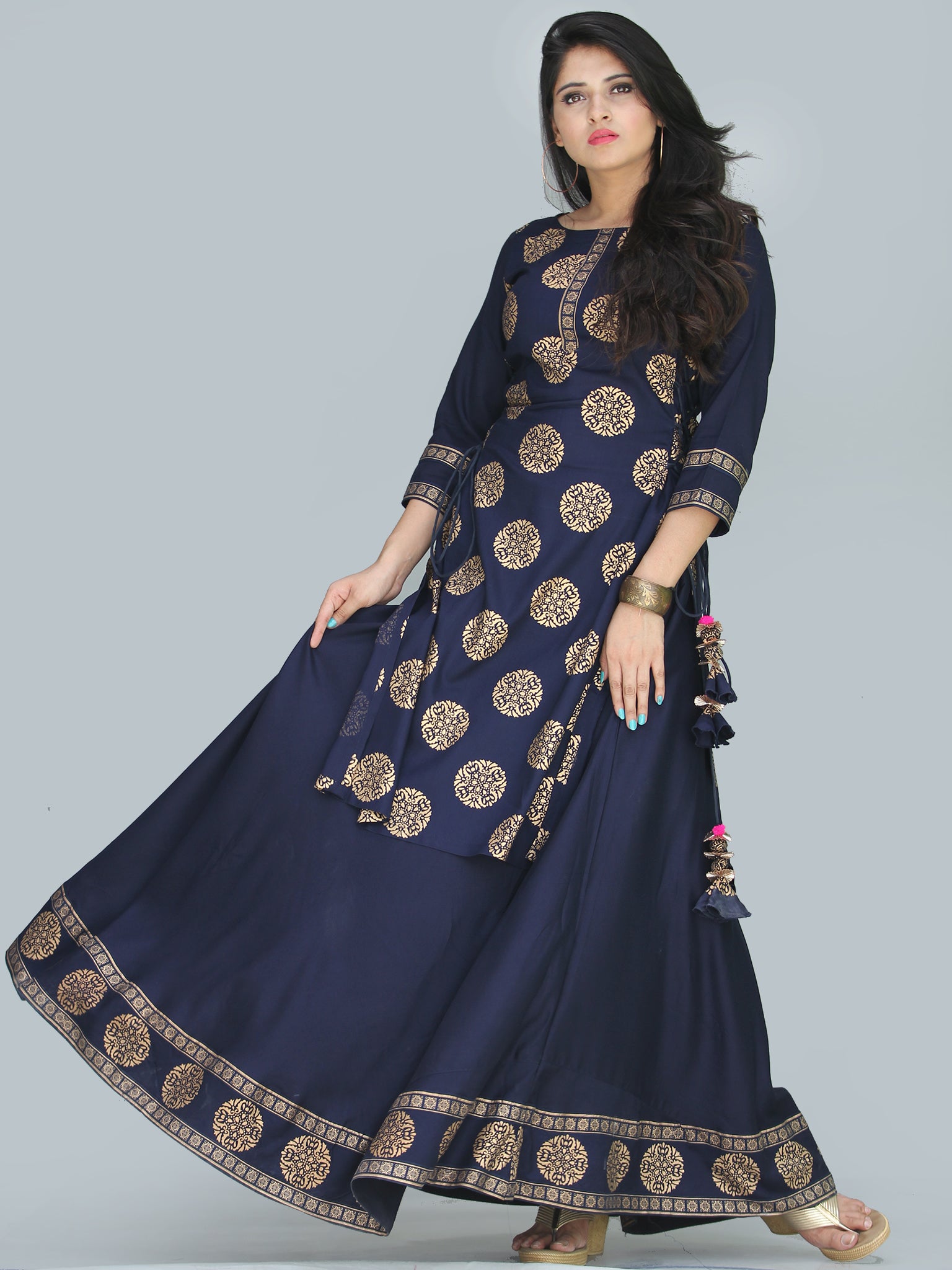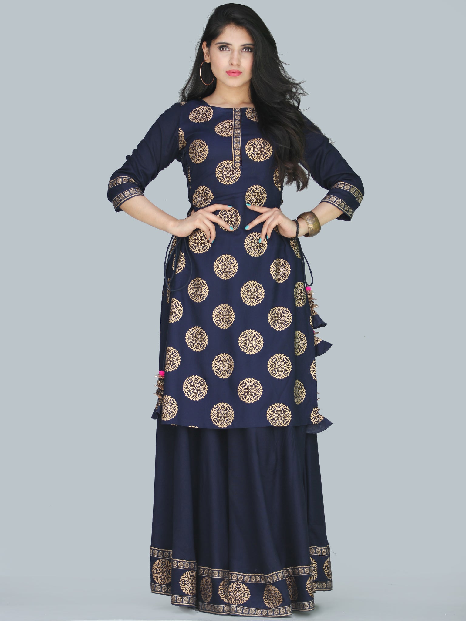 Naaz Aalia - Indigo Gold Block Print Kurta & Skirt Dress With Tassels - D380FXXXX