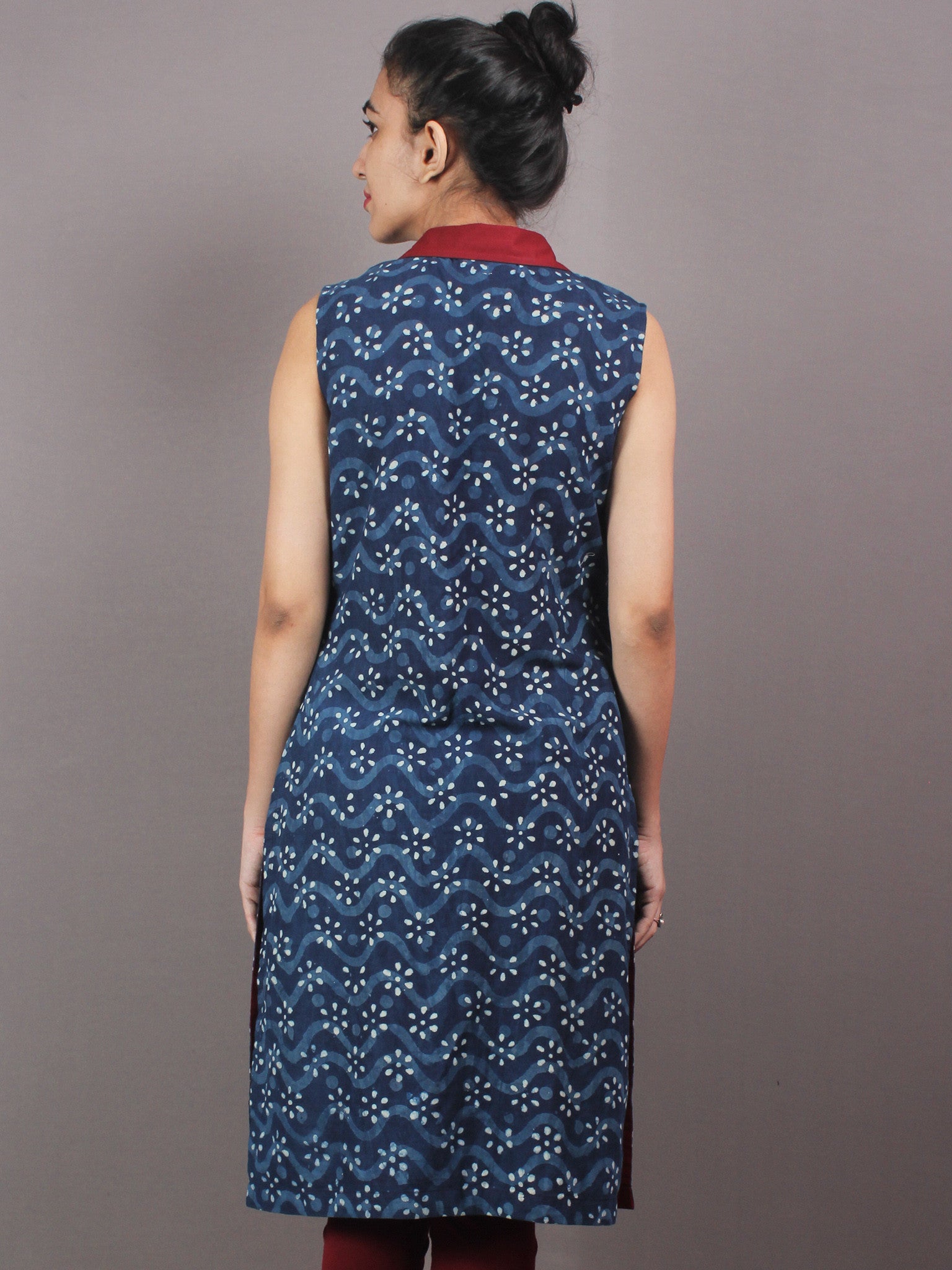 Indigo Ivory Maroon Hand Block Printed Kurti With Open Front With Buttons - K02A17001