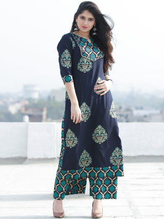 Raashida - Indigo Green Gold Printed Kurta Palazzo Set - SS02F2004