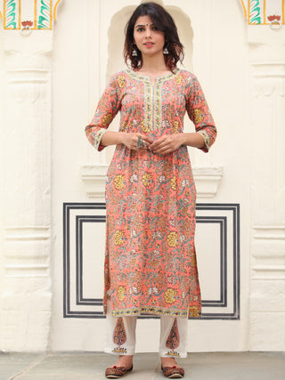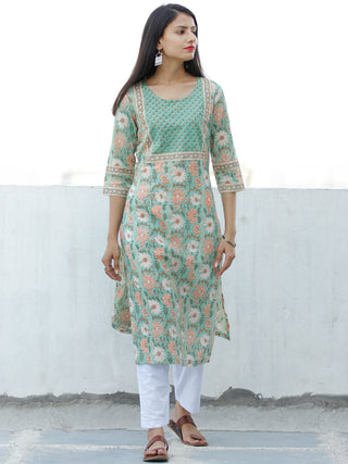 Light Green Peach OffWhite Block Printed Cotton Kurta - K195F1929