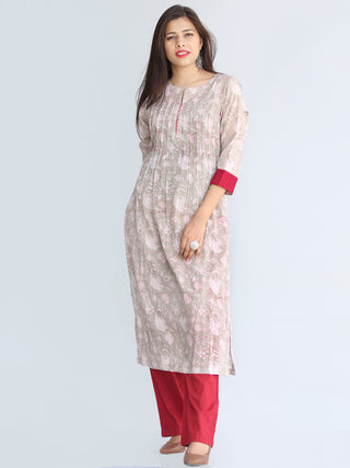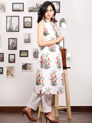 White Peach Green Hand Block Printed Kurta in Natural Colors With stand Collar - K77F1504