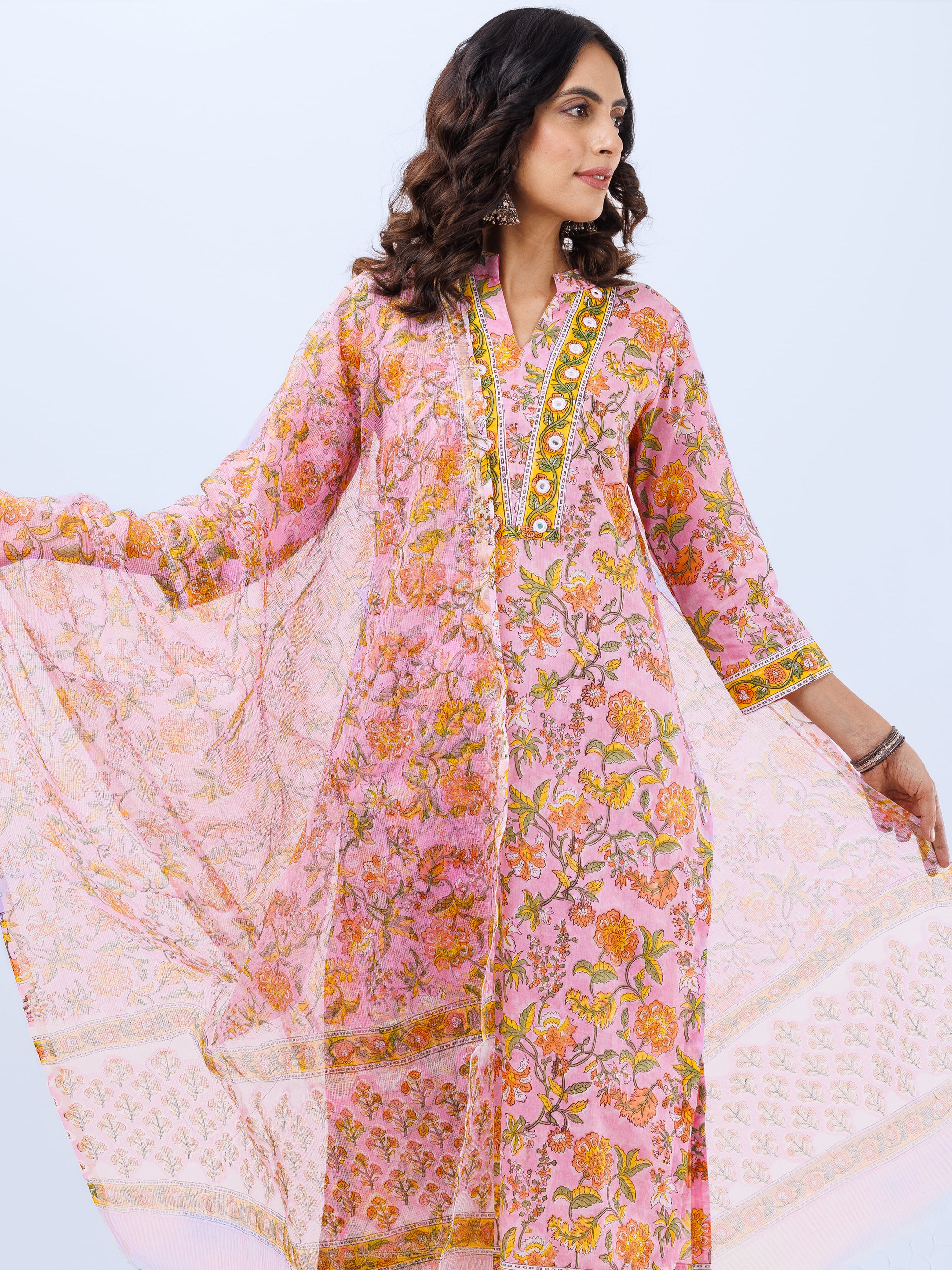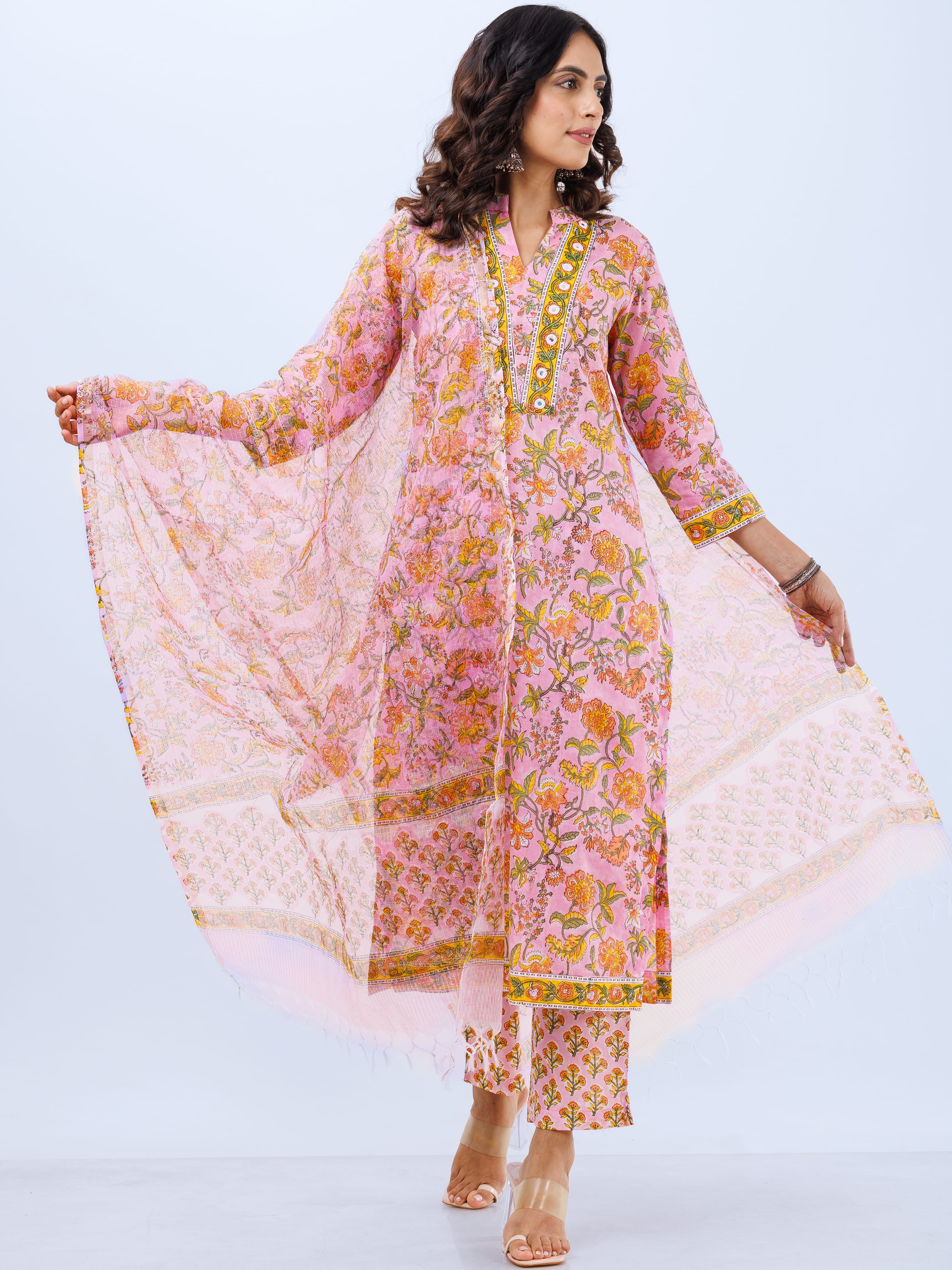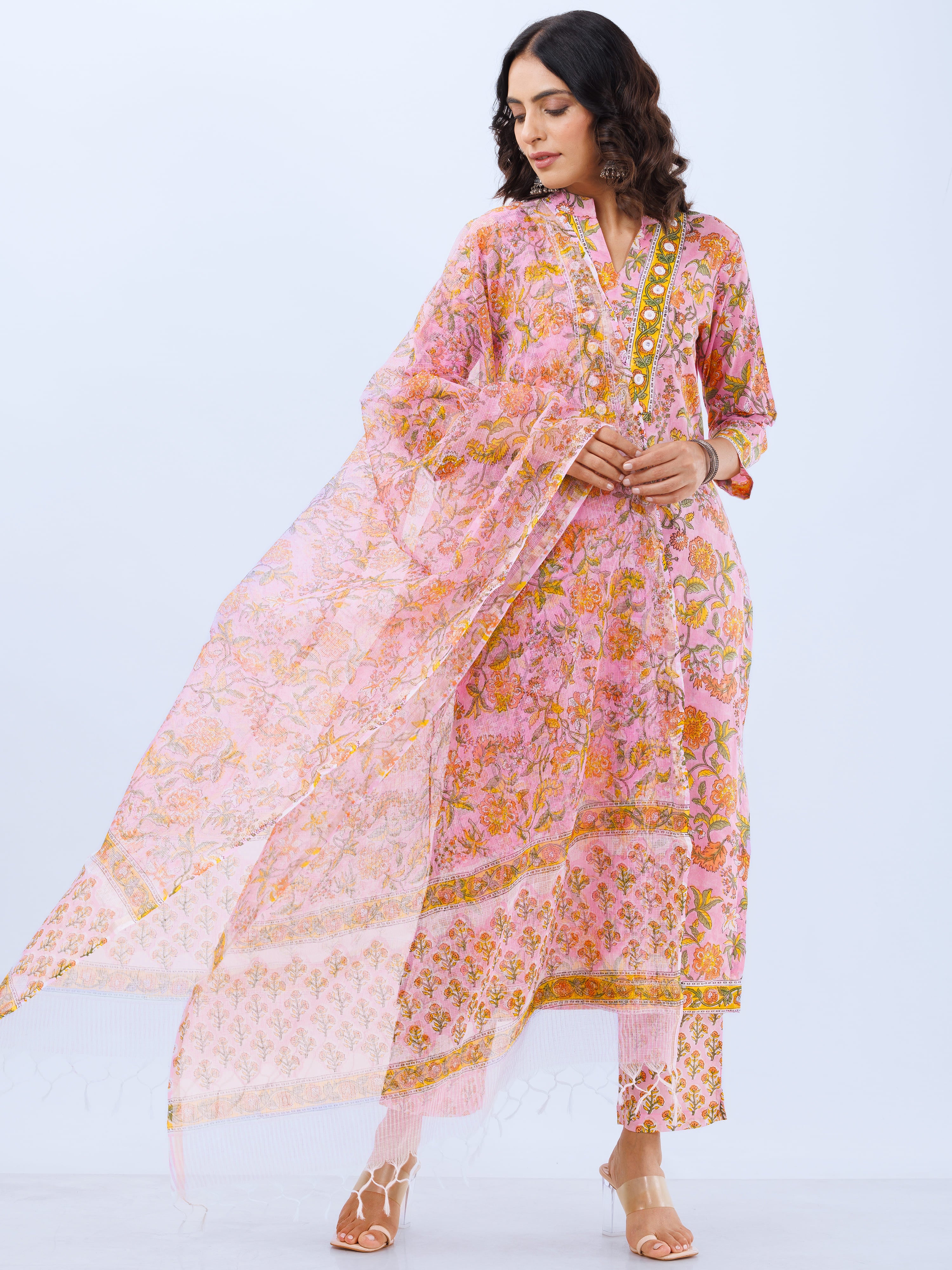 Product: This set contains Hand Block Printed Premium Cotton Kurta, 100% Cotton Pants and Kota Doria Dupatta.