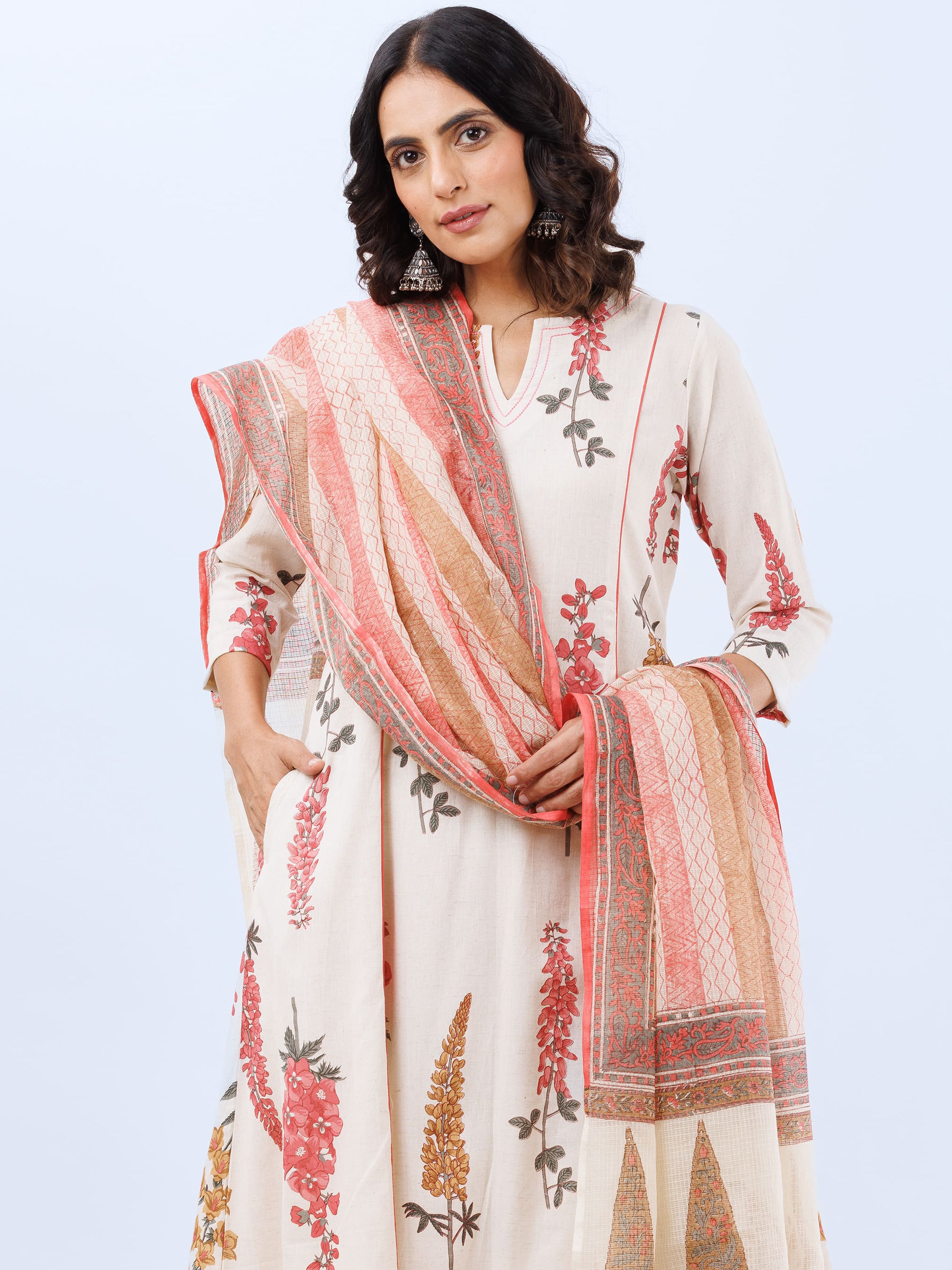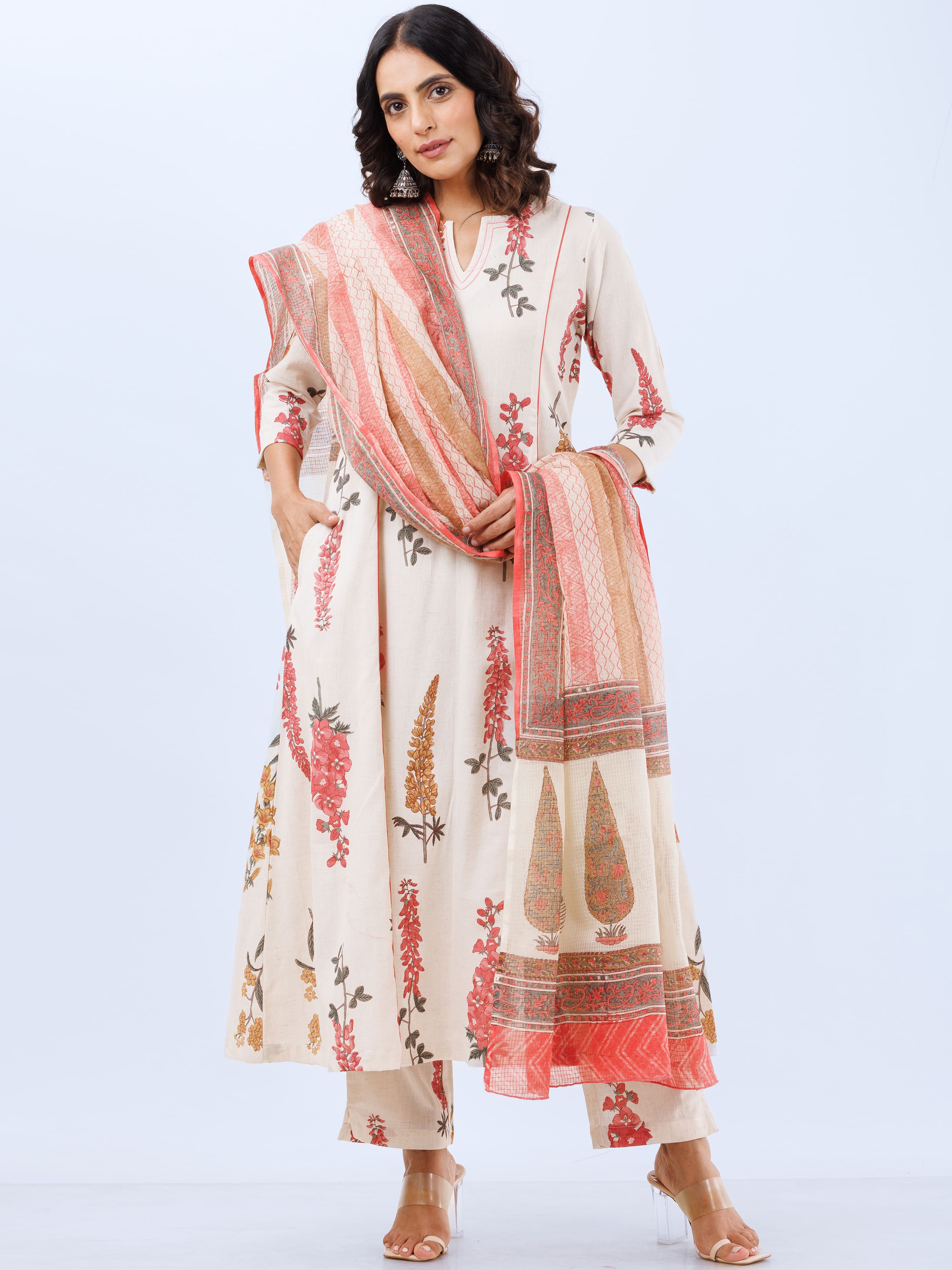 Product: This set contains Hand Block Printed Premium Cotton Linen Kurta, 100% Cotton Linen Pants and Kota Doria Dupatta.