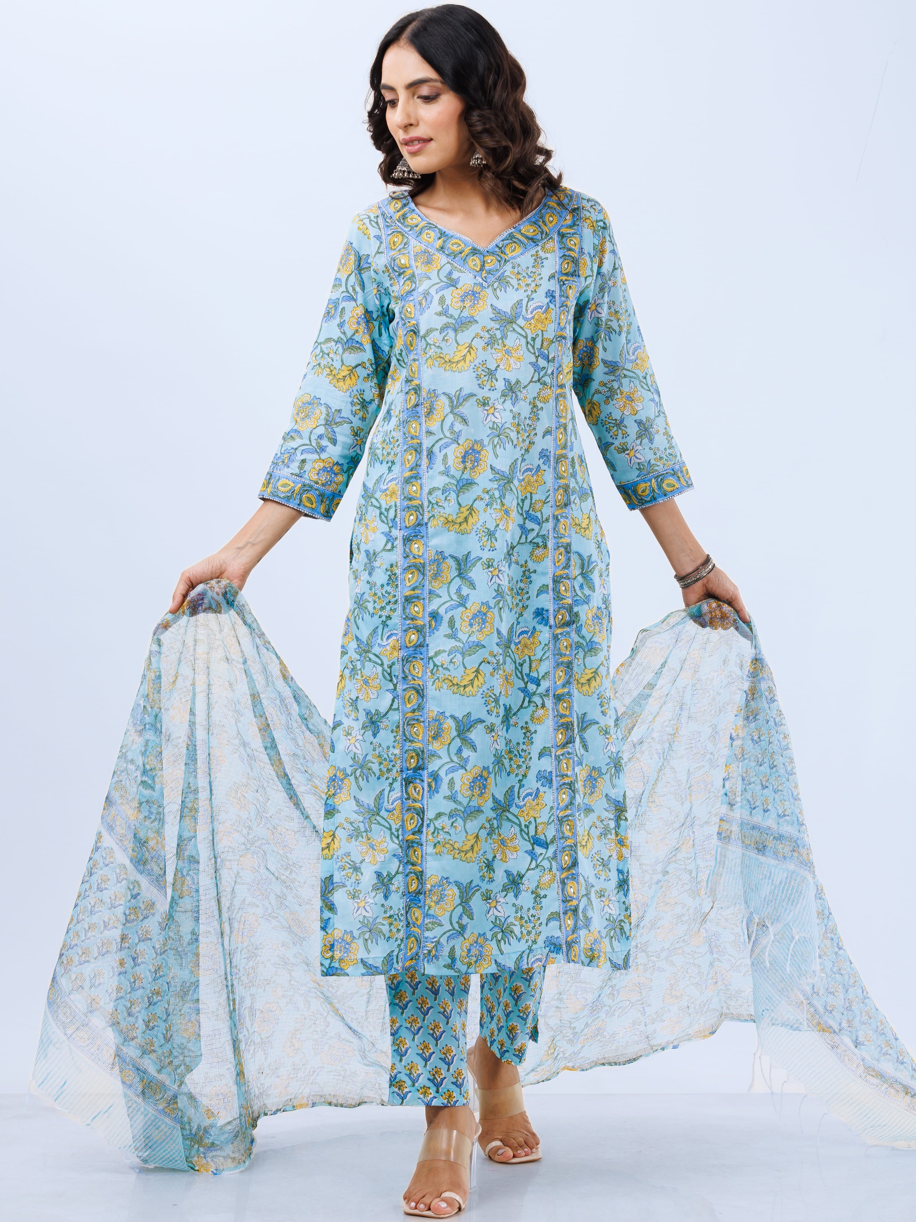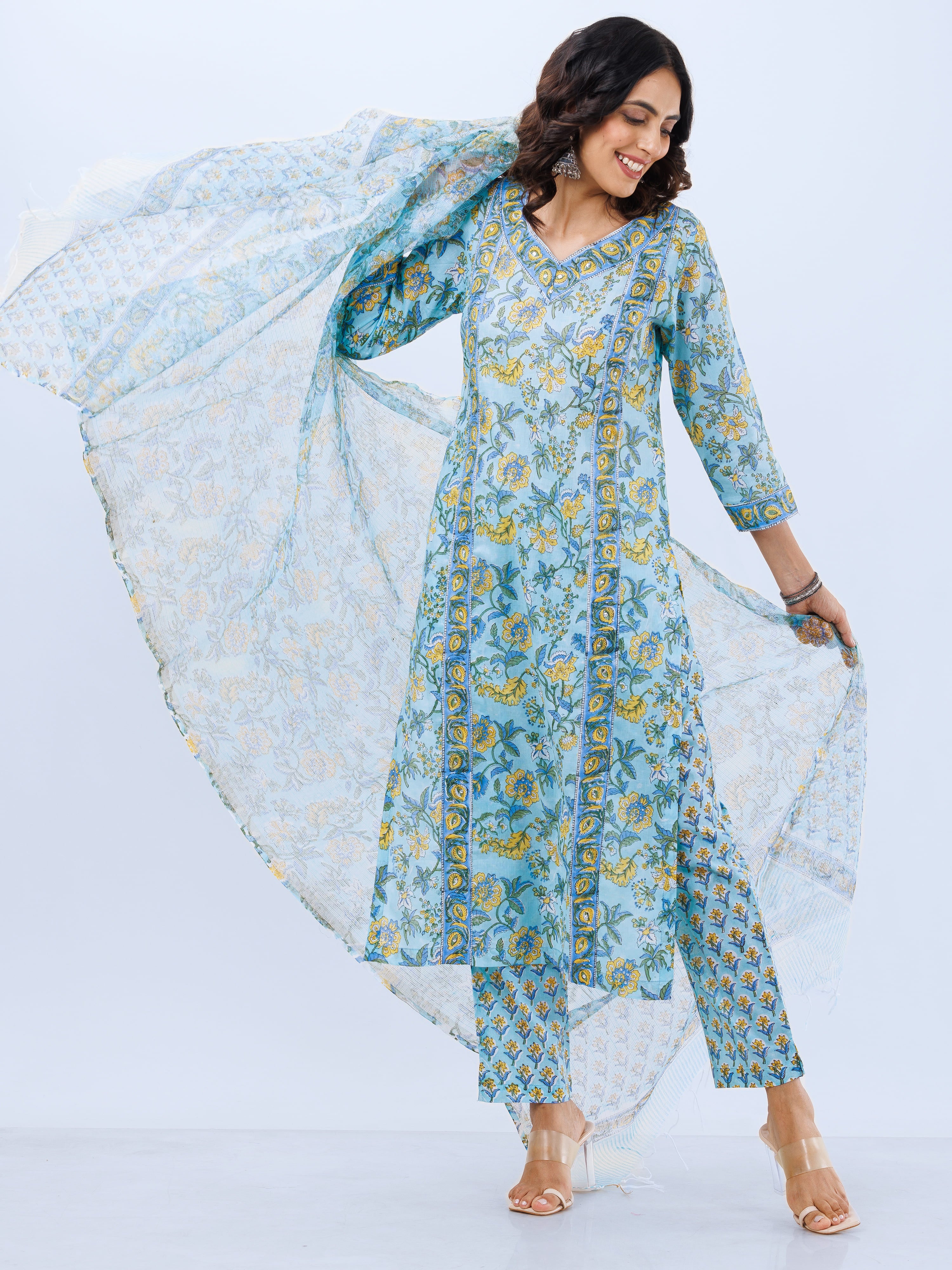 Fabric : Hand Block Printed. Kurta - Cotton . Pants - Cotton, Dupatta - Kota Doria