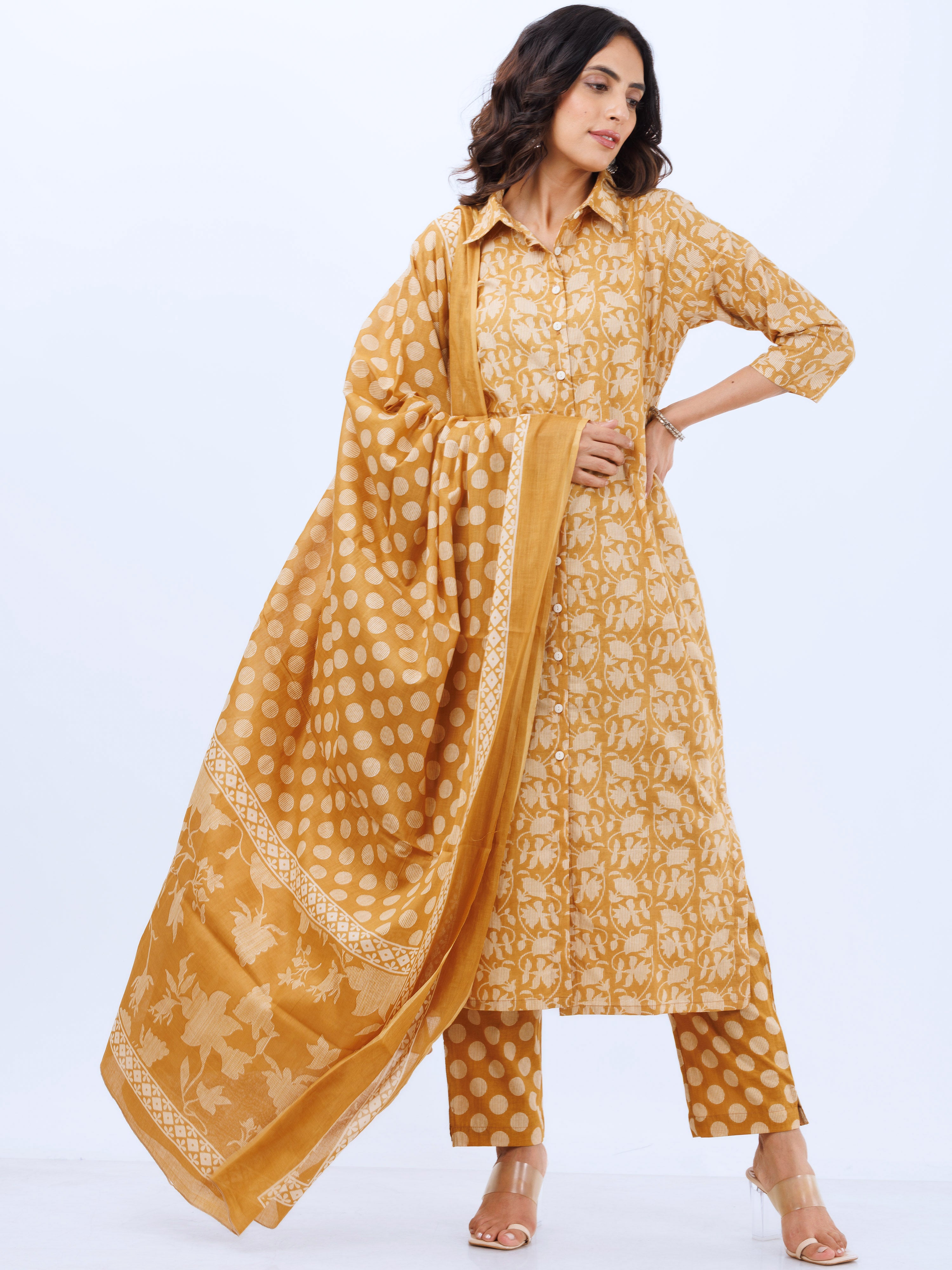 Product: This set contains Hand Block Printed Premium Cotton Kurta, 100% Cotton Pants and Cotton Dupatta.
