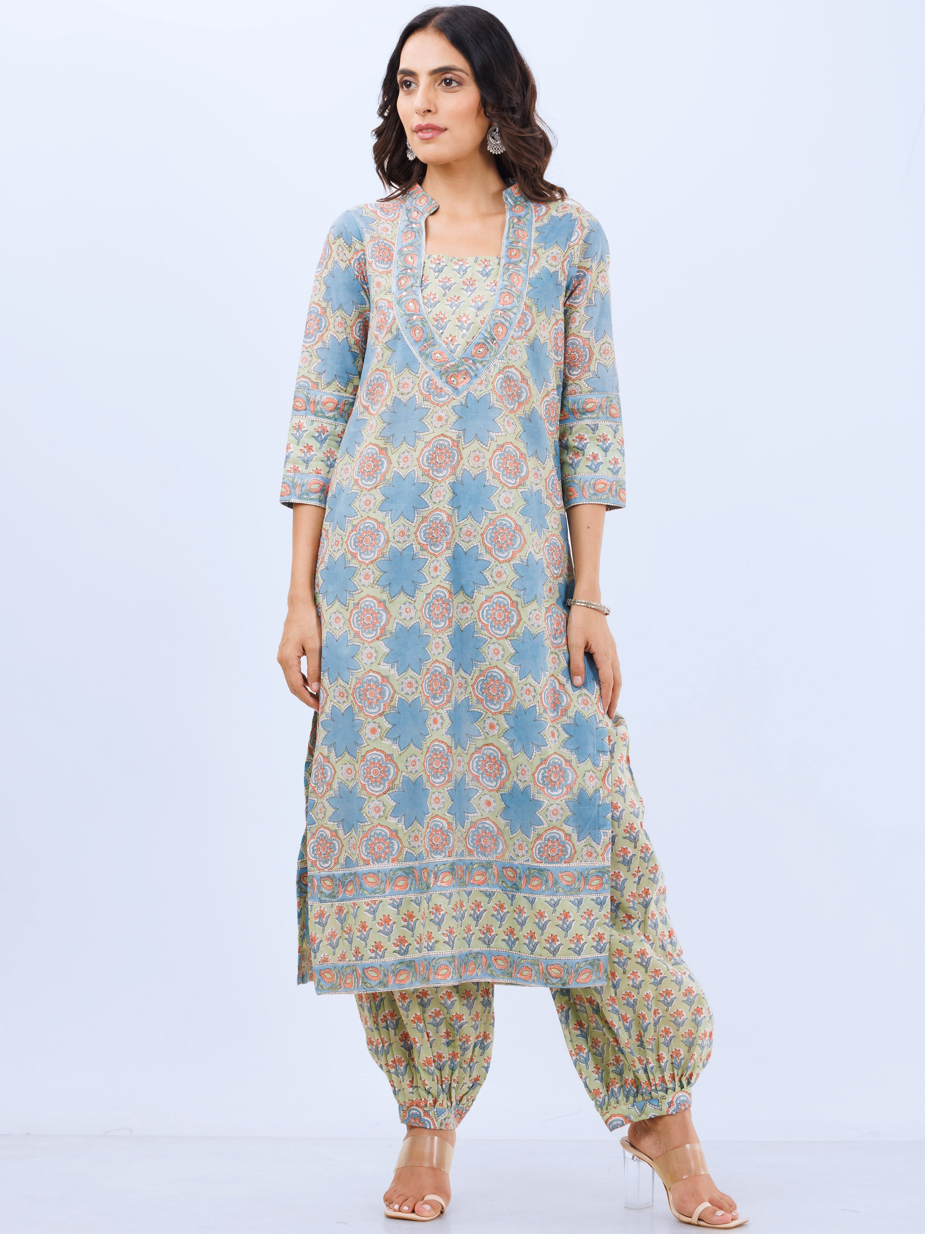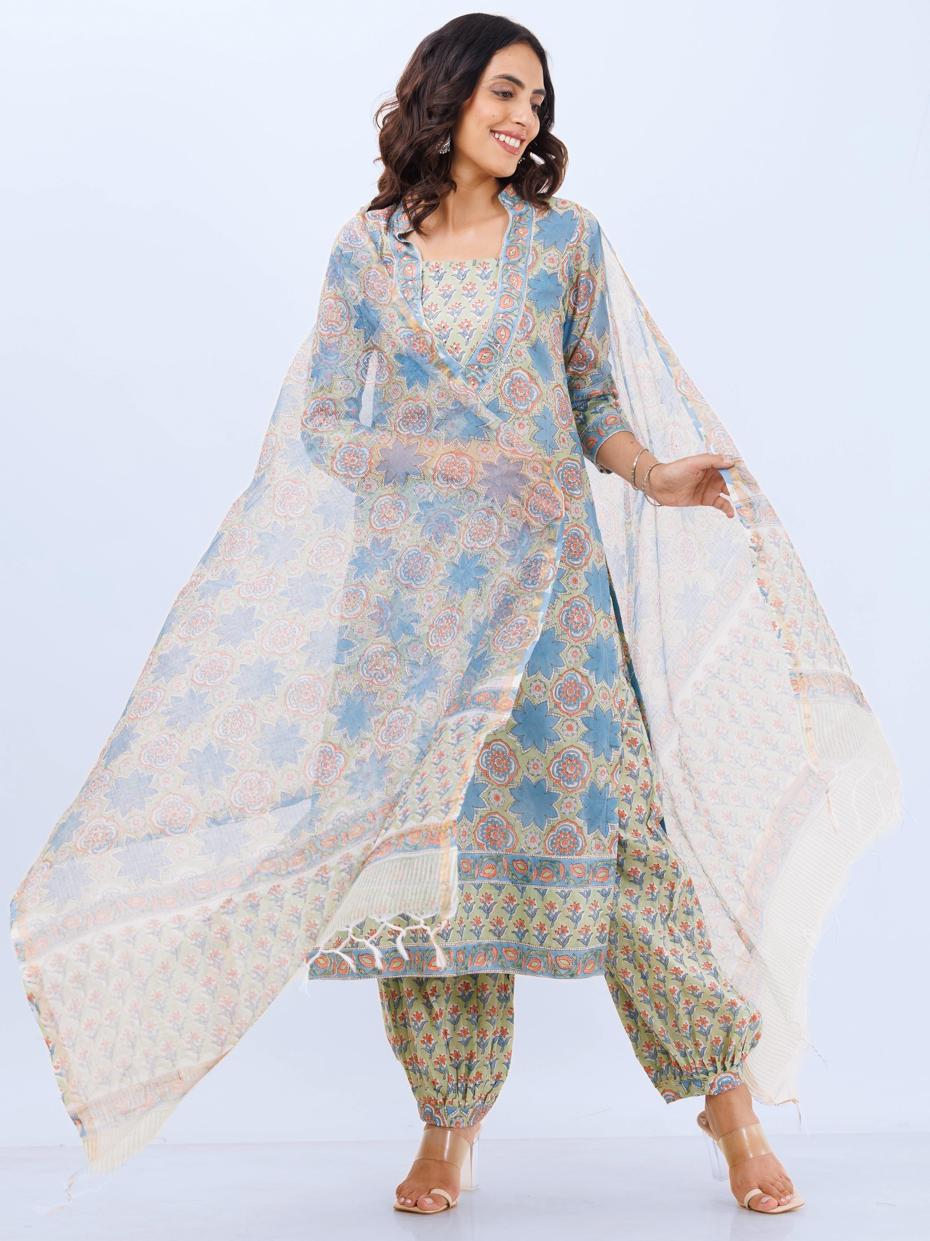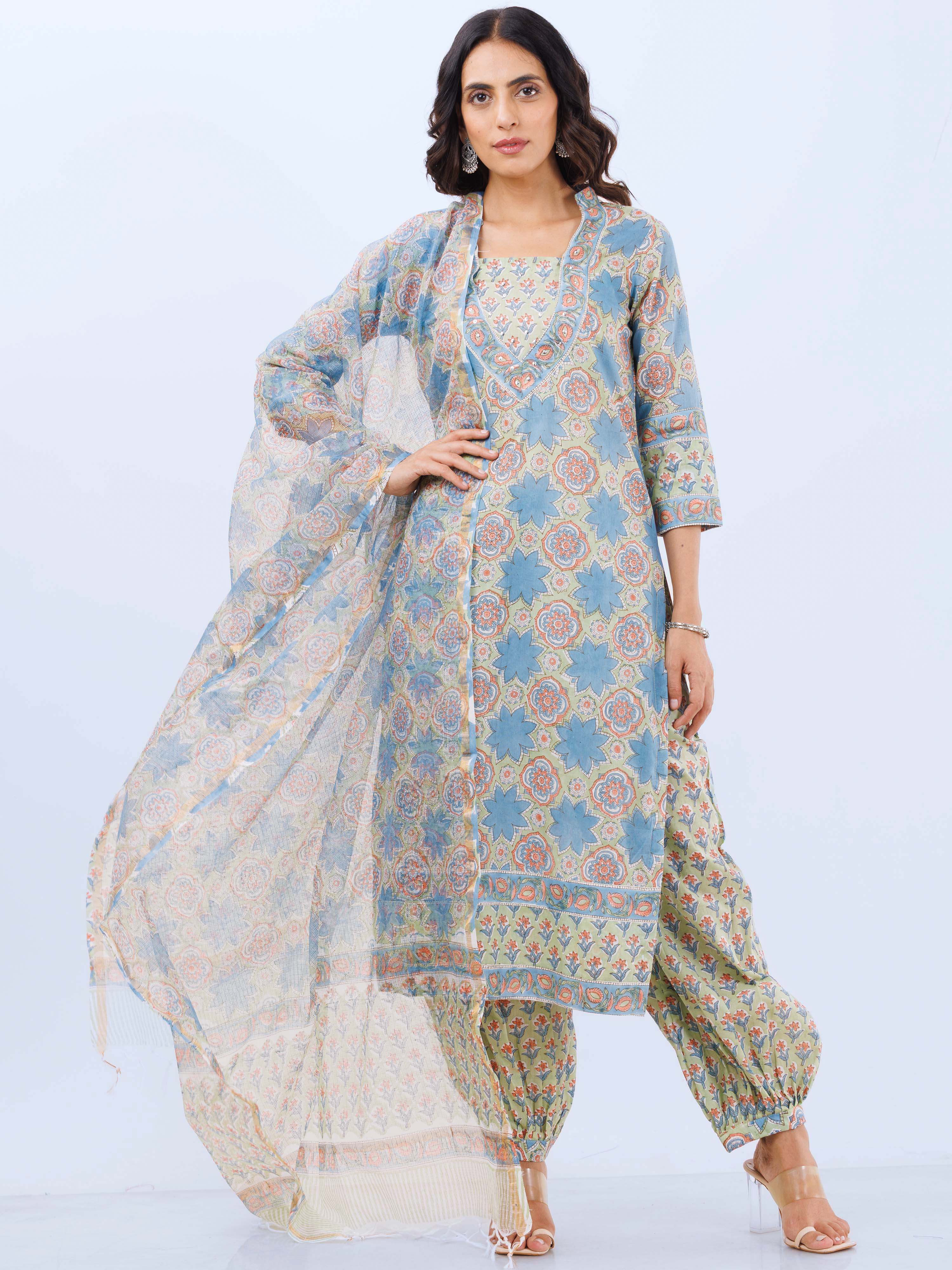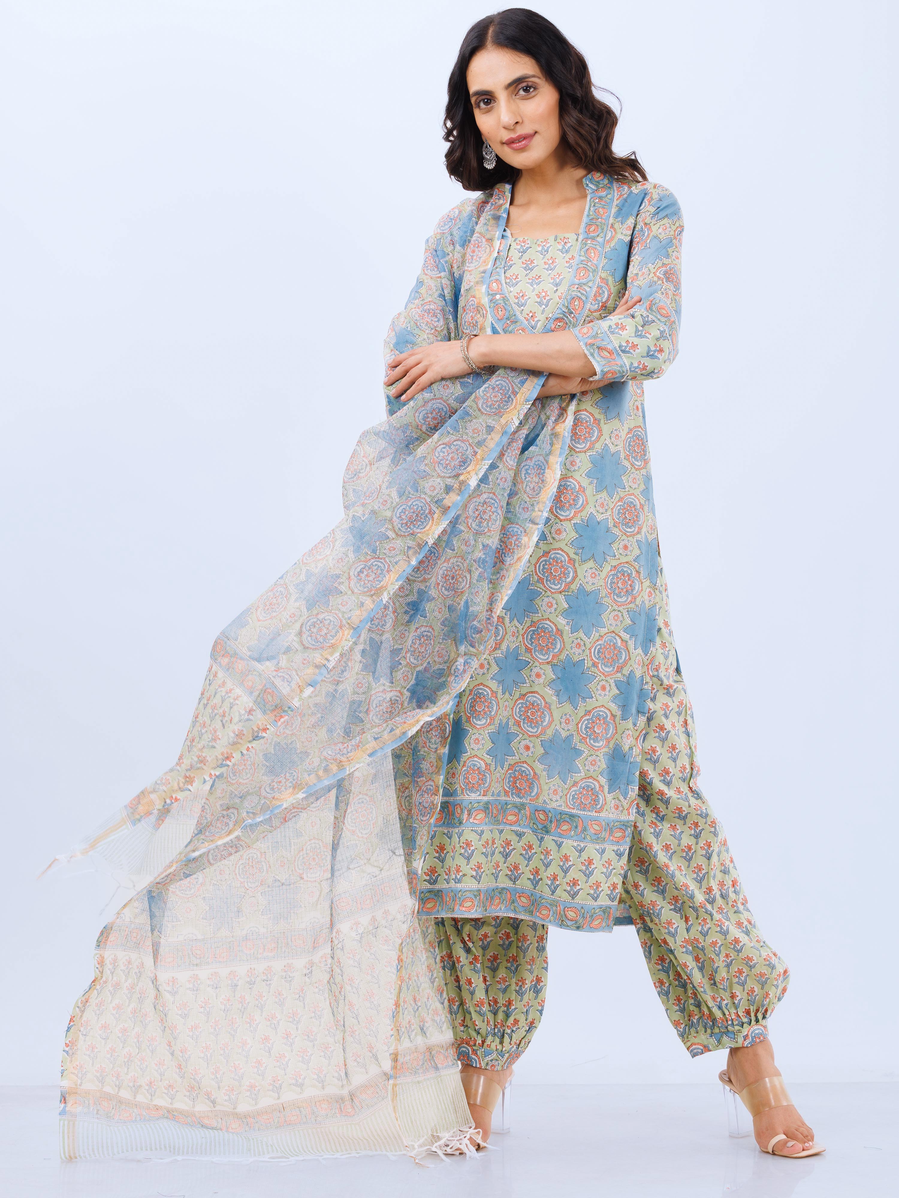 Fabric : Hand Block Printed. Kurta - Cotton . Pants - Cotton, Dupatta - Kota Doria