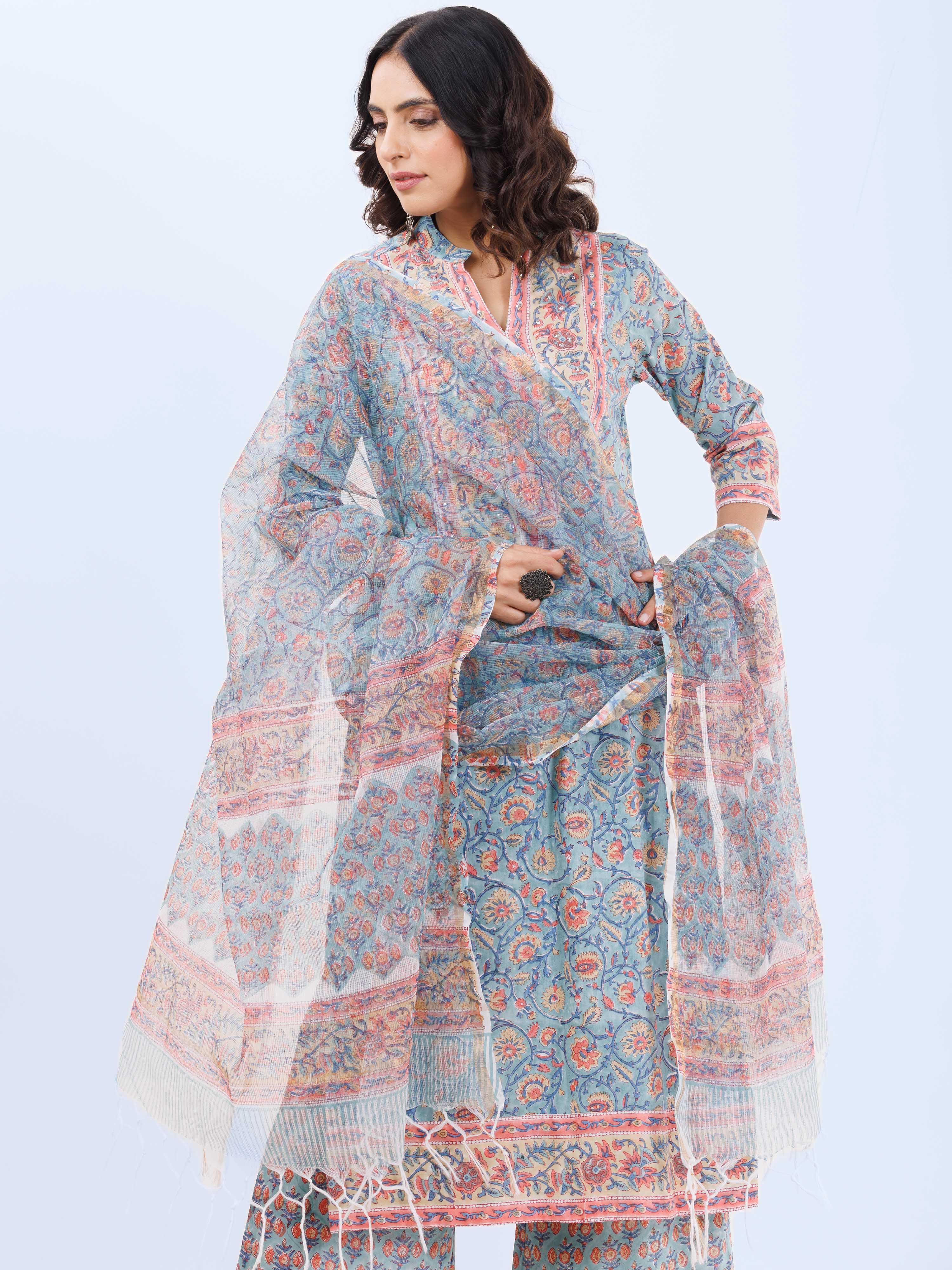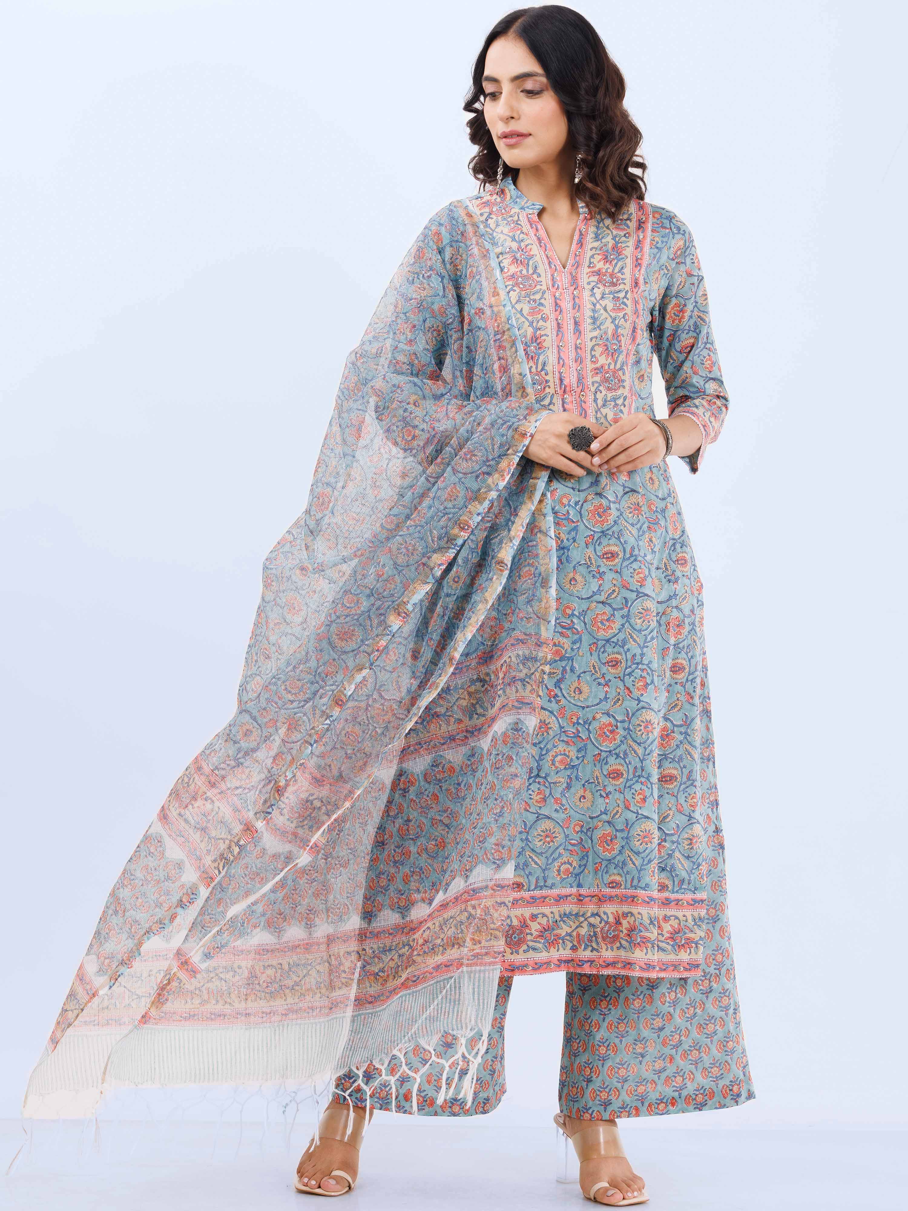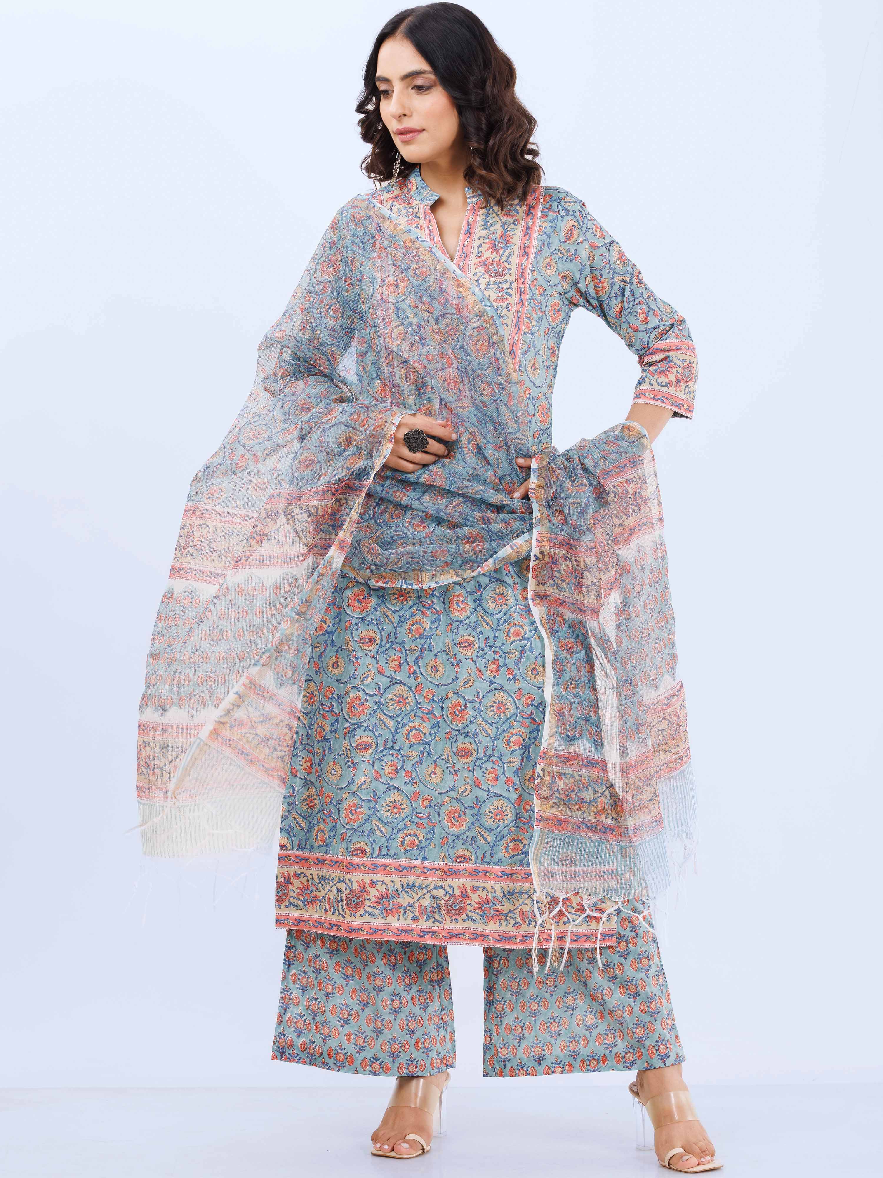 Fabric : Hand Block Printed. Kurta - Cotton . Pants - Cotton, Dupatta - Kota Doria