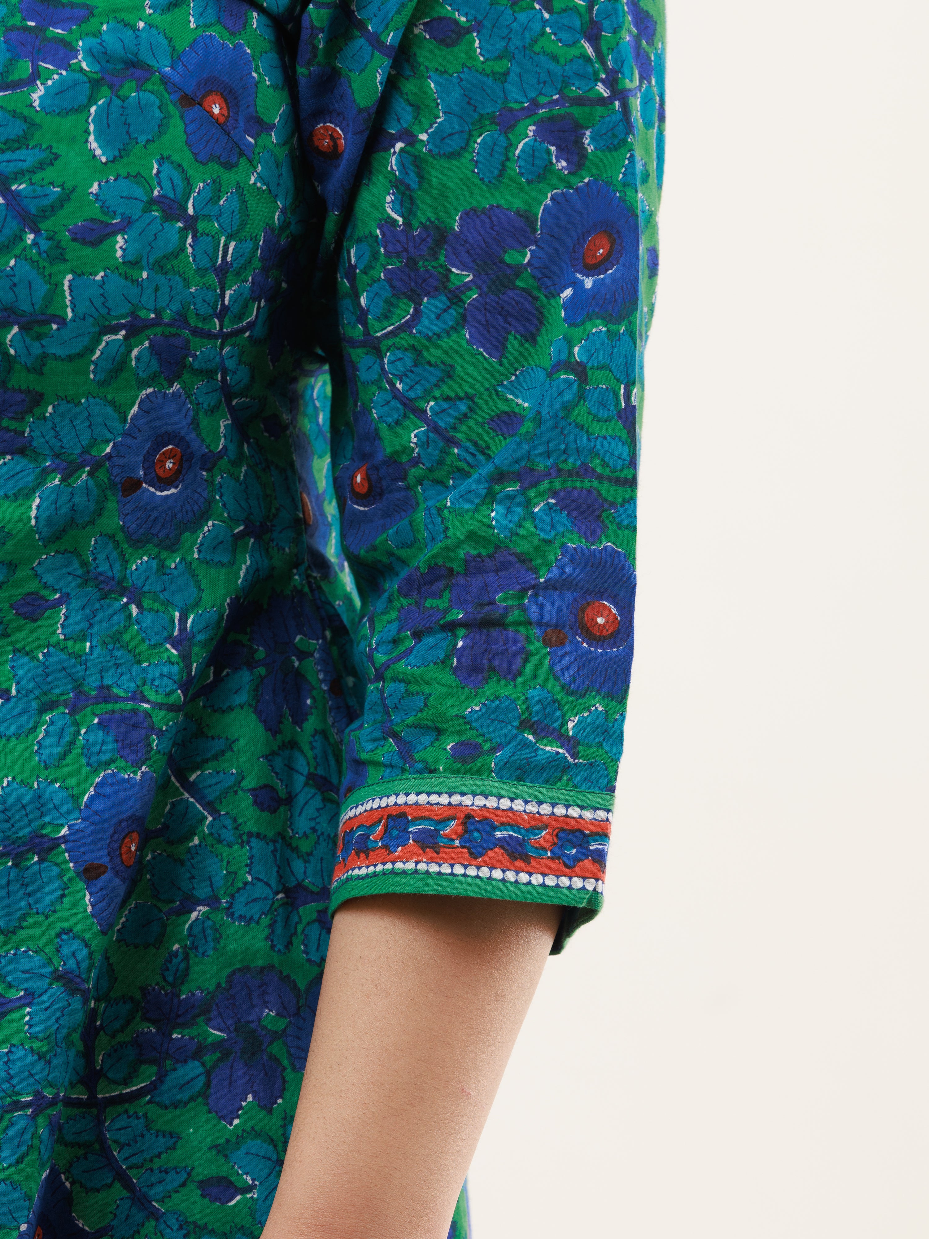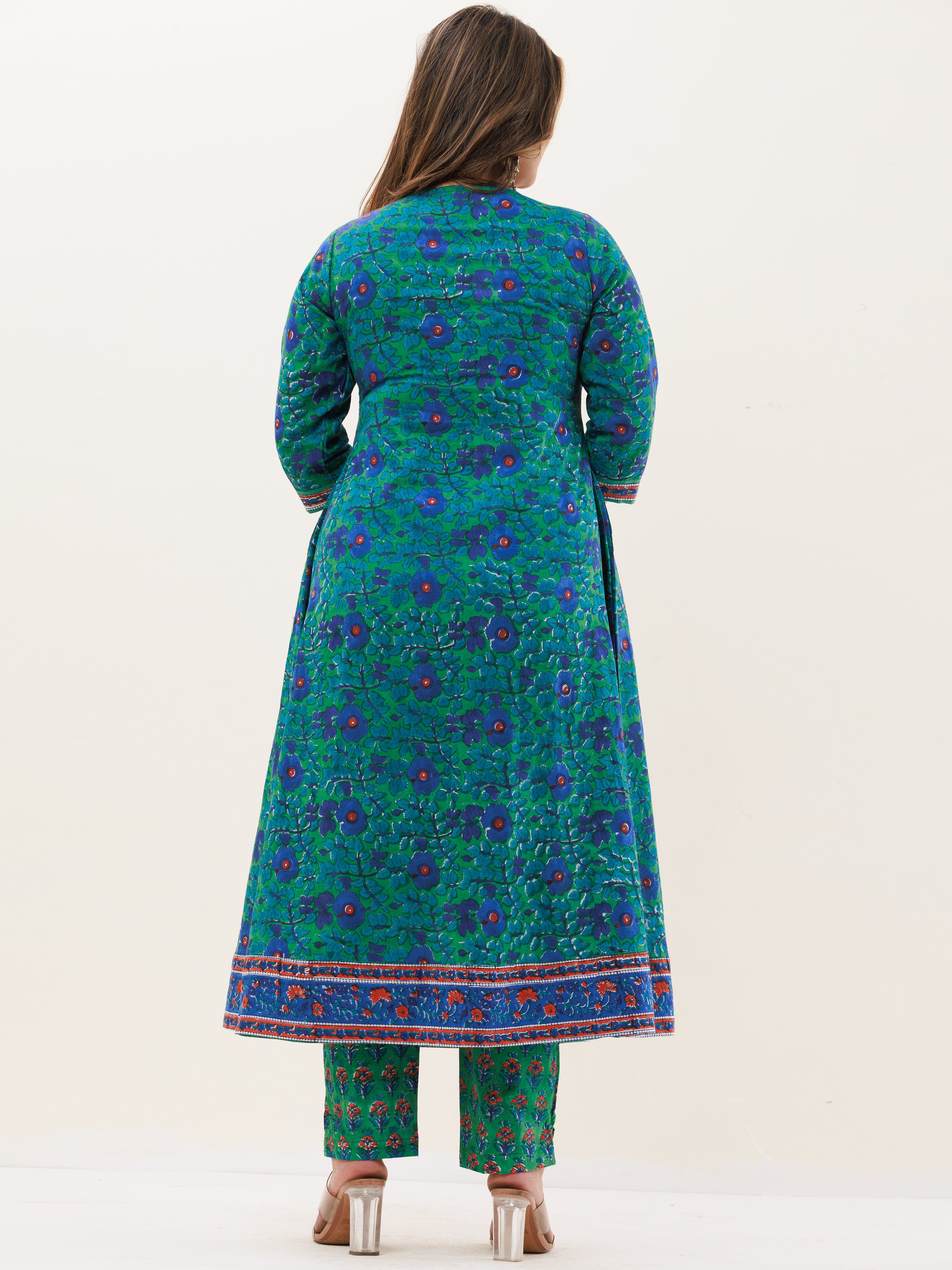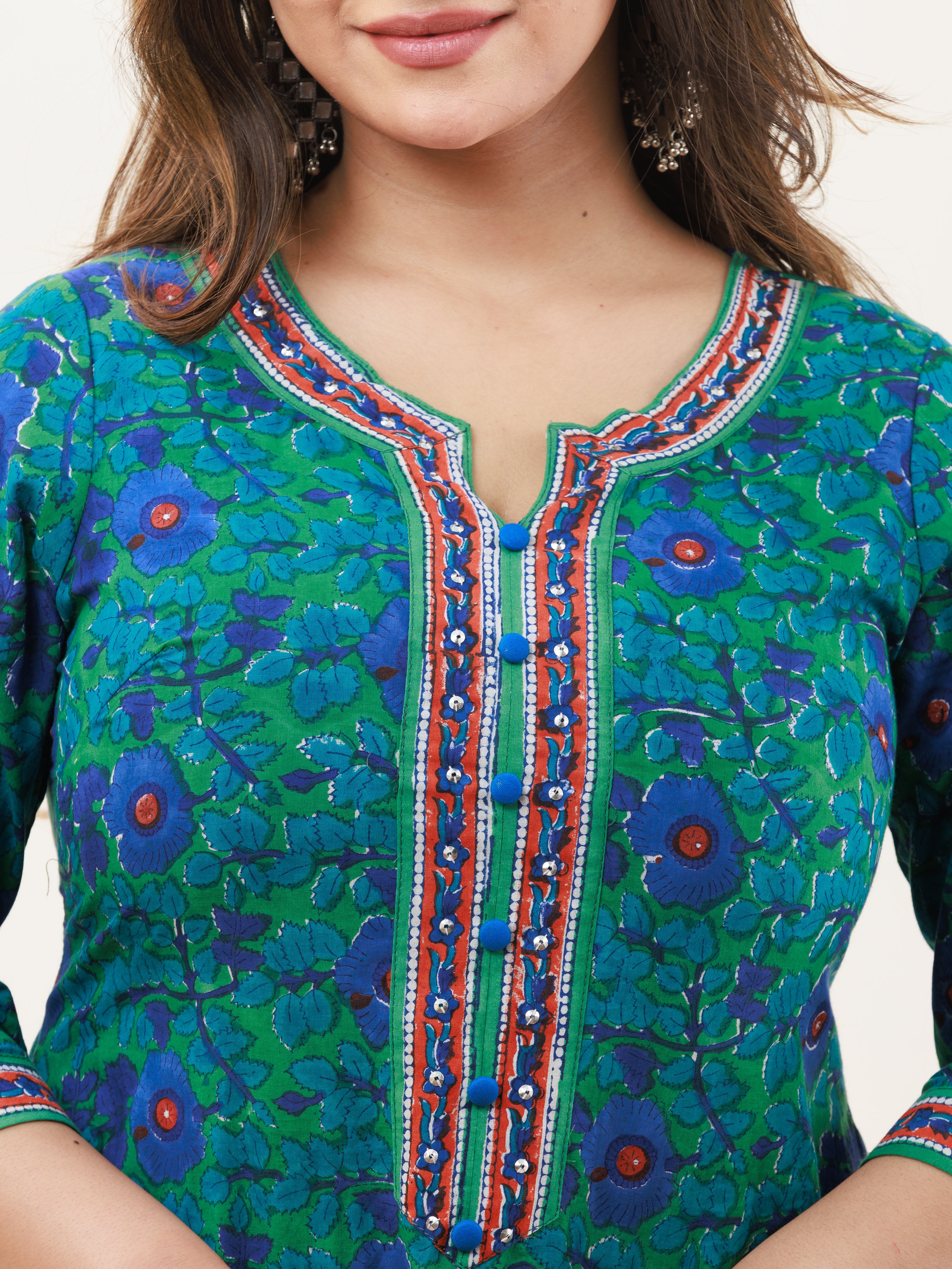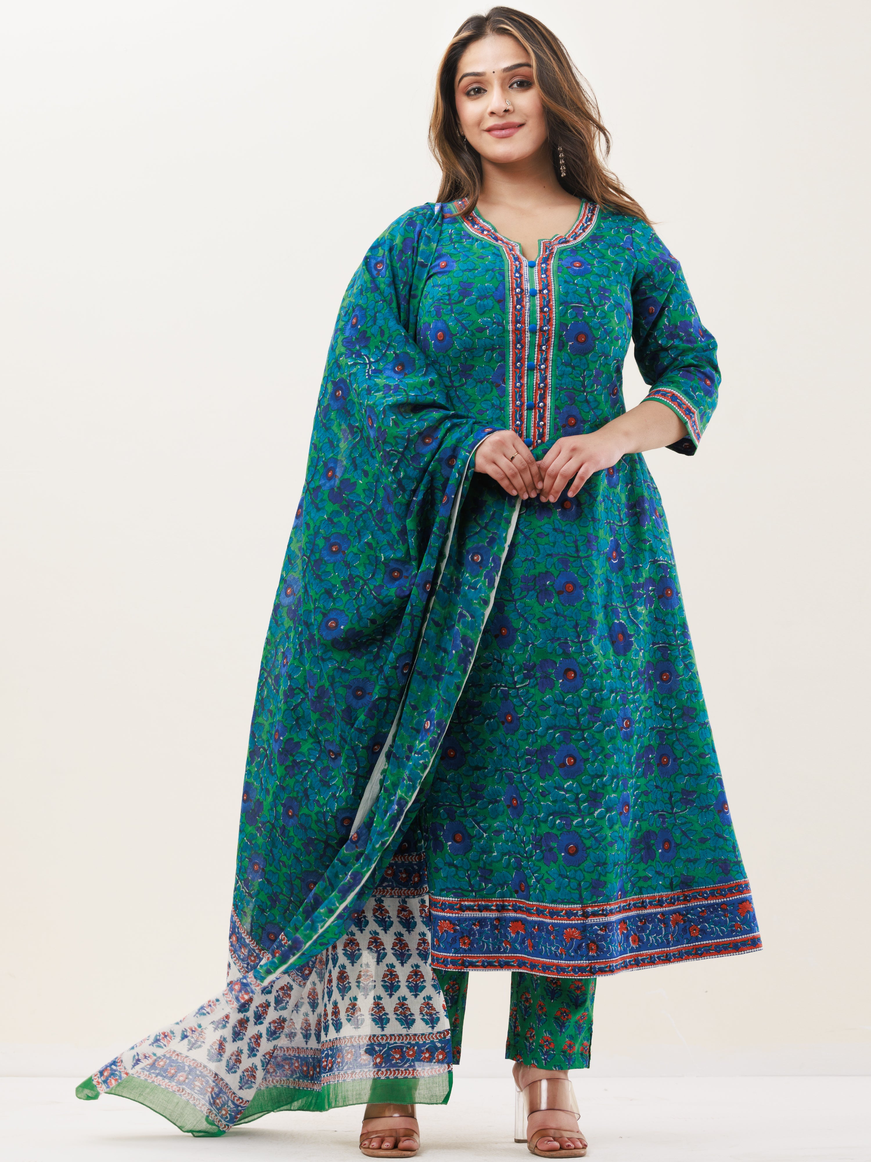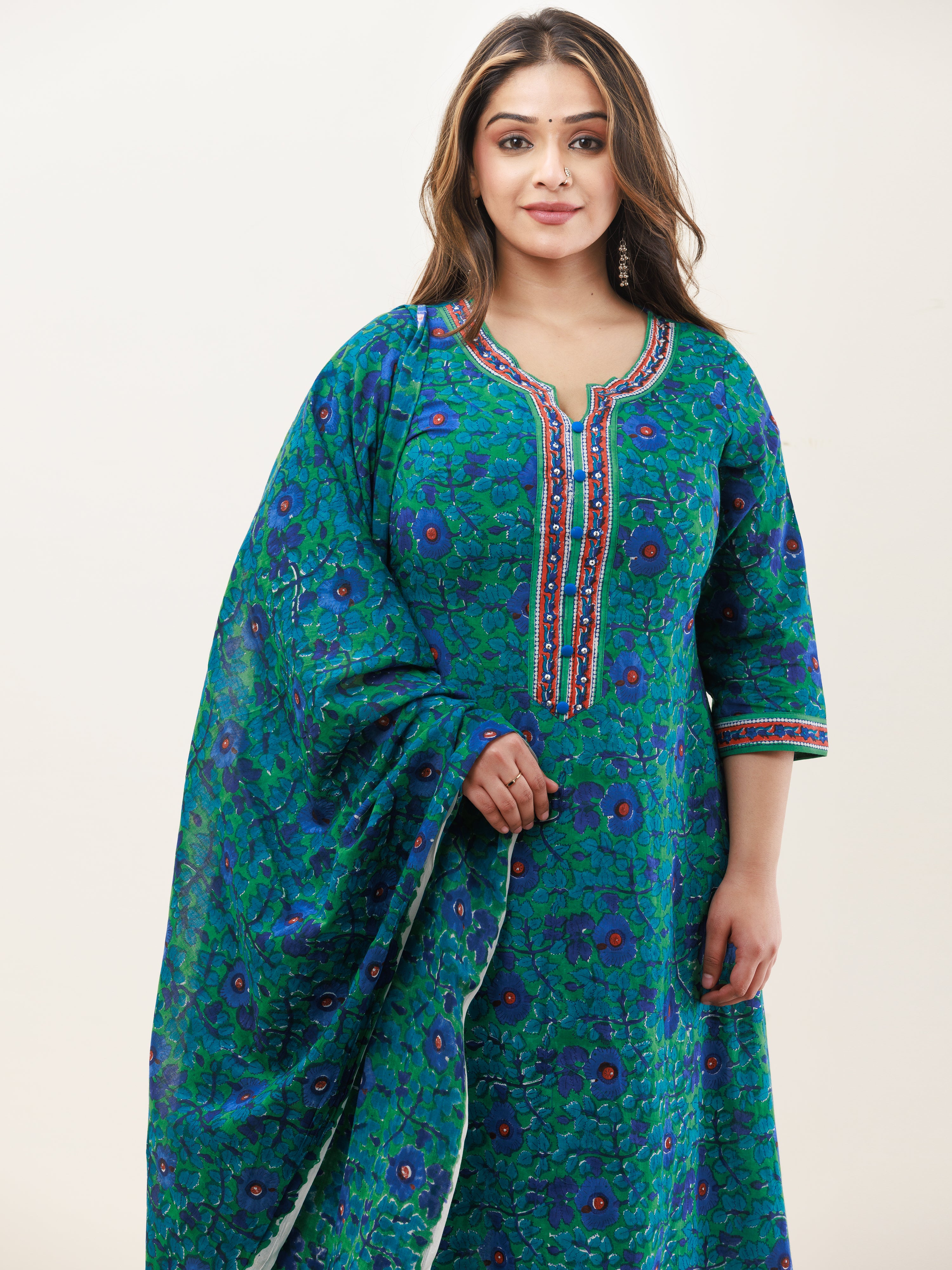 Product: This set contains Handcrafted Sanganeri Premium Cotton A Line Kurta, 100% Cotton Pants and Cotton Mul Mul Dupatta.