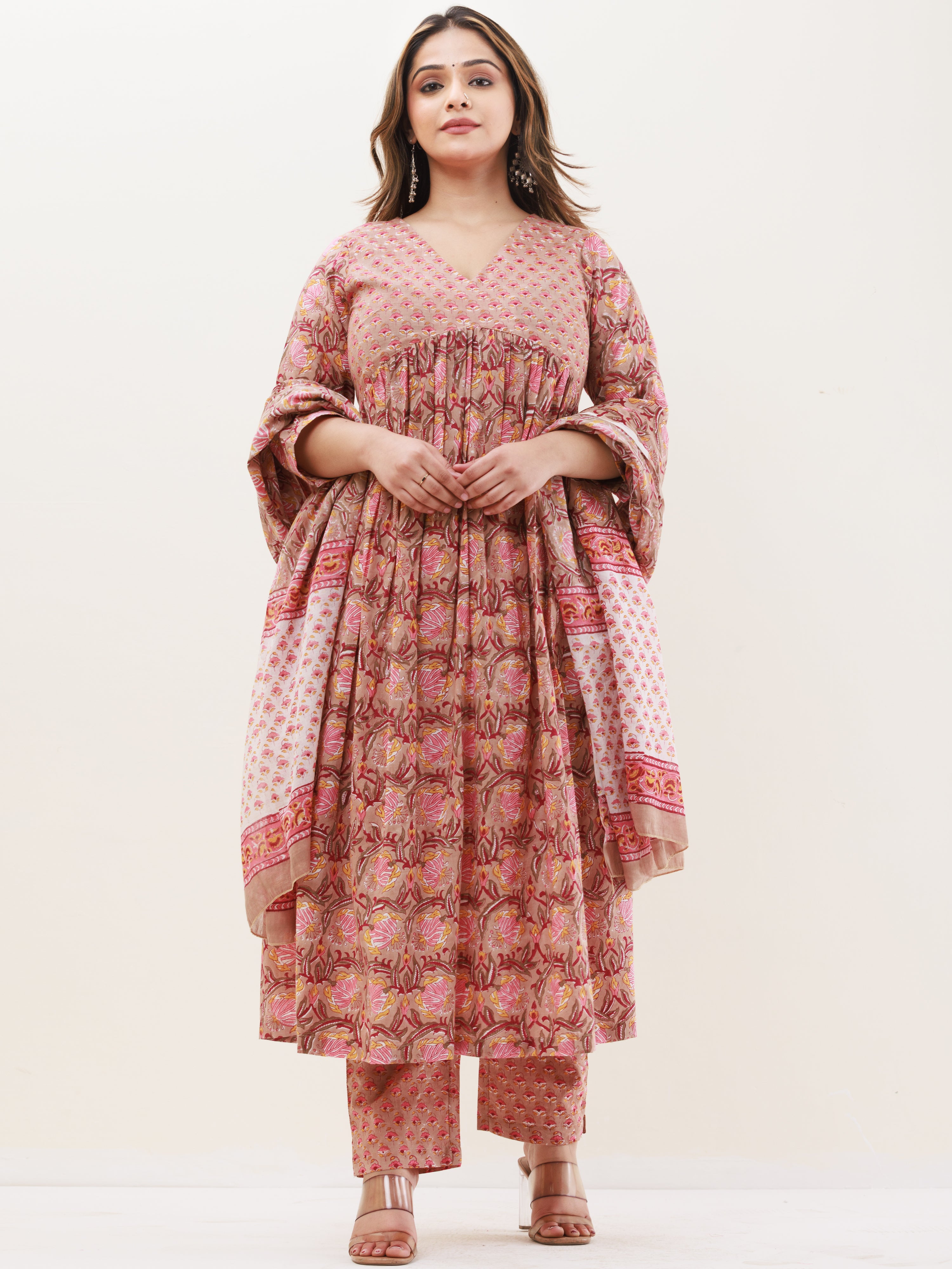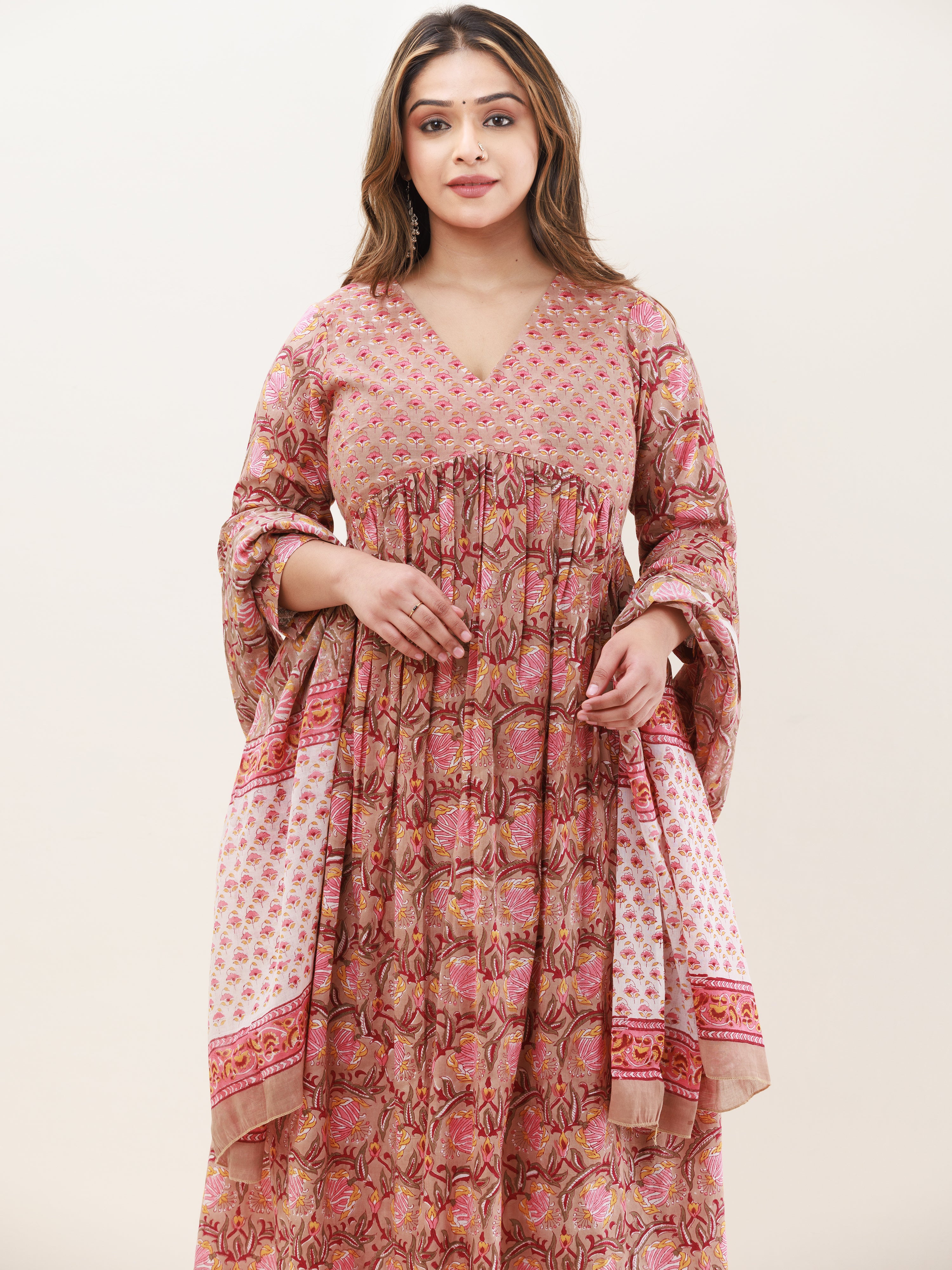 Product: This set contains Handcrafted Sanganeri Premium Cotton Anarkali Kurta, 100% Cotton Pants and Cotton Mul Mul Dupatta.