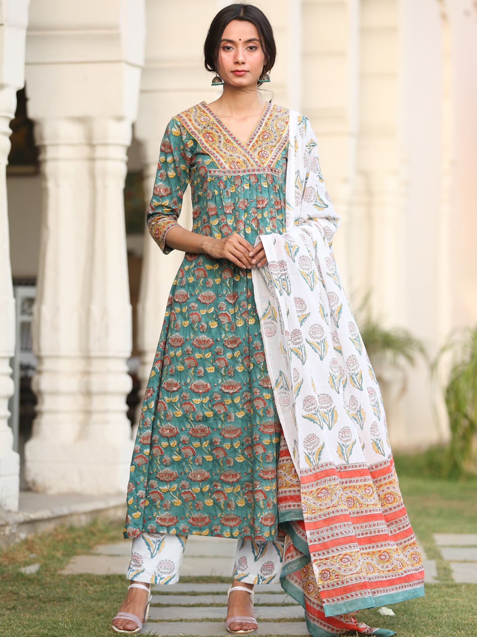 Product: This set contains Handcrafted Sanganeri Premium Cotton Kurta, 100% Cotton Pants and Cotton Dupatta.