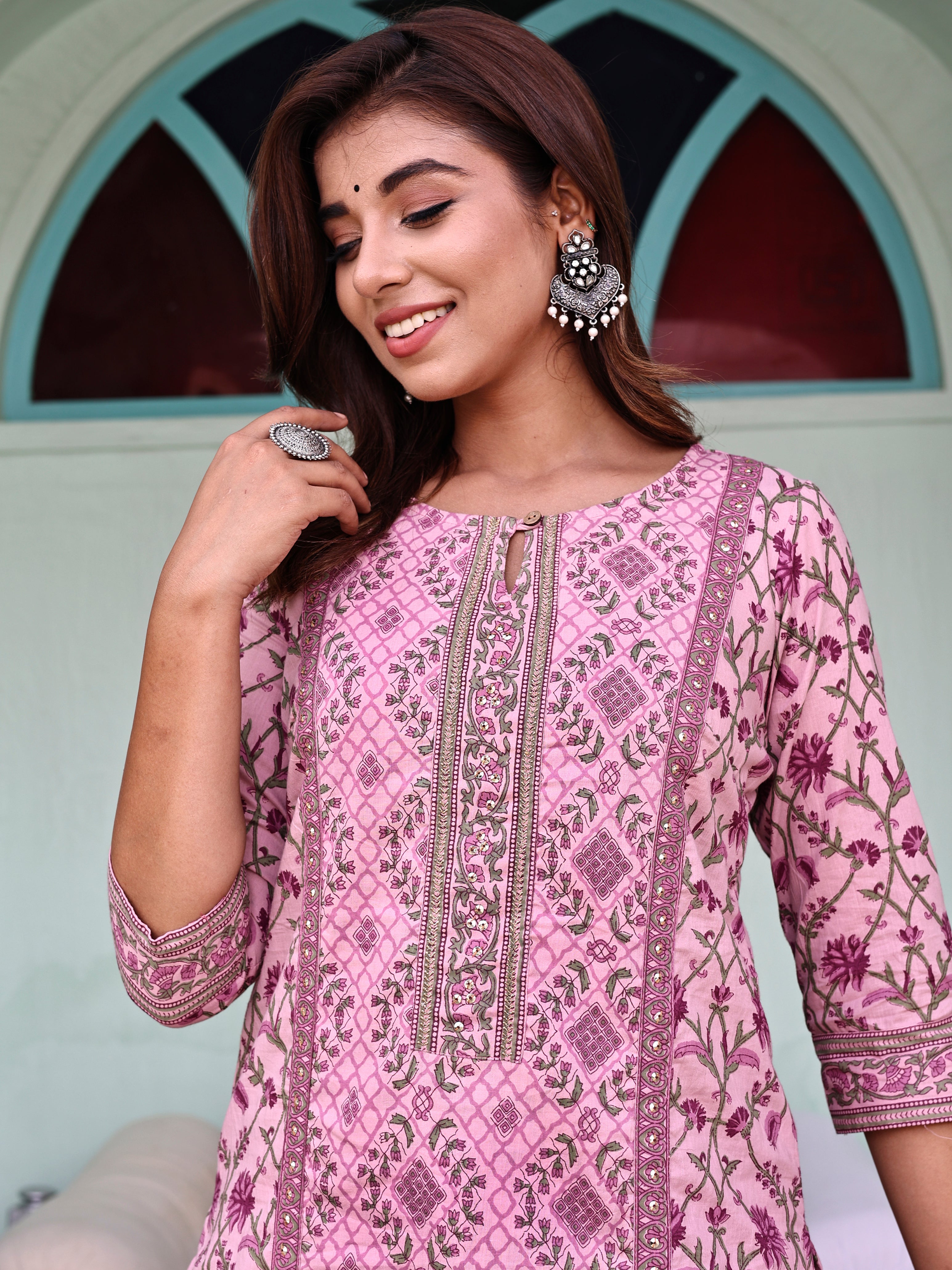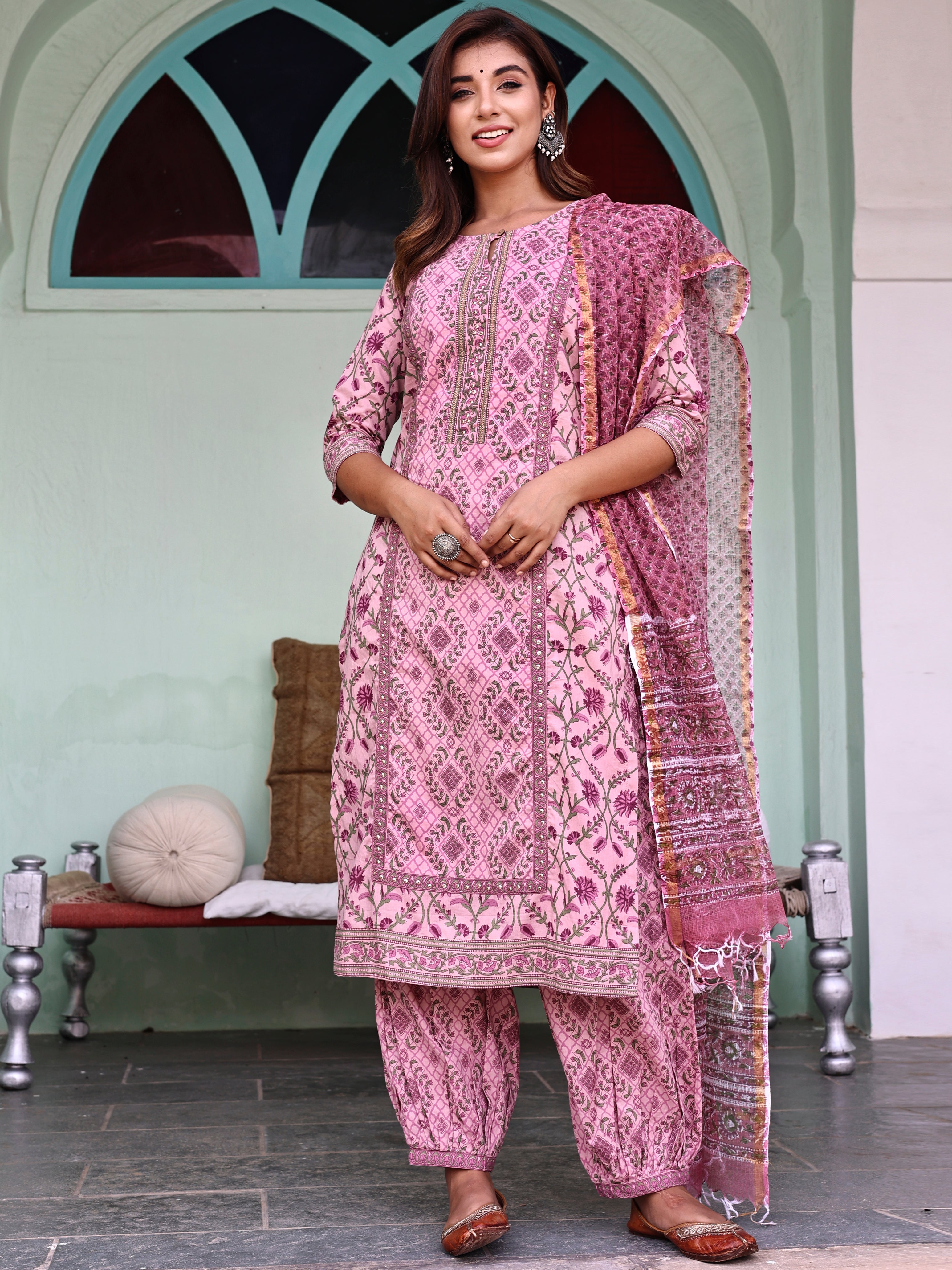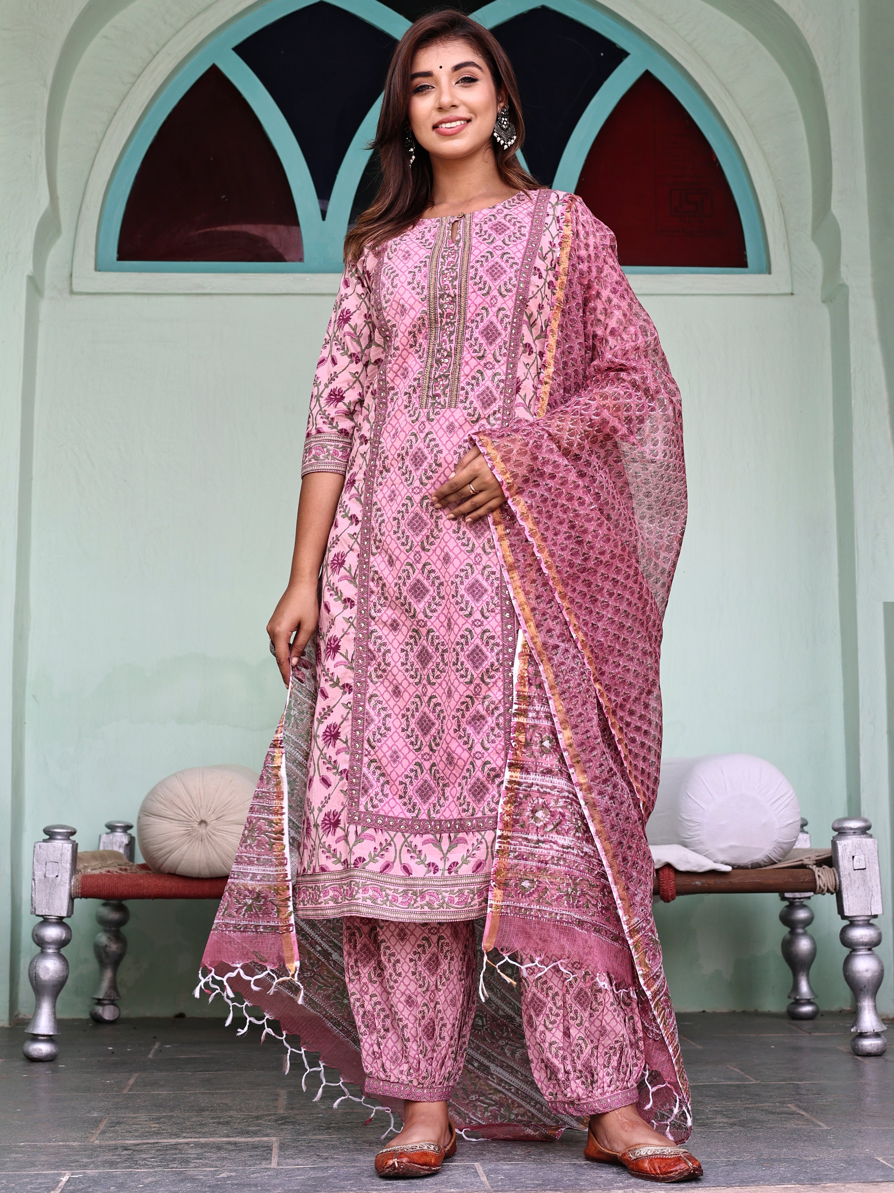 Product: This set contains Handcrafted Sanganeri Premium Cotton Kurta, 100% Cotton Pants and Kota Doria Dupatta.