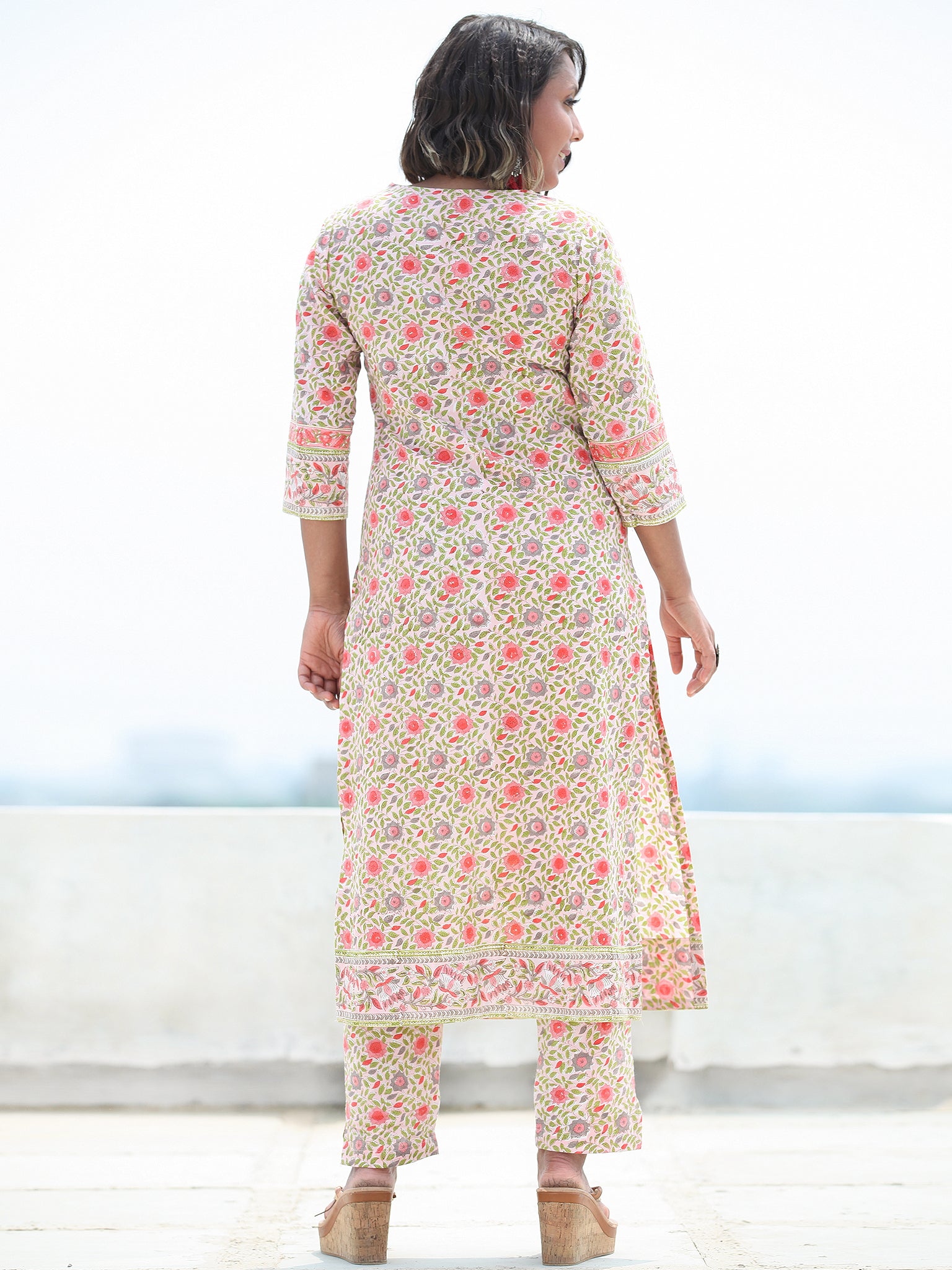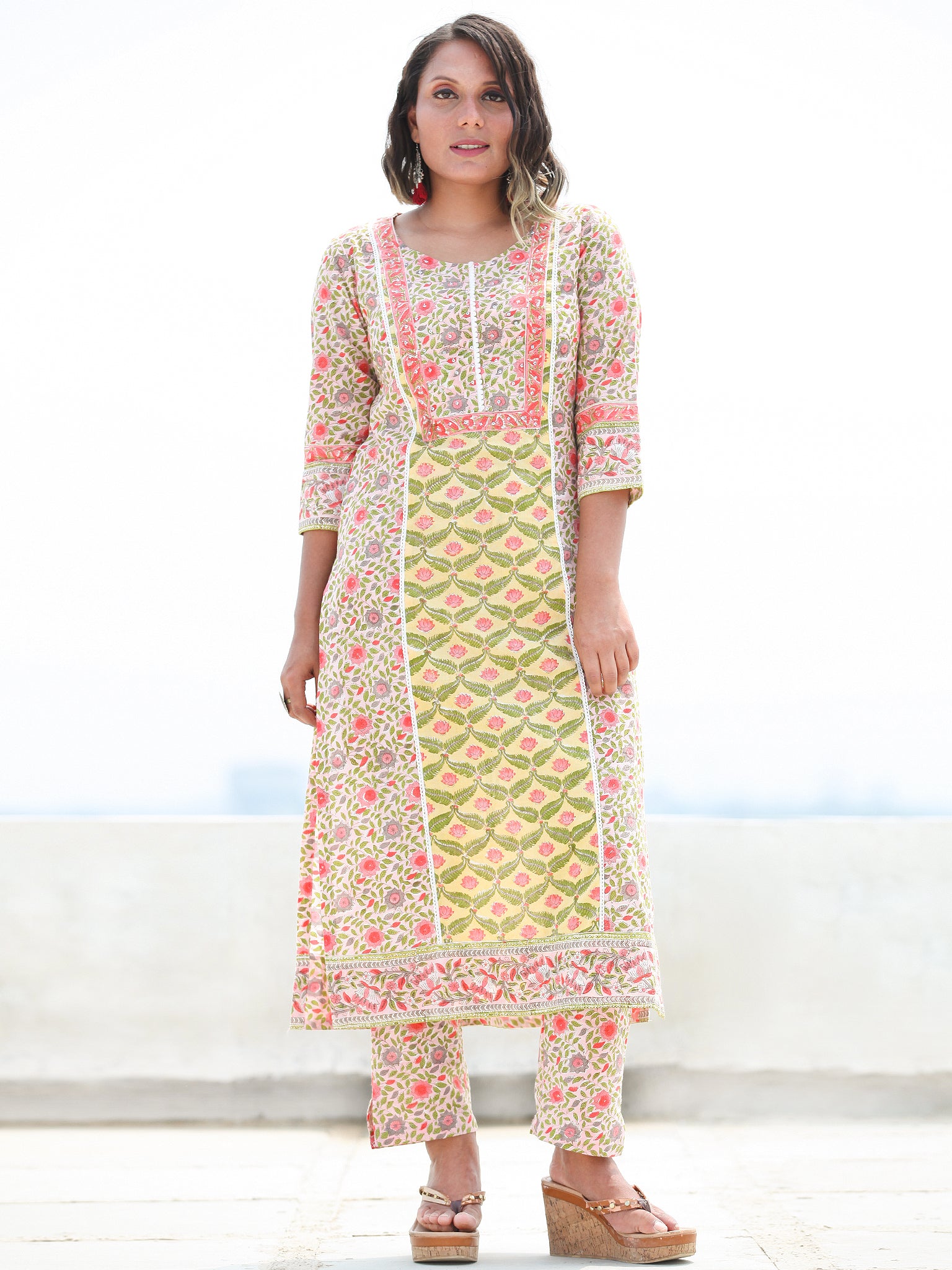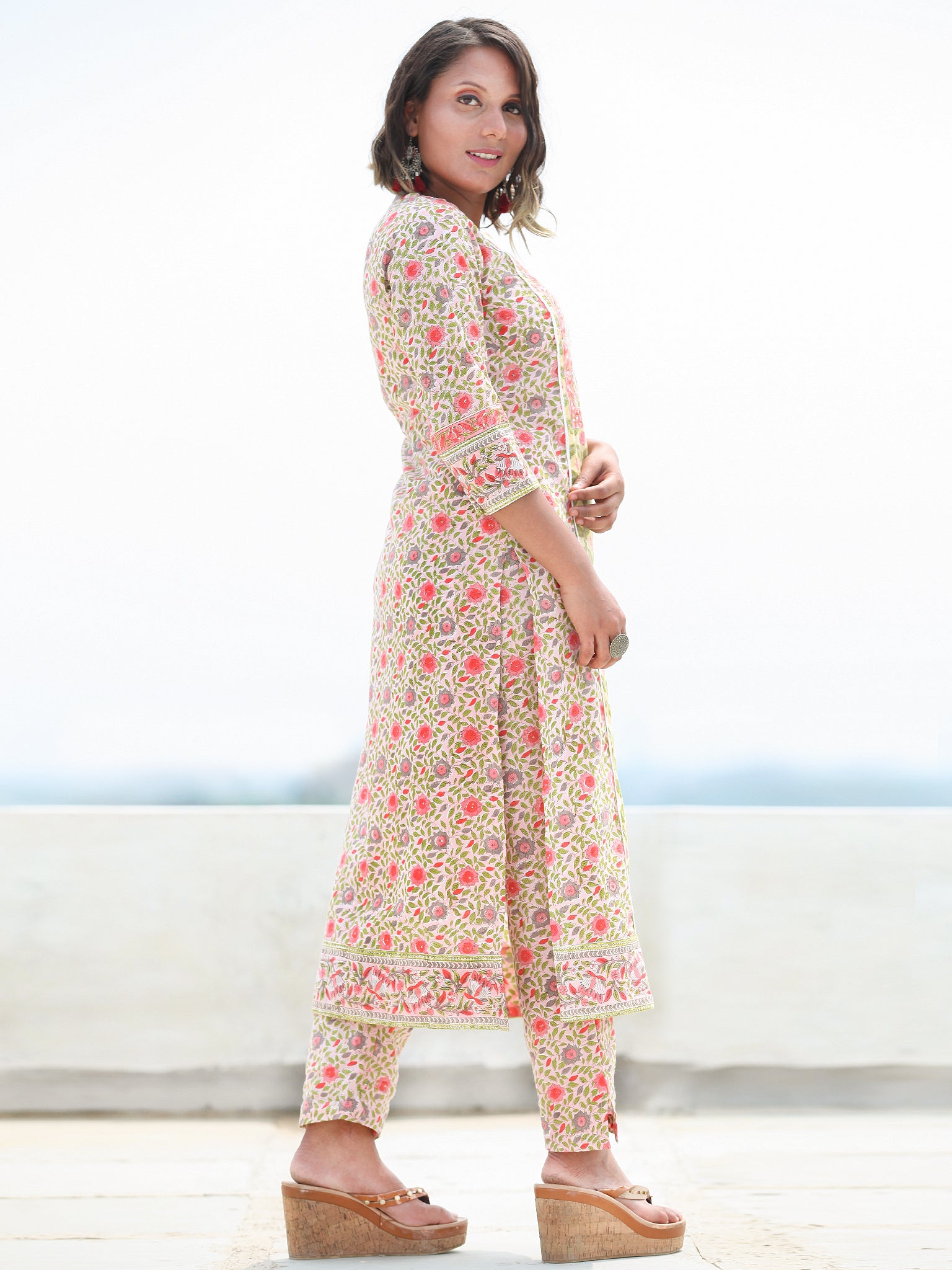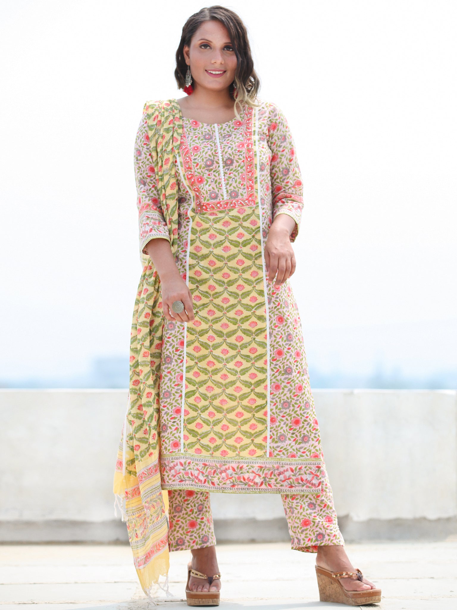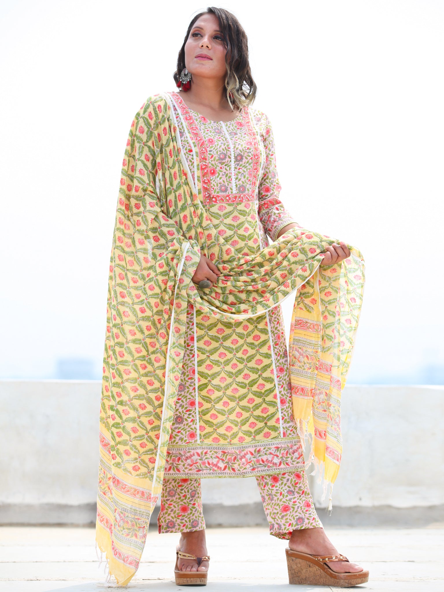 Product: This set contains Handcrafted Sanganeri Premium Cotton Kurta, 100% Cotton Pants and Cotton Dupatta.