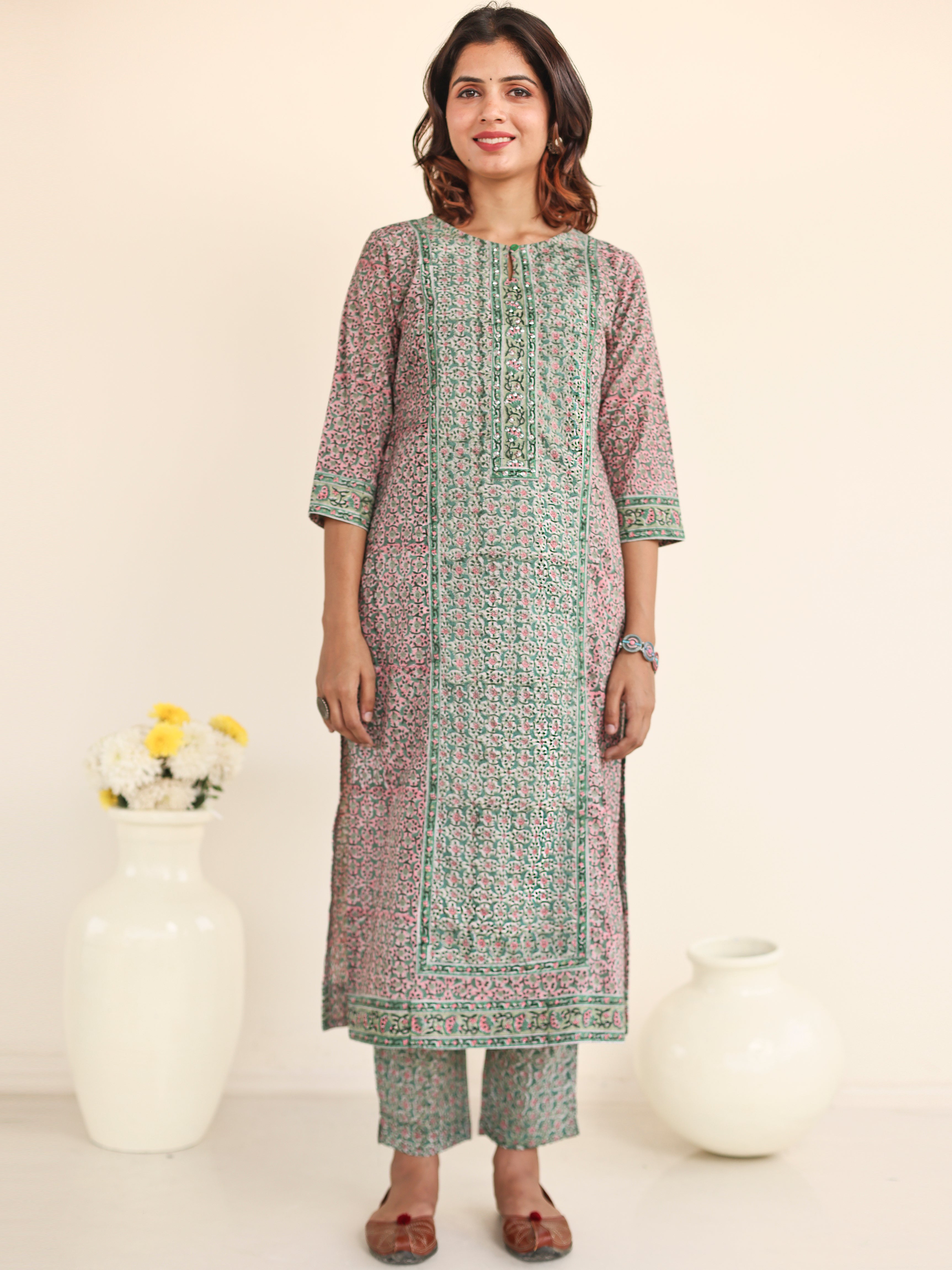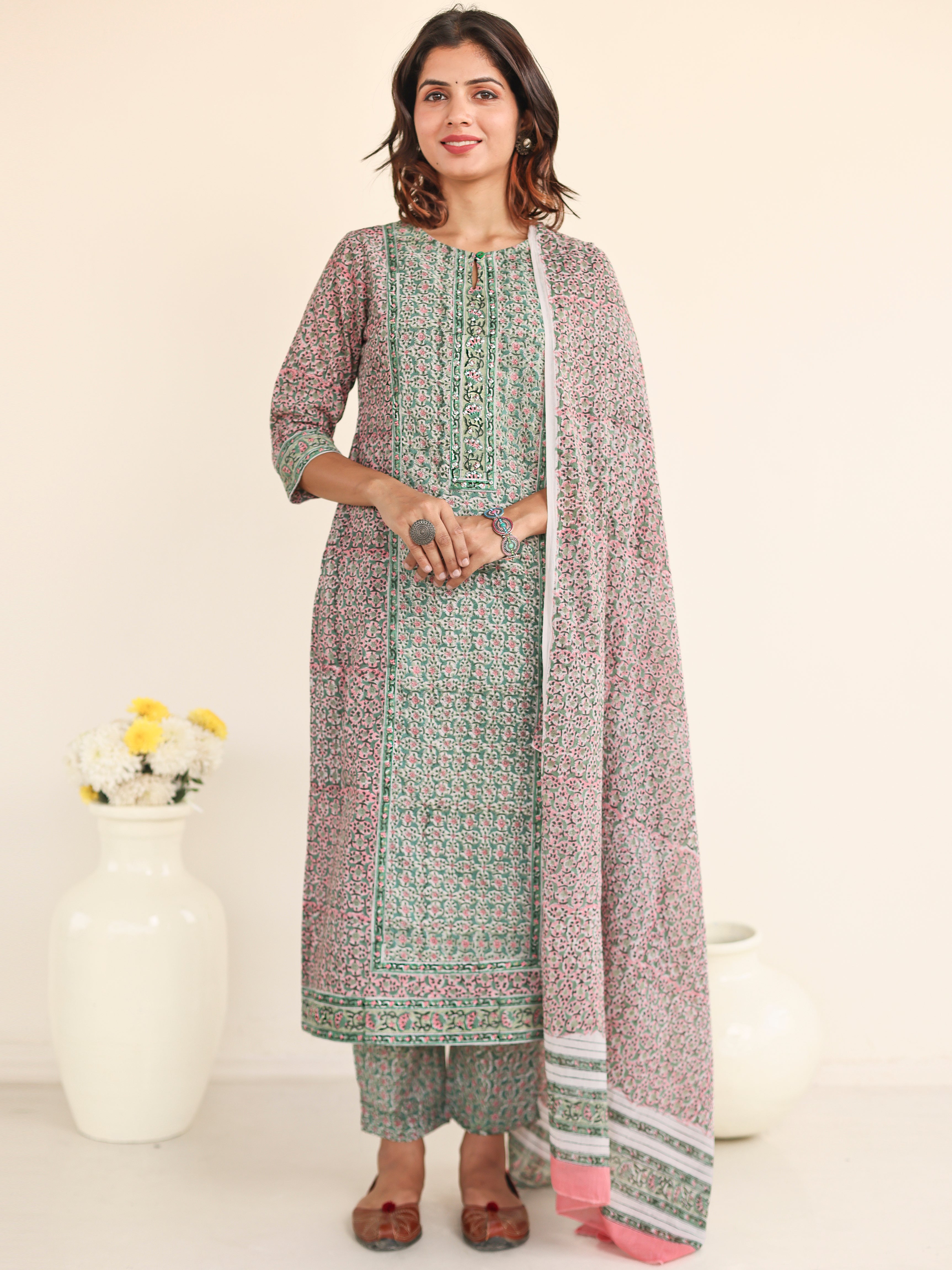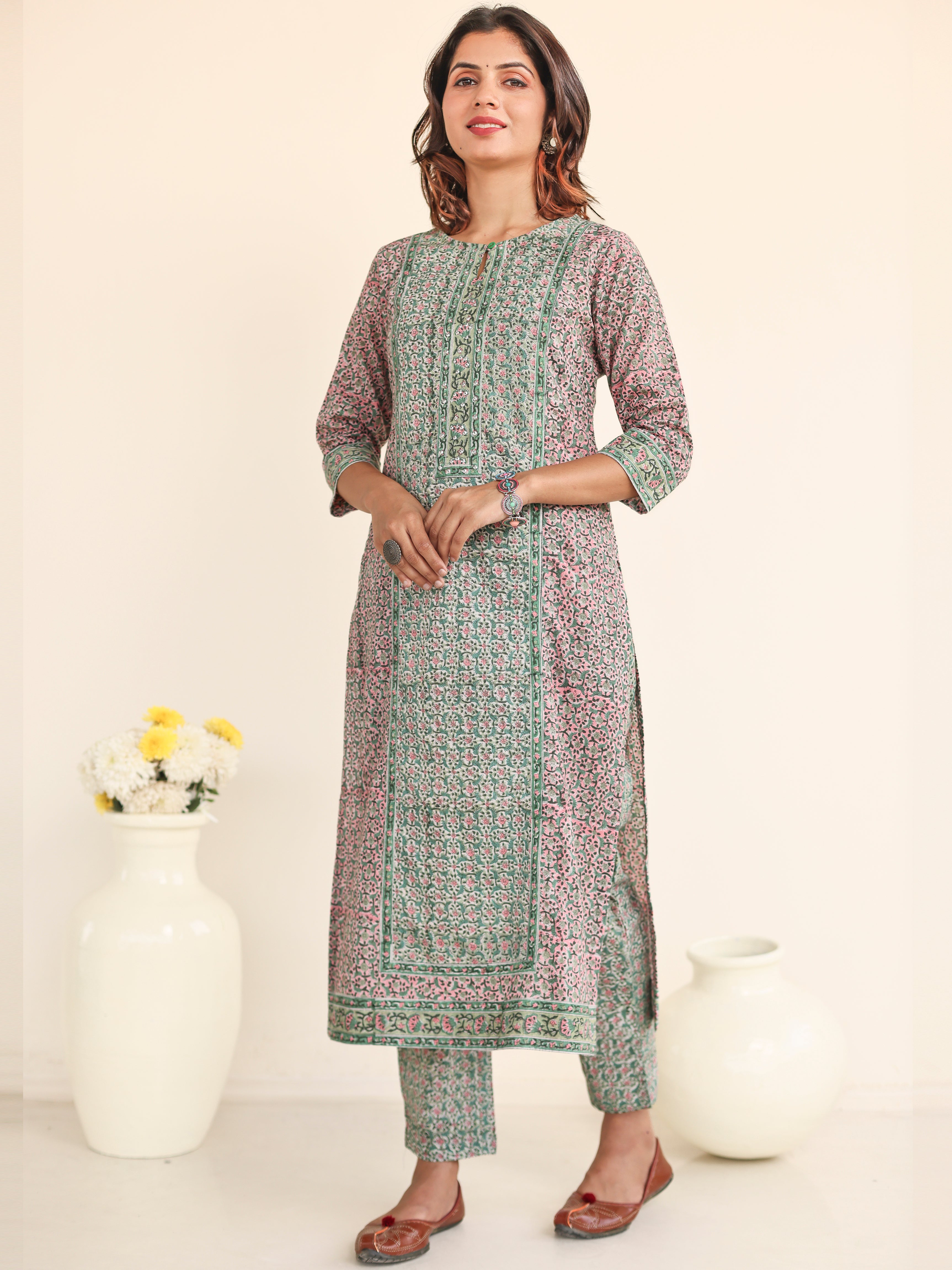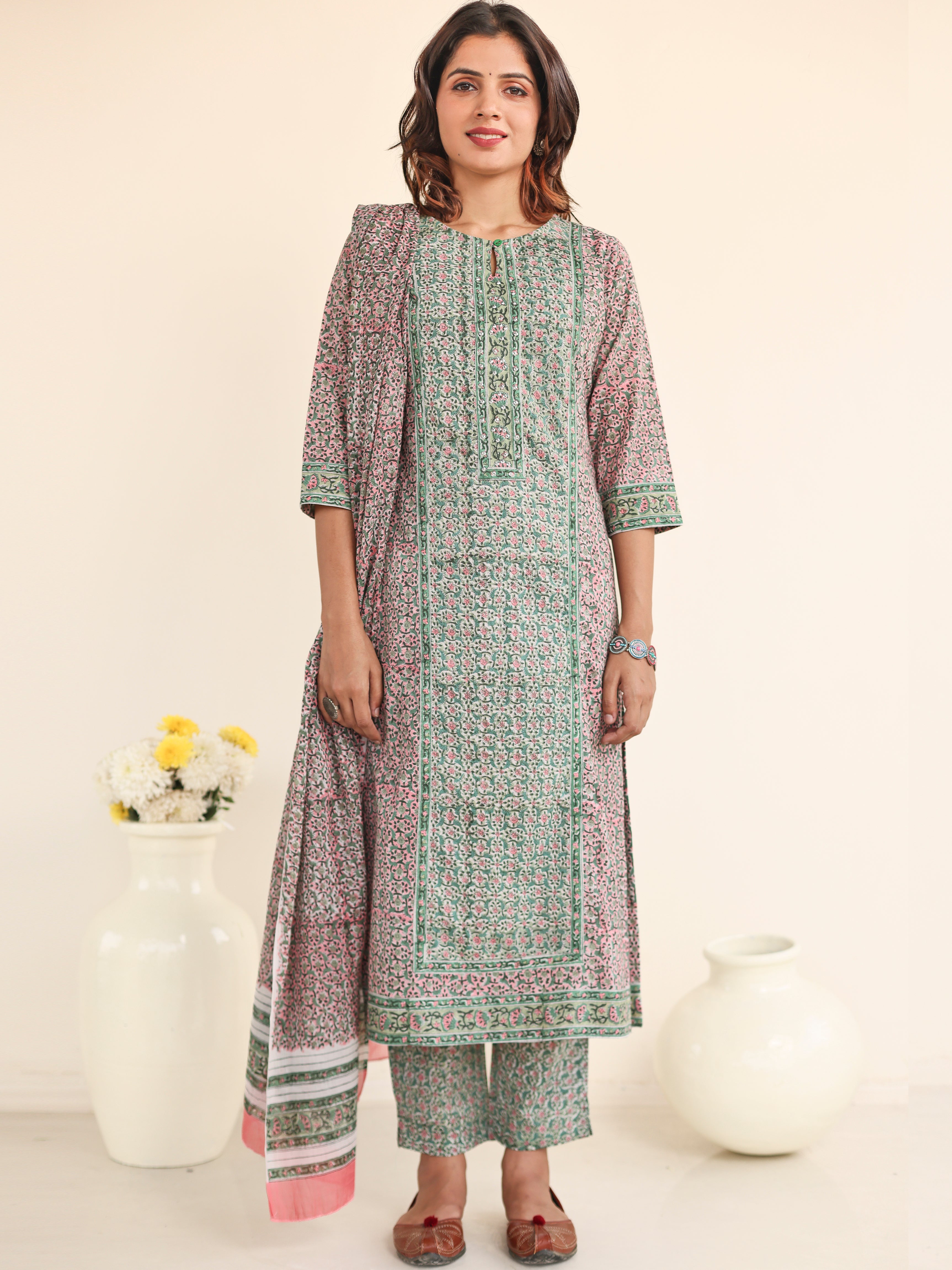 Product: This set contains Handcrafted Sanganeri Premium Cotton Kurta, 100% Cotton Pants and Cotton Dupatta.