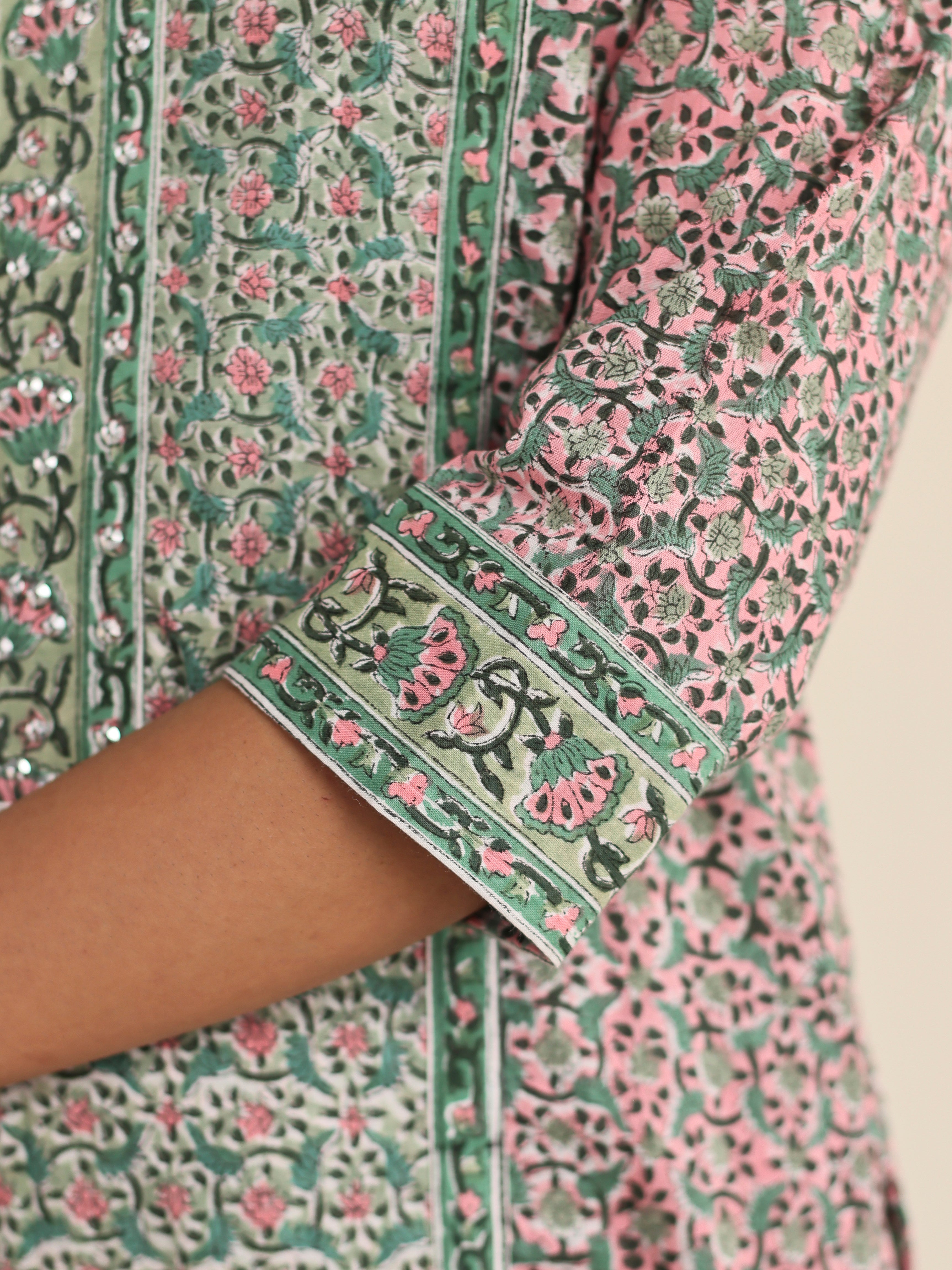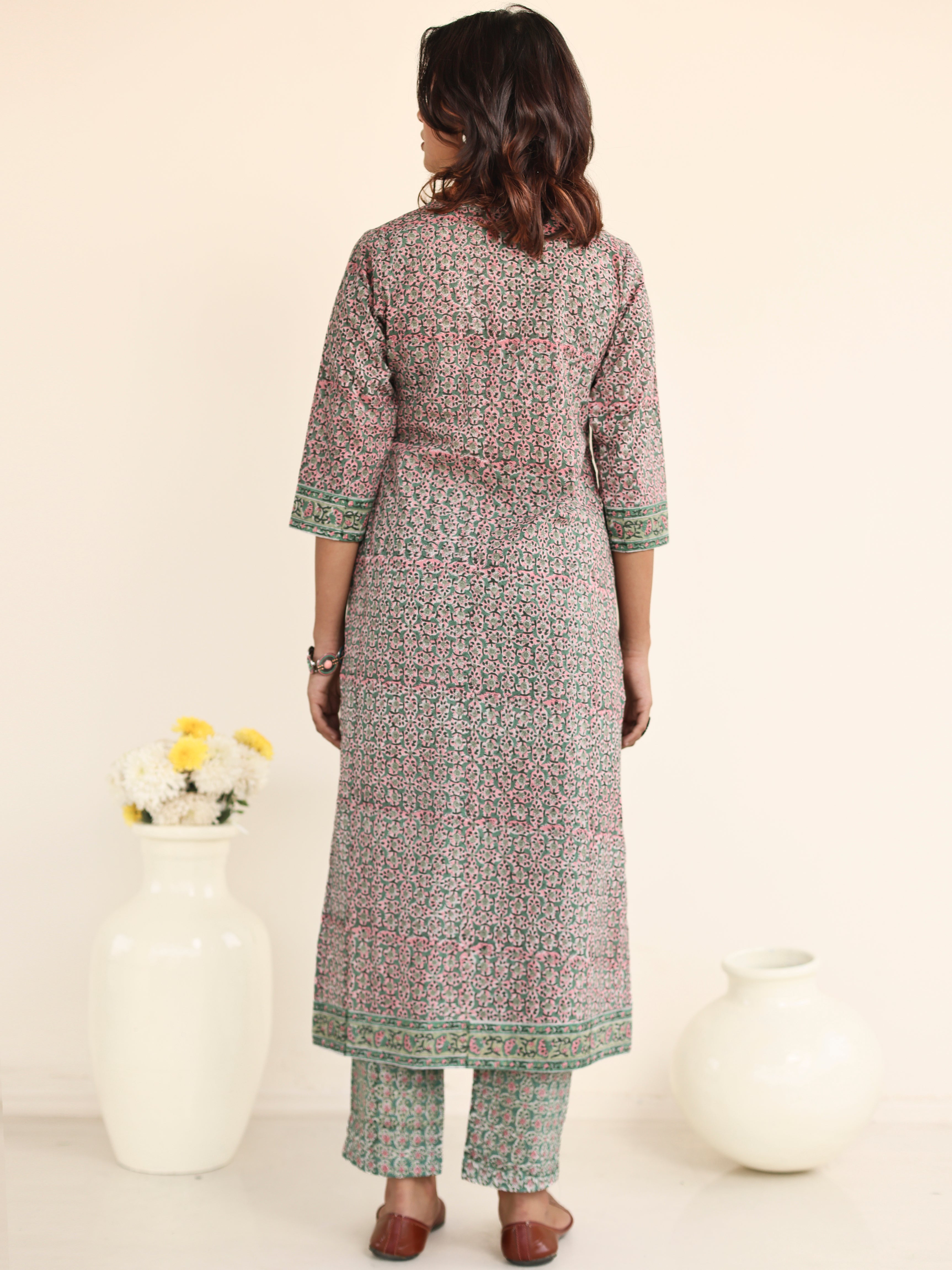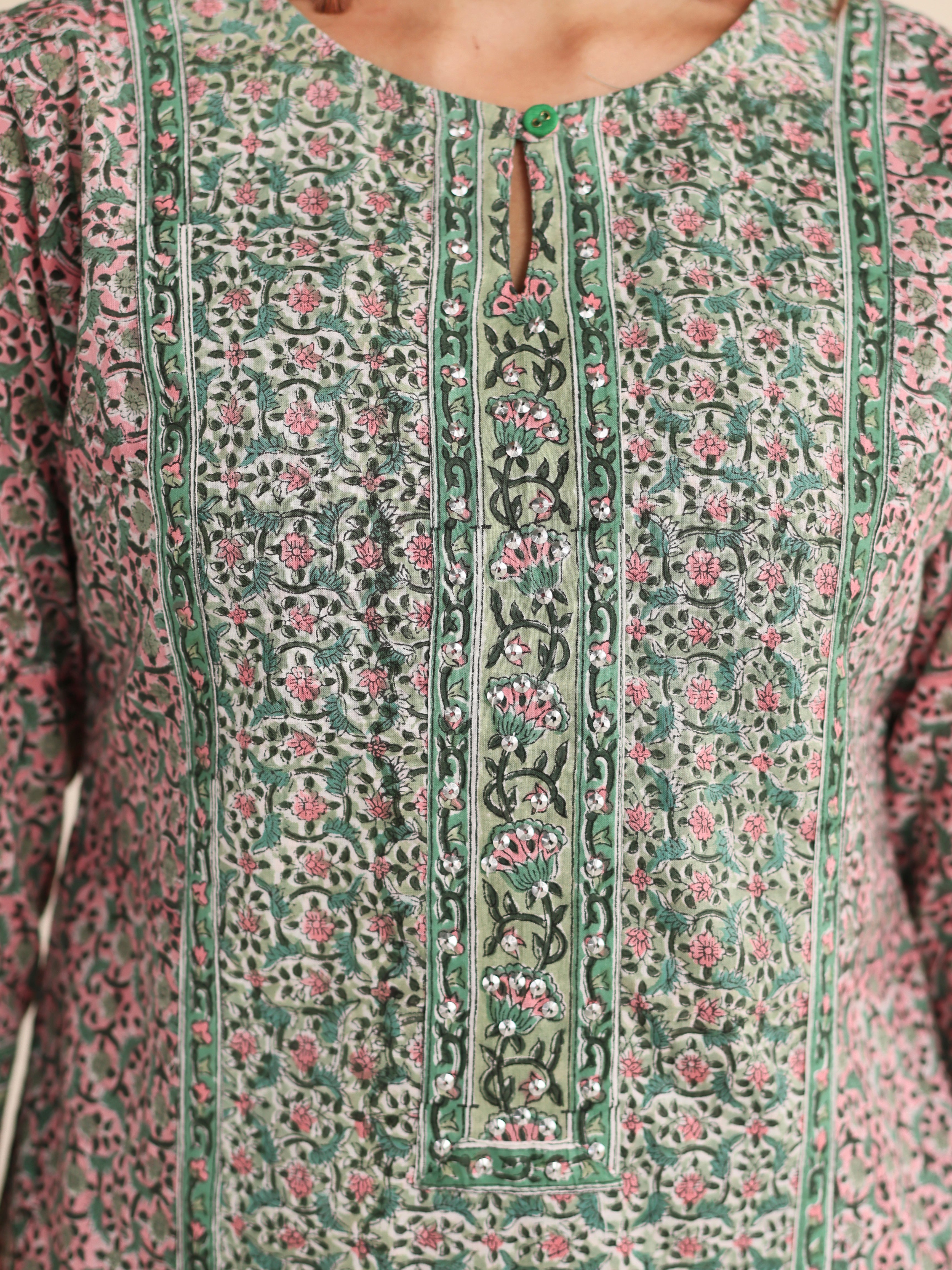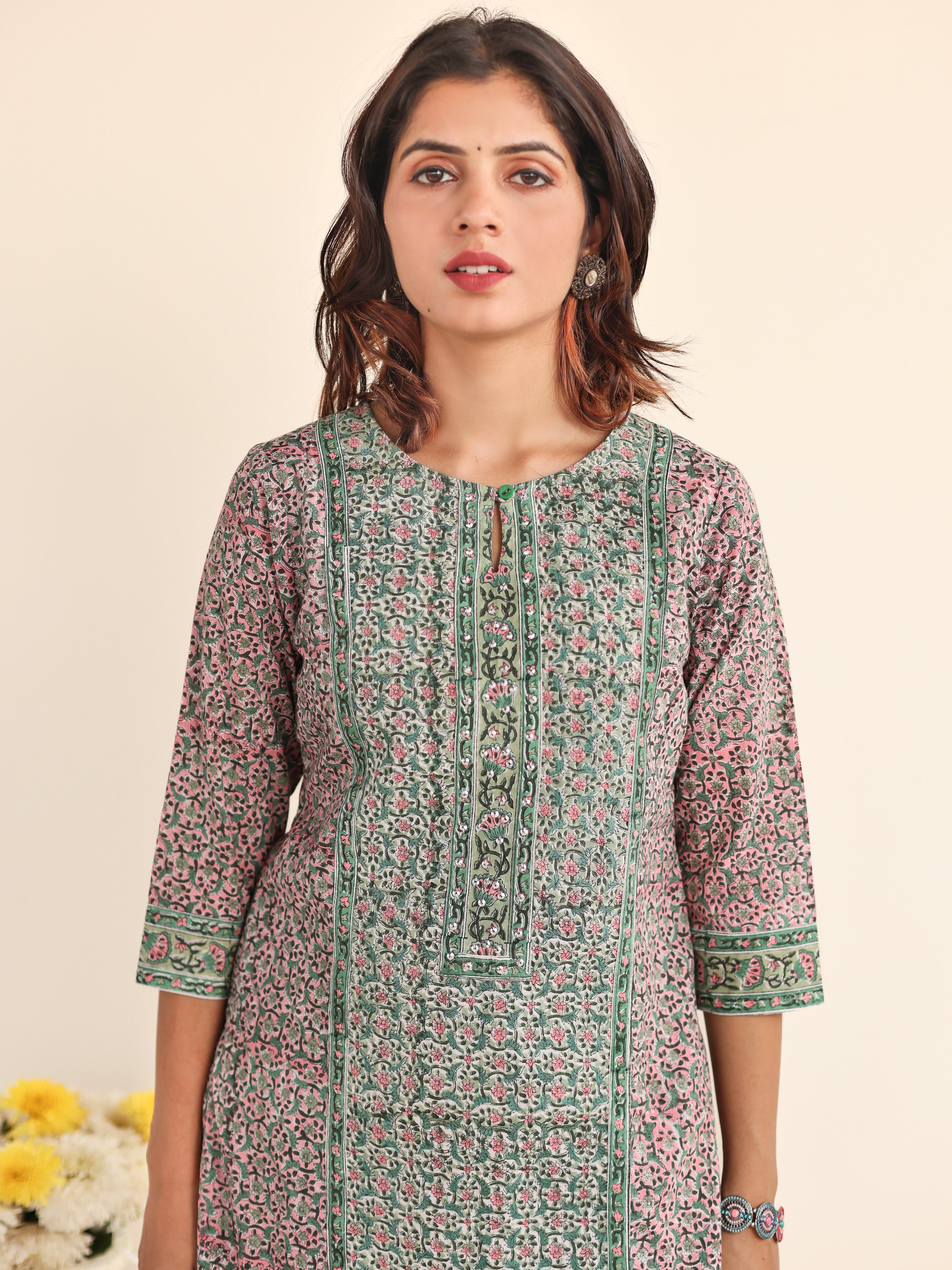 Product: This set contains Handcrafted Sanganeri Premium Cotton Kurta, 100% Cotton Pants and Cotton Dupatta.