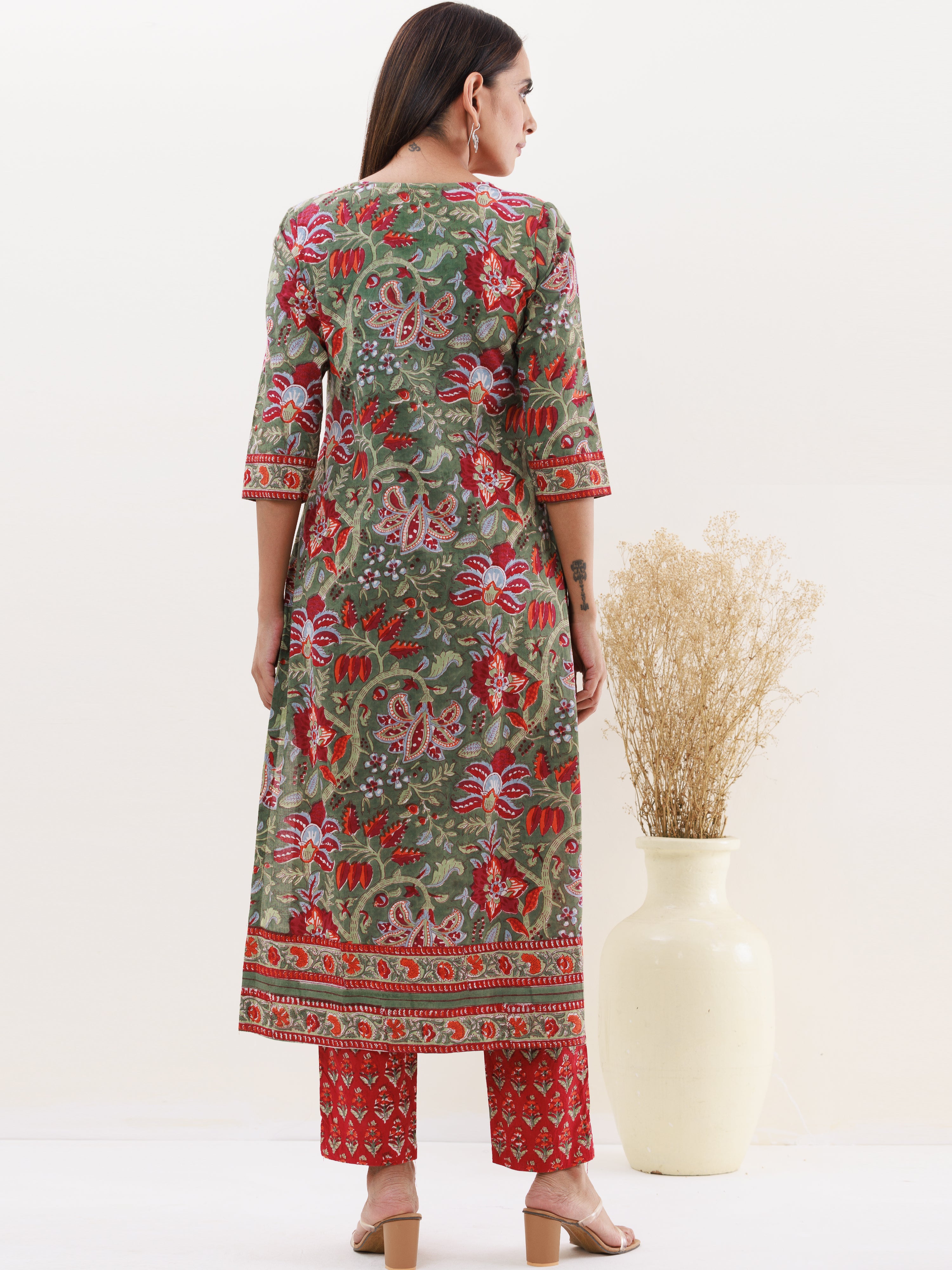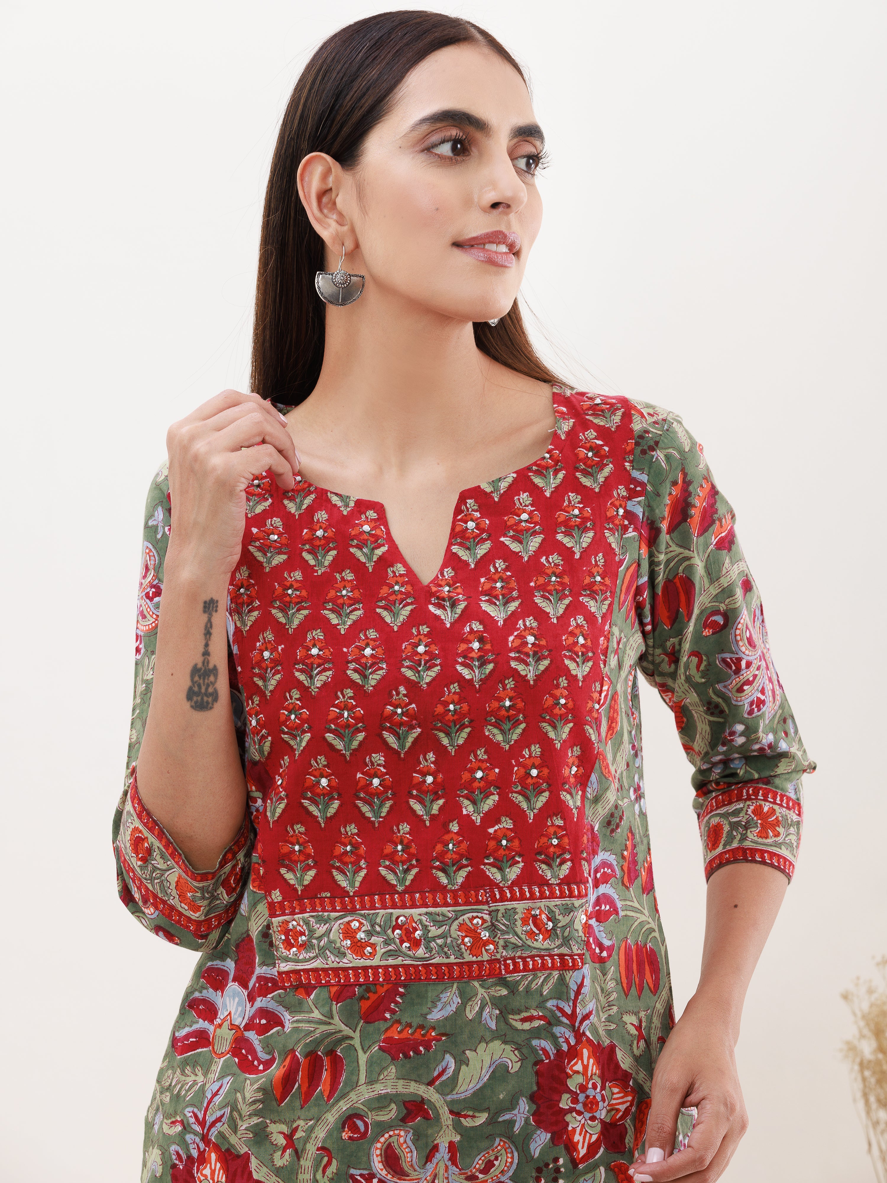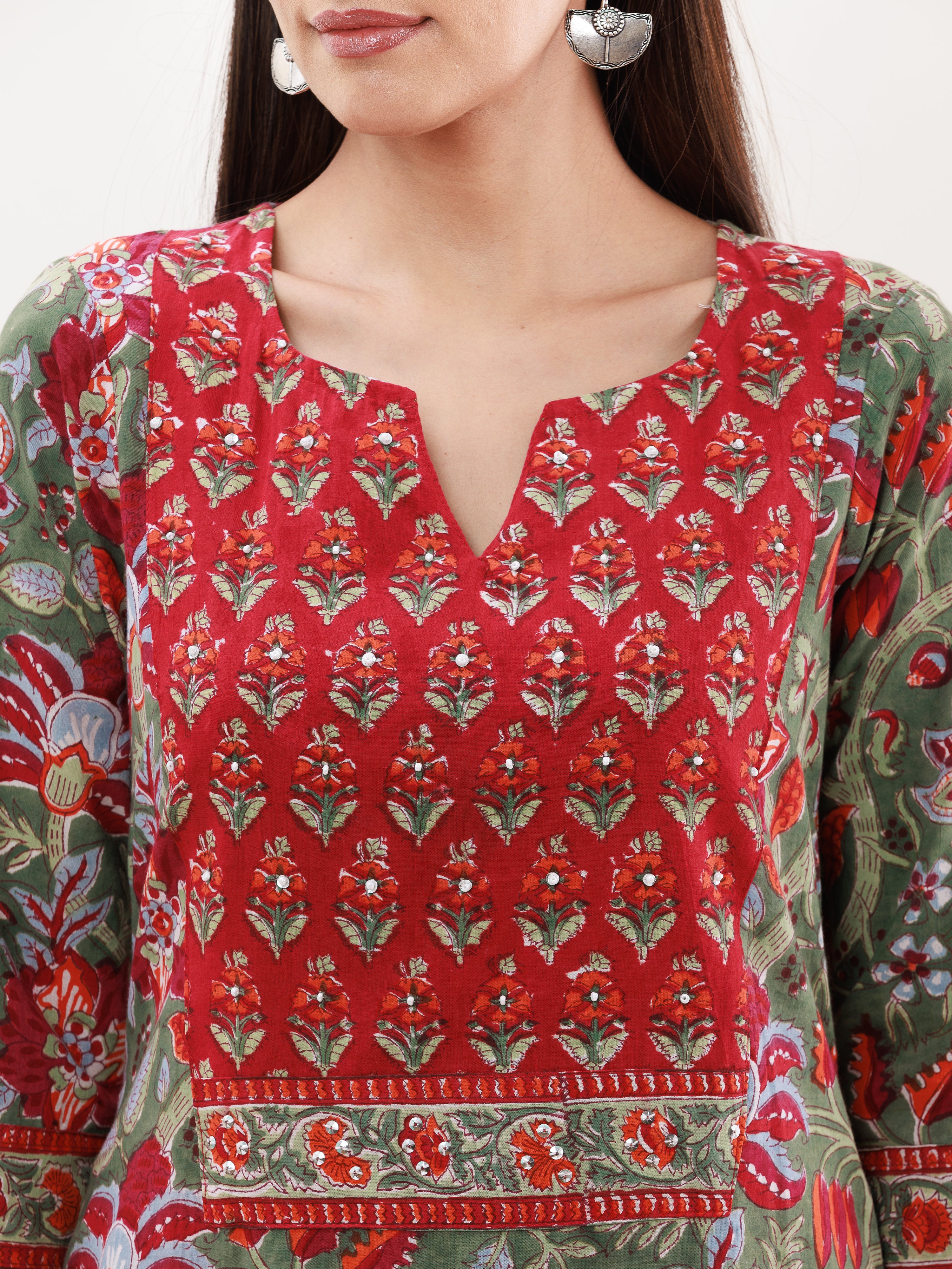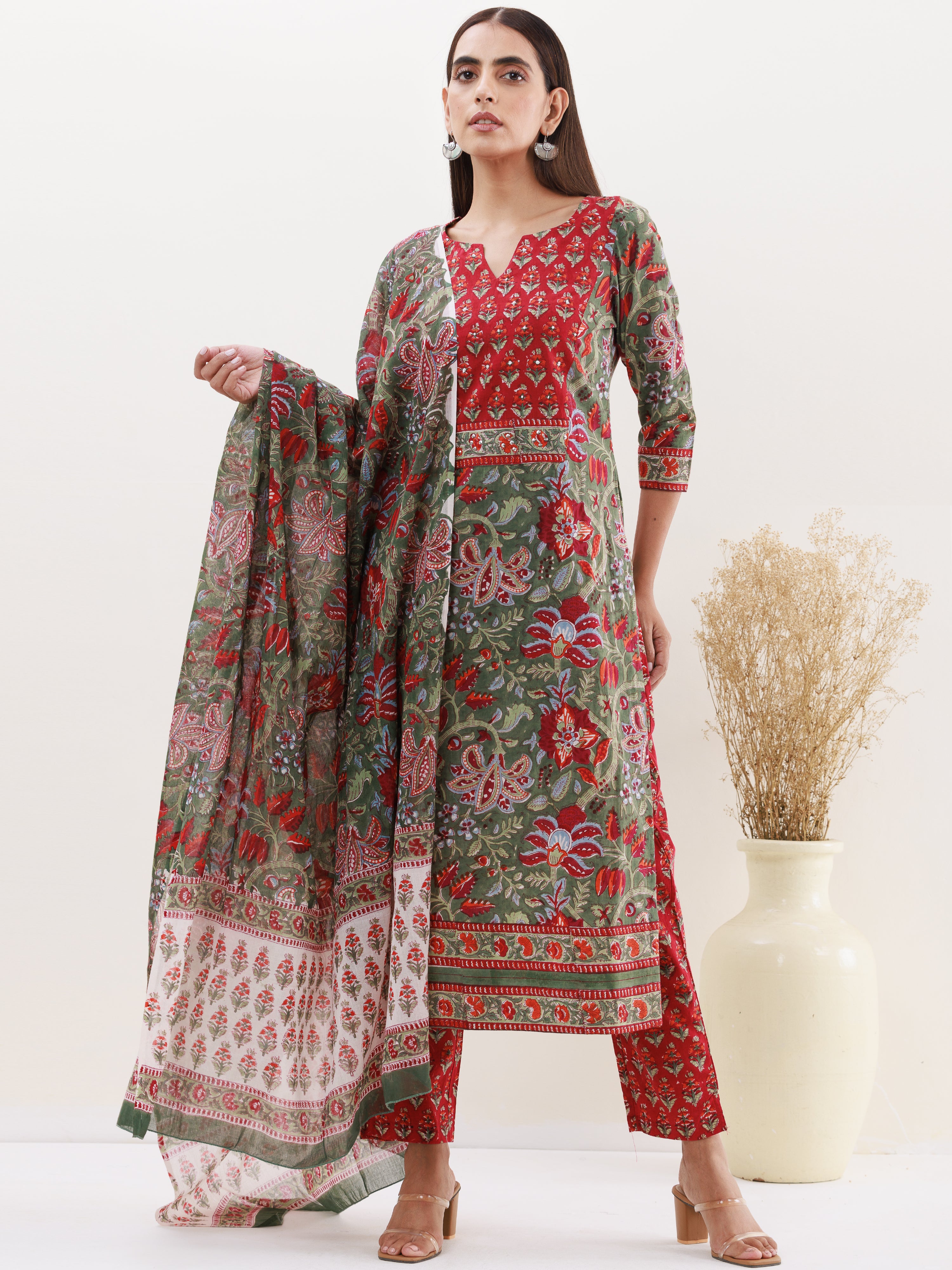 Product: This set contains Handcrafted Sanganeri Premium Cotton Kurta, 100% Cotton Pants and Cotton Dupatta.