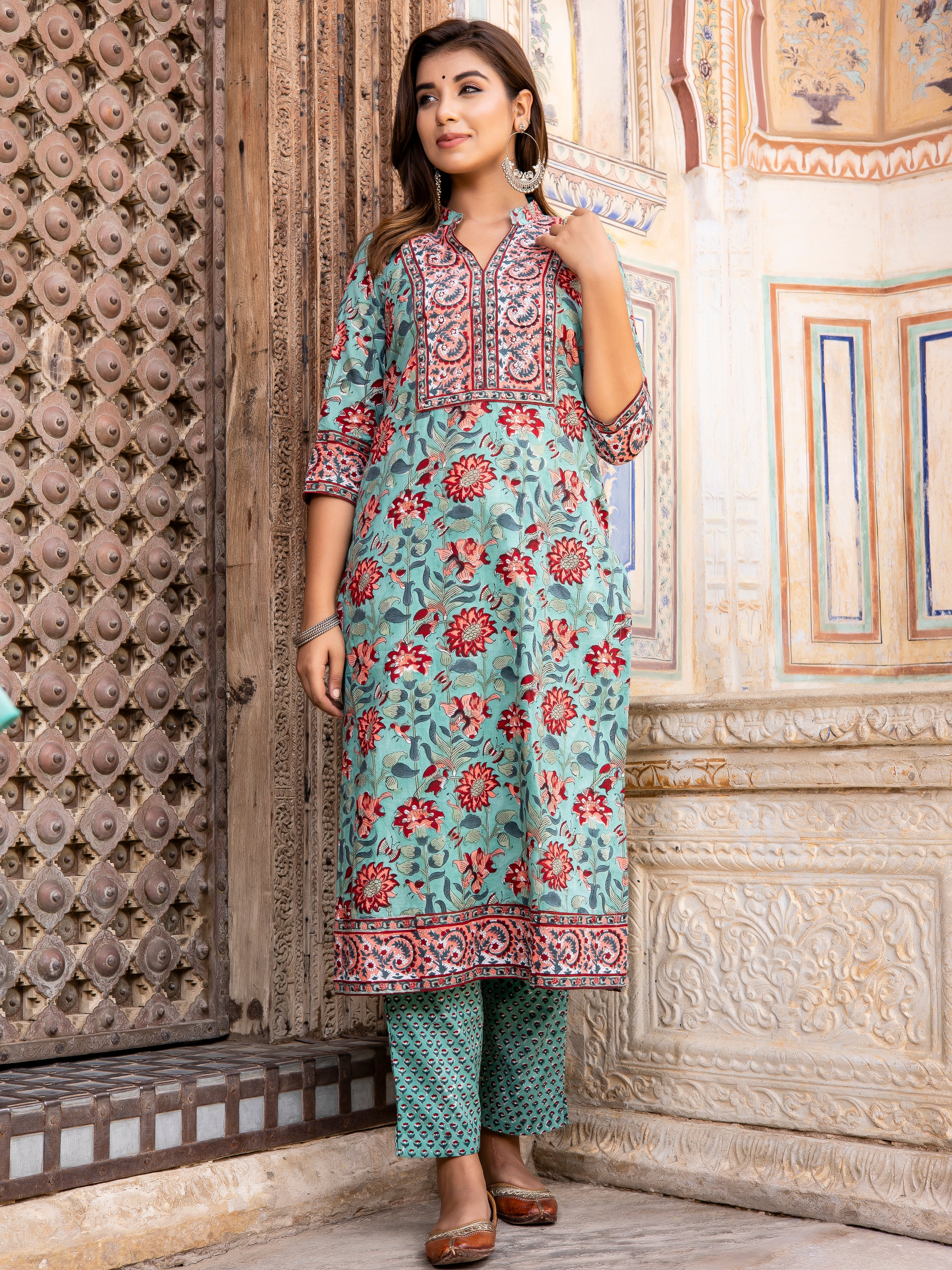 Product: This set contains Handcrafted Sanganeri Premium Cotton Kurta, 100% Cotton Pants and Cotton Dupatta.